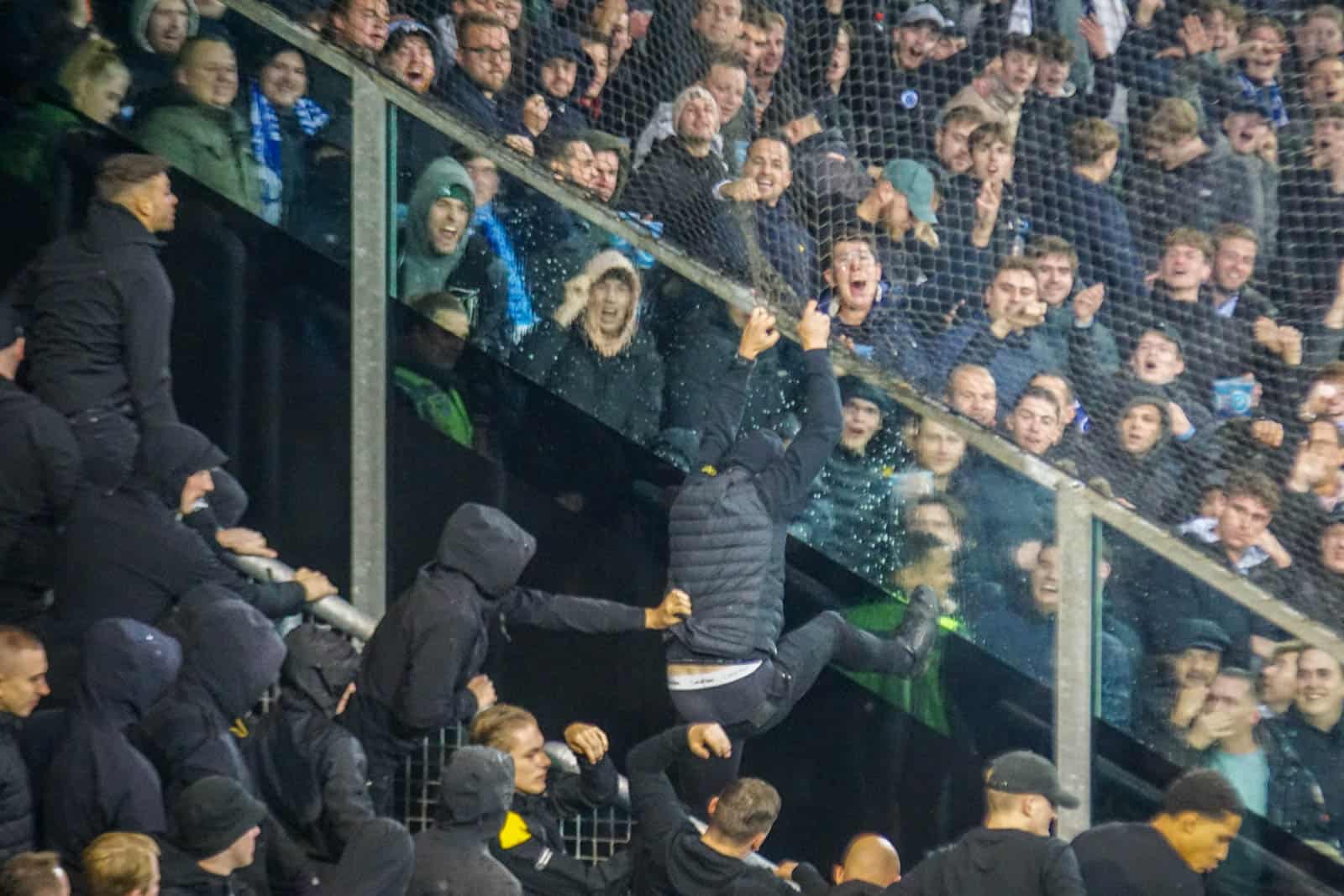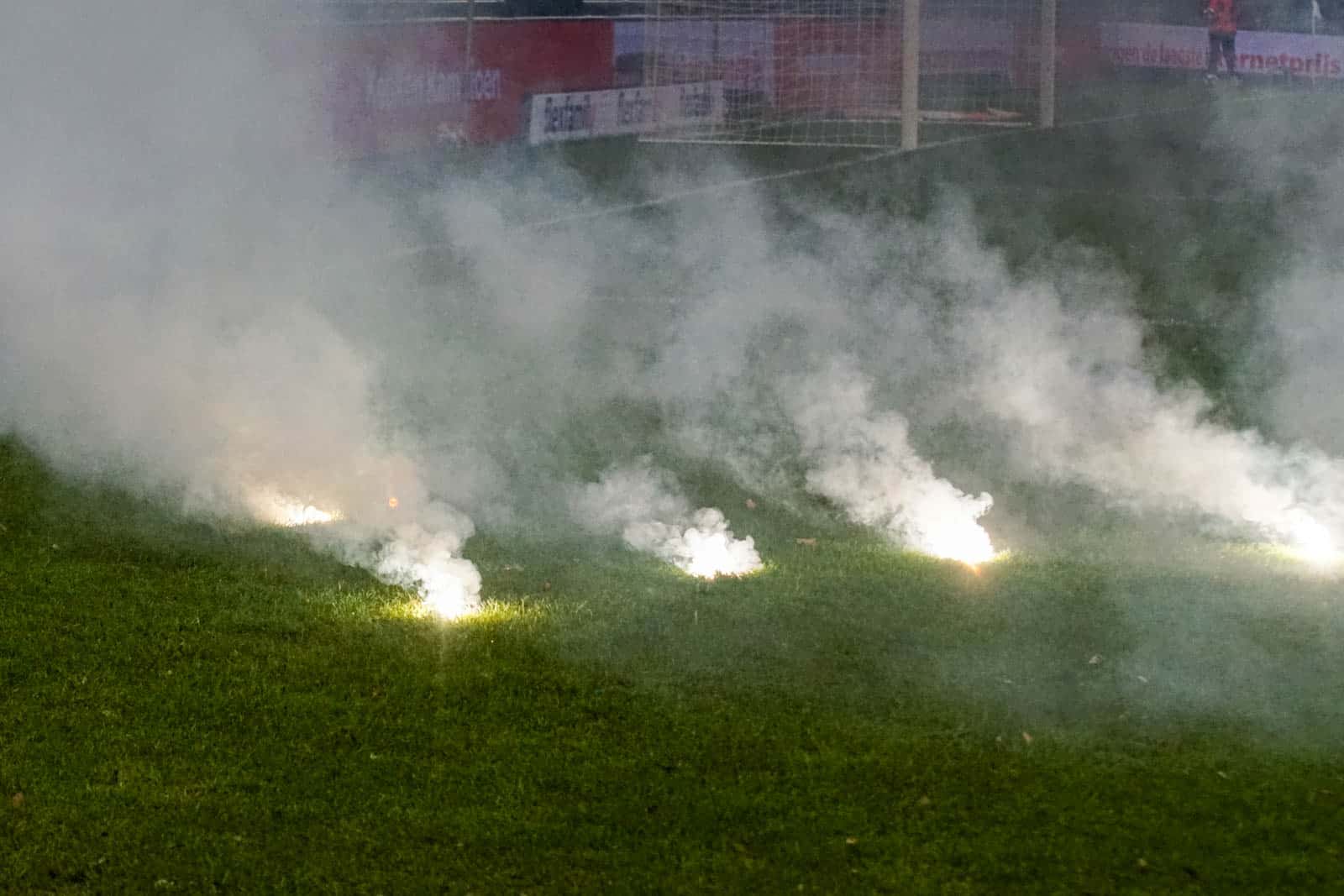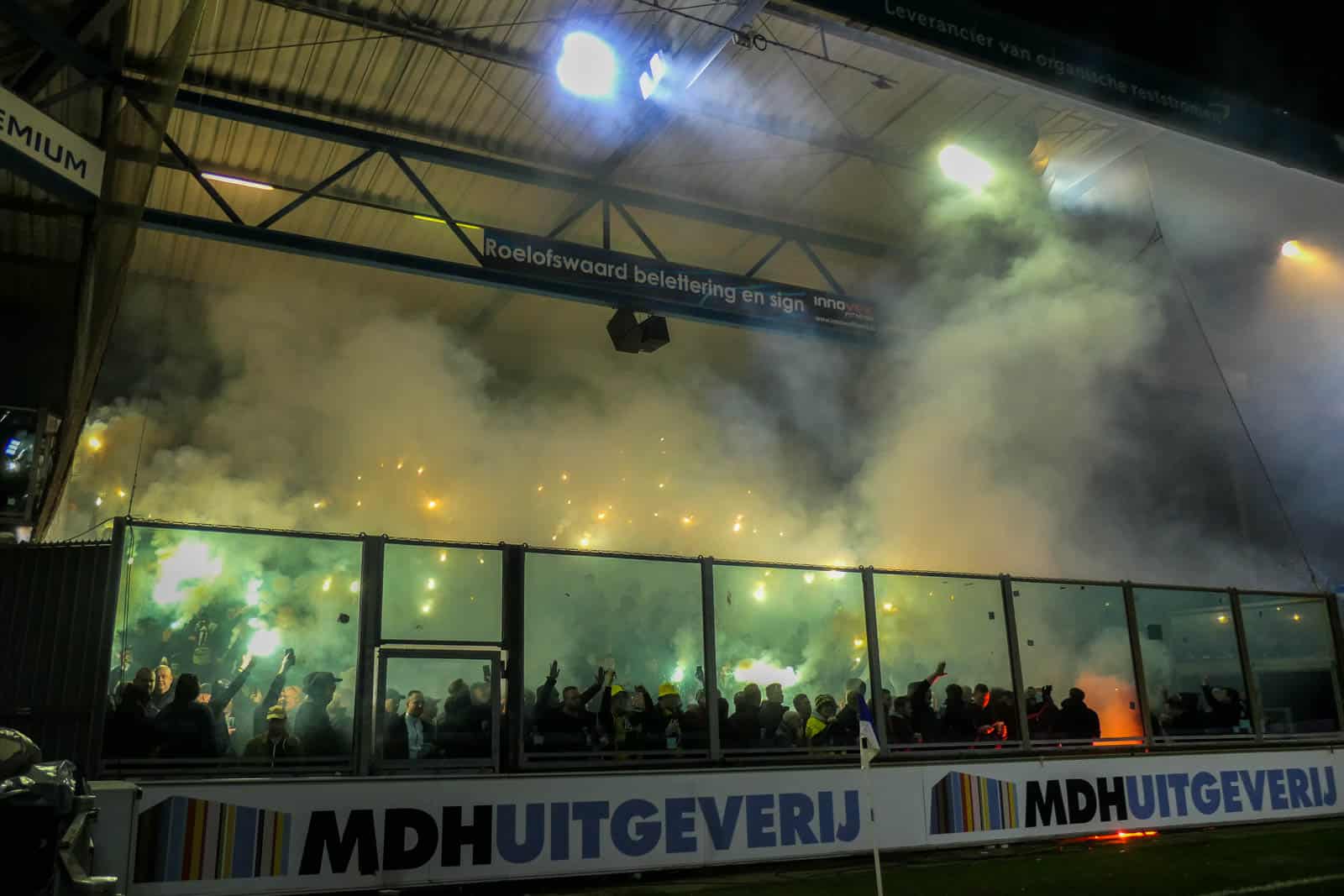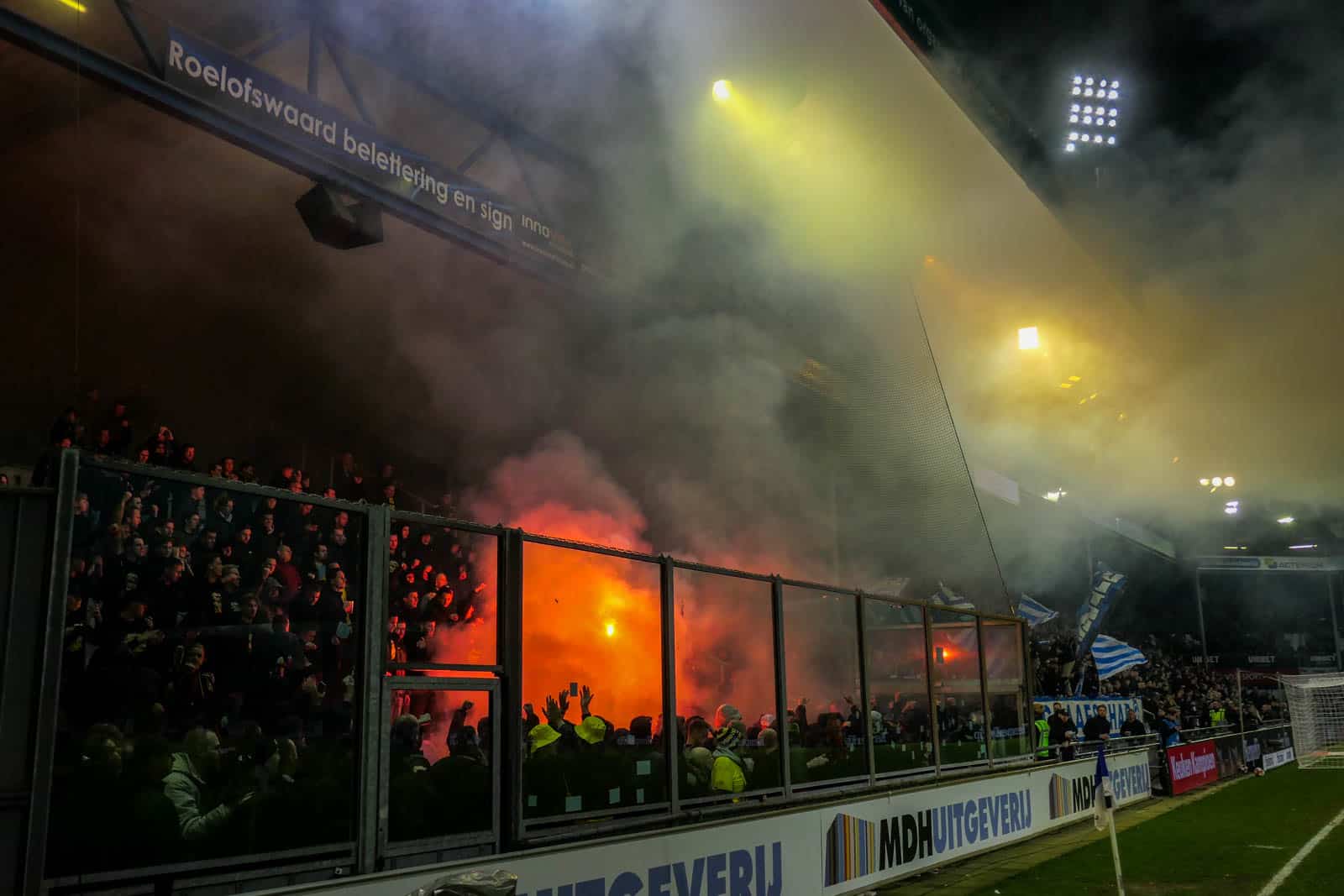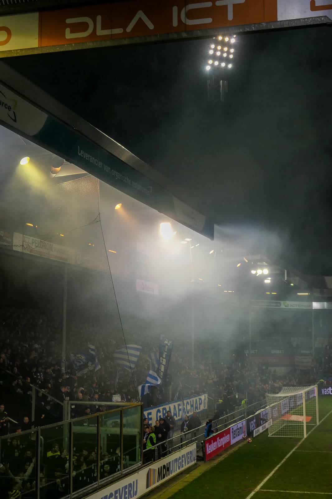 Maar ook muntjes, aanstekers en stoeltjes gaan richting het veld en de thuistribunes. Het is een grote chaos. Vuurwerk wat richting de spelers van De Graafschap, van wie enkelen ook hun kinderen mee hebben, wordt gegooid lijdt logischerwijs tot veel afkeuring vanuit het De Graafschap vak en sommige Graafschap-spelers lijken verhaal te willen halen. Het loopt met een sisser af en de supporters en spelers van De Graafschap vieren alsnog hun feestje, ondanks het woedende uitvak vlak ernaast.