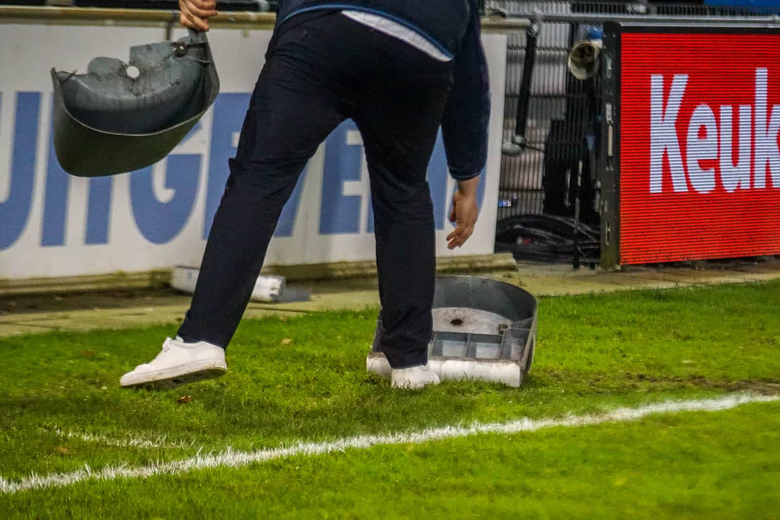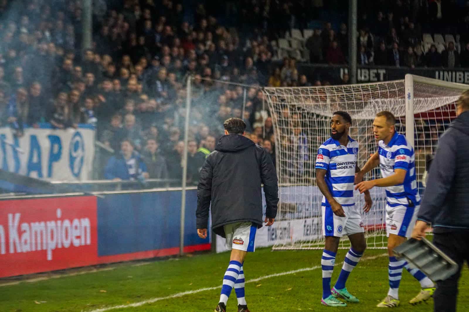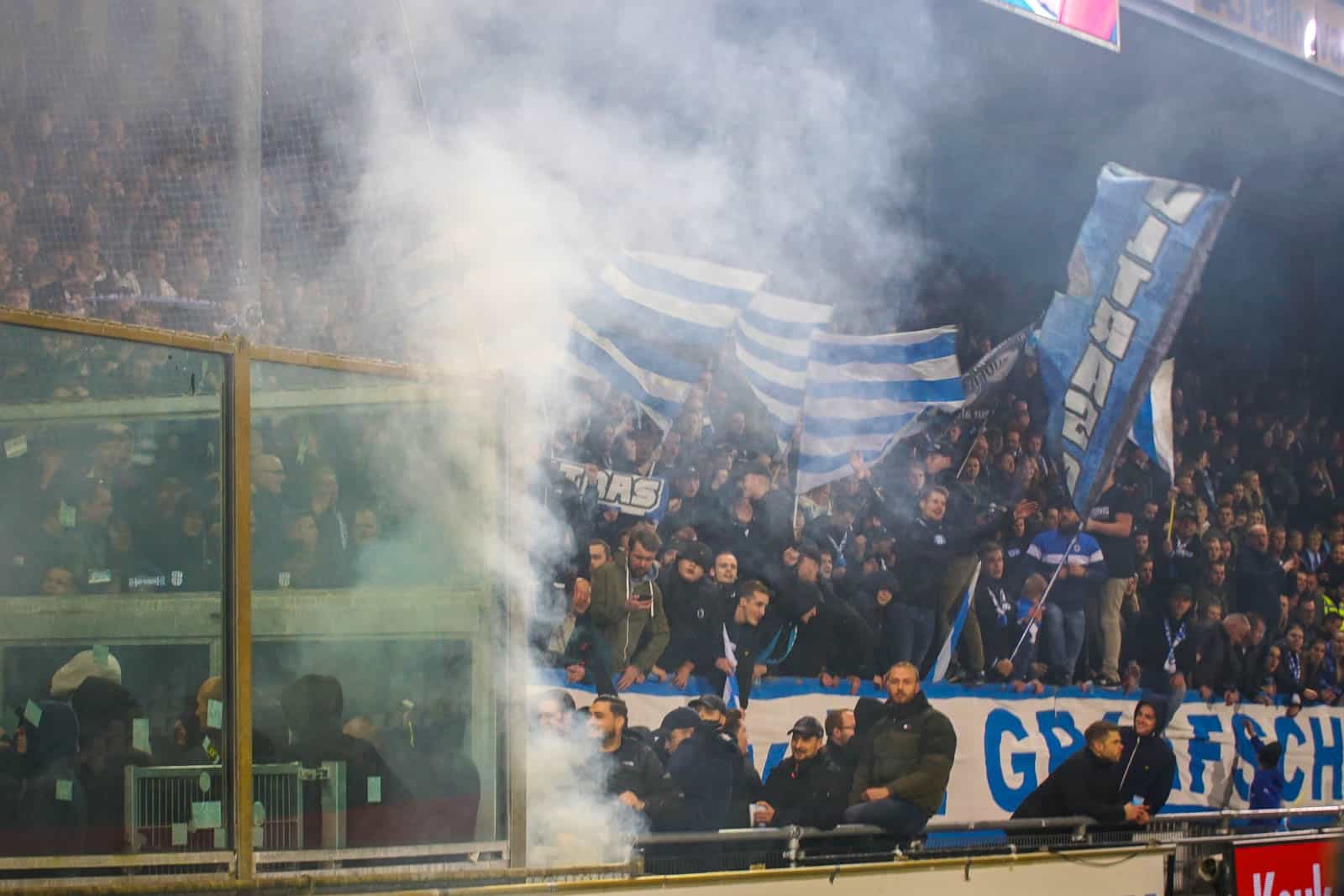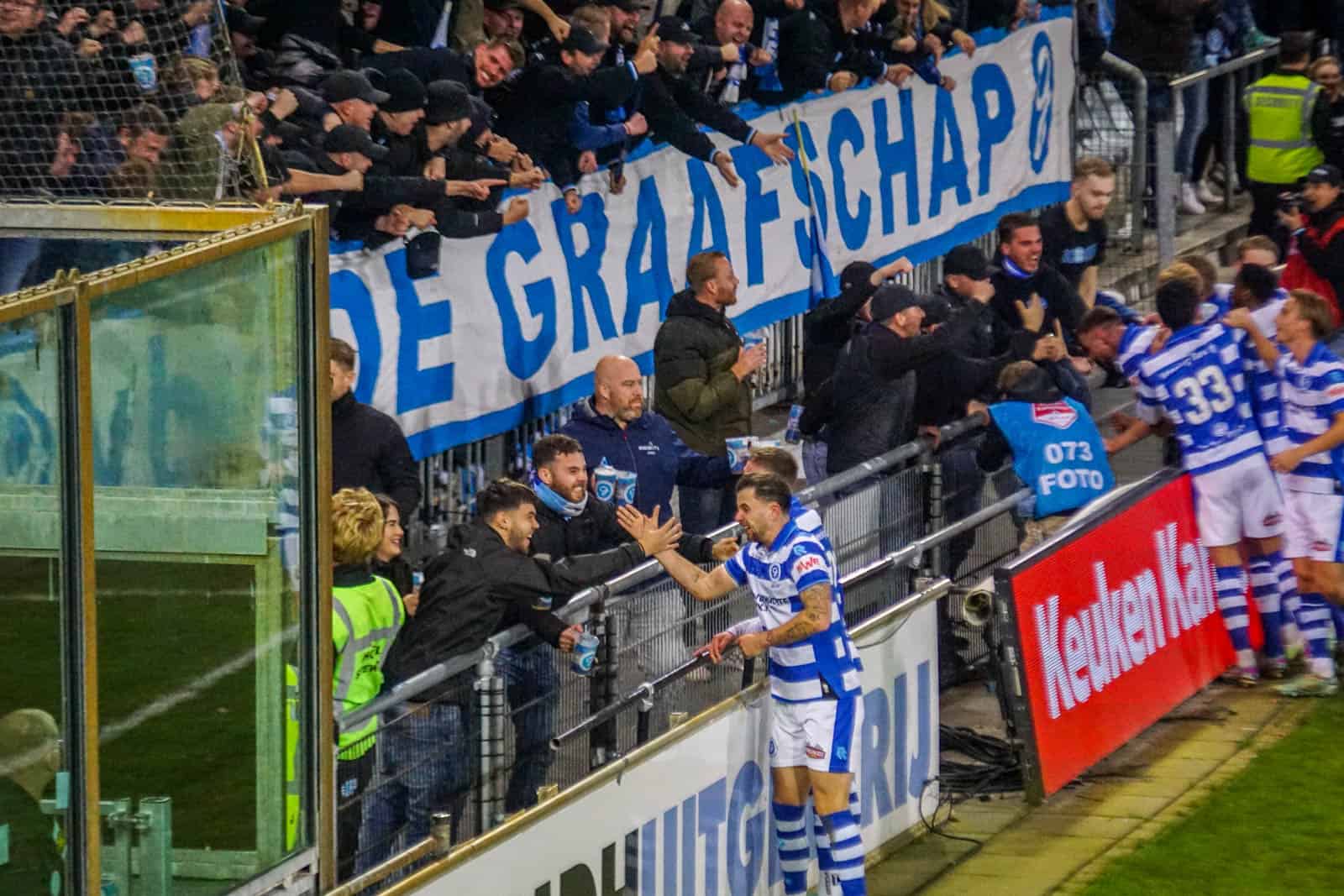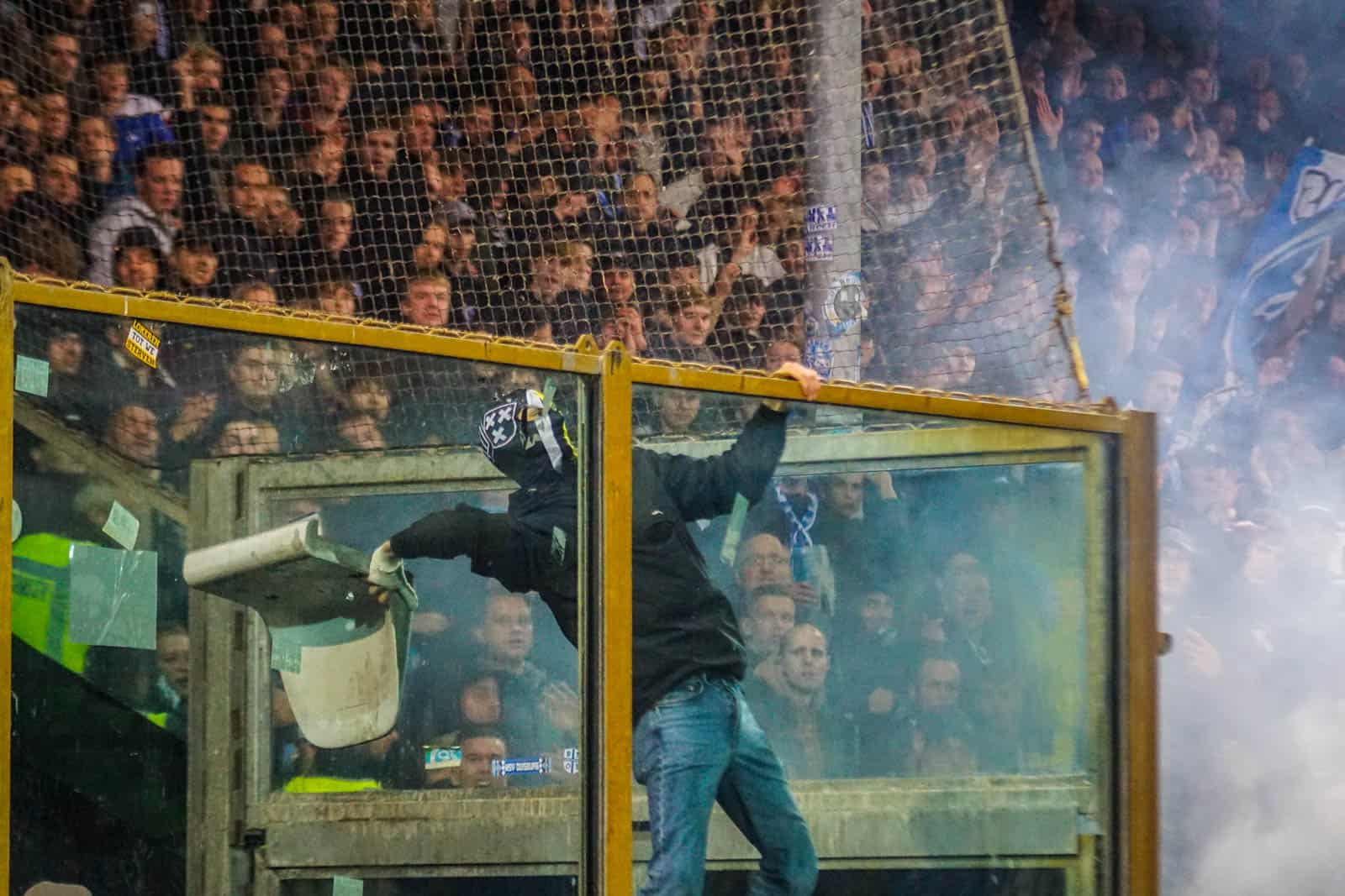 Maar ook muntjes, aanstekers en stoeltjes gaan richting het veld en de thuistribunes. Het is een grote chaos. Vuurwerk wat richting de spelers van De Graafschap, van wie enkelen ook hun kinderen mee hebben, wordt gegooid lijdt logischerwijs tot veel afkeuring vanuit het De Graafschap vak en sommige Graafschap-spelers lijken verhaal te willen halen. Het loopt met een sisser af en de supporters en spelers van De Graafschap vieren alsnog hun feestje, ondanks het woedende uitvak vlak ernaast.