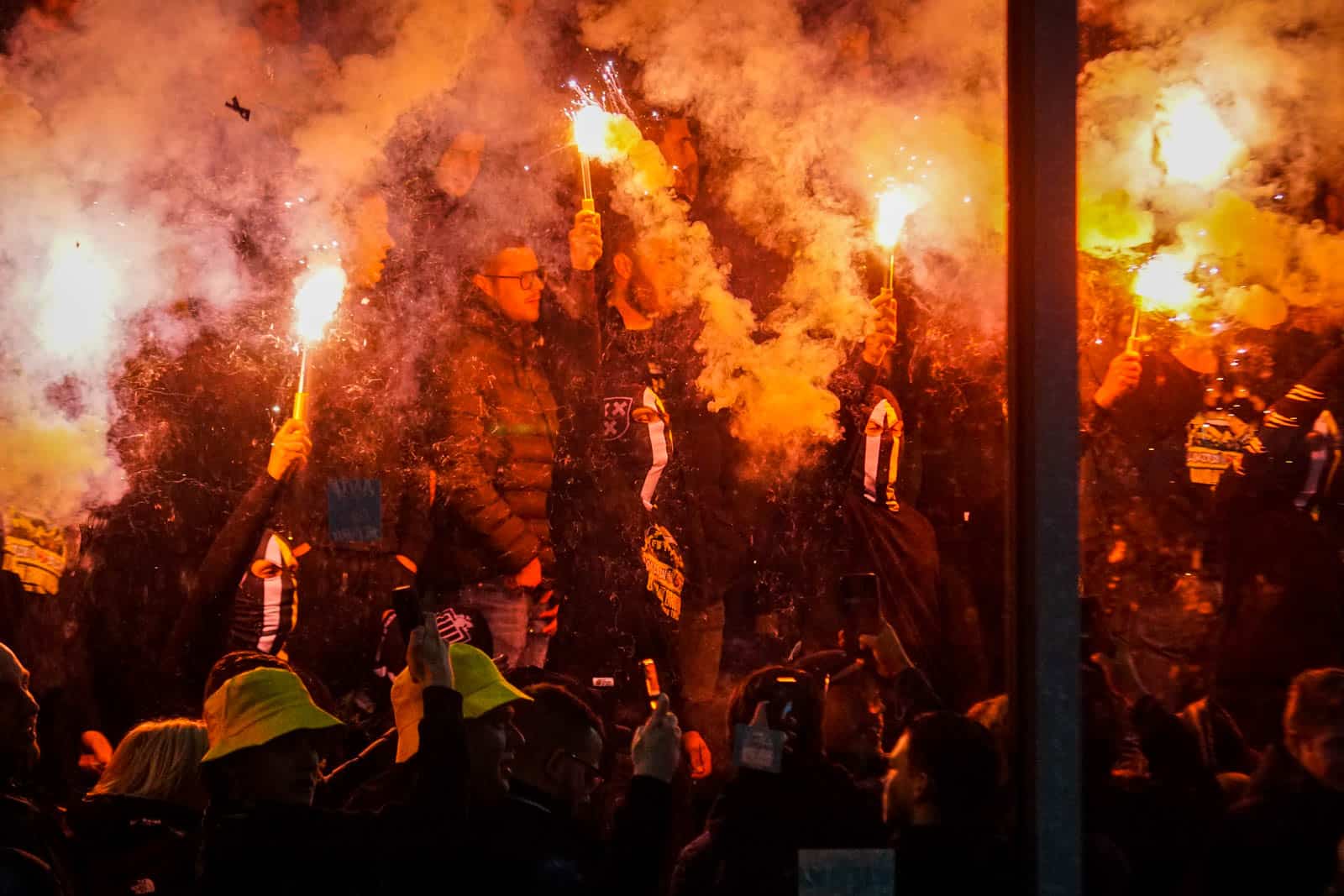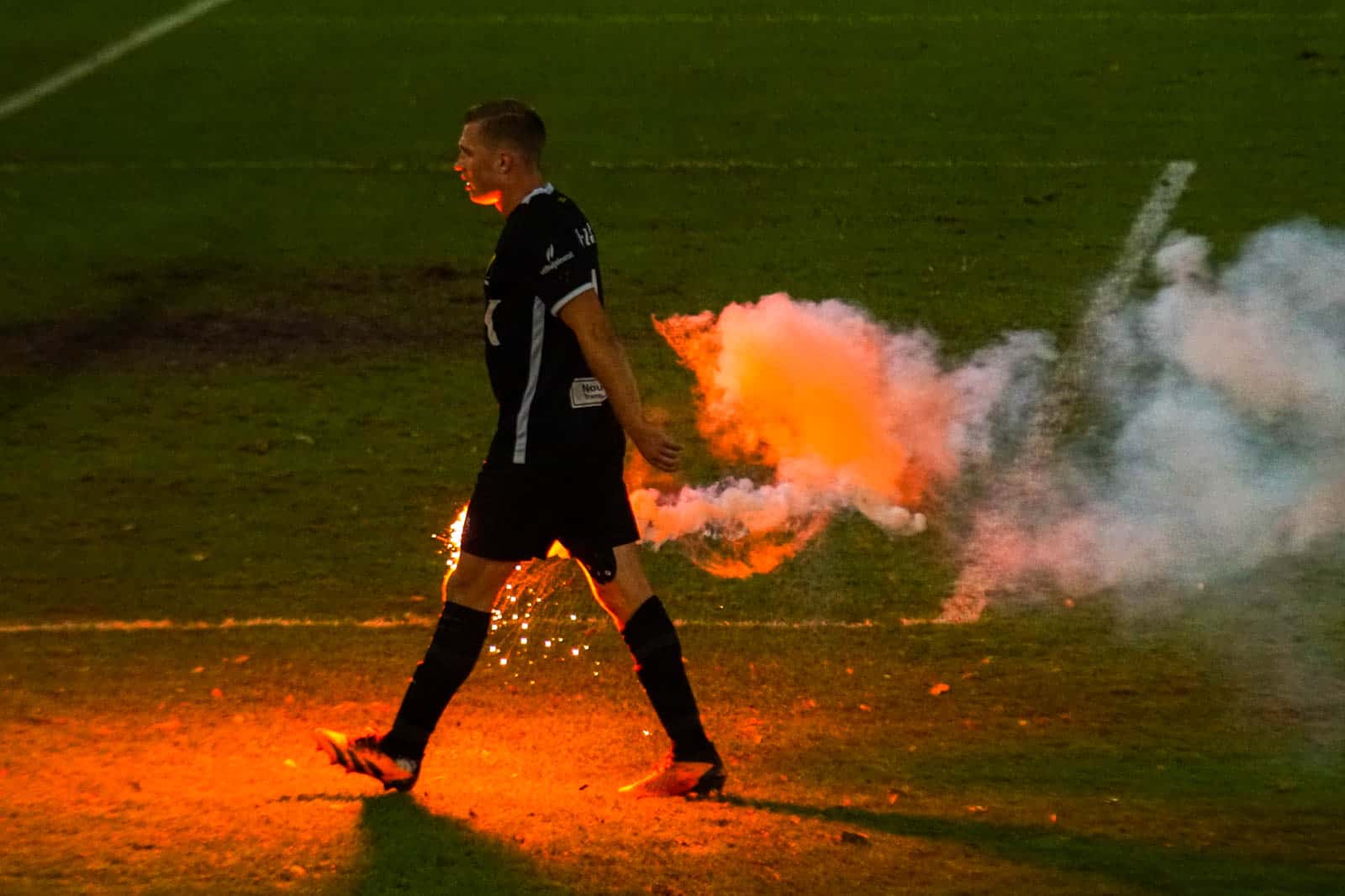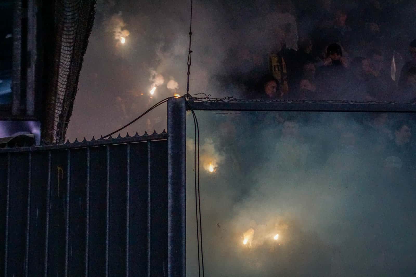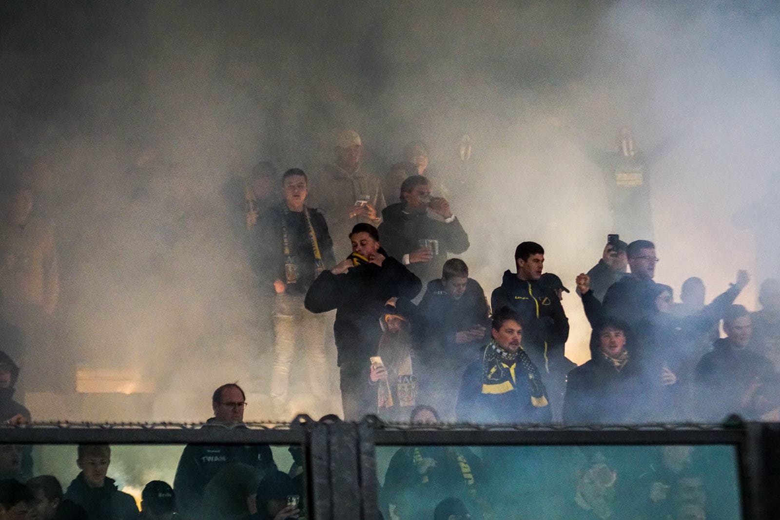 Even later komen ze terug, maar ditmaal met een NAC+Lokeren bivakmuts op. De tifo mag dan misschien gecanceld zijn, de geplande pyroshow moet toch zeker doorgang vinden. Als de 30e minuut aanbreekt worden er zo tientallen strobo’s afgestoken in het uitvak van de Vijverberg. Een schitterend beeld volgt, waarbij het hele vak verandert in flitsende rookwolken. Enige minpuntje is dat er enkele strobo’s het veld op worden gegooid. Hierdoor wordt de wedstrijd een tijdje stilgelegd en volgen er natuurlijk overal weer negatieve en generaliserende berichten over voetbalsupporters.