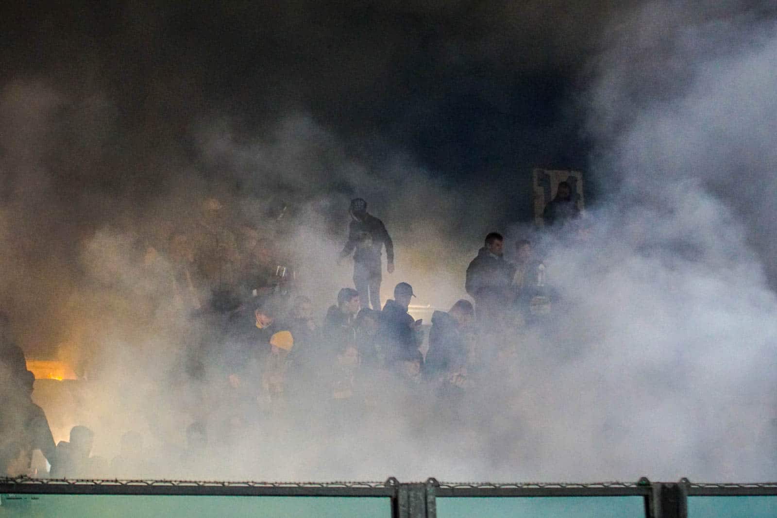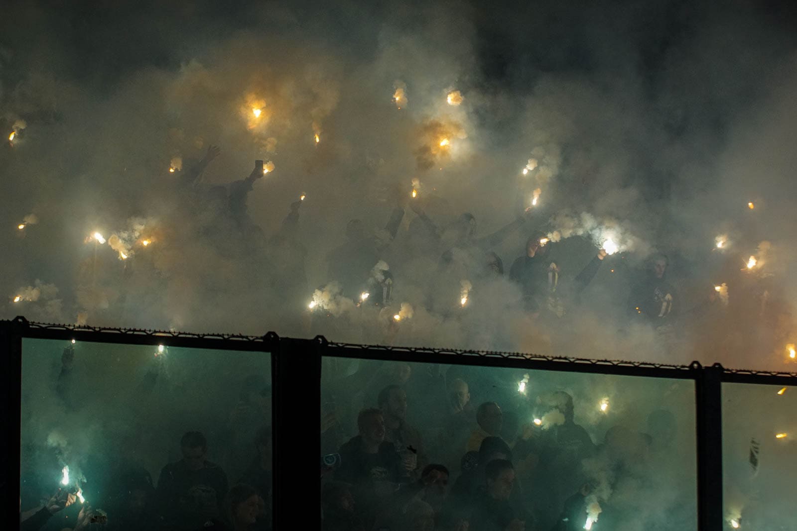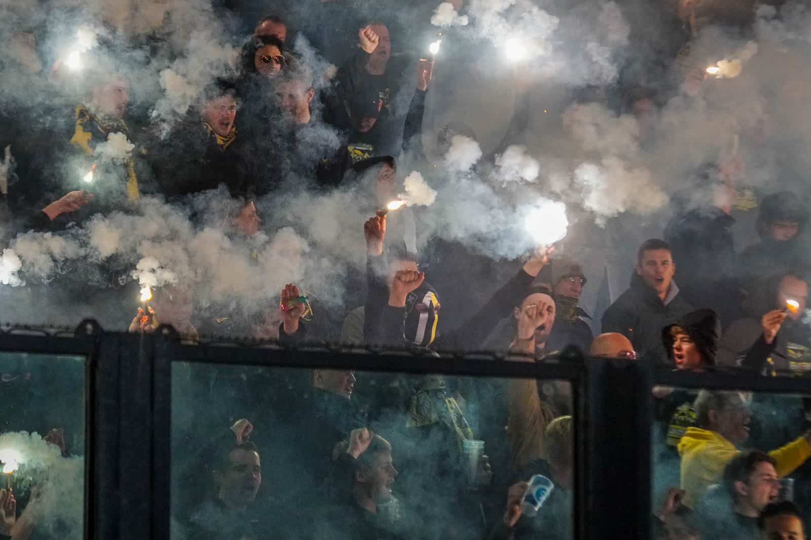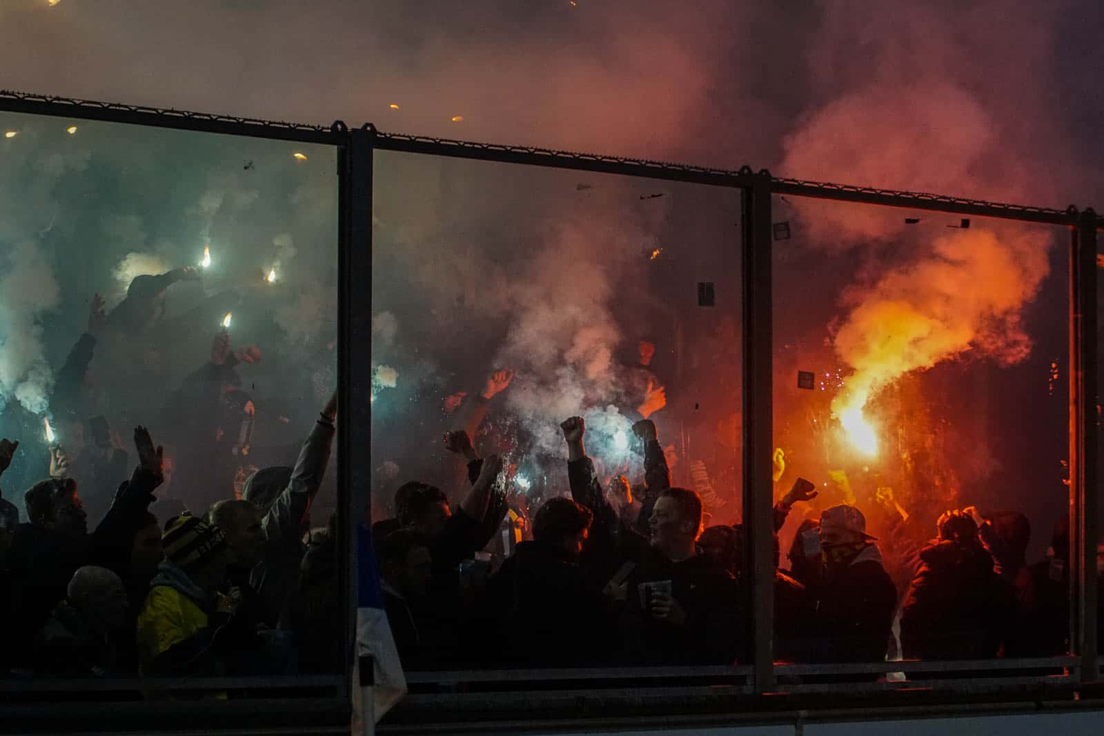 Even later komen ze terug, maar ditmaal met een NAC+Lokeren bivakmuts op. De tifo mag dan misschien gecanceld zijn, de geplande pyroshow moet toch zeker doorgang vinden. Als de 30e minuut aanbreekt worden er zo tientallen strobo’s afgestoken in het uitvak van de Vijverberg. Een schitterend beeld volgt, waarbij het hele vak verandert in flitsende rookwolken. Enige minpuntje is dat er enkele strobo’s het veld op worden gegooid. Hierdoor wordt de wedstrijd een tijdje stilgelegd en volgen er natuurlijk overal weer negatieve en generaliserende berichten over voetbalsupporters.