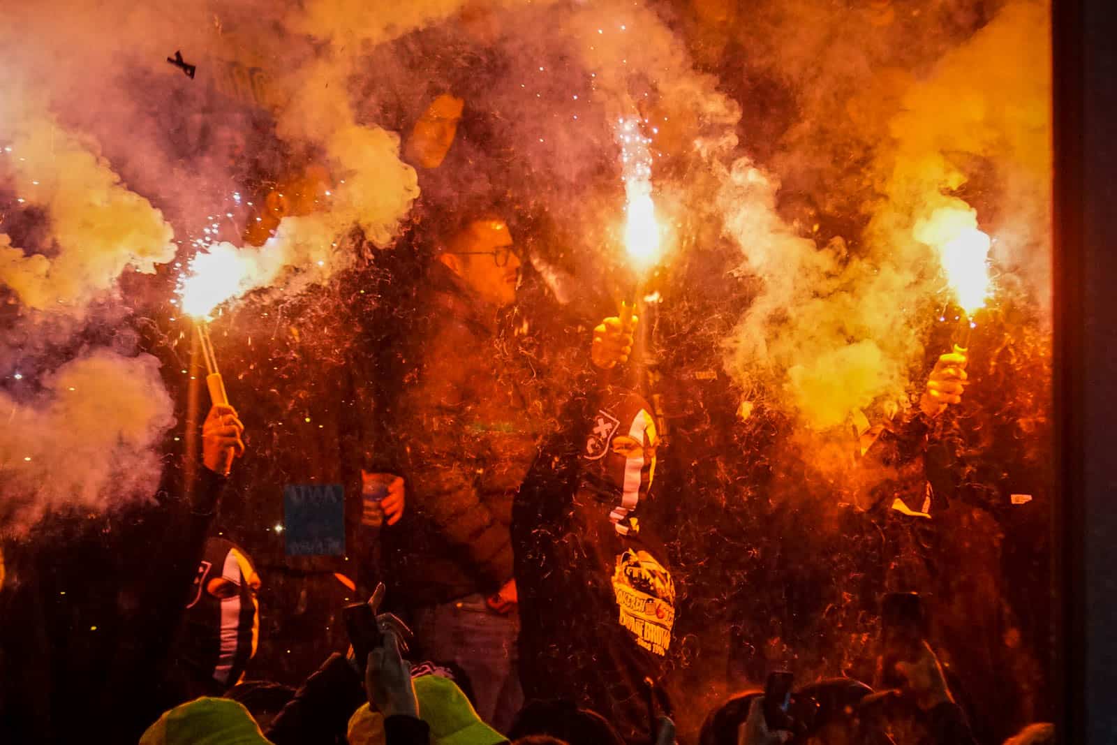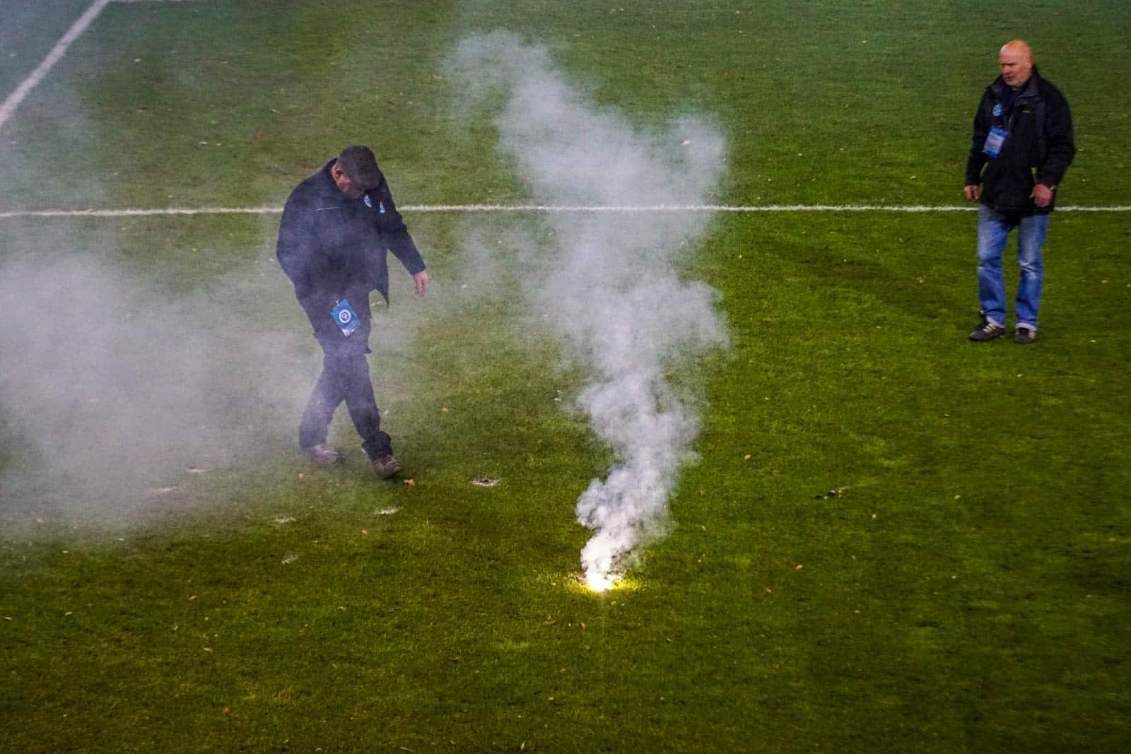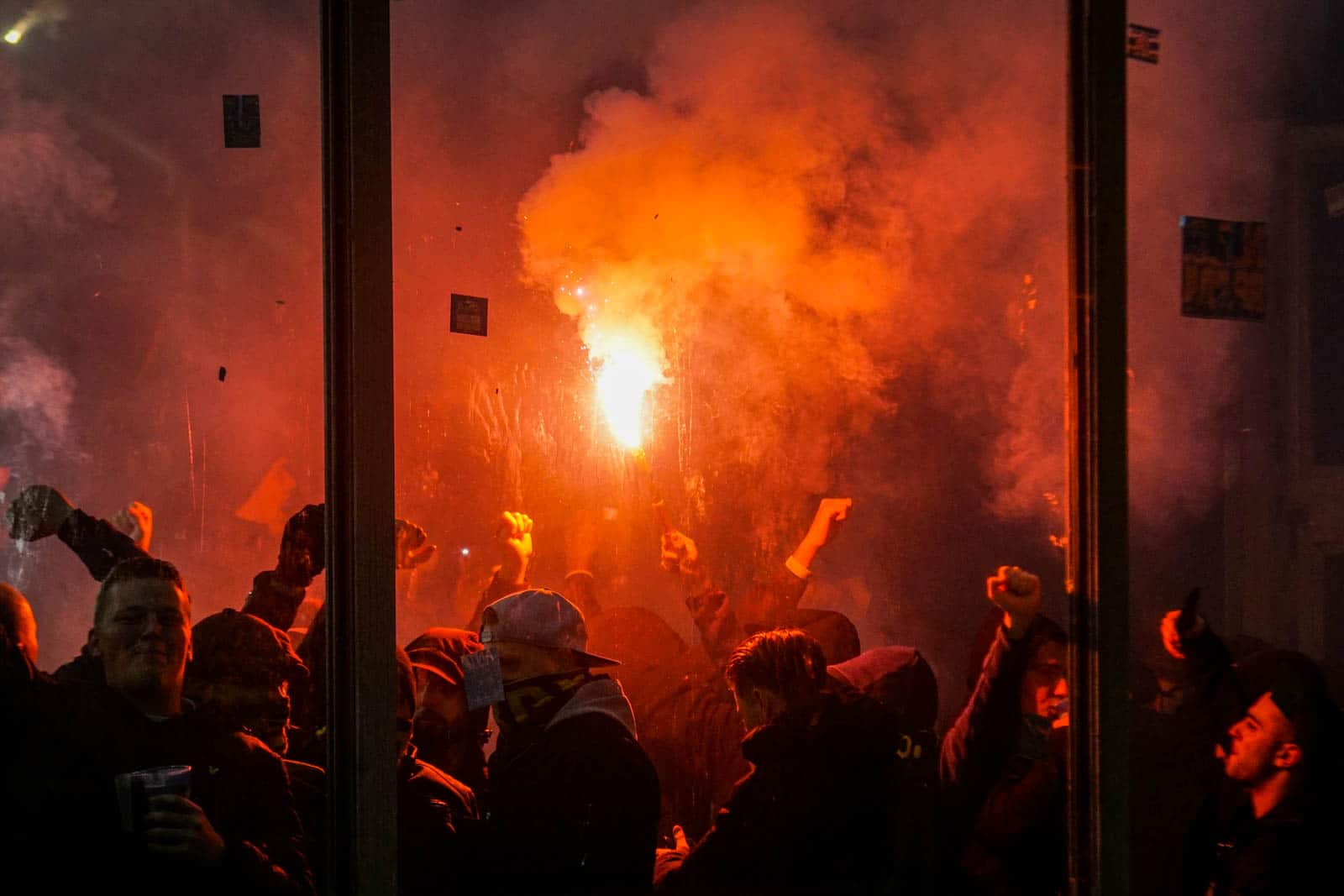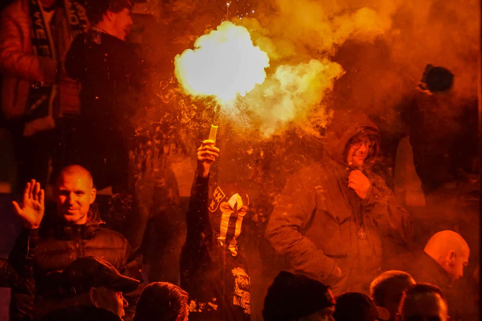 Even later komen ze terug, maar ditmaal met een NAC+Lokeren bivakmuts op. De tifo mag dan misschien gecanceld zijn, de geplande pyroshow moet toch zeker doorgang vinden. Als de 30e minuut aanbreekt worden er zo tientallen strobo’s afgestoken in het uitvak van de Vijverberg. Een schitterend beeld volgt, waarbij het hele vak verandert in flitsende rookwolken. Enige minpuntje is dat er enkele strobo’s het veld op worden gegooid. Hierdoor wordt de wedstrijd een tijdje stilgelegd en volgen er natuurlijk overal weer negatieve en generaliserende berichten over voetbalsupporters.