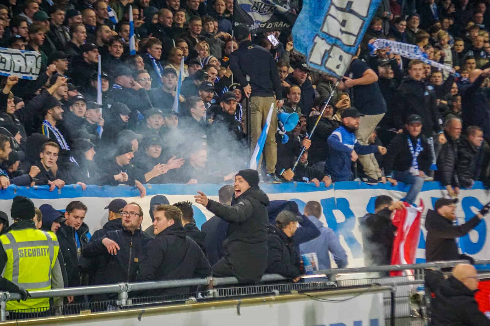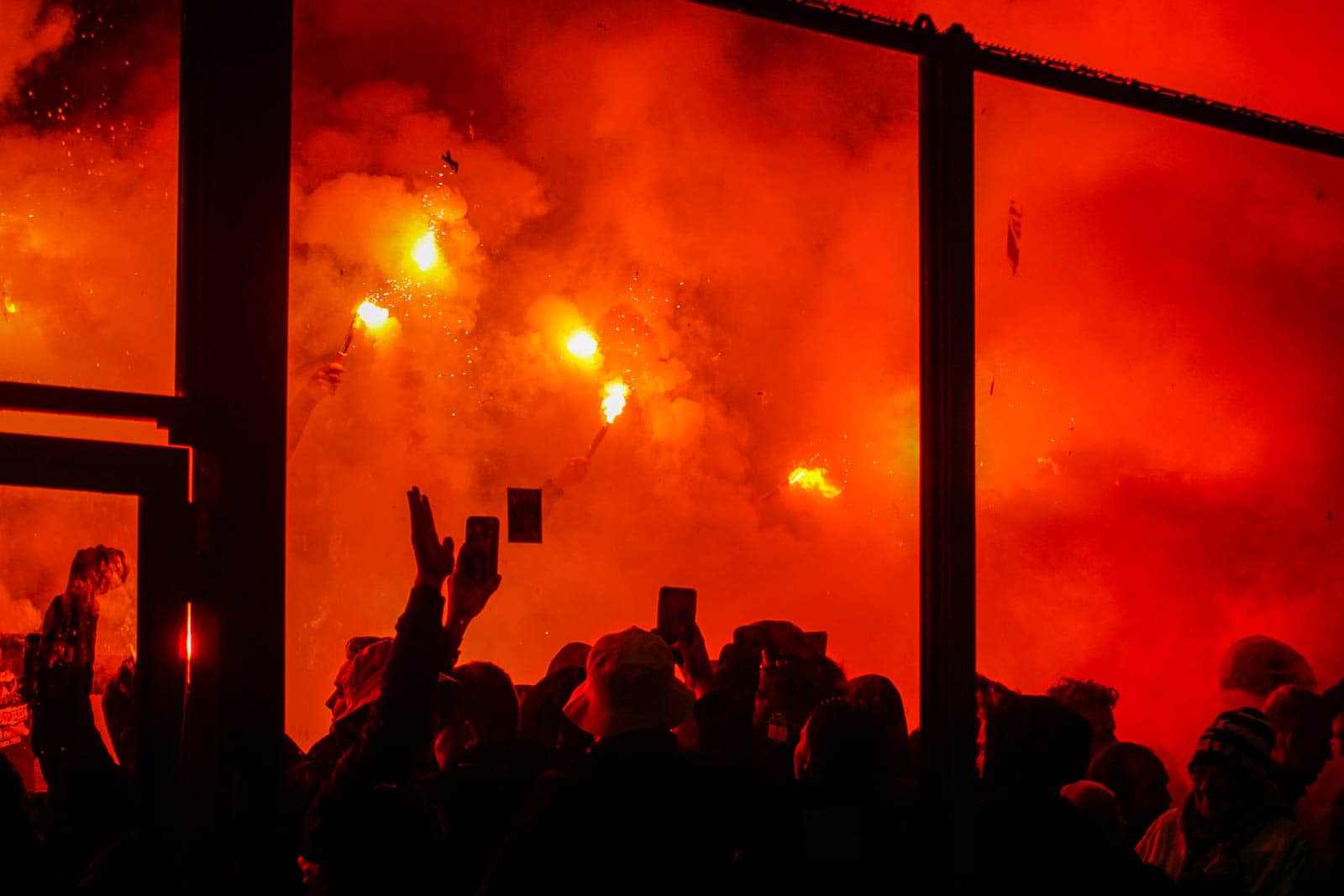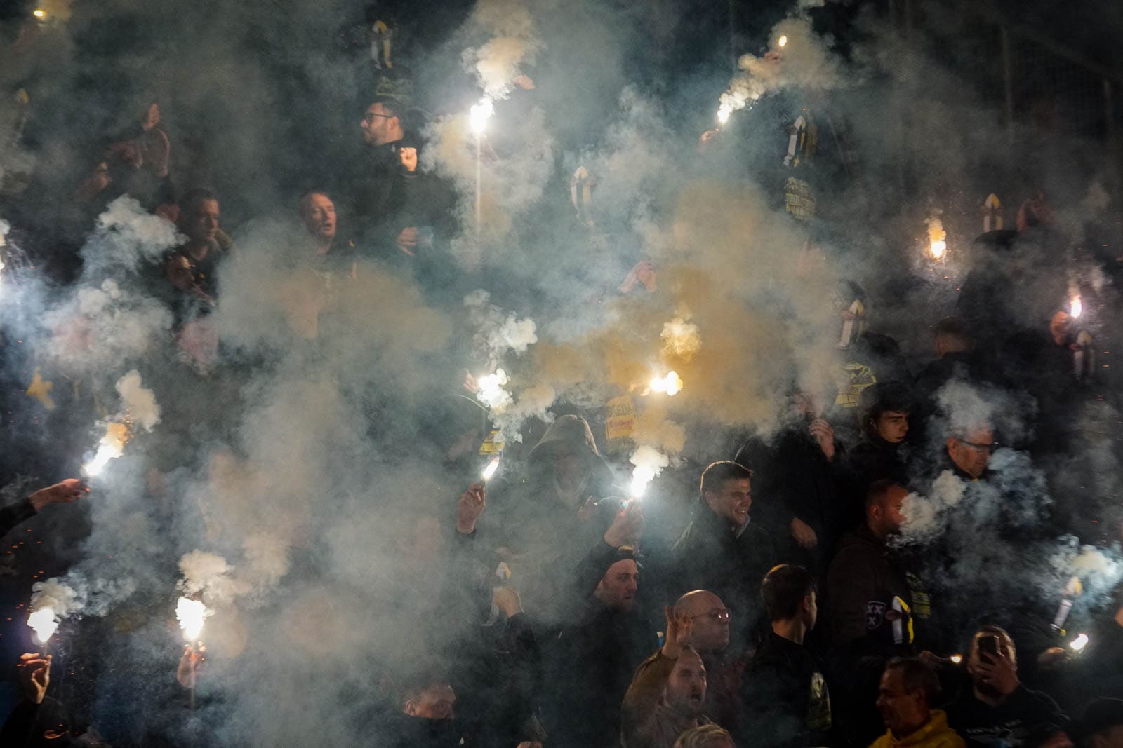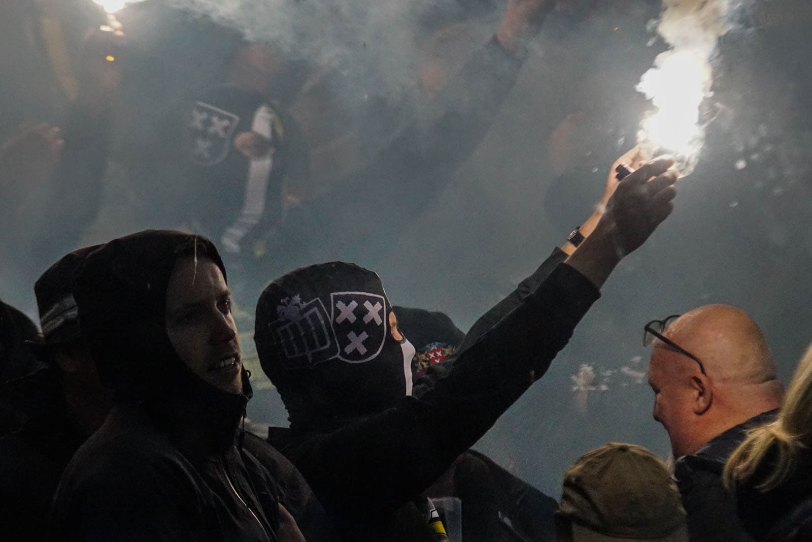 Even later komen ze terug, maar ditmaal met een NAC+Lokeren bivakmuts op. De tifo mag dan misschien gecanceld zijn, de geplande pyroshow moet toch zeker doorgang vinden. Als de 30e minuut aanbreekt worden er zo tientallen strobo’s afgestoken in het uitvak van de Vijverberg. Een schitterend beeld volgt, waarbij het hele vak verandert in flitsende rookwolken. Enige minpuntje is dat er enkele strobo’s het veld op worden gegooid. Hierdoor wordt de wedstrijd een tijdje stilgelegd en volgen er natuurlijk overal weer negatieve en generaliserende berichten over voetbalsupporters.