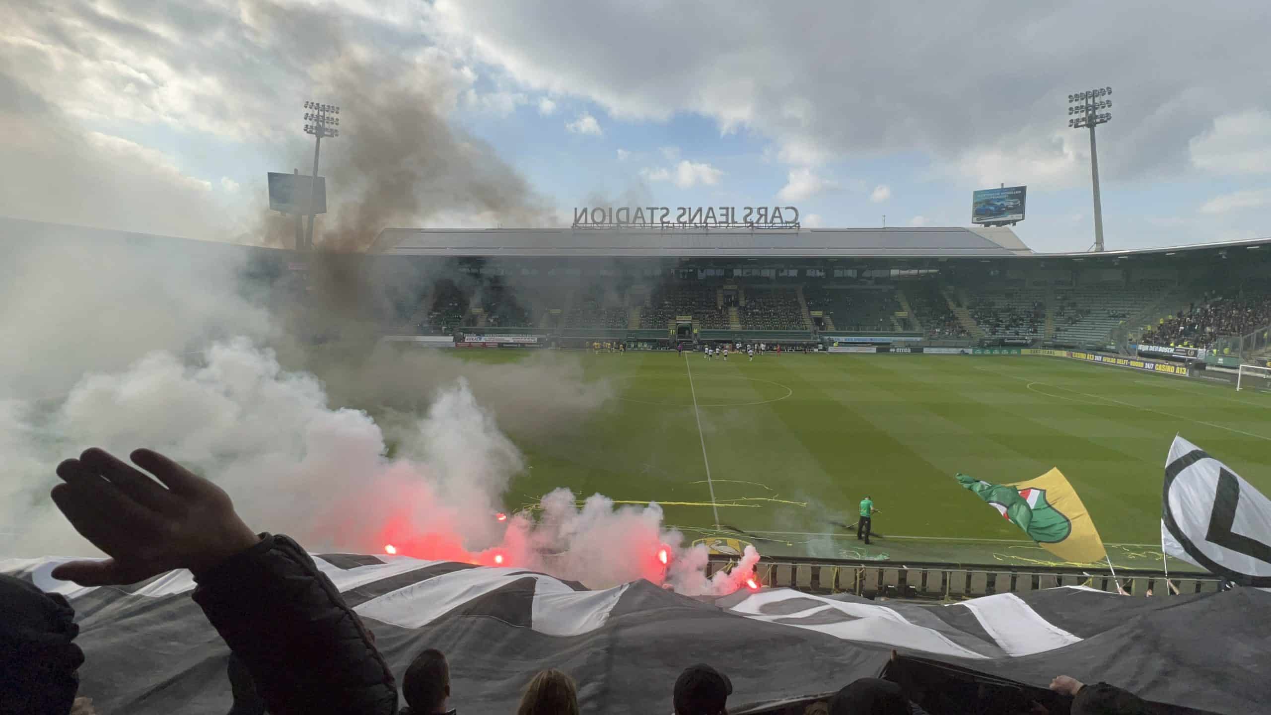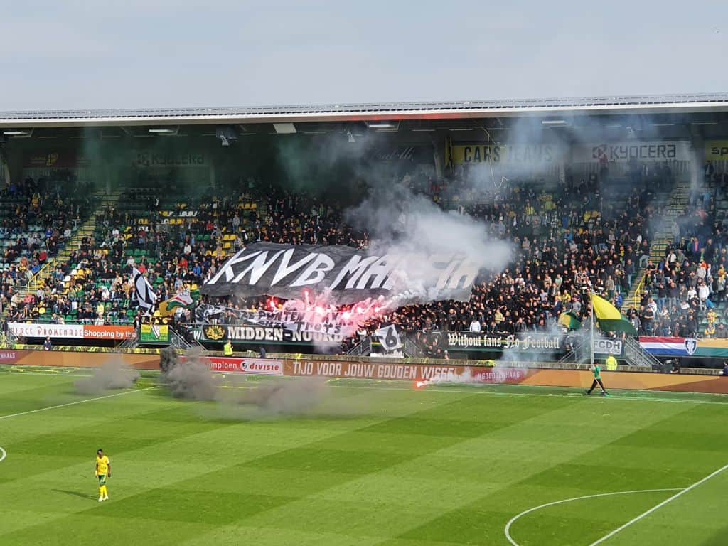 Dit gebrek aan vuurwerk wordt in de zesde minuut echter meer dan goed gemaakt. Een symbolisch moment, want de gehele sfeeractie is een middelvinger naar de 6 punten aftrek die de club door de KNVB al is opgelegd vanwege de financiële wanorde binnen de club. KNVB MAFFIA staat er dus ook op het grote zwarte doek dat wordt uitgerold. Met eronder ‘Ze kunnen onze punten pakken, maar nooit onze trots’. Dit statement wordt door Midden-Noord nog extra kracht bij gezet met zwarte rook en meerdere fakkels. Terwijl de supporters bovenin een bezoekje aan de longarts overwegen, legt de scheidsrechter de wedstrijd stil vanwege de vele rook op het veld. De heerlijke beelden zijn ook op tv niet te missen. Het statement is gemaakt.