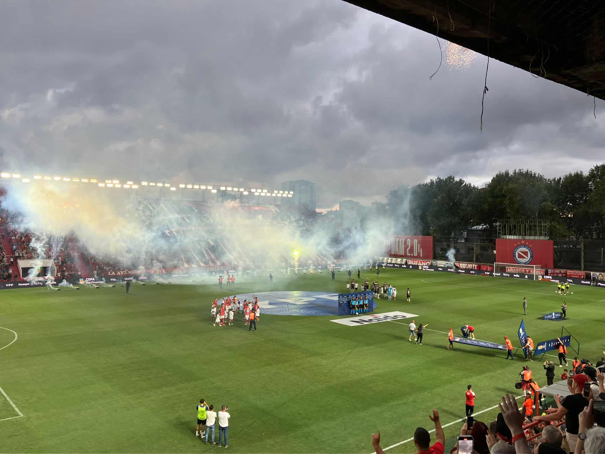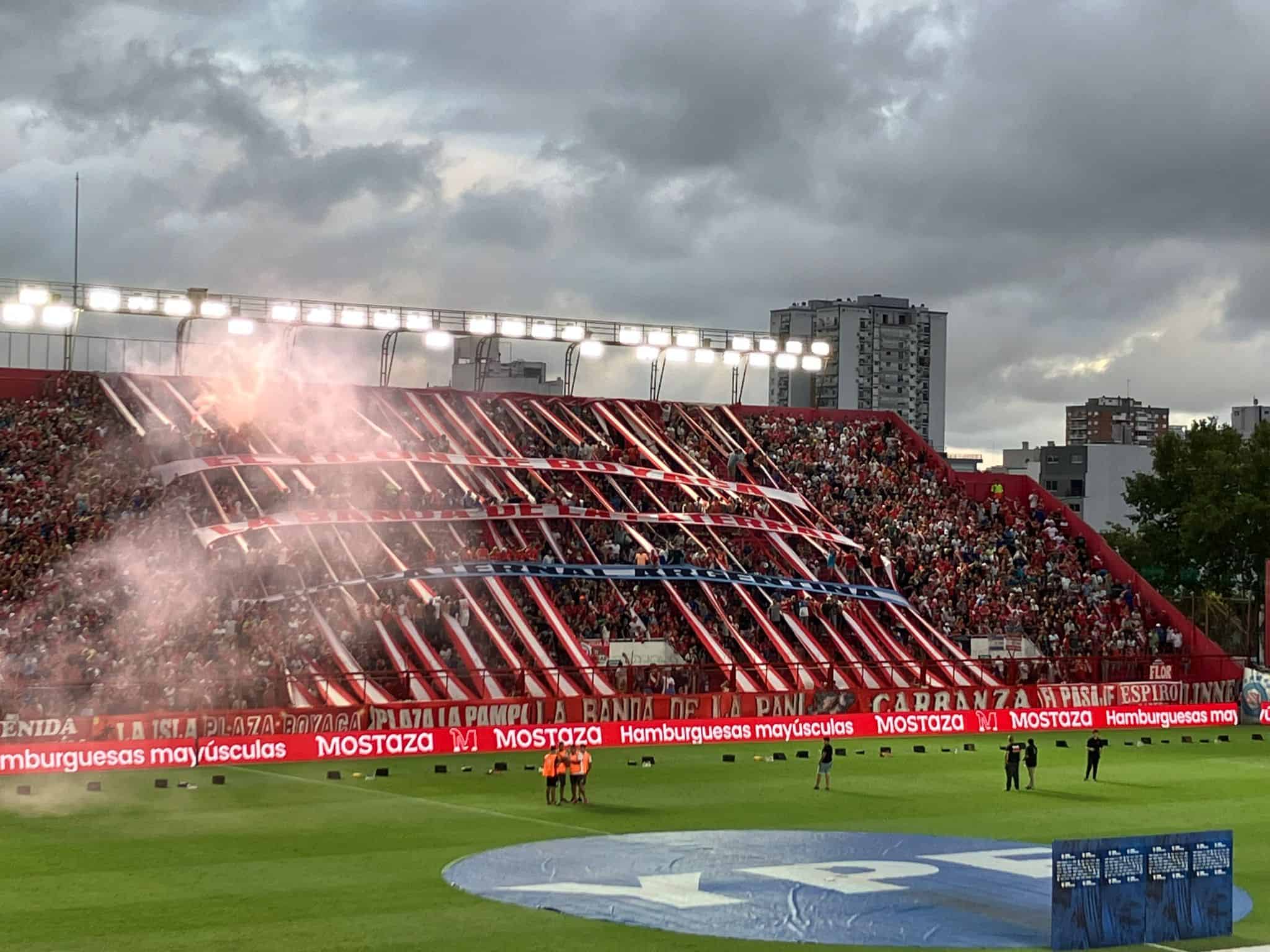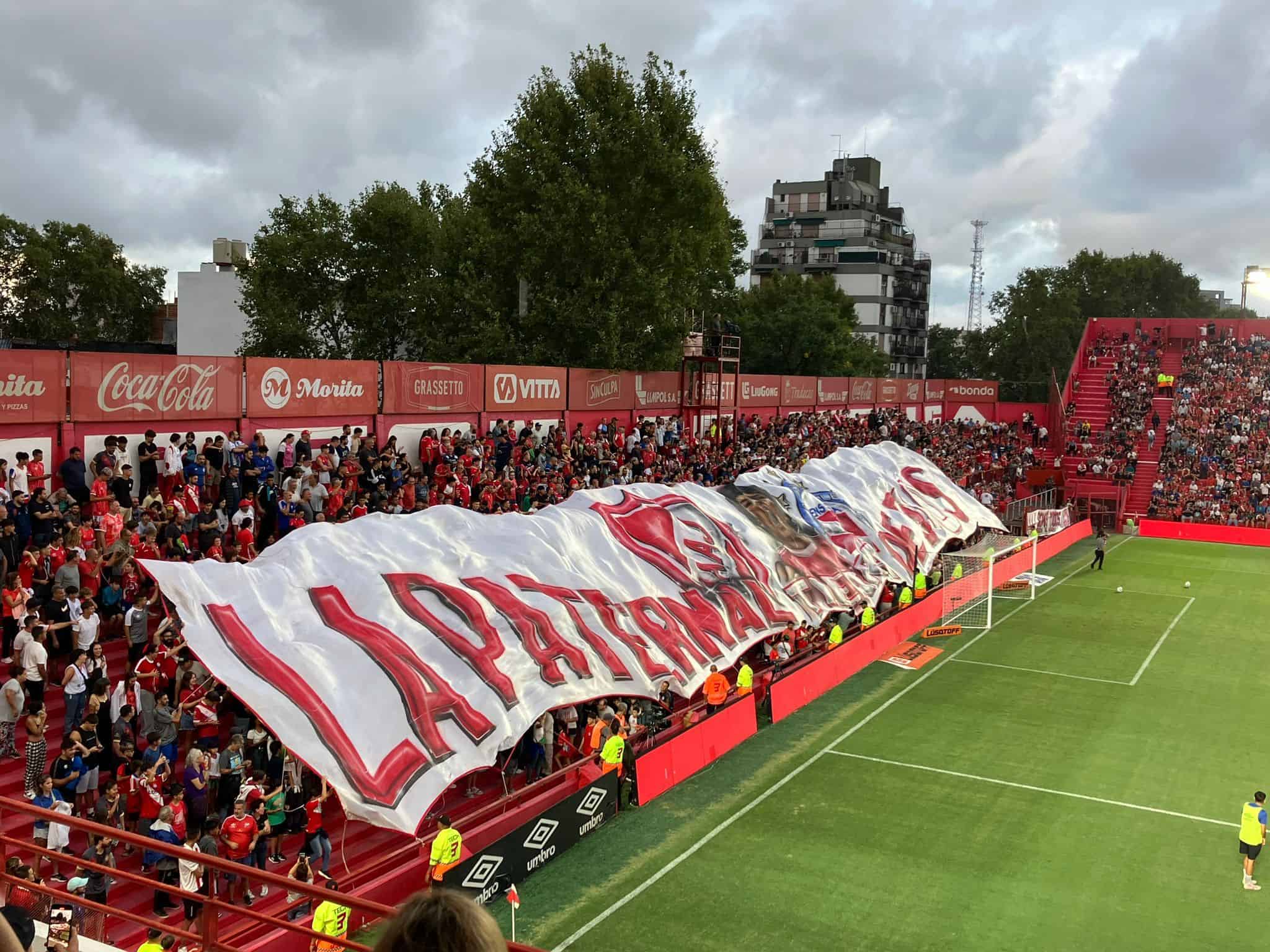 Vanaf het moment dat La Banda Paternal het stadion binnenkomt is het alleen tijdens de rust even stil. Verder gaat het, vooral op de lange zijde tegenover ons, de hele wedstrijd los. Drums en trompetten bepalen de songs en het tempo. Pyro is er in overvloed. Georganiseerd en ongeorganiseerd. Geen bivakmutsen of doeken, maar gewoon aansteken en omhoog houden. Fakkels en rookpotten. Aan onze linkerzijde een groot doek van Maradona dat twee keer over de hoofden gaat en tegenover ons een nog groter doek met de letters A.A.A.J. (Asociación Atlética Argentinos Juniors). Dat laatste gaat zelfs tijdens de wedstrijd twee keer over de hoofden en linten van de barras bravas. De laatste keer om ritmisch mee te bewegen met de klanken van La Banda. Een van onze reisgenoten kijkt naar het kippenvel op zijn armen en daarna naar ons: “Hiervoor ben ik naar Argentinië gegaan”.