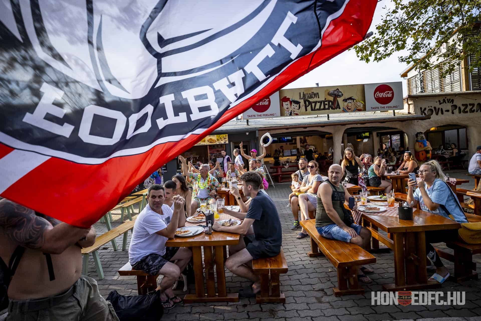 Er is enorm veel animo voor de awayday naar partystad Siófok. Wanneer we een week eerder kaarten willen halen, horen we drie uur na de start van de verkoop dat het vak binnen een uur al is uitverkocht. Later die dag belooft de harde kern via Facebook dat iedereen sowieso het uitvak in kan, ter plekke komen er genoeg extra kaarten. Met de trein reizen we dus vanuit Budapest twee uur naar badplaats Siofók aan het Balatonmeer en zo’n drie uur voor de wedstrijd verzamelen de supporters in een parkje. Dan begint de corteo door de straten en wordt Siófok veroverd. Vakantiegangers die dachten een rustig middagje op het terras te hebben, weten niet wat ze meemaken als de Puskás Army voorbijkomt. Tientallen keren gaat er pyro de lucht in en de gebruikelijke liederen worden luid meegezongen door de pakweg 700 supporters.