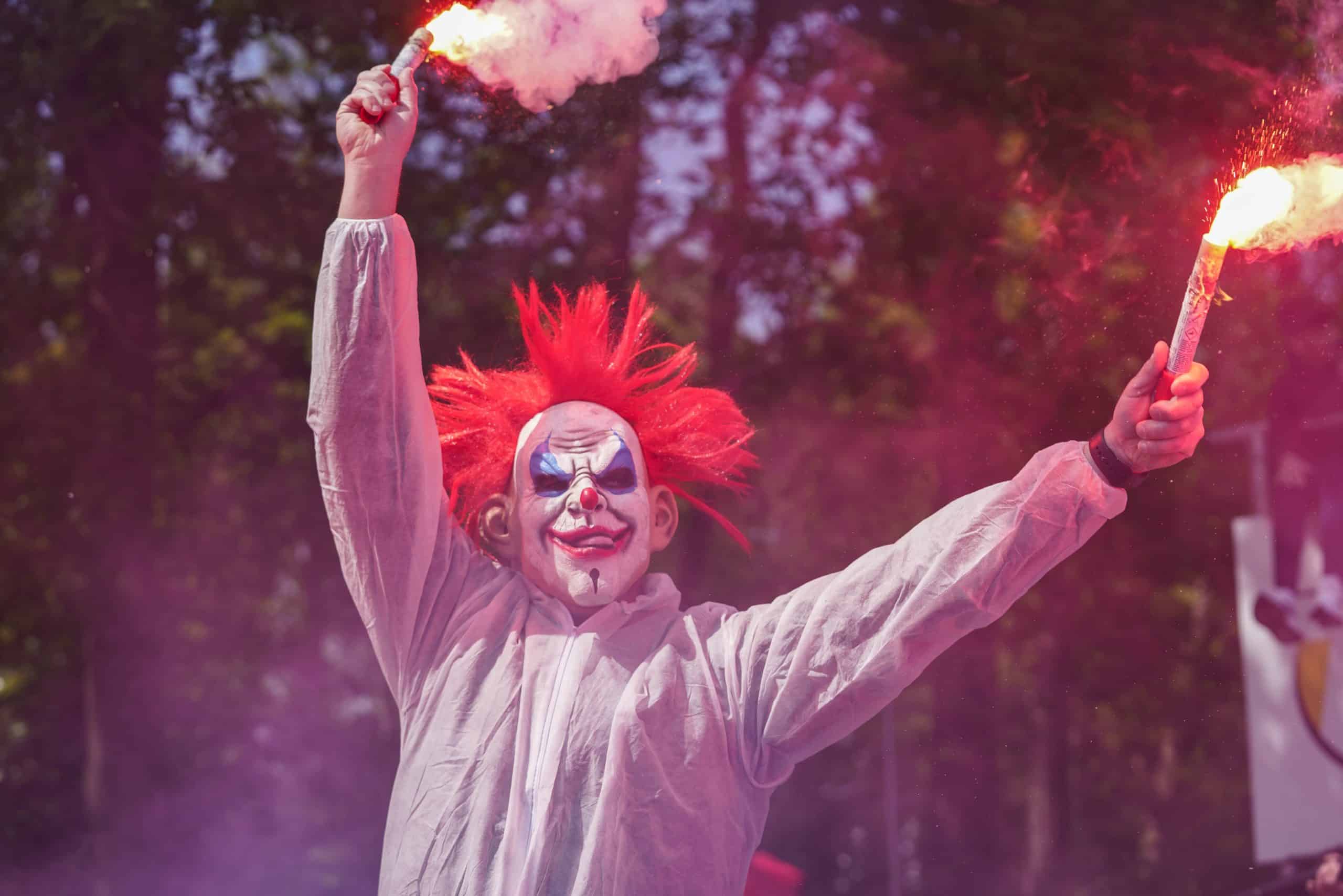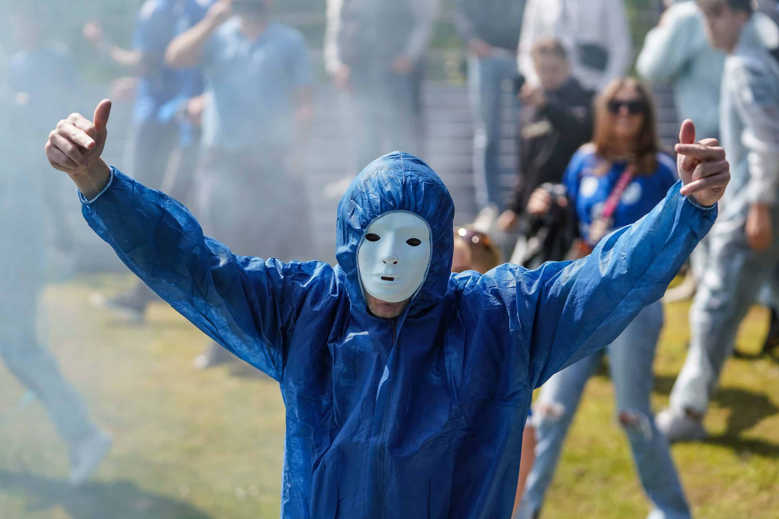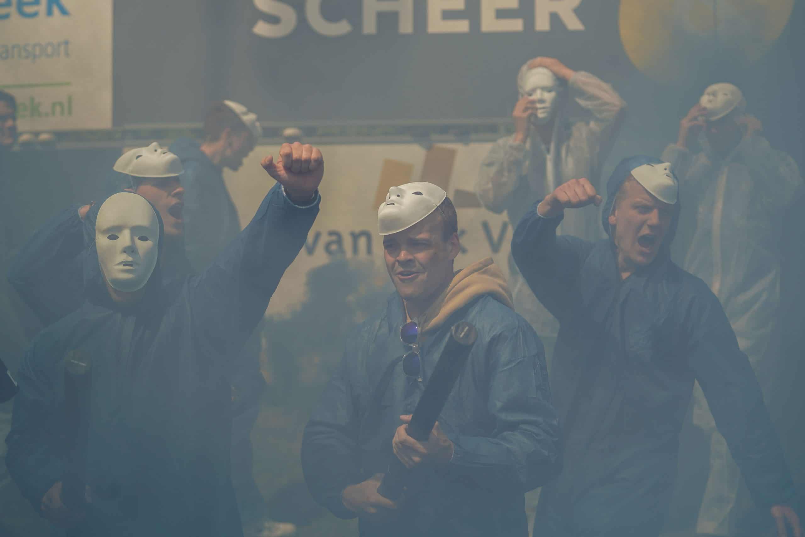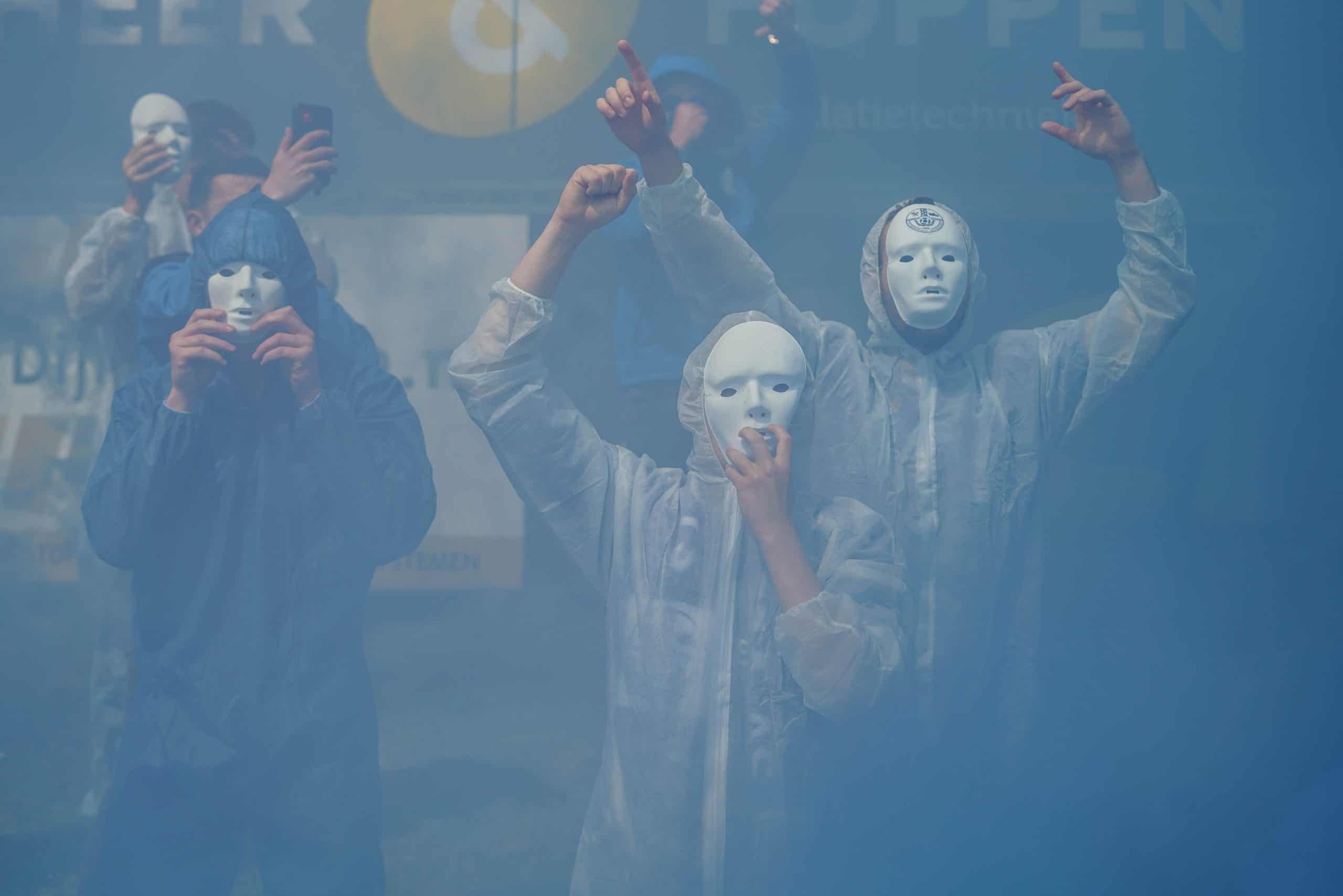 Bij de opkomst blijkt dat we niet voor niets zijn afgereisd naar de stad van het Dolfinarium. Bij Veensche Boys hebben ze een hele show uitgedacht voor deze bijzondere wedstrijd. Gehuld in witte pakken en met maskers op wordt er een bult aan vuurwerk afgestoken. Ook loopt er iemand met een clownsmasker rond. De fakkels en rook zorgen samen voor een mooi beeld. Ook bij Berkum hebben ze aardig wat rook meegenomen. Uiteraard in de zwarte clubkleuren. Samen zorgen de supporters zo voor een finalewaardige opkomst.