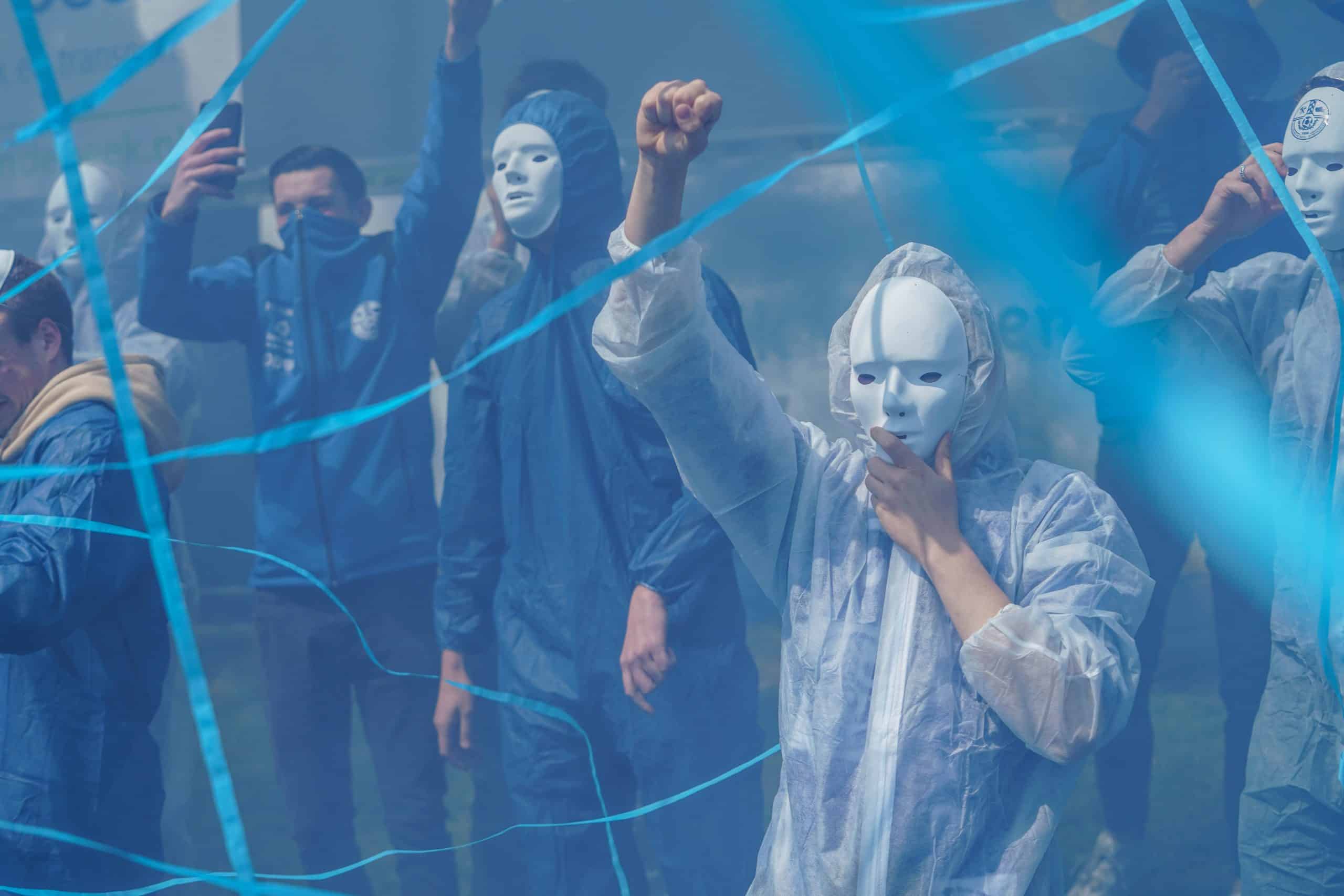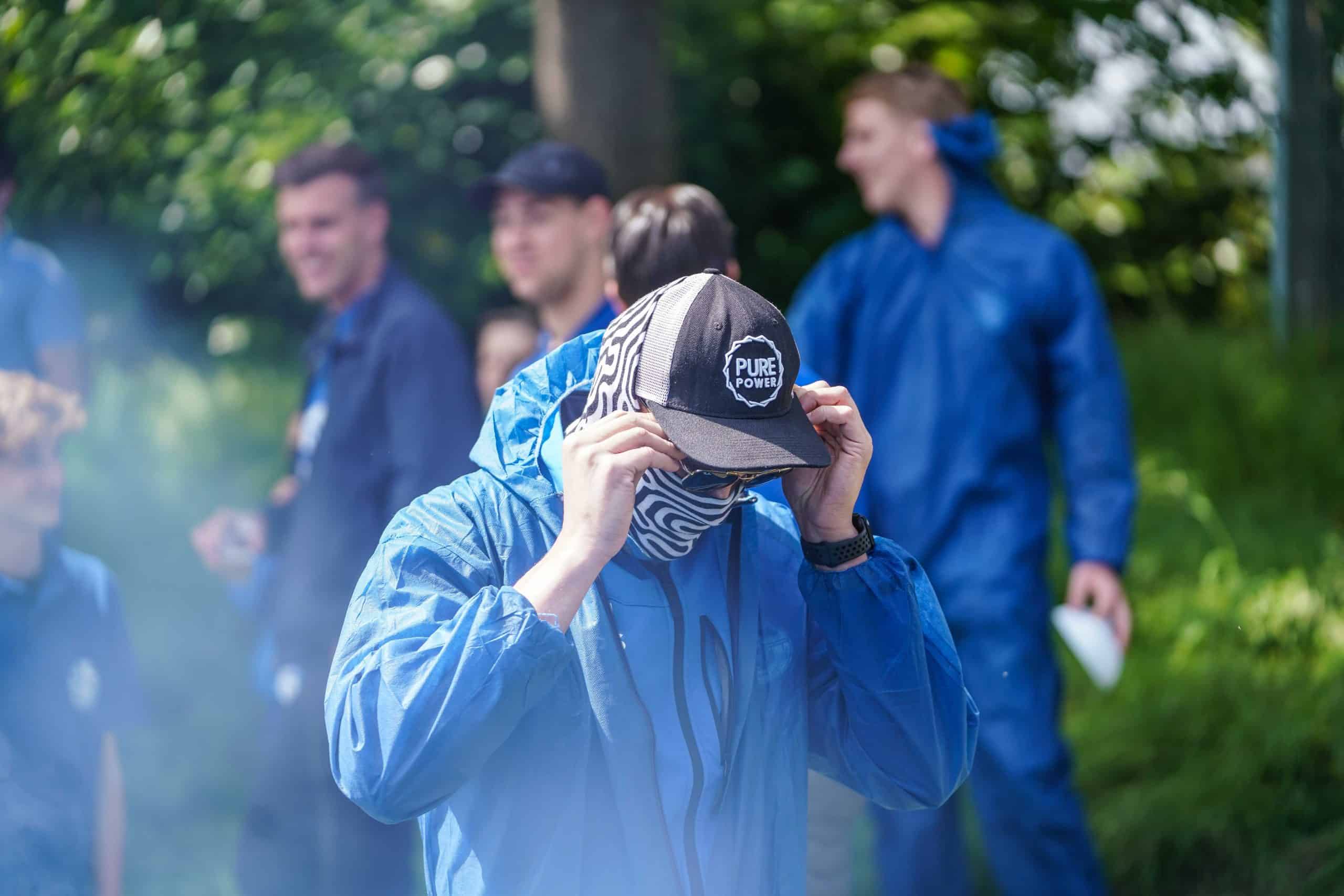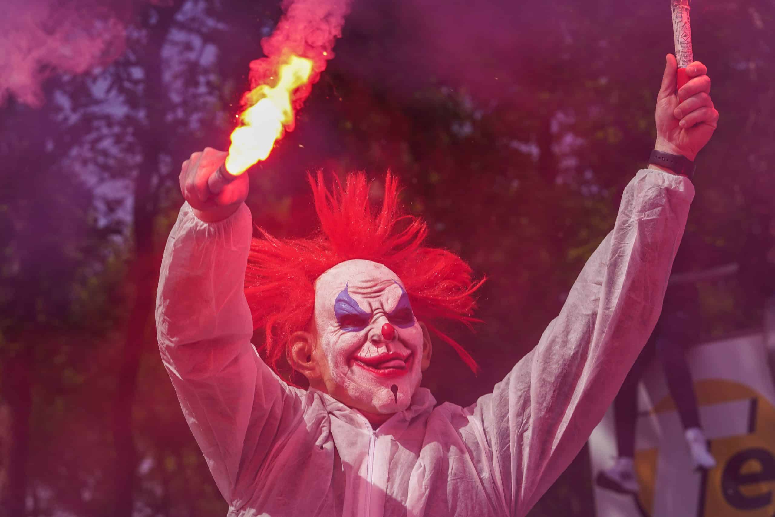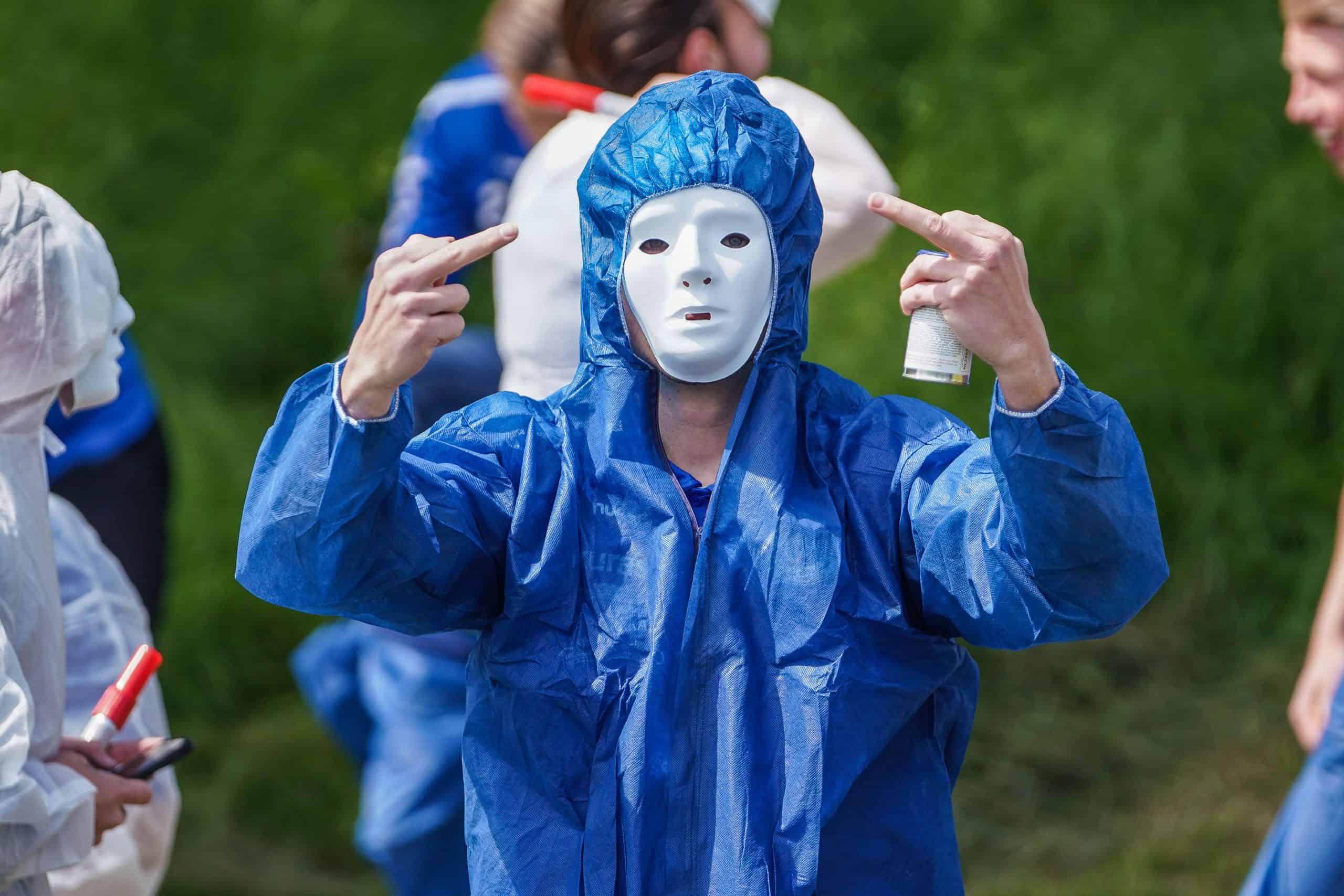 Bij de opkomst blijkt dat we niet voor niets zijn afgereisd naar de stad van het Dolfinarium. Bij Veensche Boys hebben ze een hele show uitgedacht voor deze bijzondere wedstrijd. Gehuld in witte pakken en met maskers op wordt er een bult aan vuurwerk afgestoken. Ook loopt er iemand met een clownsmasker rond. De fakkels en rook zorgen samen voor een mooi beeld. Ook bij Berkum hebben ze aardig wat rook meegenomen. Uiteraard in de zwarte clubkleuren. Samen zorgen de supporters zo voor een finalewaardige opkomst.