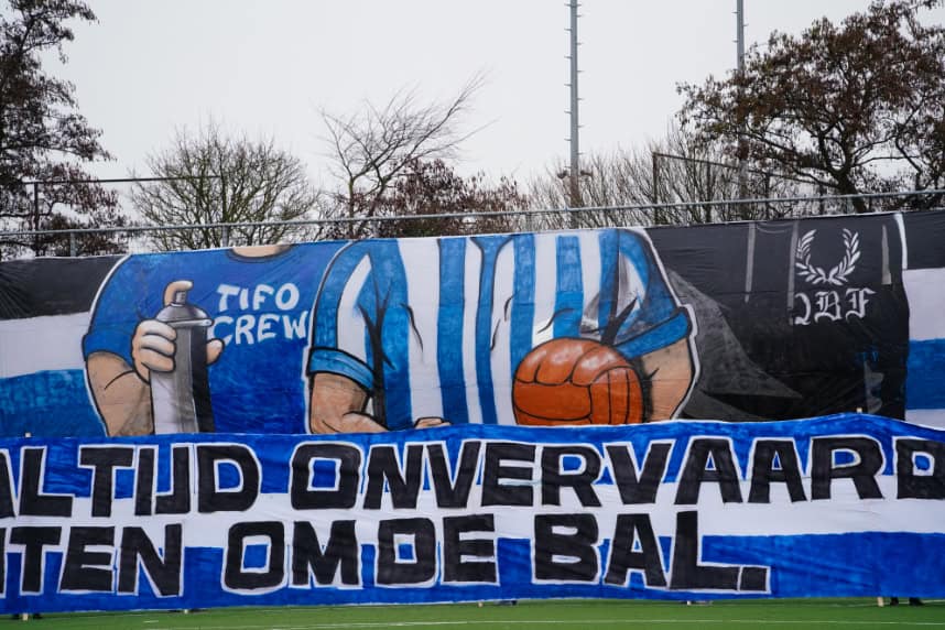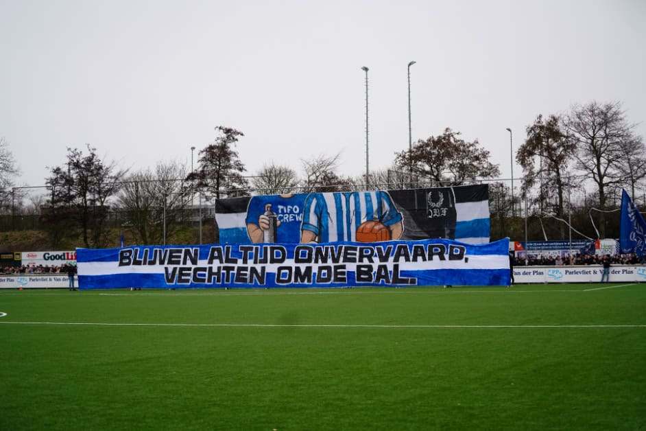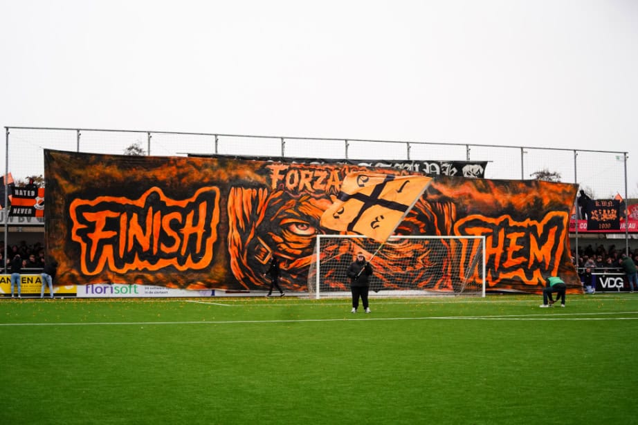 Aan de zijde van Katwijk is een simpele, maar duidelijke boodschap: “Finish Them”, in de kenmerkende oranje-zwarte kleuren van de club en met een gezicht in het midden. Bij Quick Boys grijpen ze terug naar een strofe uit het clublied: ‘Blijven altijd onvervaard, vechten om de bal.’ Achter deze tekst op het veld worden vervolgens personen in het shirt van de club, een tifo crew shirt en een Quick Boys Firm-jack op het net getakeld.