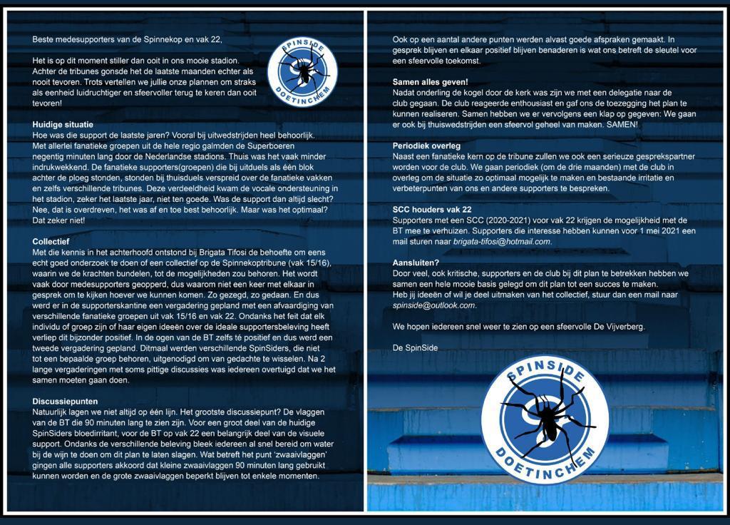 Mede door het fantastische werk van de Brigata Tifosi hebben de supporters van De Graafschap een goede reputatie opgebouwd op het gebied van sfeeracties en volle uitvakken. Denk bijvoorbeeld aan de corona-proof awayday dit seizoen en de schitterende acties met de joker enkele seizoenen geleden. Toch viel de sfeer in thuiswedstrijden vaak tegen. Na een aantal negatieve jaren maakte de Brigata in 2014/15 namelijk de keuze om te verplaatsen van de korte zijde naar vak 22 op de lange zijde. Dit zorgde voor een verdeelde sfeer waarbij soms zelfs tegen elkaar in werd gezongen. Na successen rondom de boycot van de uitwedstrijd in Eindhoven en het stadionproject De Vijverberg zijn de Brigata Tifosi en de SpinSide (de korte zijde) nader tot elkaar gekomen. Vanaf aankomend seizoen zal de Brigata Tifosi dus weer terugkeren op de korte zijde en deel uit te maken van een SpinSide Collectief!