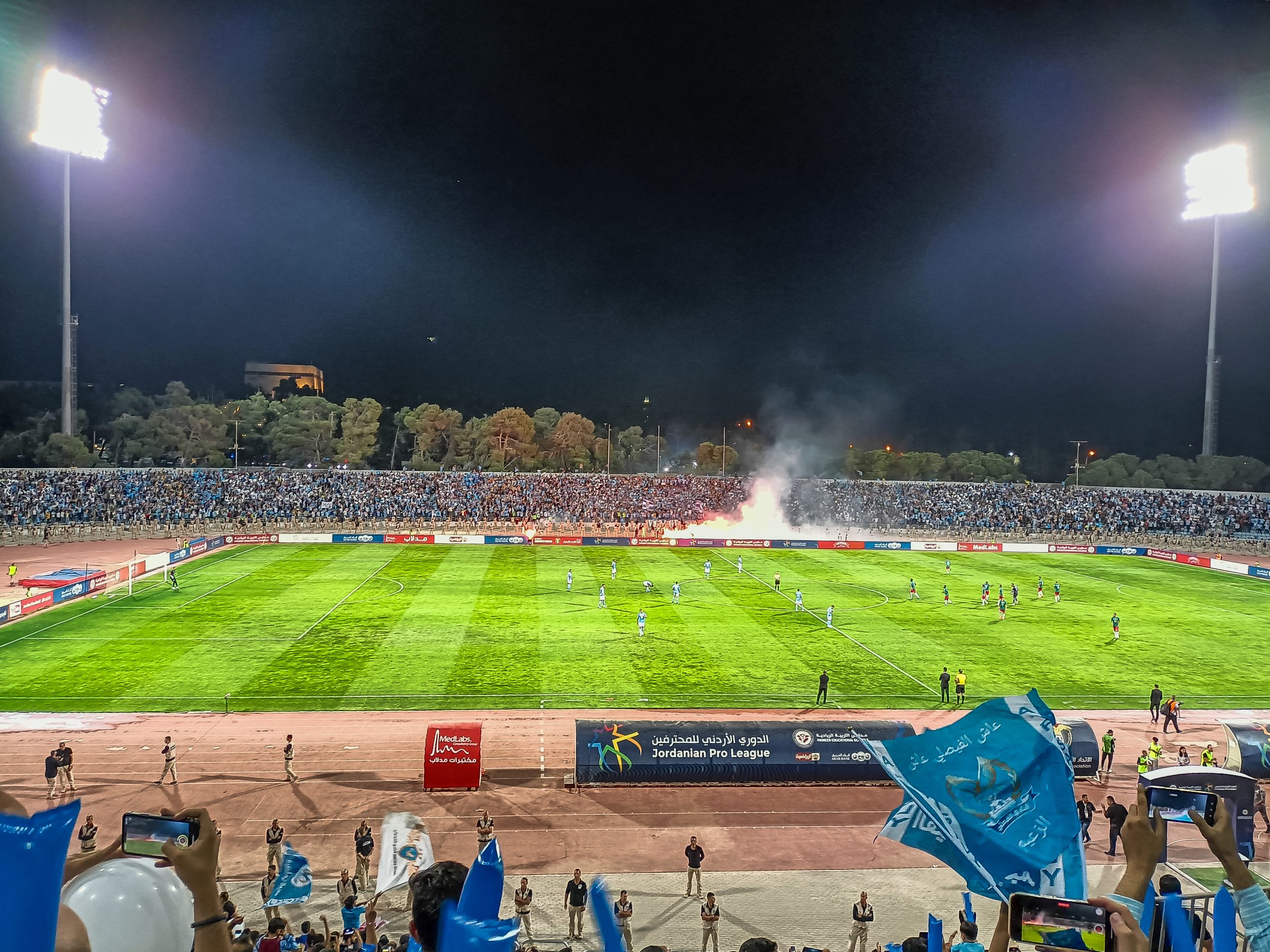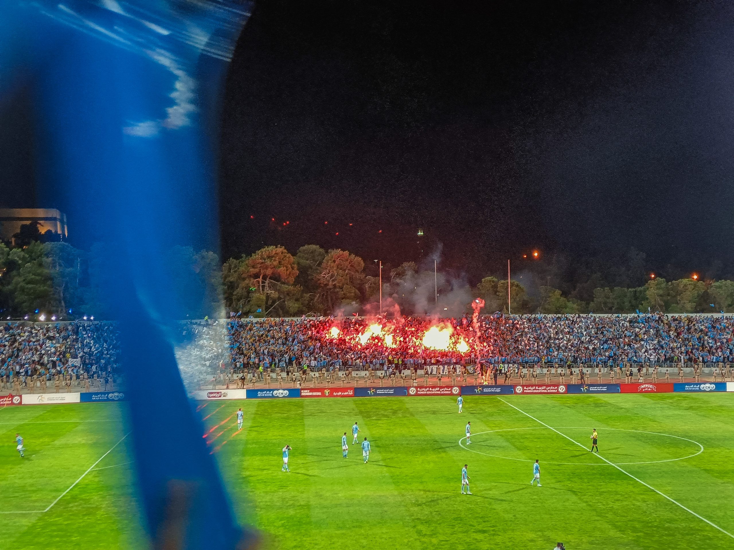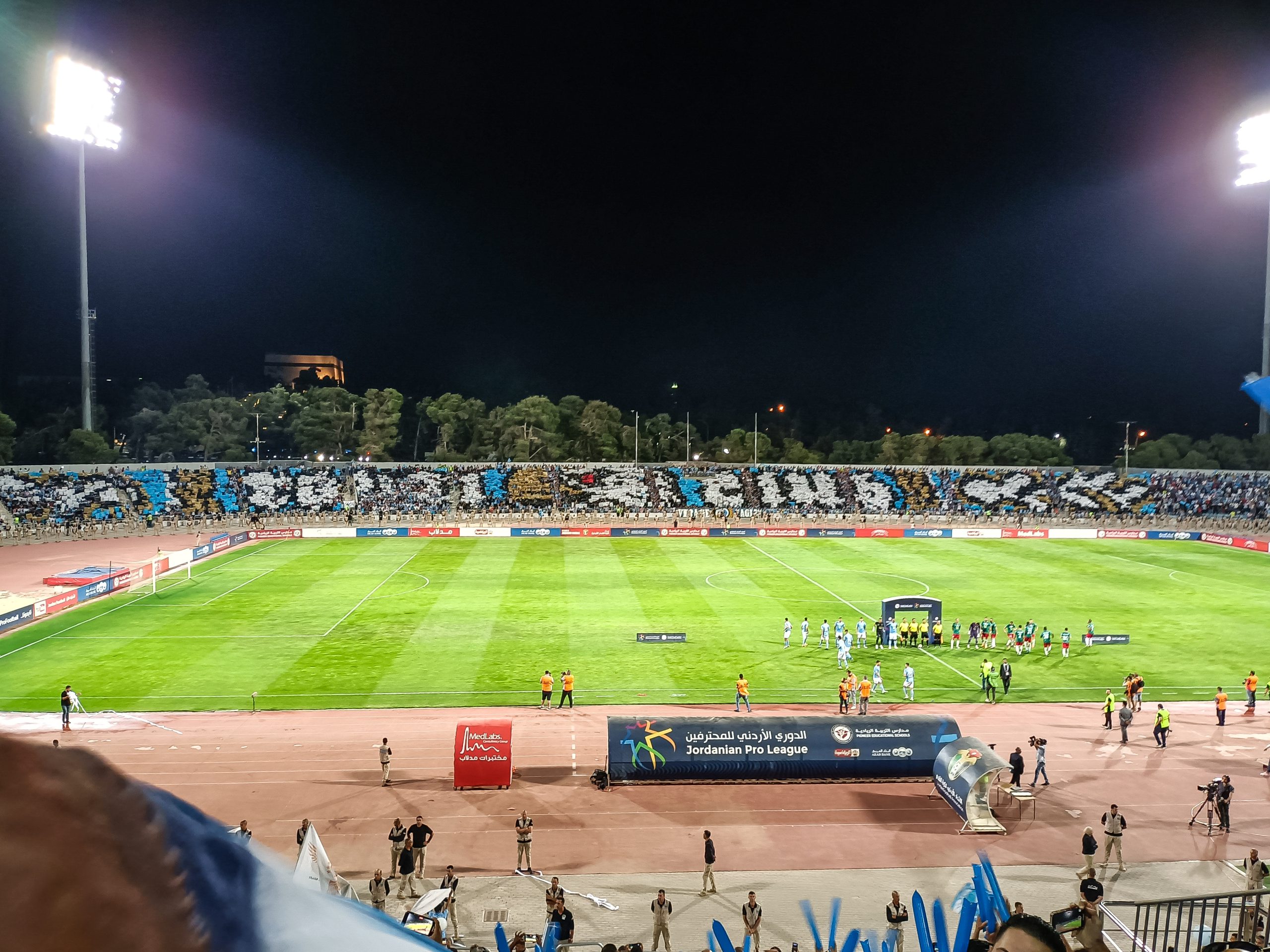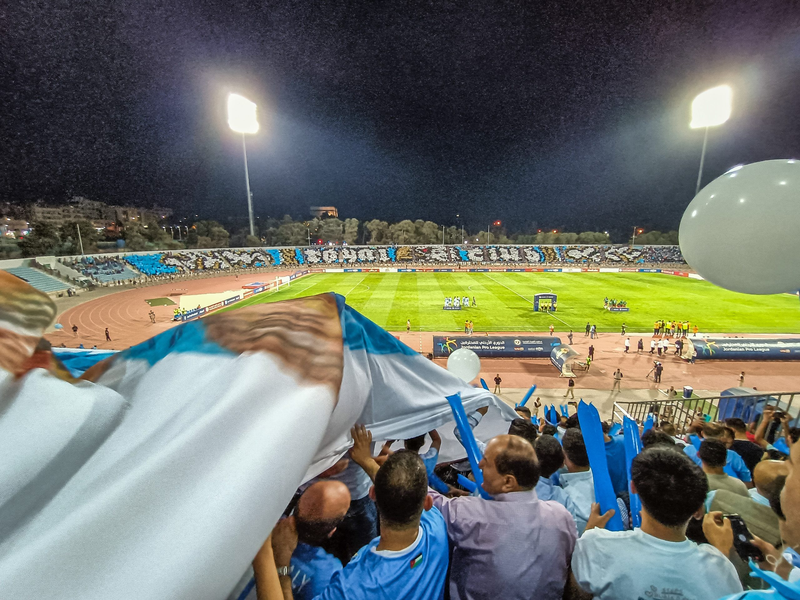 Voor de aftrap hebben zowel de thuissupporters als de uitsupporters een mooie tifo voorbeid. Op de lange zijde is een vellenactie voorbereid die samen een blauwe adelaar met gouden details vormt. Over het vak waar wij zitten wordt een groot spandoek uitgerold met onder meer de beeltenis van een speler. Als deze acties voorbij zijn worden er op de lange zijde tientallen fakkels afgestoken. Ook in Jordanië kunnen ze er wat van dus! Het uitvak heeft een actie voorbereid op een soort stellage met lange stokken, wat vervolgens weer wordt ingeruild voor een spandoek over het vak heen.