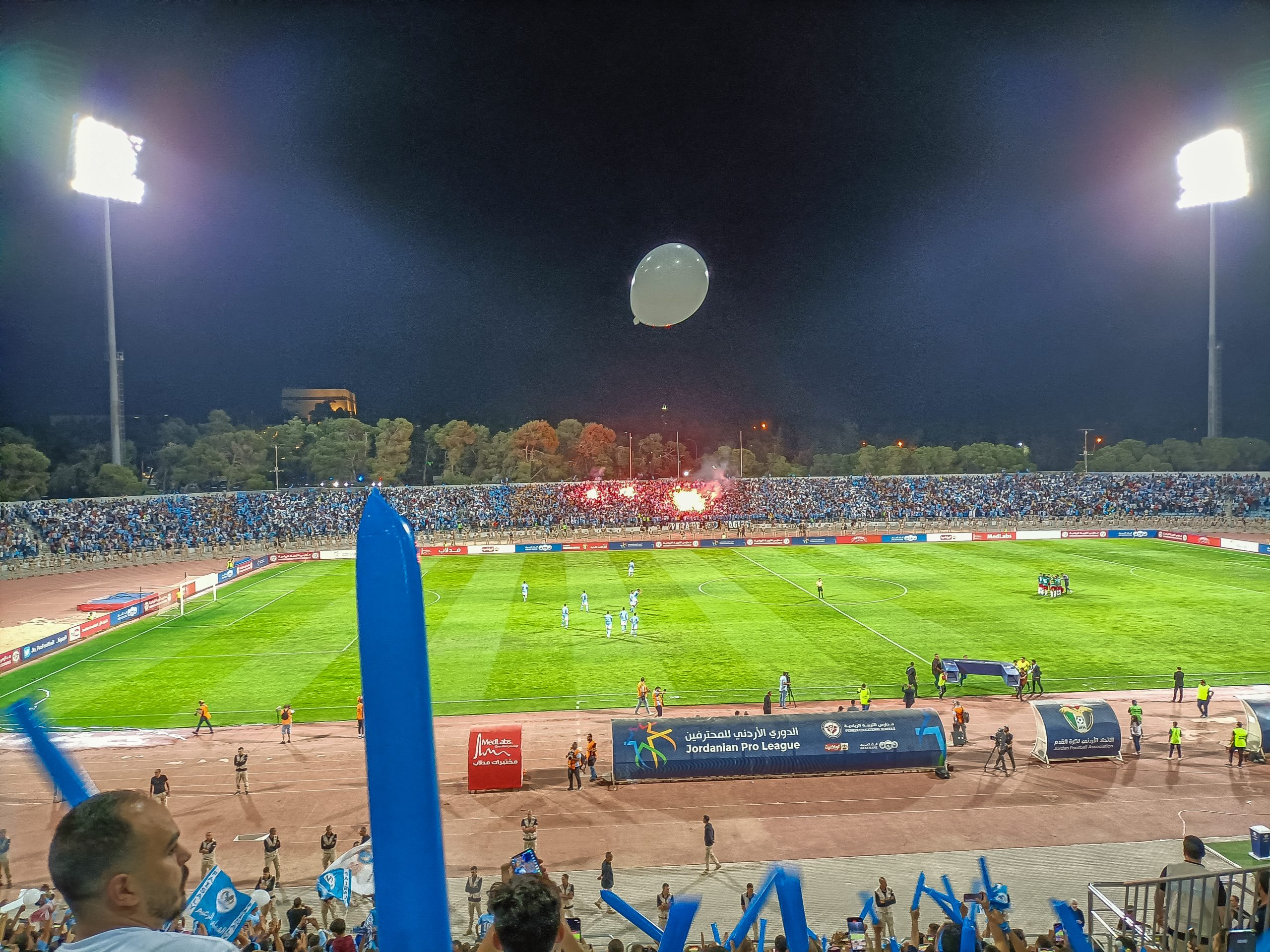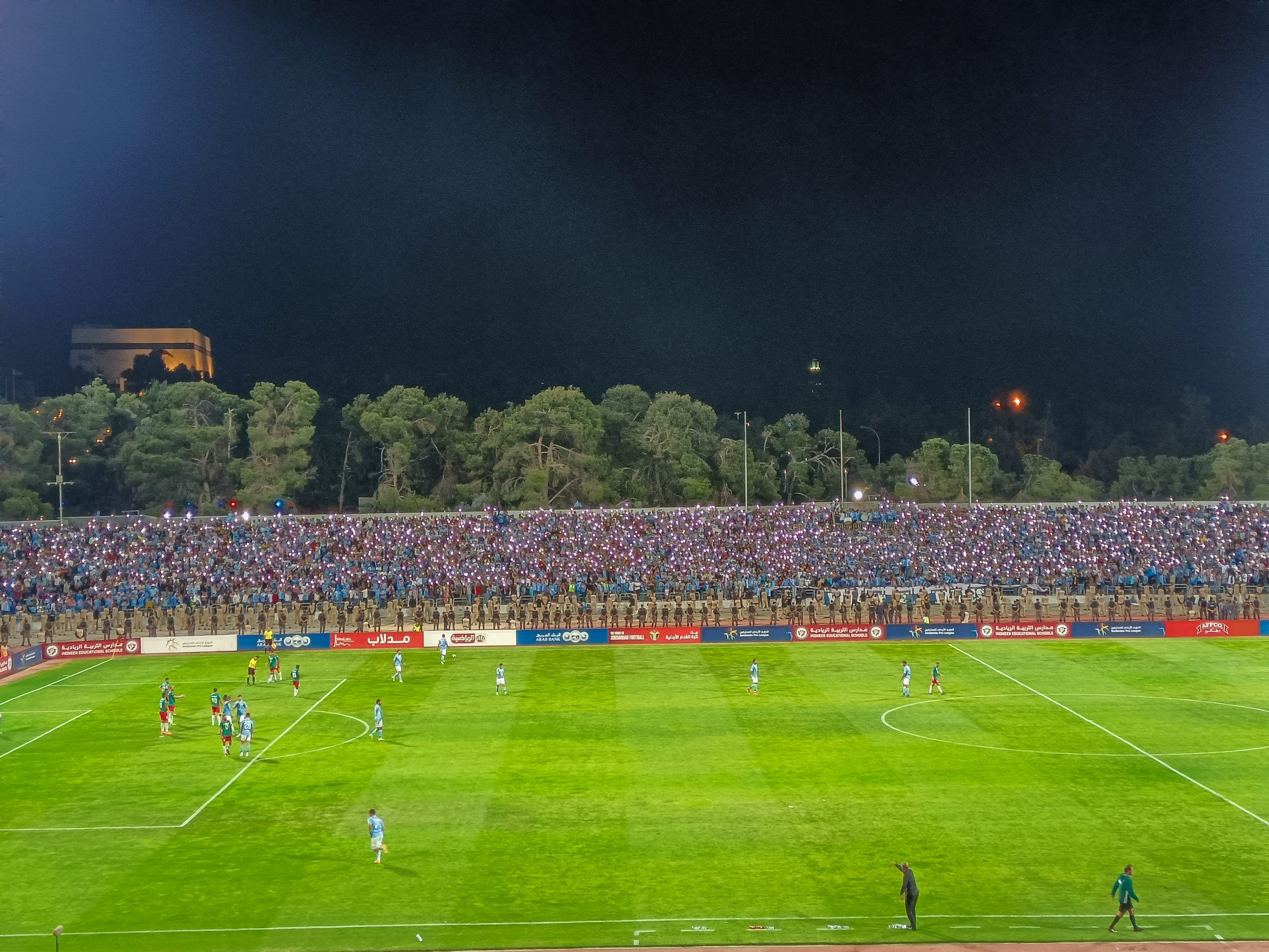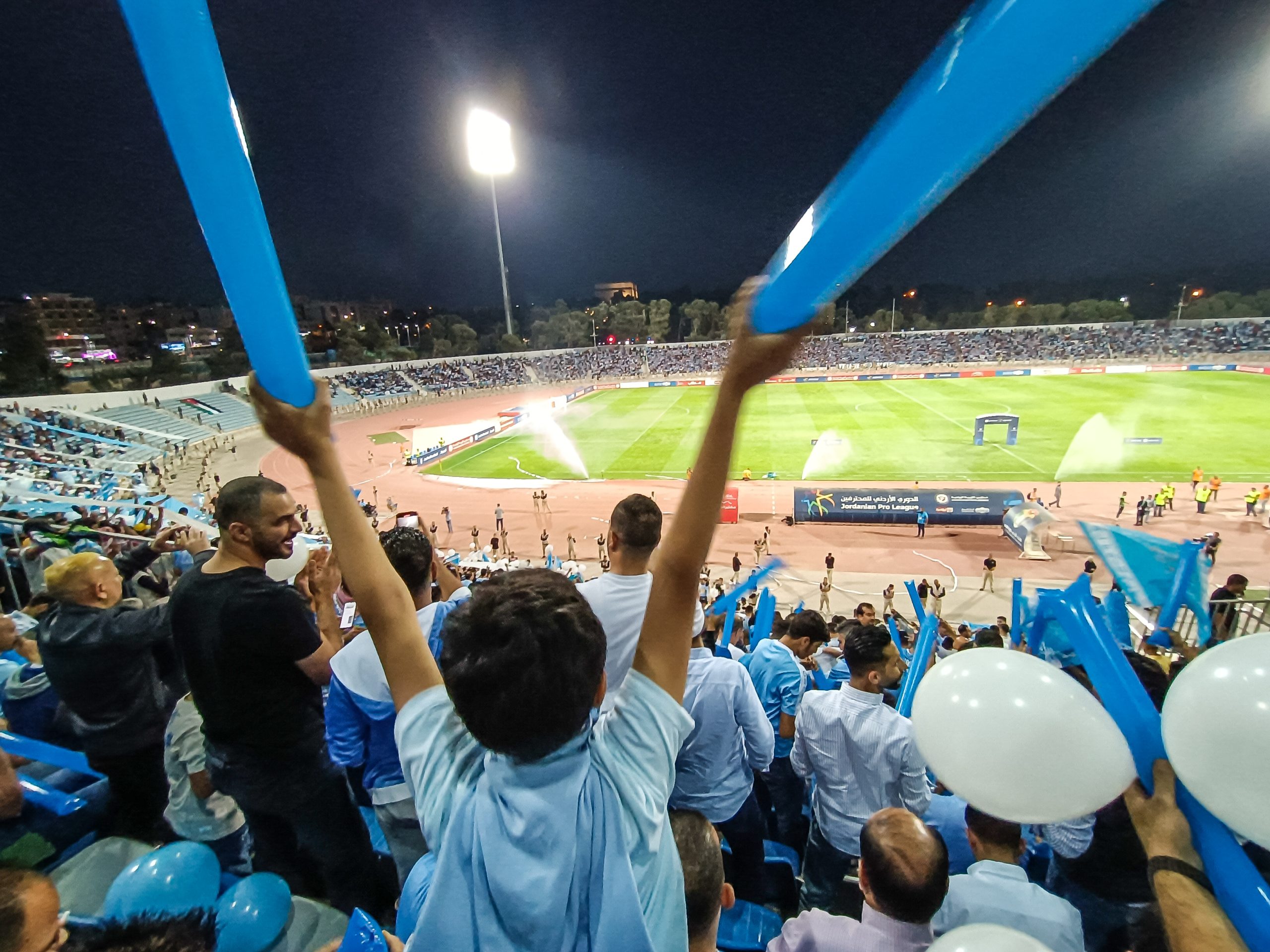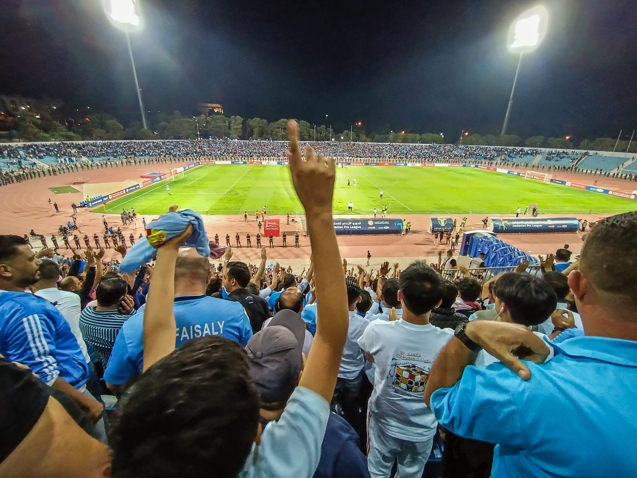 Voor de aftrap hebben zowel de thuissupporters als de uitsupporters een mooie tifo voorbeid. Op de lange zijde is een vellenactie voorbereid die samen een blauwe adelaar met gouden details vormt. Over het vak waar wij zitten wordt een groot spandoek uitgerold met onder meer de beeltenis van een speler. Als deze acties voorbij zijn worden er op de lange zijde tientallen fakkels afgestoken. Ook in Jordanië kunnen ze er wat van dus! Het uitvak heeft een actie voorbereid op een soort stellage met lange stokken, wat vervolgens weer wordt ingeruild voor een spandoek over het vak heen.