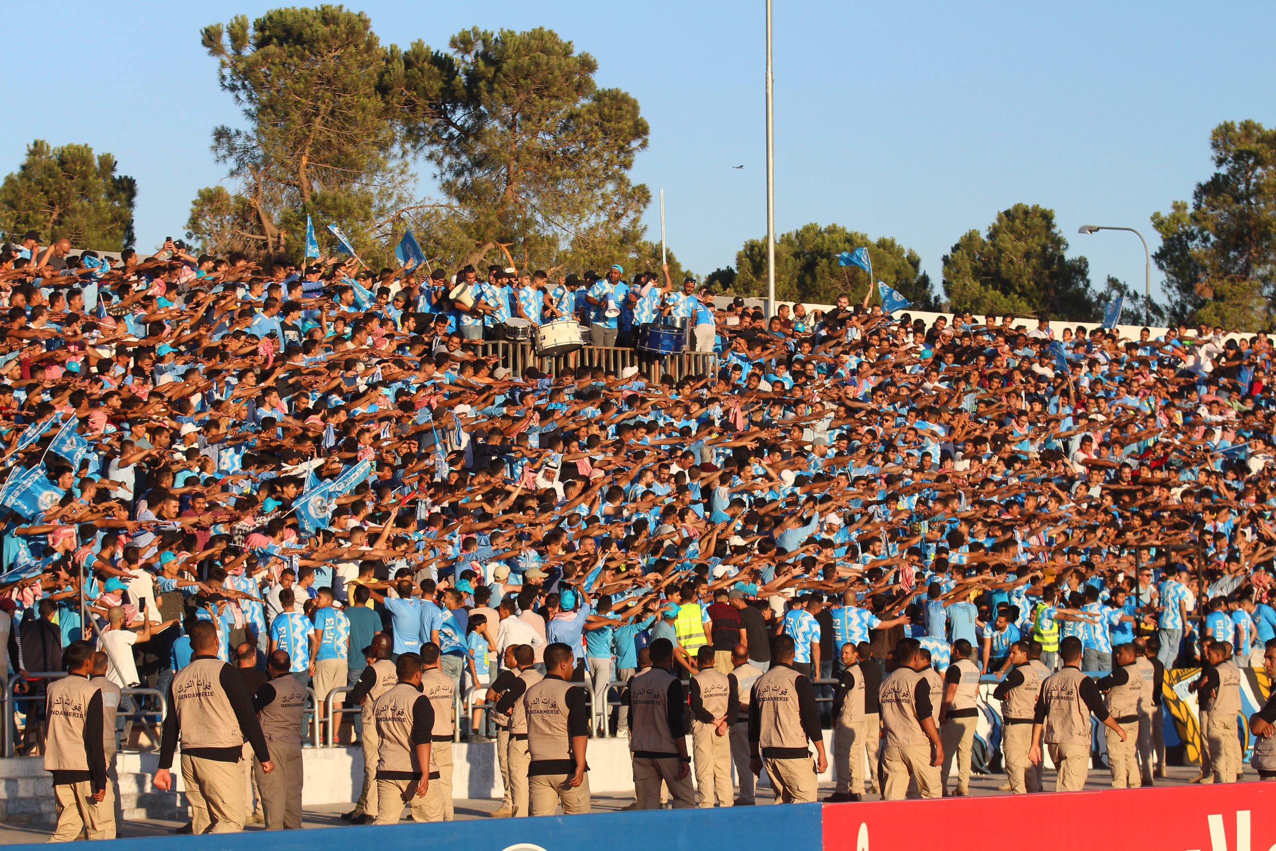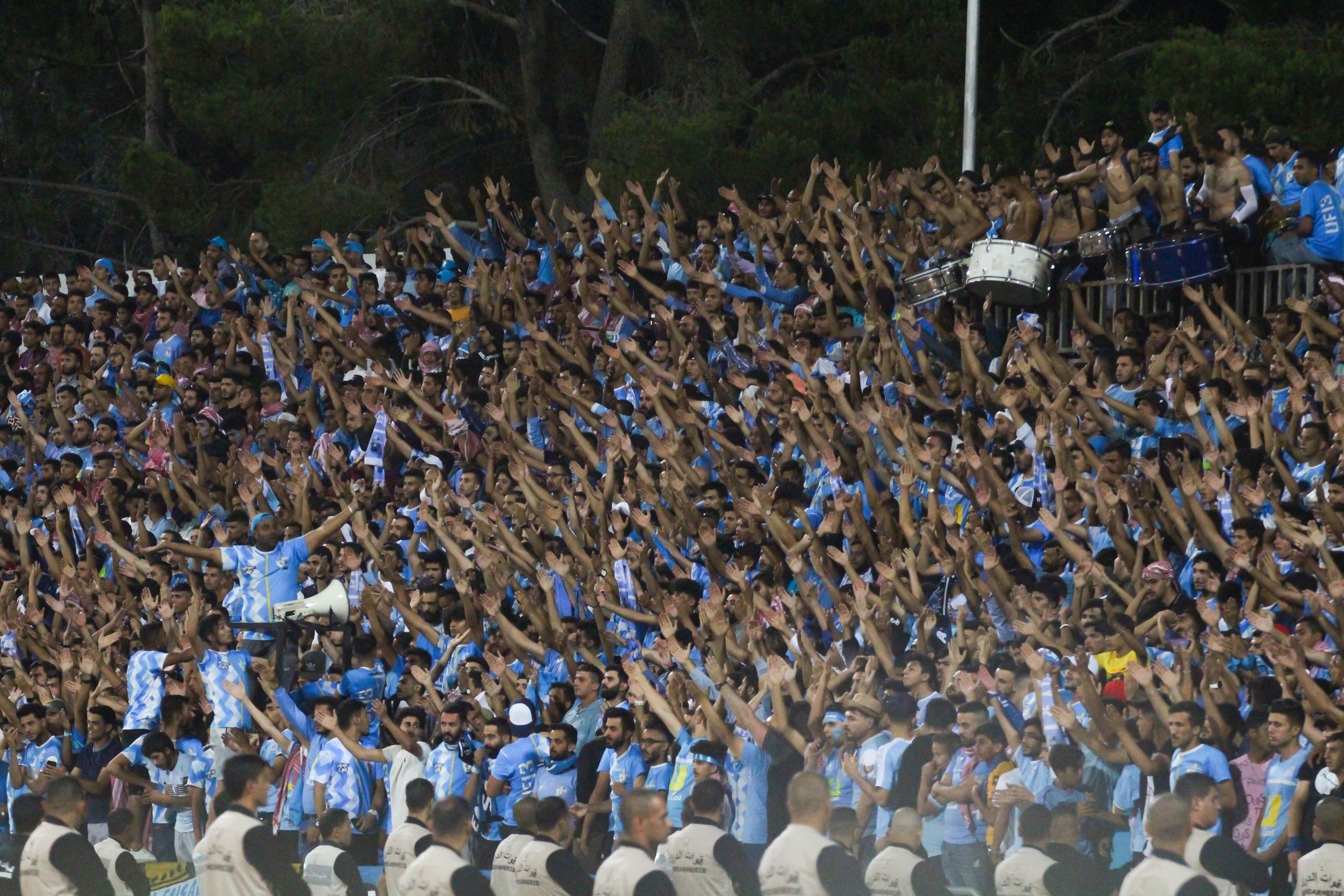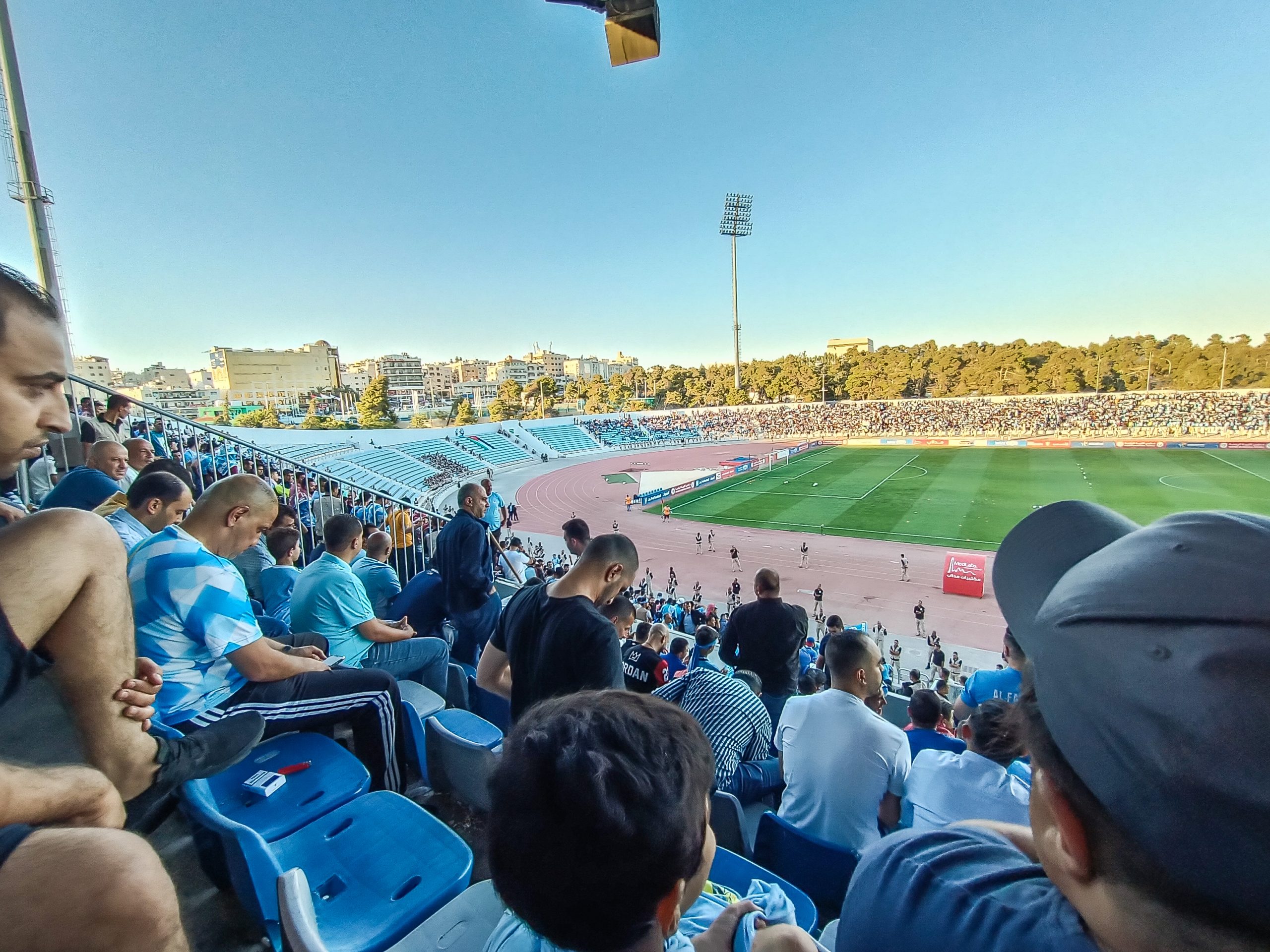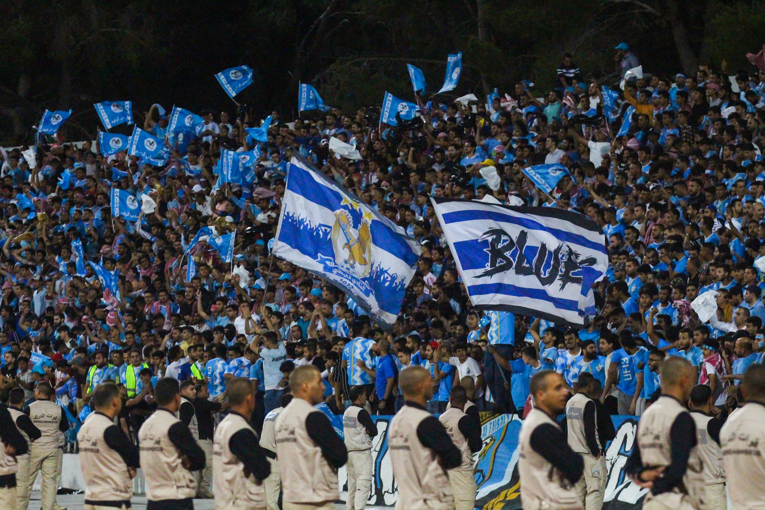 Voor de aftrap hebben zowel de thuissupporters als de uitsupporters een mooie tifo voorbeid. Op de lange zijde is een vellenactie voorbereid die samen een blauwe adelaar met gouden details vormt. Over het vak waar wij zitten wordt een groot spandoek uitgerold met onder meer de beeltenis van een speler. Als deze acties voorbij zijn worden er op de lange zijde tientallen fakkels afgestoken. Ook in Jordanië kunnen ze er wat van dus! Het uitvak heeft een actie voorbereid op een soort stellage met lange stokken, wat vervolgens weer wordt ingeruild voor een spandoek over het vak heen.