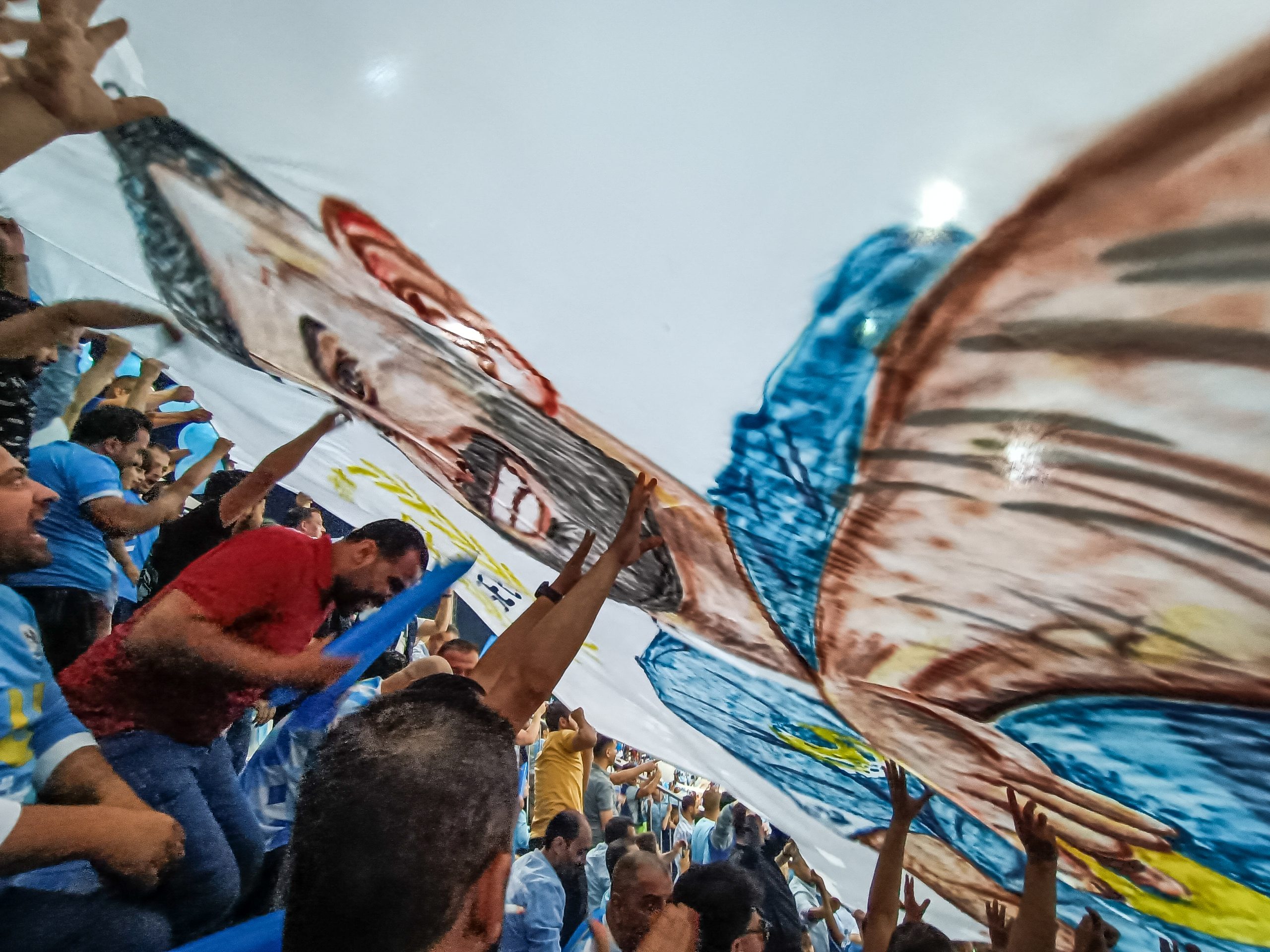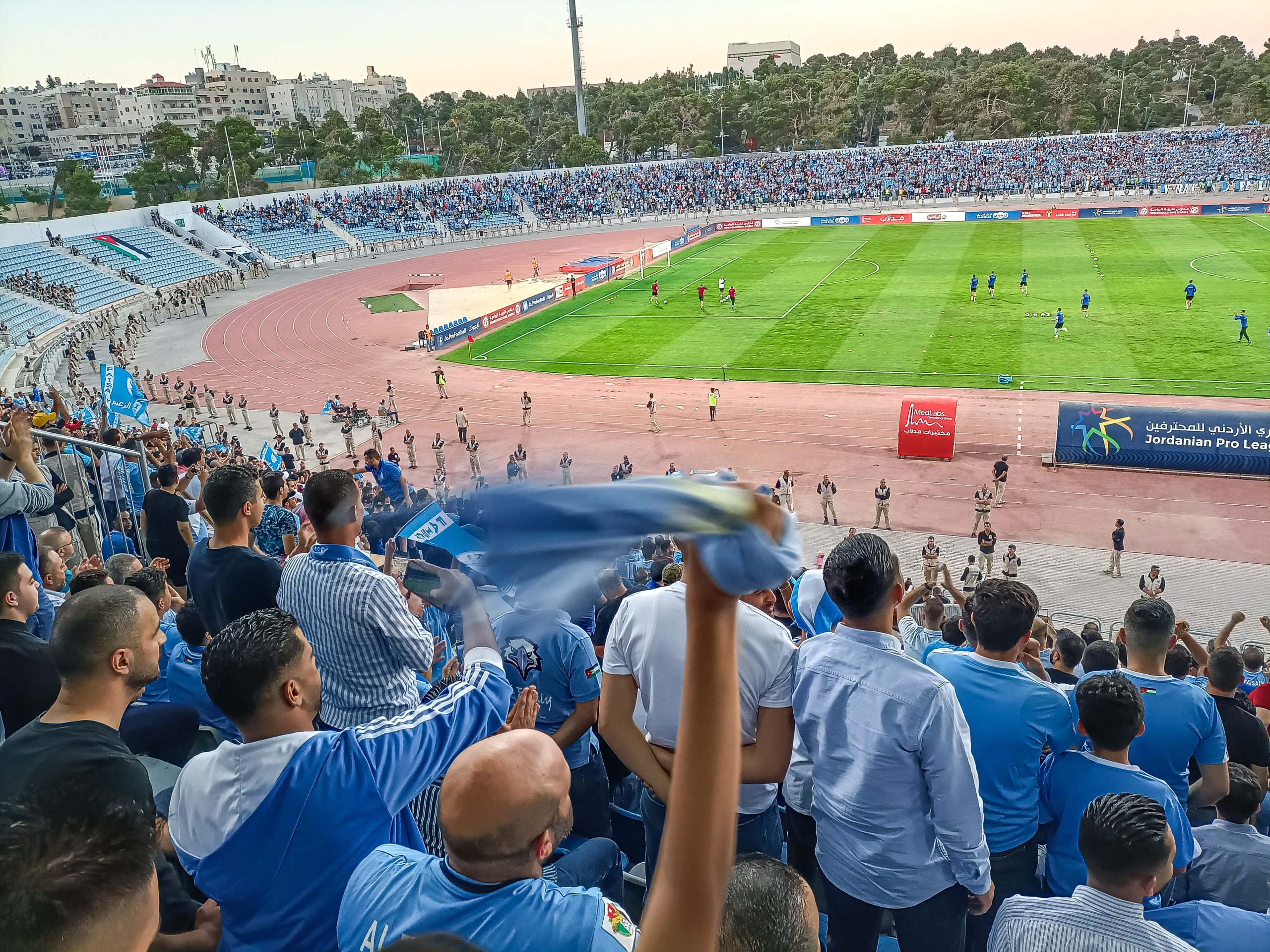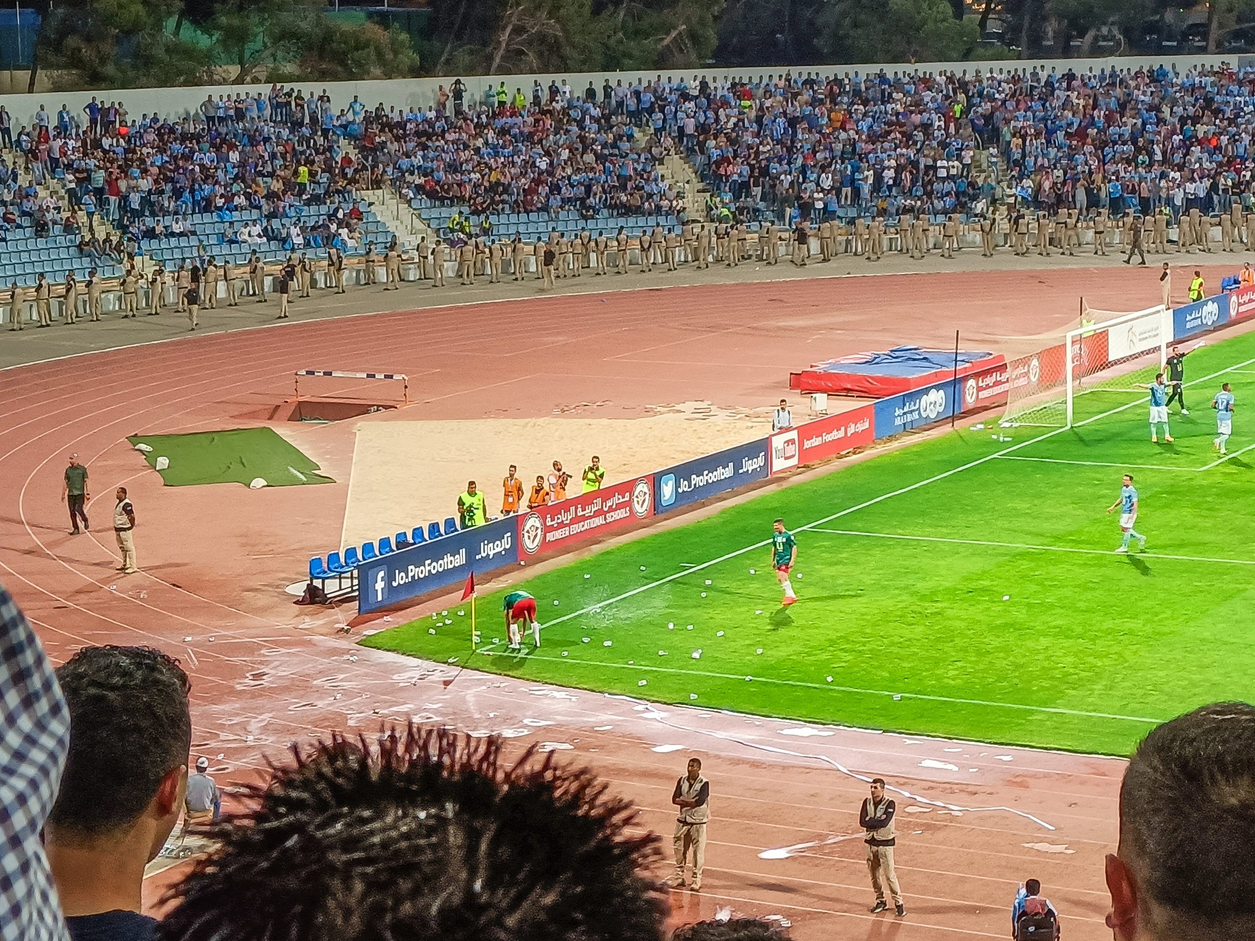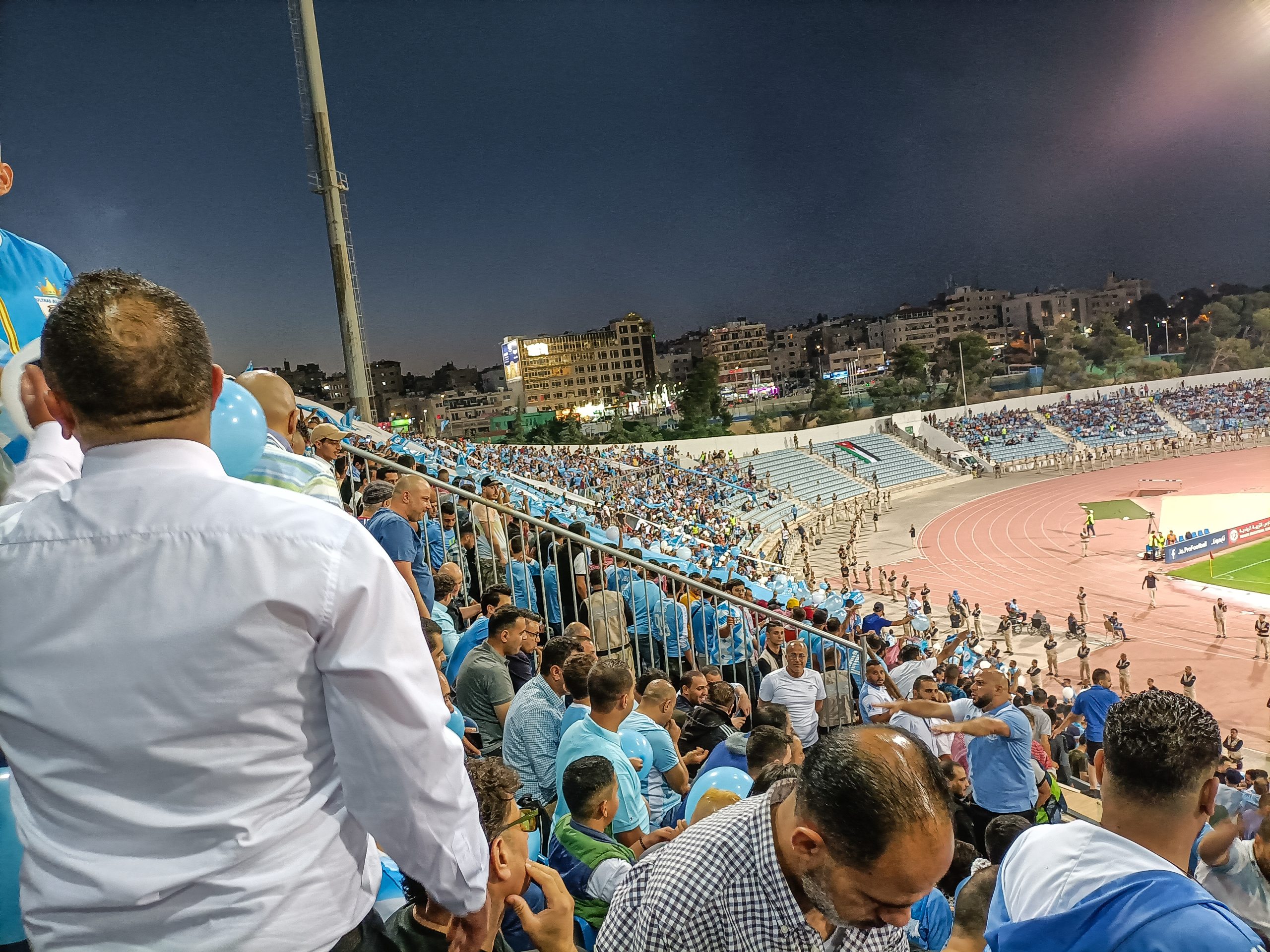 Voor de aftrap hebben zowel de thuissupporters als de uitsupporters een mooie tifo voorbeid. Op de lange zijde is een vellenactie voorbereid die samen een blauwe adelaar met gouden details vormt. Over het vak waar wij zitten wordt een groot spandoek uitgerold met onder meer de beeltenis van een speler. Als deze acties voorbij zijn worden er op de lange zijde tientallen fakkels afgestoken. Ook in Jordanië kunnen ze er wat van dus! Het uitvak heeft een actie voorbereid op een soort stellage met lange stokken, wat vervolgens weer wordt ingeruild voor een spandoek over het vak heen.