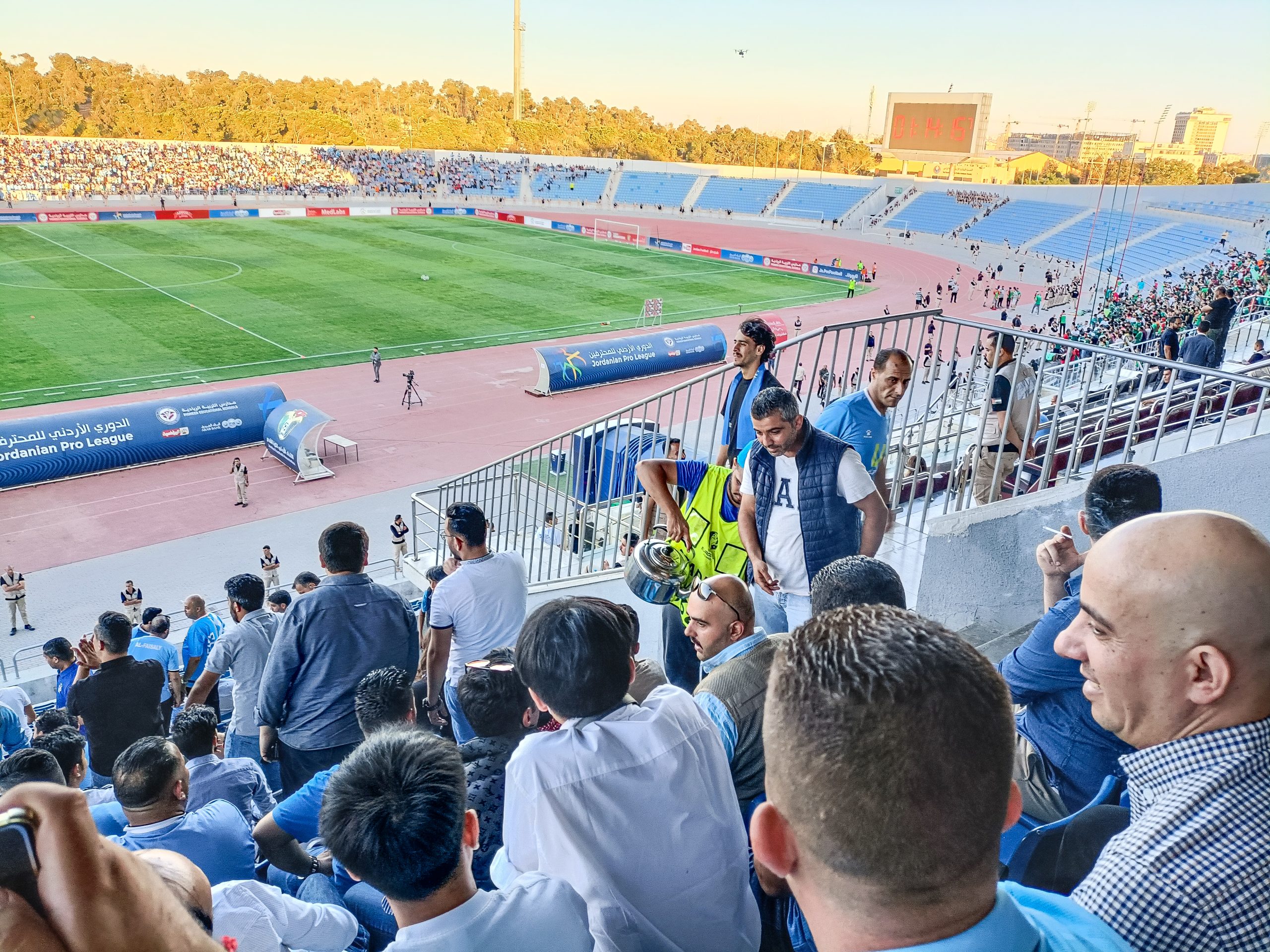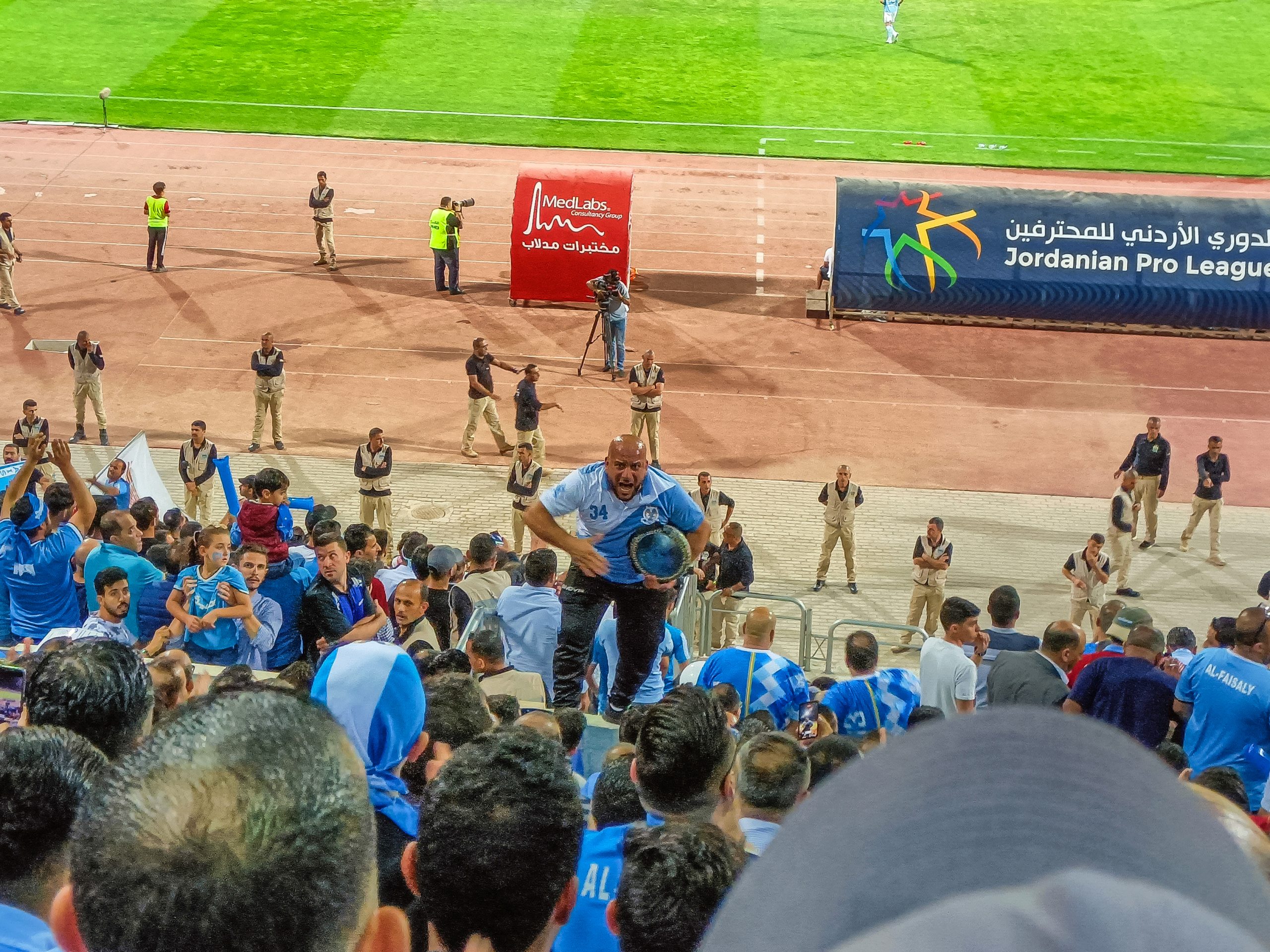 Dan is het tijd voor het begin van de wedstrijd. Het voetbal zelf is niet van een heel bijzonder niveau, maar de thuisploeg heeft duidelijk het betere van het spel. Ondanks dat Al-Faisaly met afstand de betere ploeg is, gaat een man naast ons bijna kapot van de spanning. Het is duidelijk dat de derby van vandaag extreem belangrijk is voor de supporters. De boel wordt nog een beetje extra opgejut door een soort capo die voor het vak op zijn djembé staat te spelen.