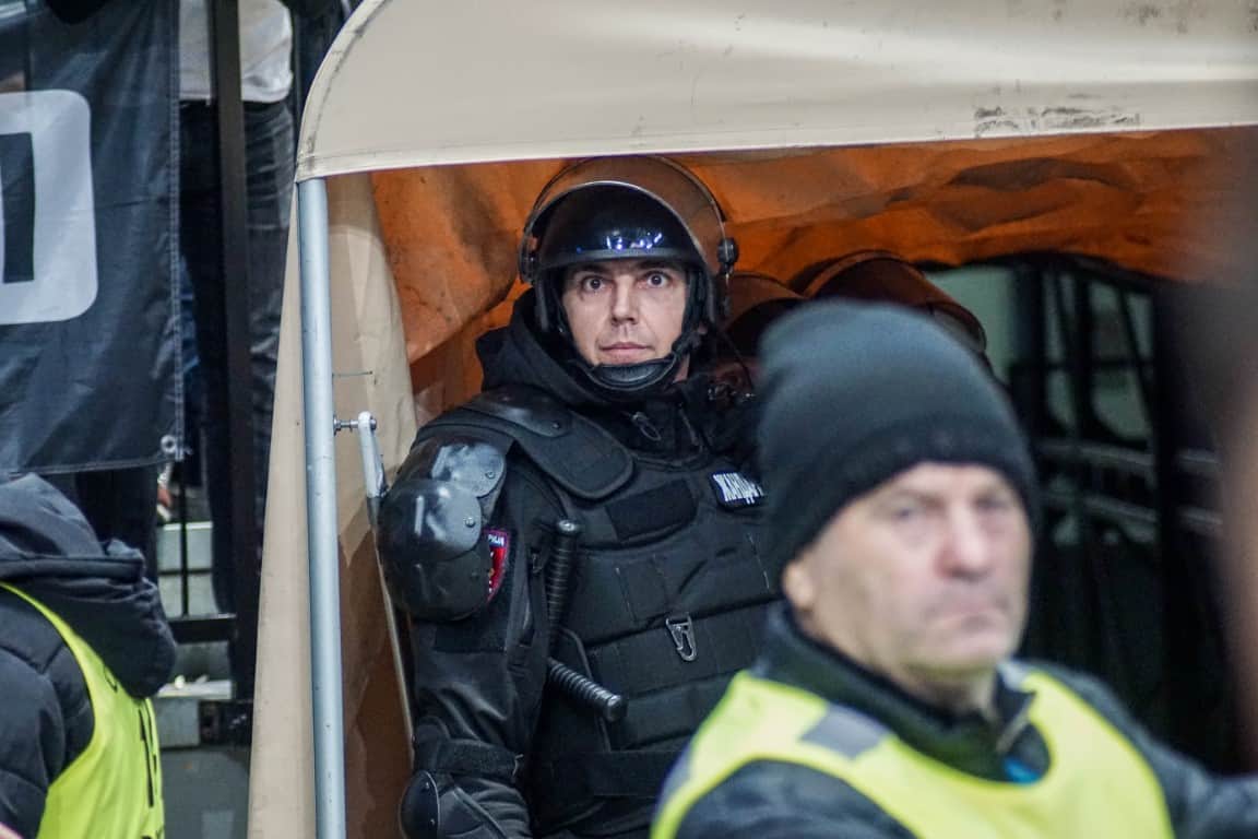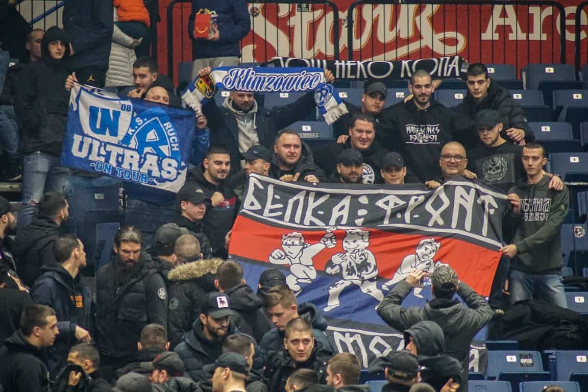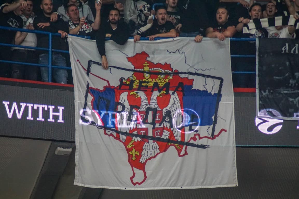 Voor de Grobari geen reden tot afwezigheid. Zij zijn massaal aanwezig. Het is de dag voor de derby en dat is ook wel te zien aan de aanwezige vriendschappen op de tribune. Afgaande op de vlaggen en de sjaaltjes zijn PAOK en CSKA Moskou beide met flinke groepjes aanwezig. Ook is er een afvaardiging van de ultras van Ruch Chorzow te zien. Al deze supporters combineren waarschijnlijk ook deze basketbalpot met de Eternal derby van morgen. Wat verder qua materiaal nog opvalt is dat er weer erg veel nationalistisch spul aanwezig is, met veel verwijzingen naar Kosovo en tot welk land zij dat vinden toebehoren.