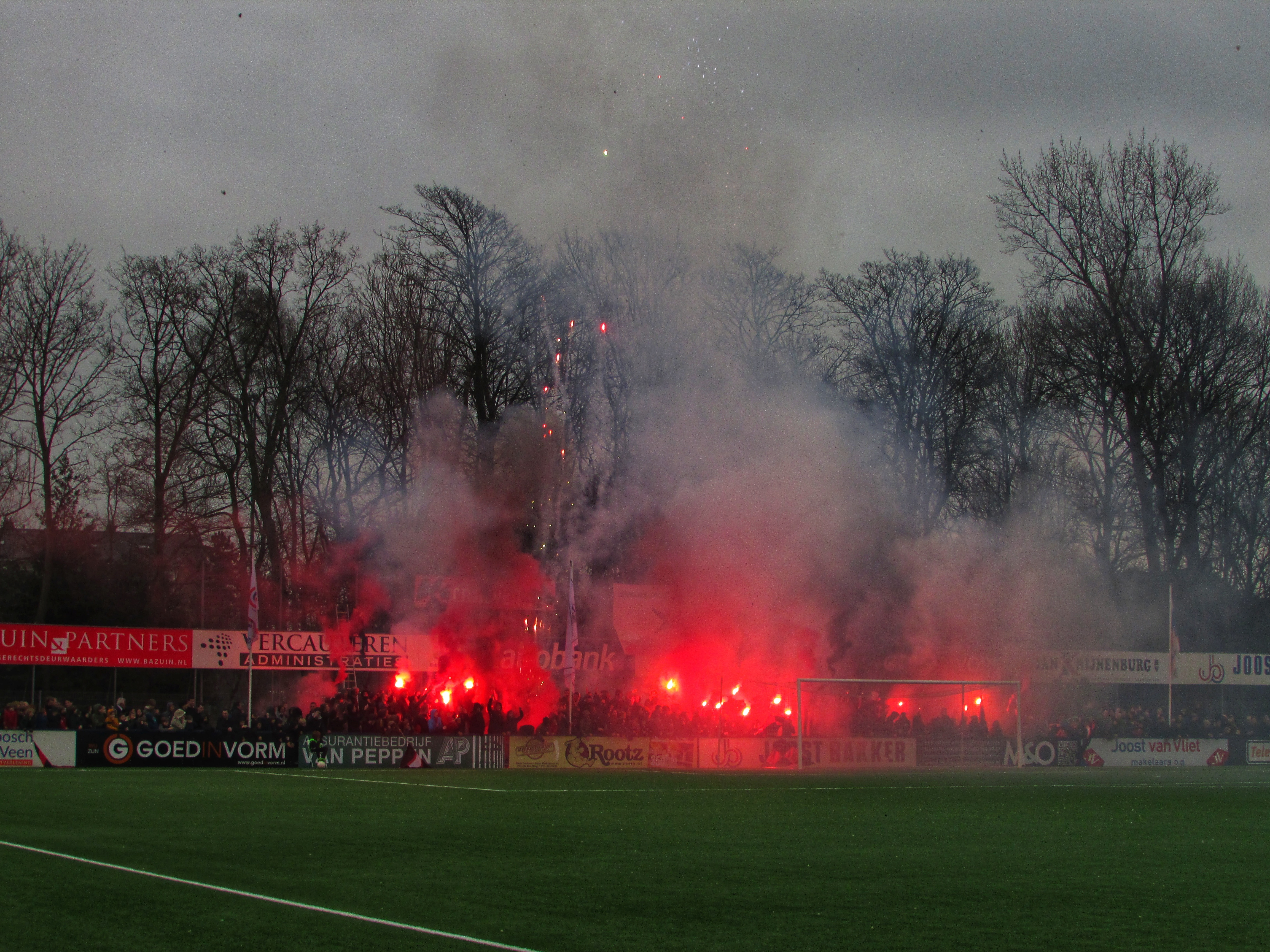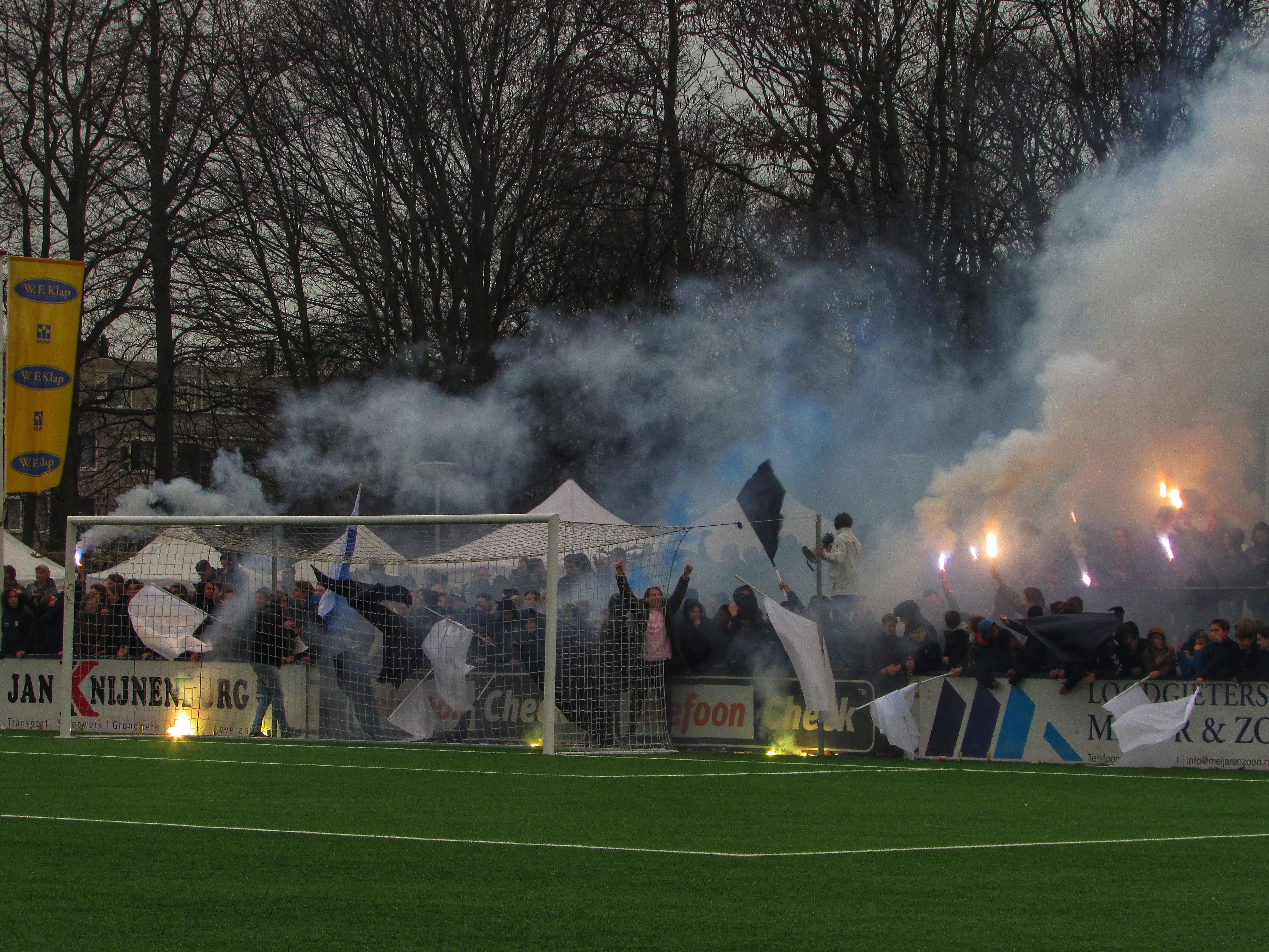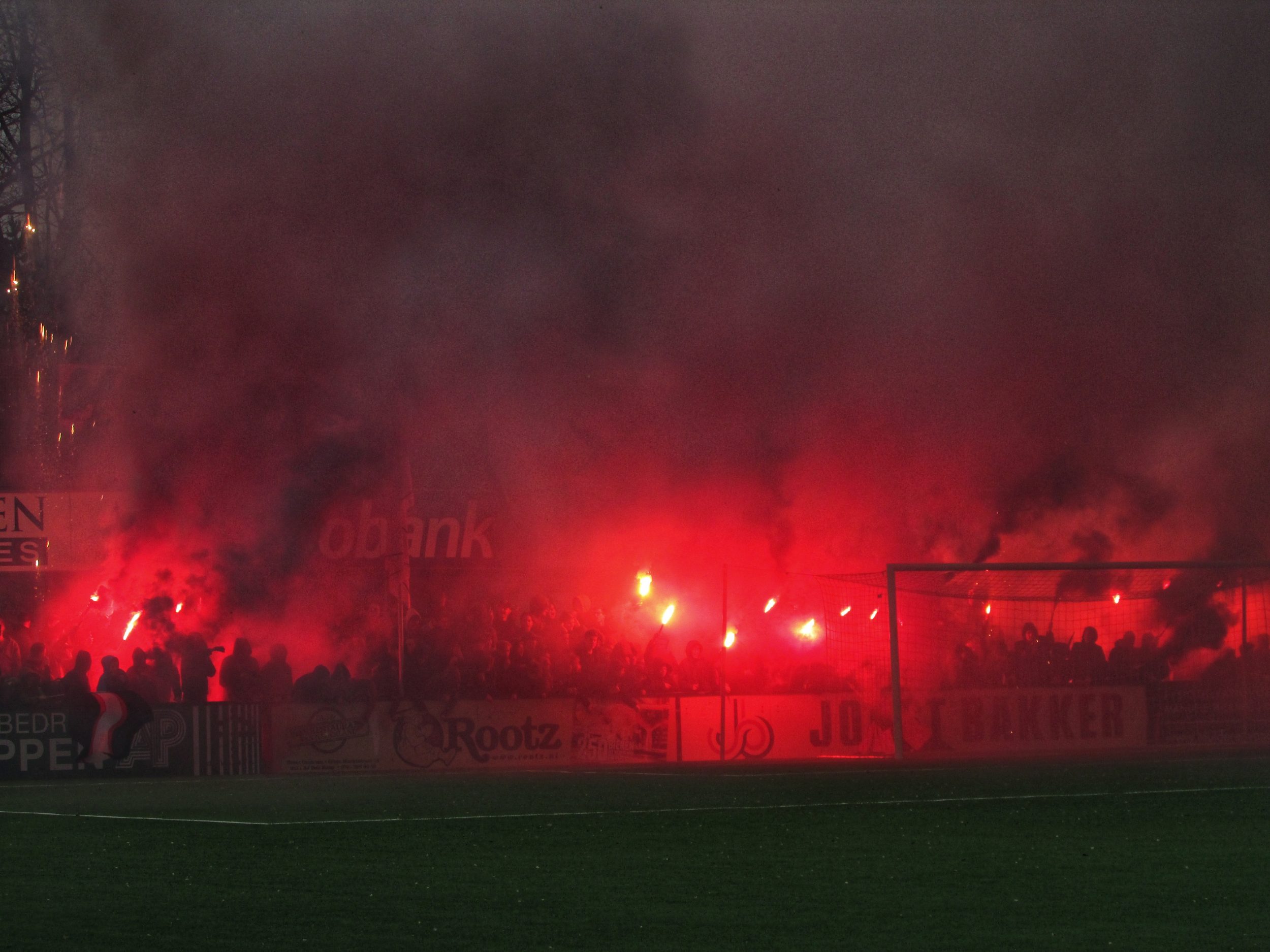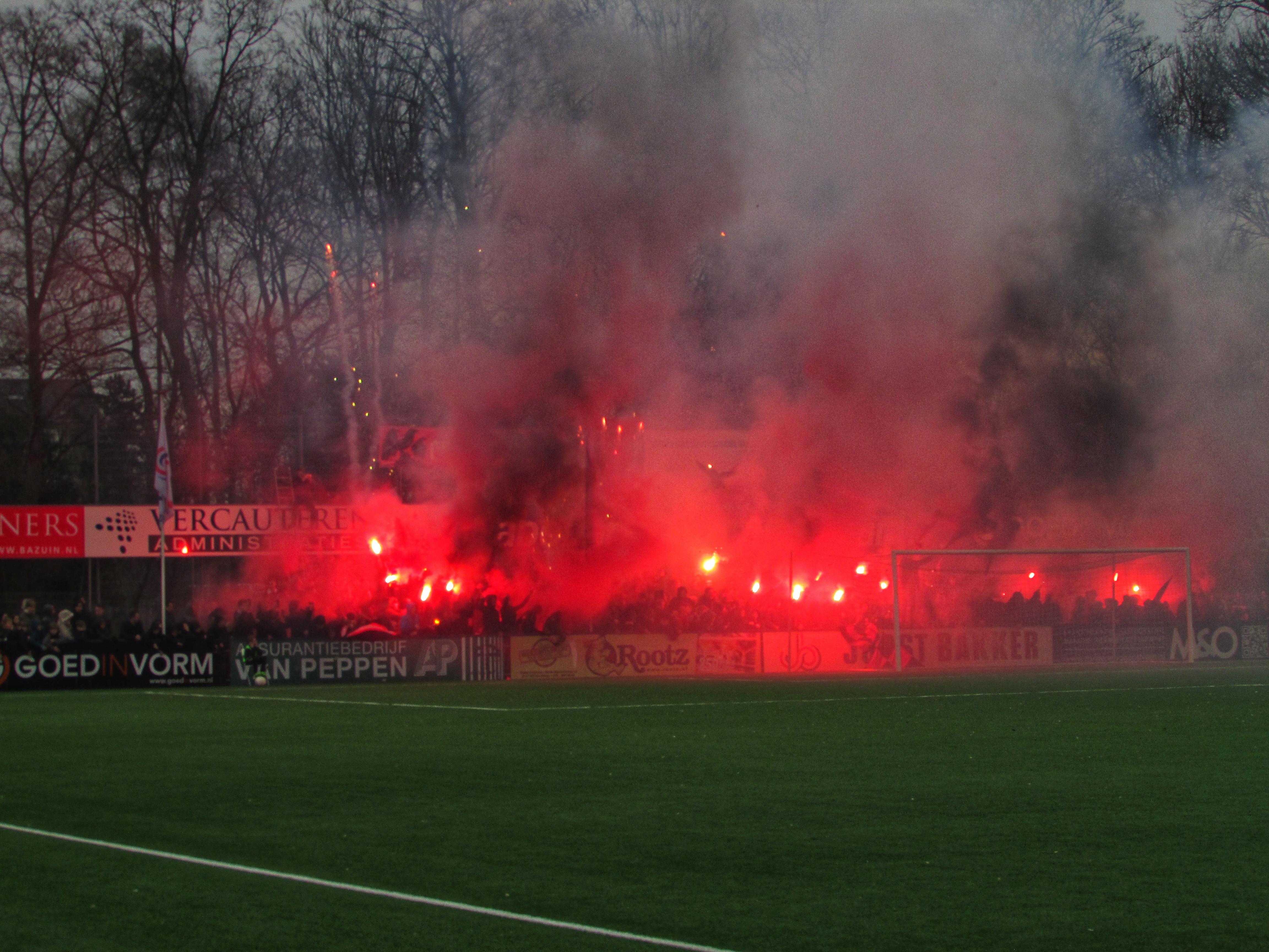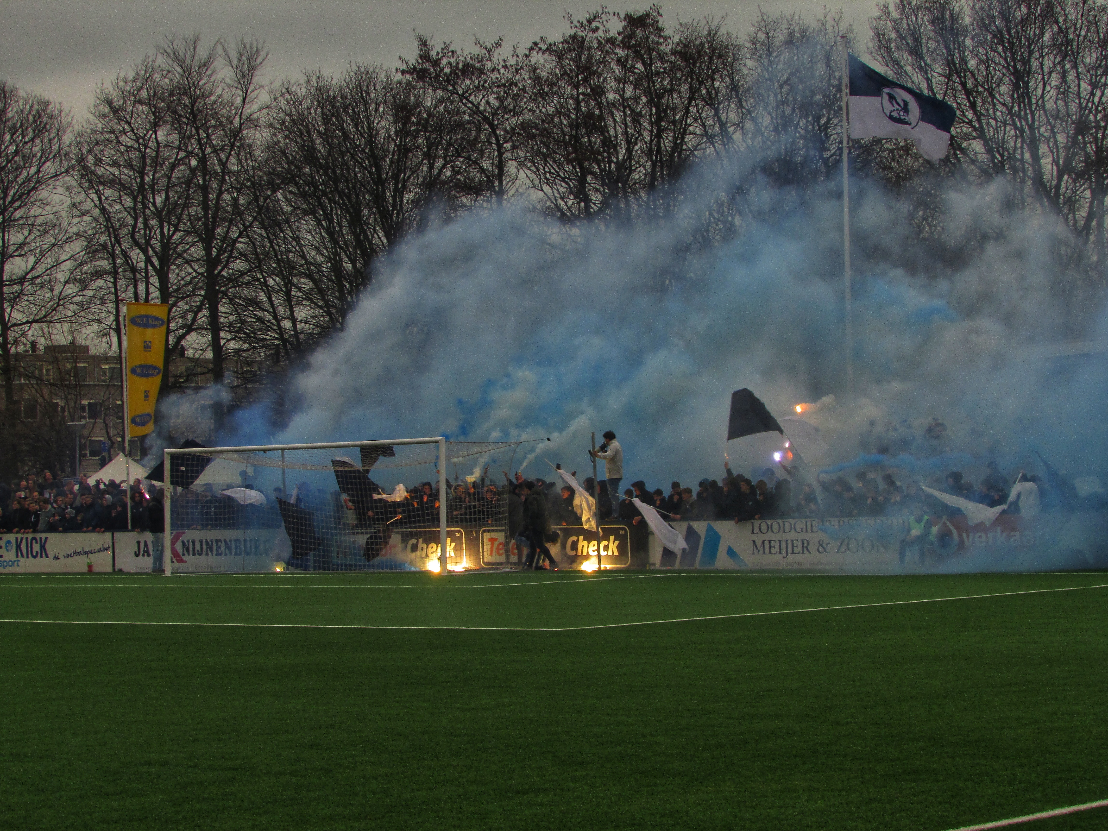 Afijn, genoeg geschiedenis. Beide clubs mogen dan wel een gigantische geschiedenis hebben, Quick heeft wel een modern, klinisch sportcomplex. Voor de gemiddelde voetballer natuurlijk ideaal, voor mij persoonlijk toch zonde als de club zo’n grote historie heeft. Maar goed, ik zoek een mooi plaatsje op rondom de middenlijn. Achter mij is een staantribune die de gehele lange zijde van het veld in beslag neemt. Tegenover mij staat een tribune, niet de mooiste die ik ooit heb gezien. Het is druk op het sportpark. Er worden zo’n 3000-4000 fans verwacht. Wanneer de spelers het veld betreden voor de warming-up, wordt het eerste vuurwerk al afgestoken. Het pyro gehalte was, zoals de foto’s mooi weergeven, sowieso heel hoog!