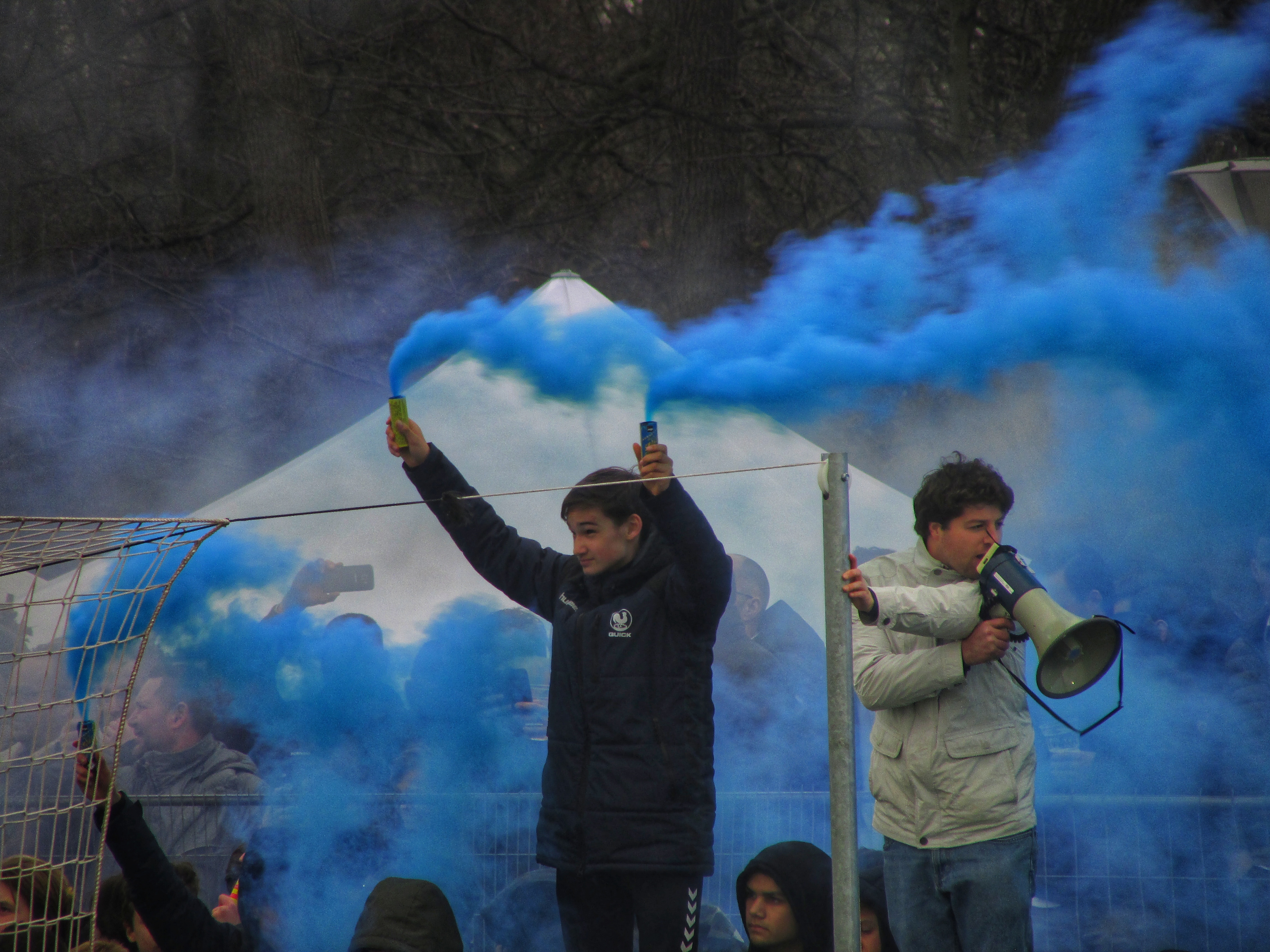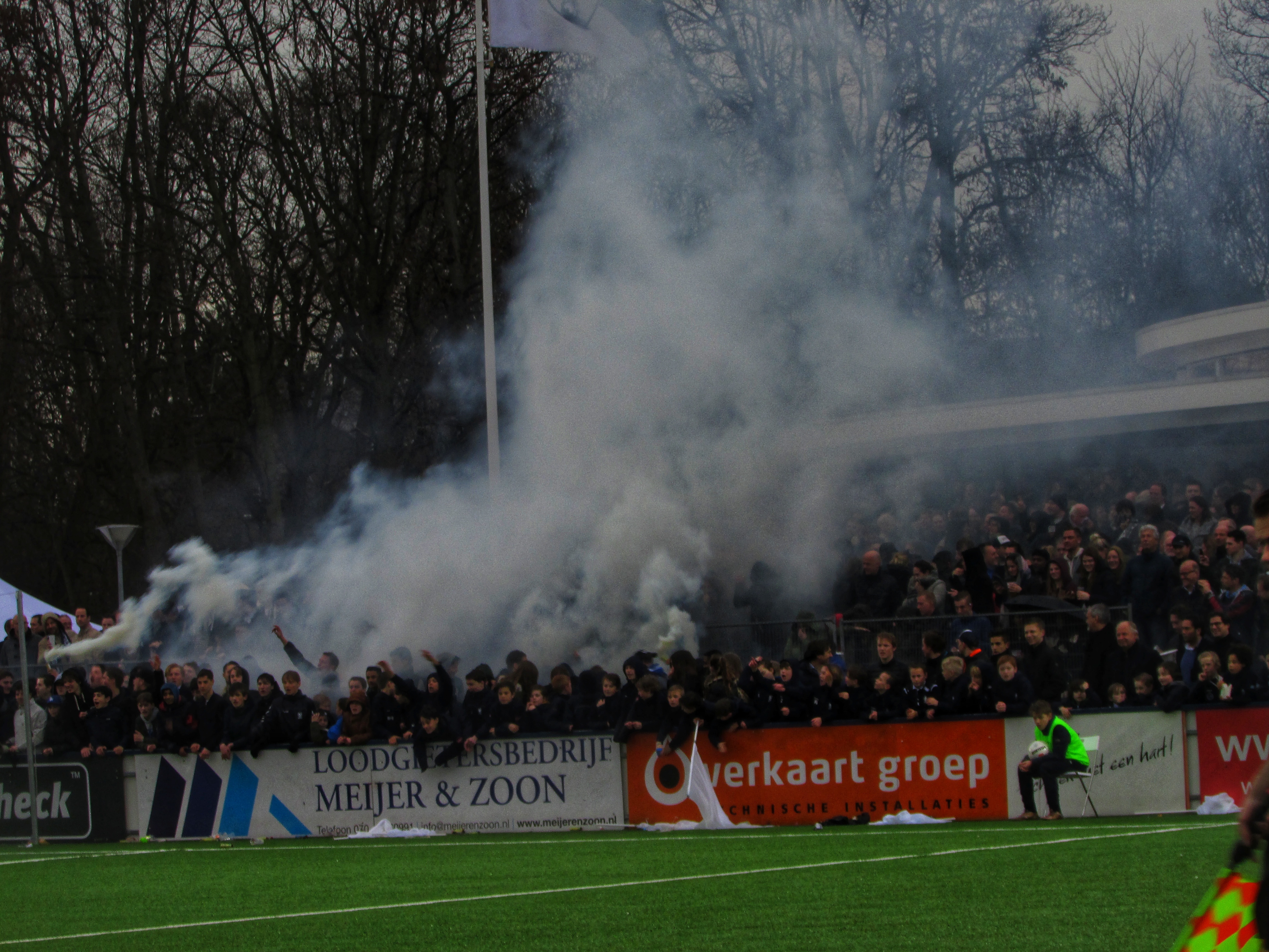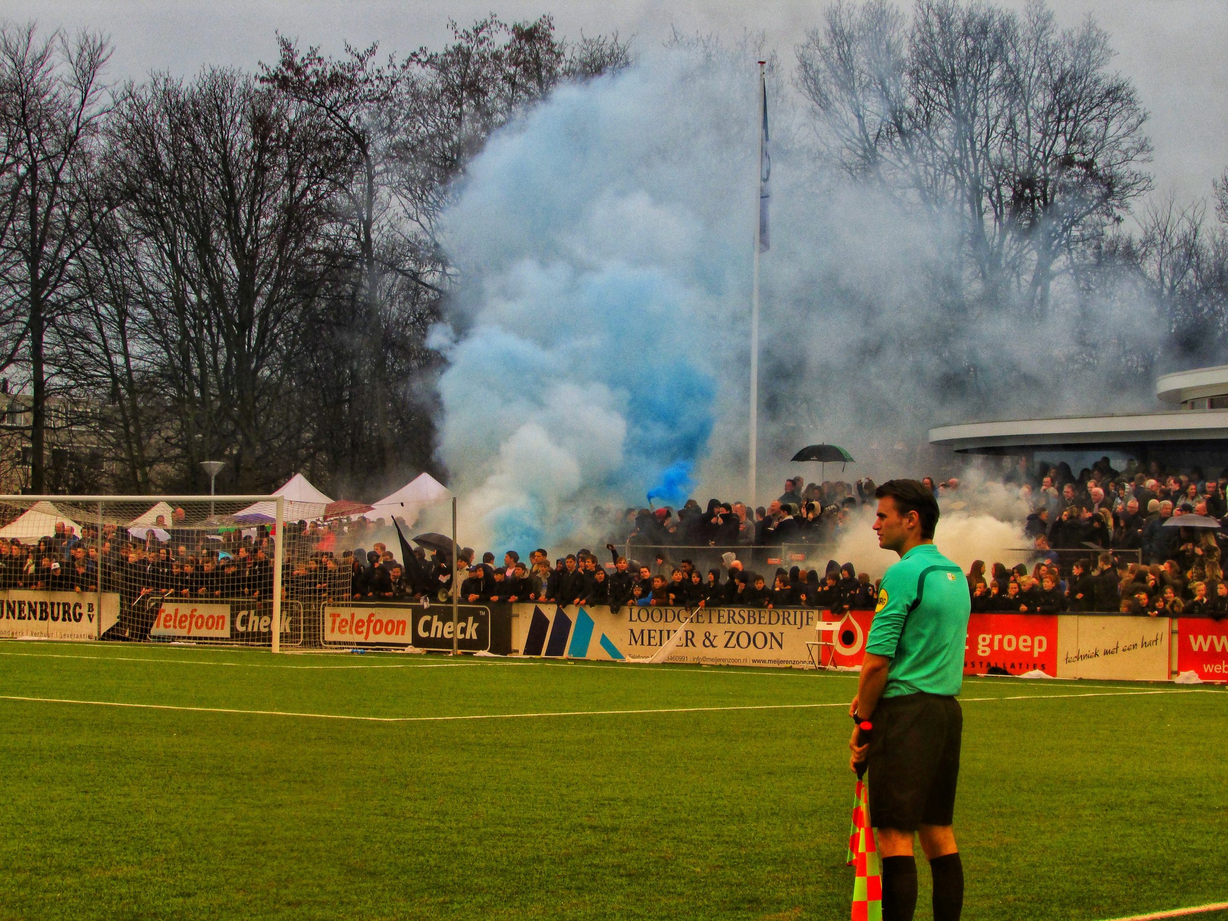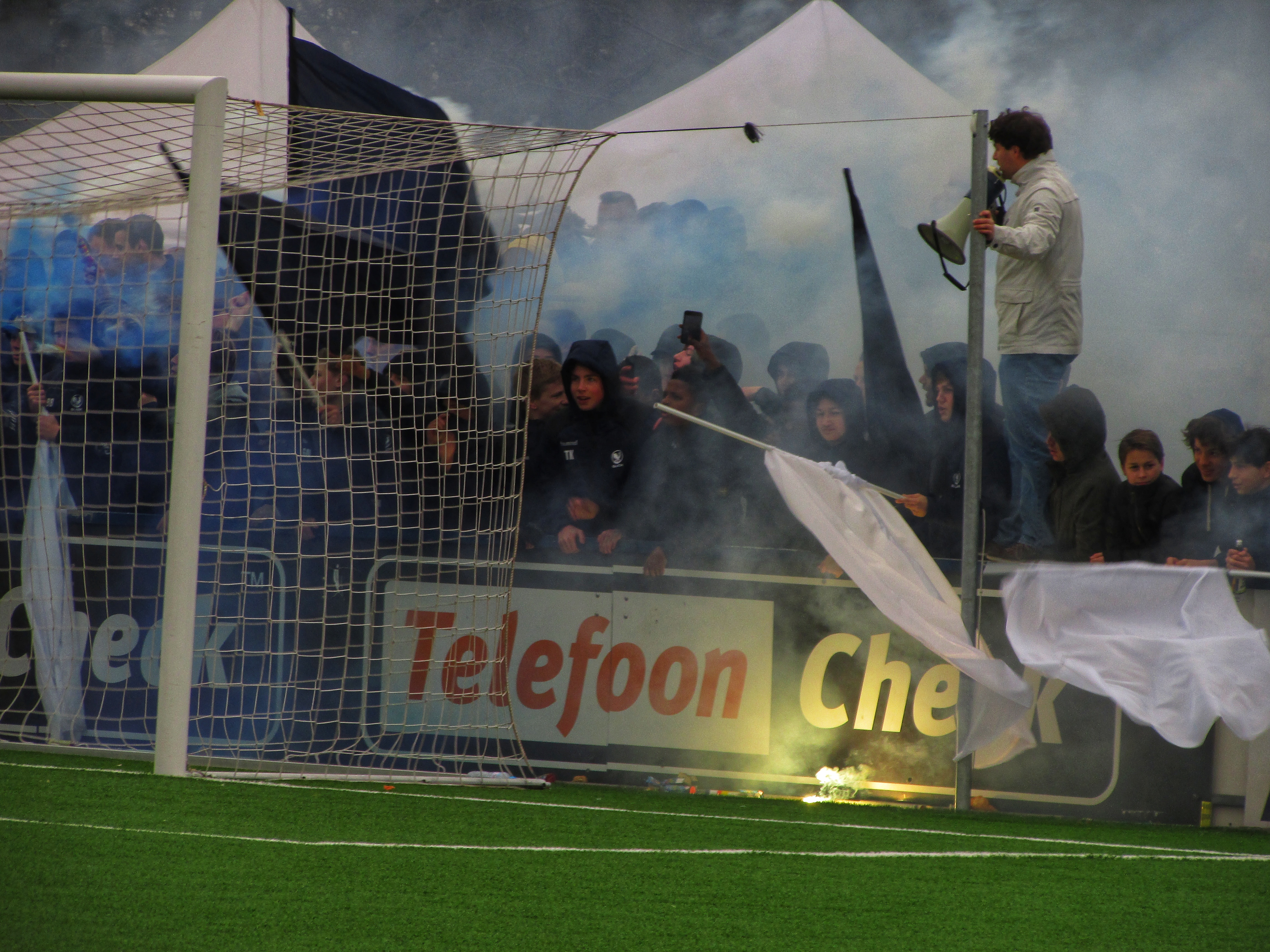 Afijn, genoeg geschiedenis. Beide clubs mogen dan wel een gigantische geschiedenis hebben, Quick heeft wel een modern, klinisch sportcomplex. Voor de gemiddelde voetballer natuurlijk ideaal, voor mij persoonlijk toch zonde als de club zo’n grote historie heeft. Maar goed, ik zoek een mooi plaatsje op rondom de middenlijn. Achter mij is een staantribune die de gehele lange zijde van het veld in beslag neemt. Tegenover mij staat een tribune, niet de mooiste die ik ooit heb gezien. Het is druk op het sportpark. Er worden zo’n 3000-4000 fans verwacht. Wanneer de spelers het veld betreden voor de warming-up, wordt het eerste vuurwerk al afgestoken. Het pyro gehalte was, zoals de foto’s mooi weergeven, sowieso heel hoog!