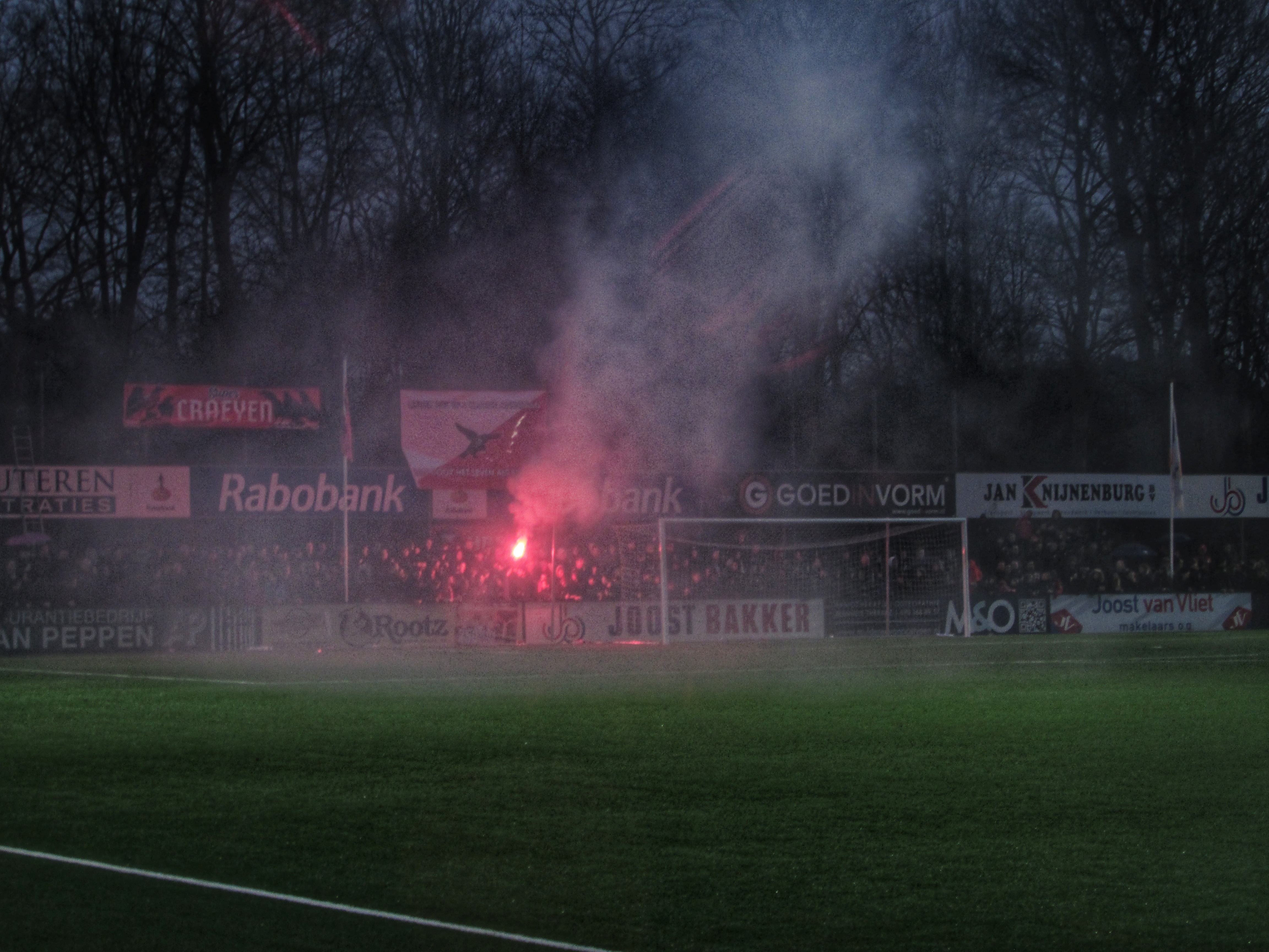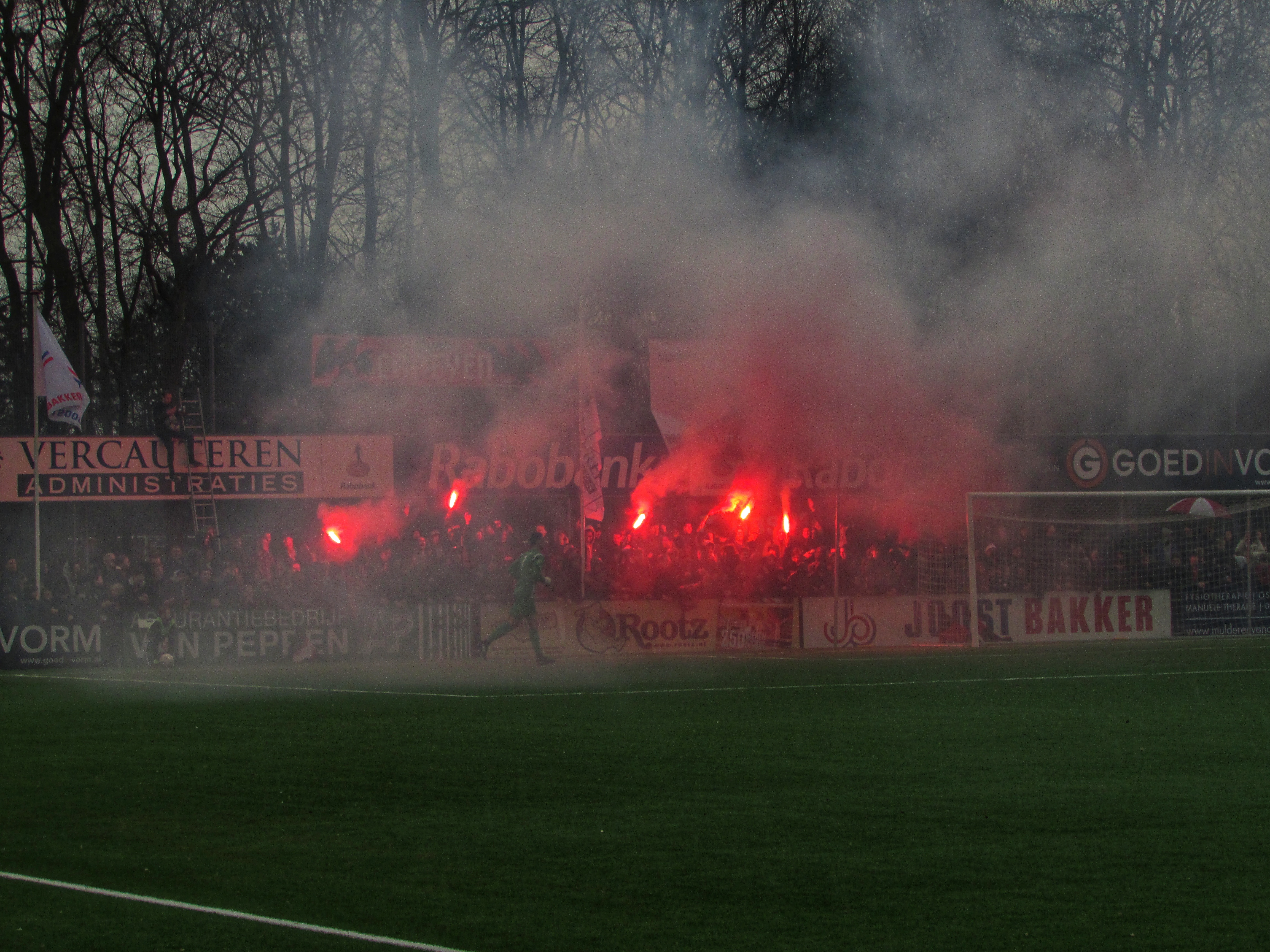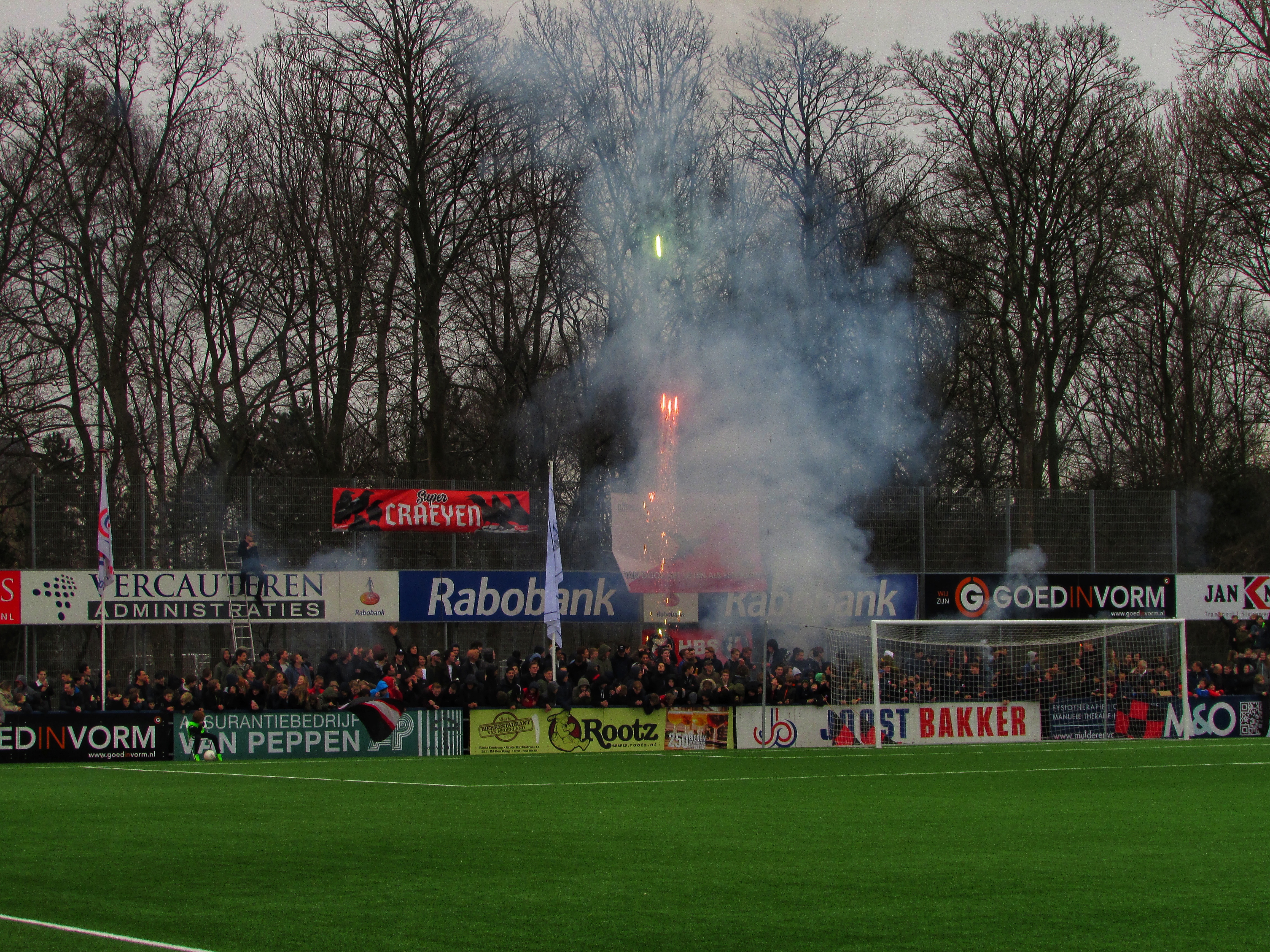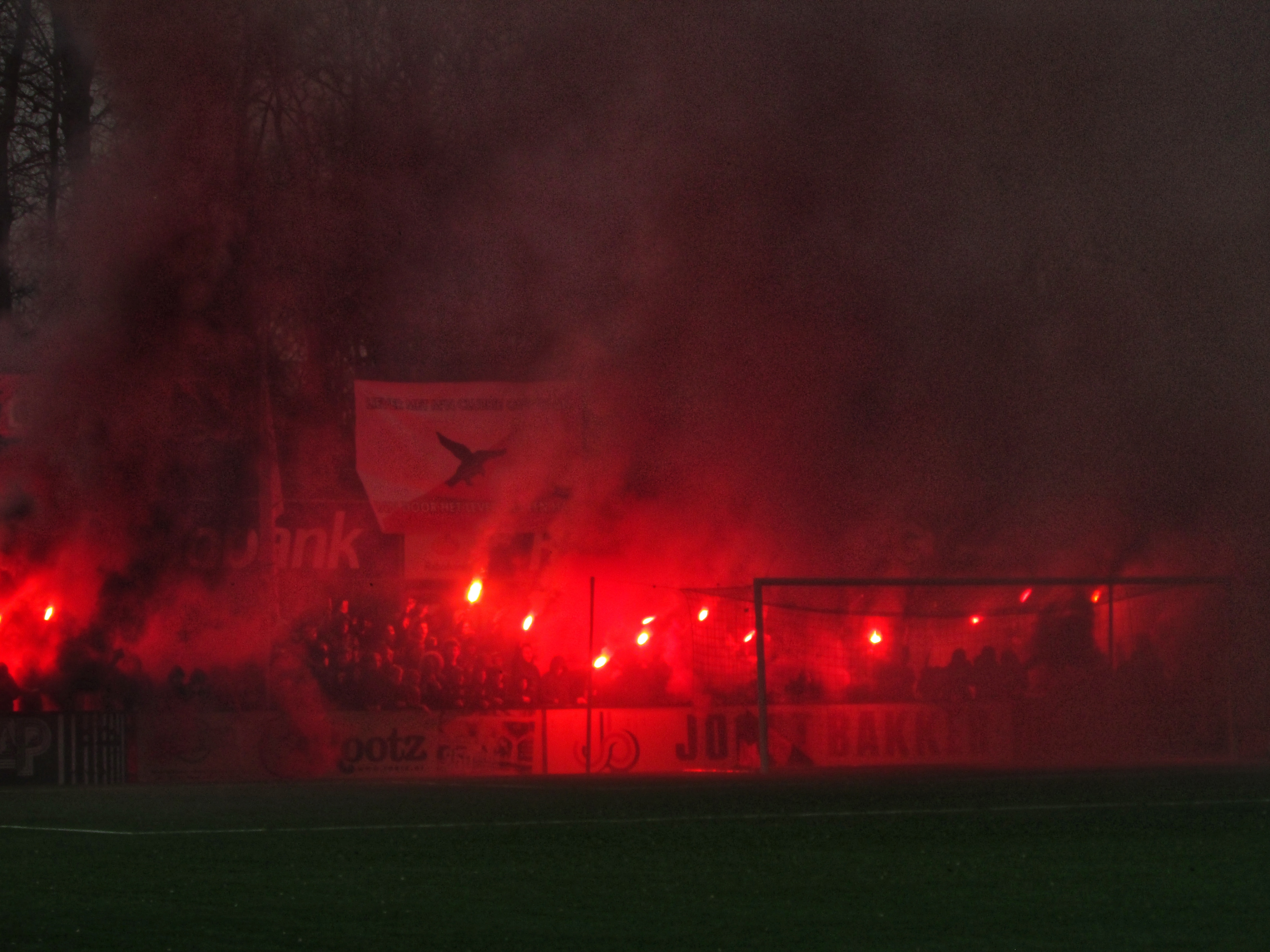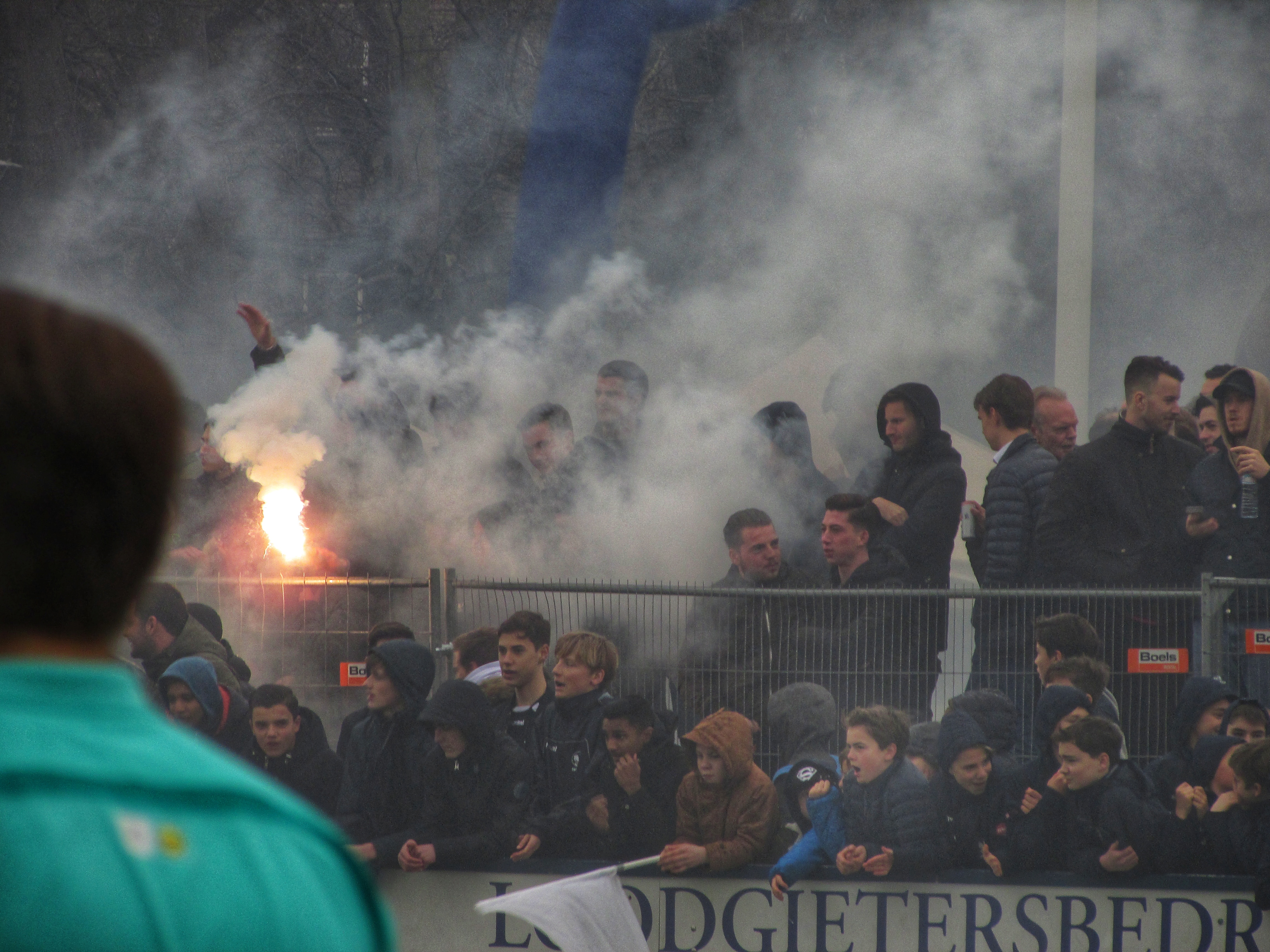 Afijn, genoeg geschiedenis. Beide clubs mogen dan wel een gigantische geschiedenis hebben, Quick heeft wel een modern, klinisch sportcomplex. Voor de gemiddelde voetballer natuurlijk ideaal, voor mij persoonlijk toch zonde als de club zo’n grote historie heeft. Maar goed, ik zoek een mooi plaatsje op rondom de middenlijn. Achter mij is een staantribune die de gehele lange zijde van het veld in beslag neemt. Tegenover mij staat een tribune, niet de mooiste die ik ooit heb gezien. Het is druk op het sportpark. Er worden zo’n 3000-4000 fans verwacht. Wanneer de spelers het veld betreden voor de warming-up, wordt het eerste vuurwerk al afgestoken. Het pyro gehalte was, zoals de foto’s mooi weergeven, sowieso heel hoog!