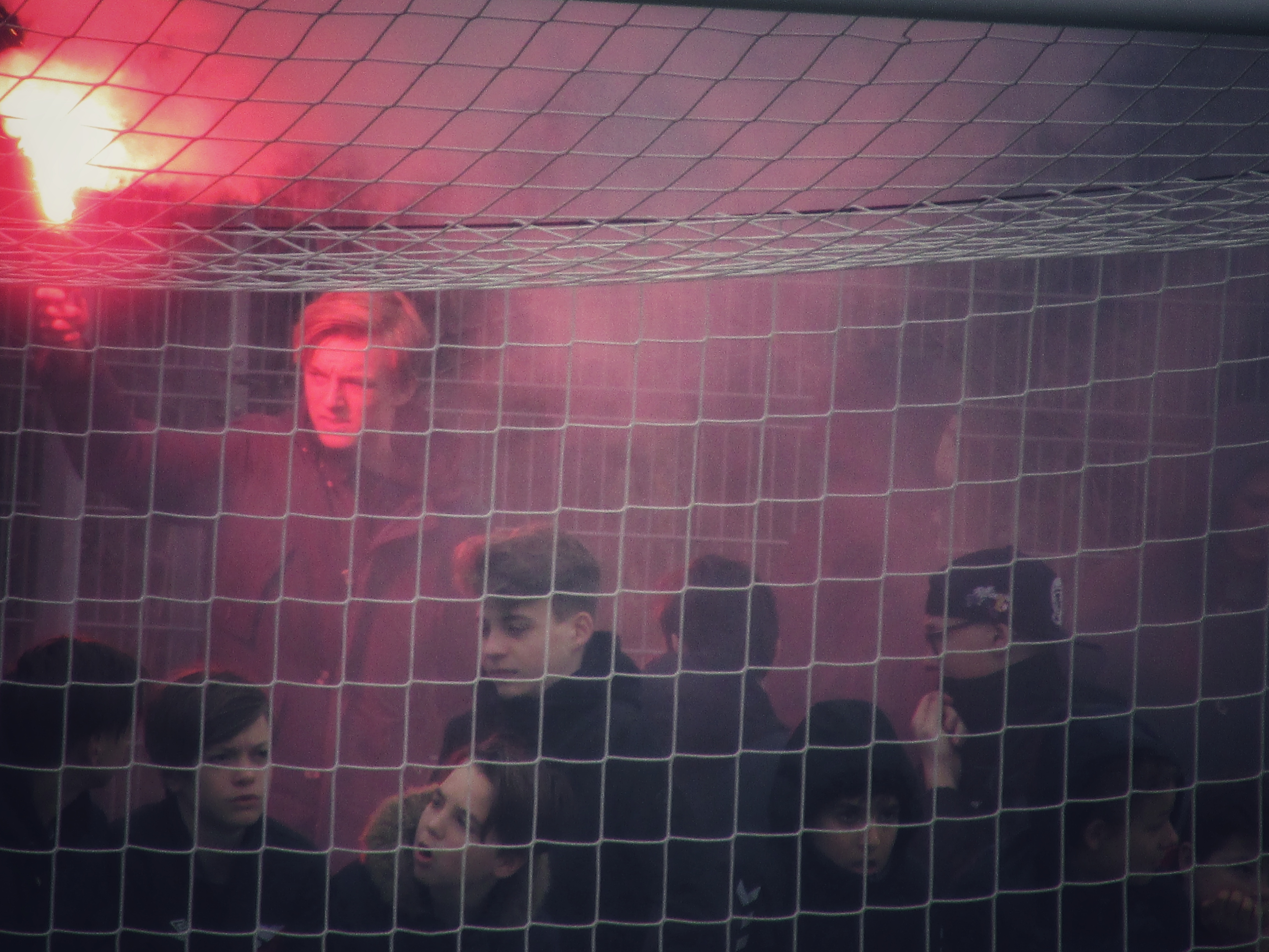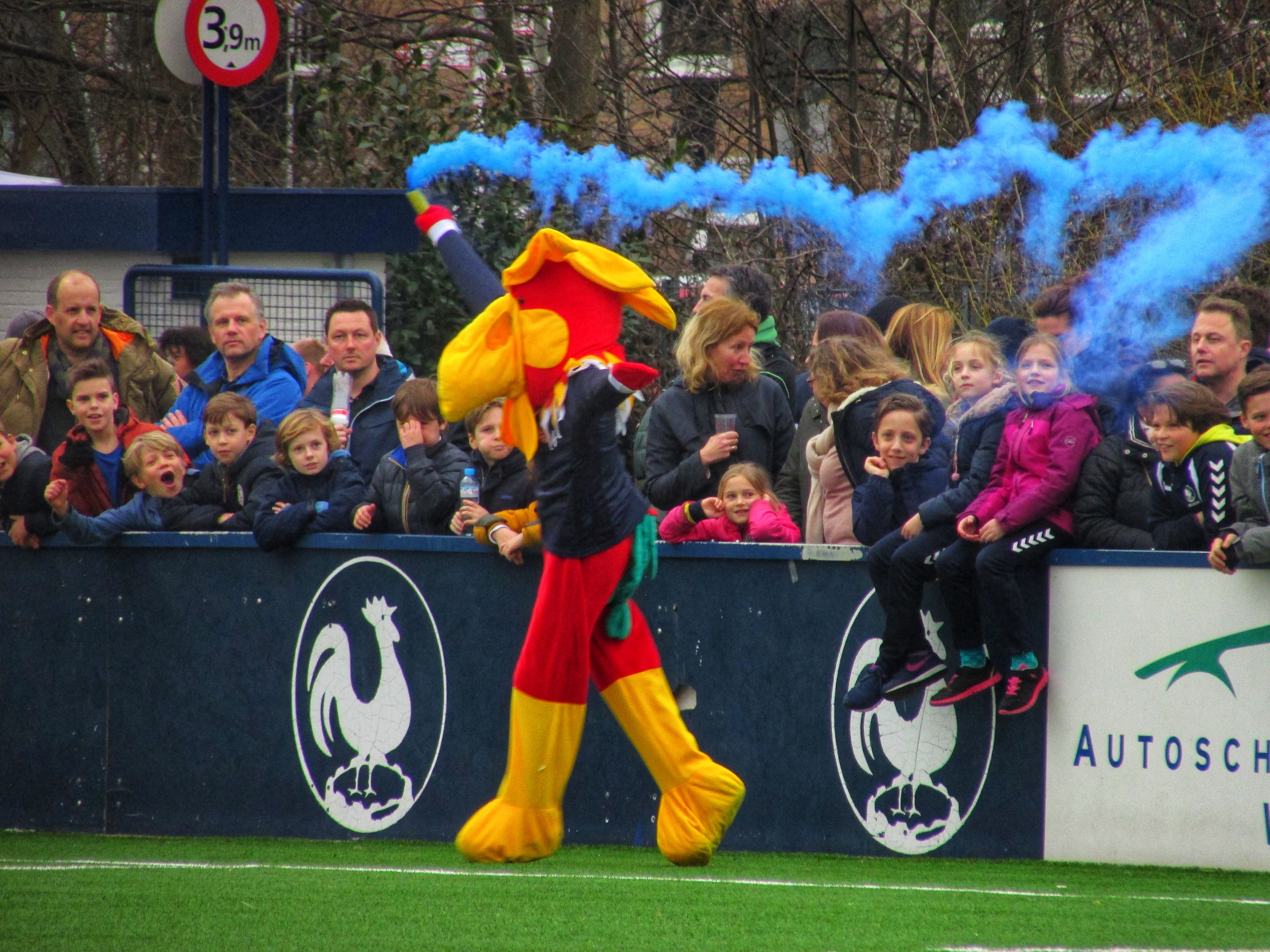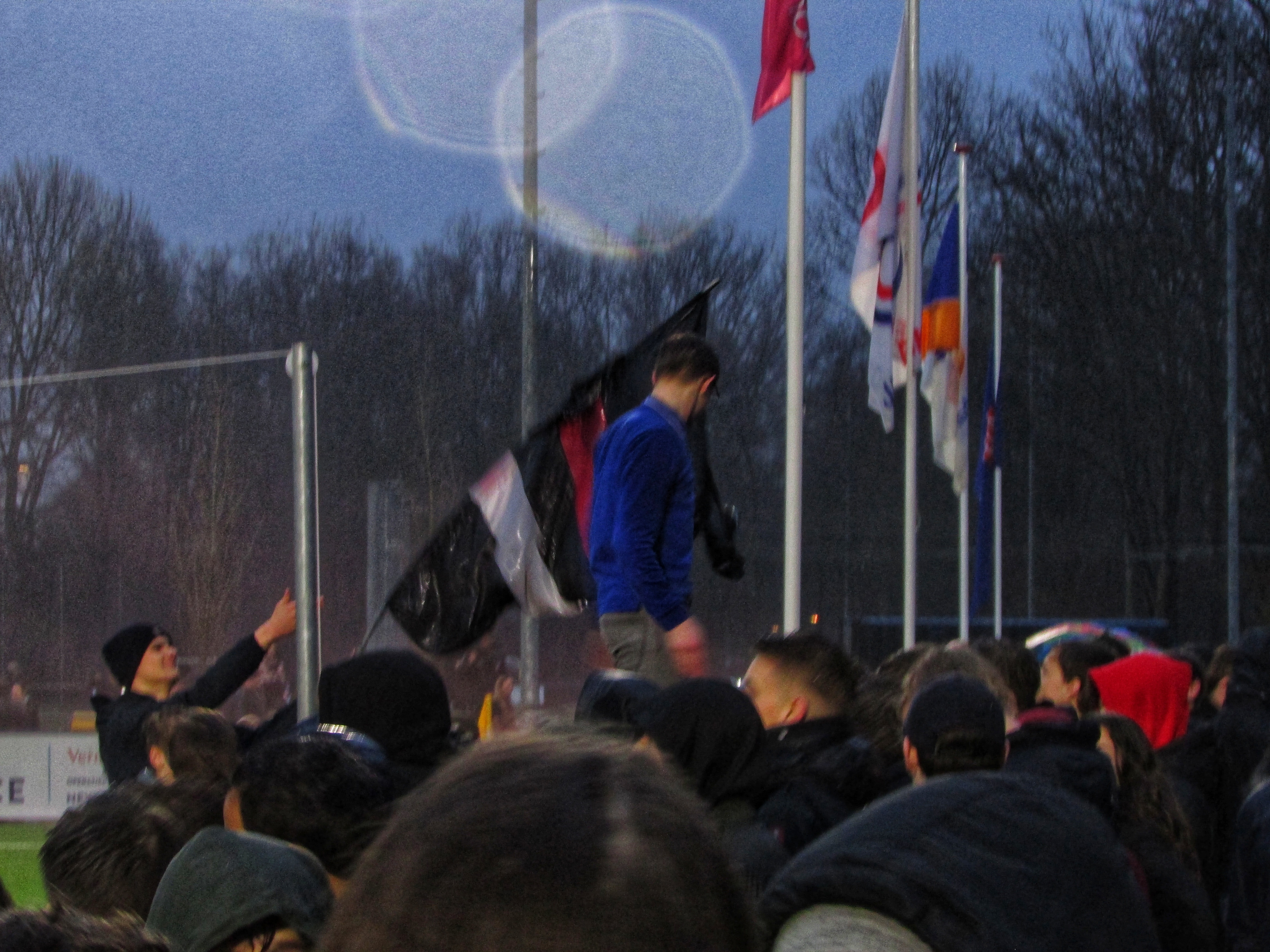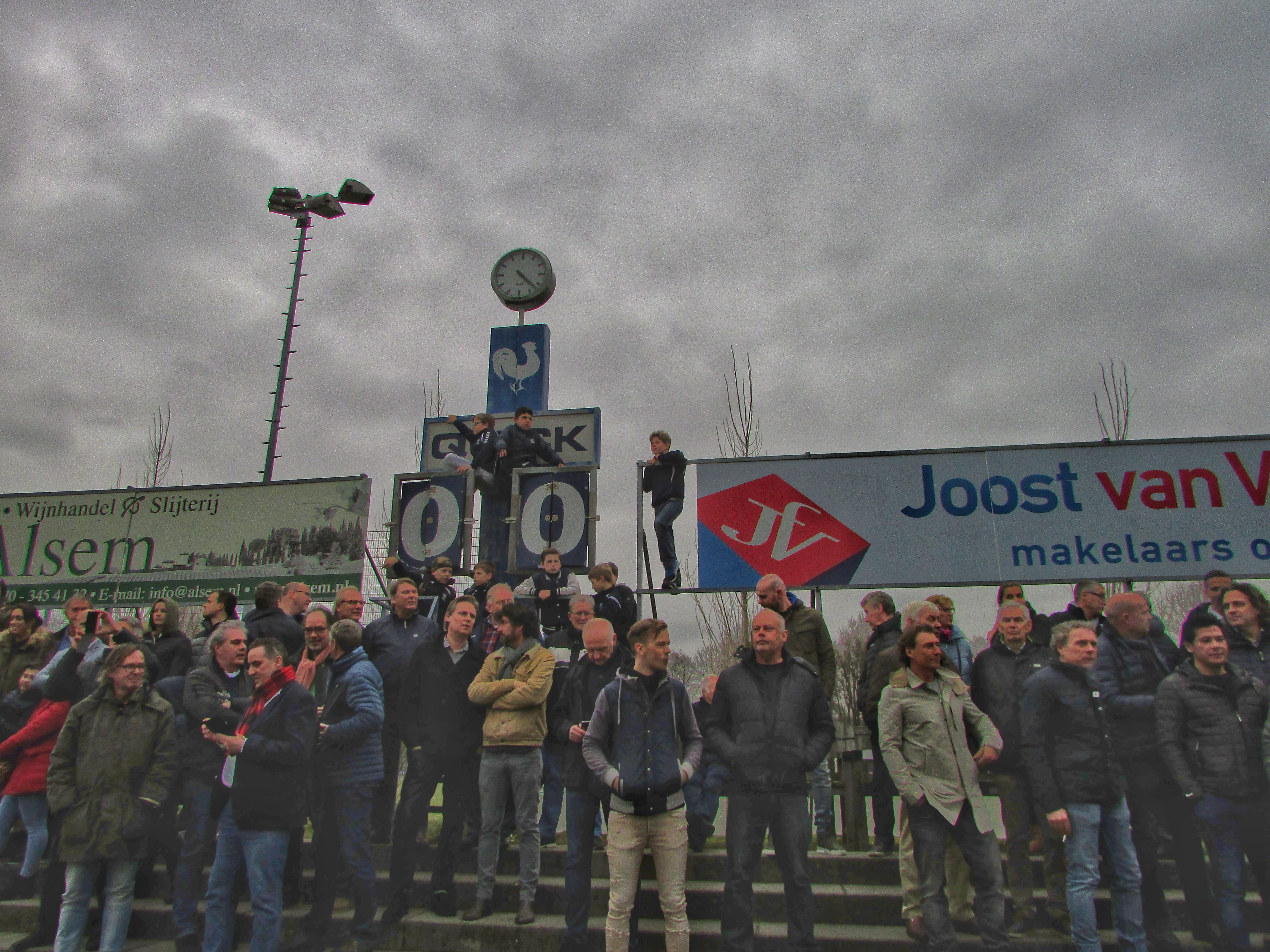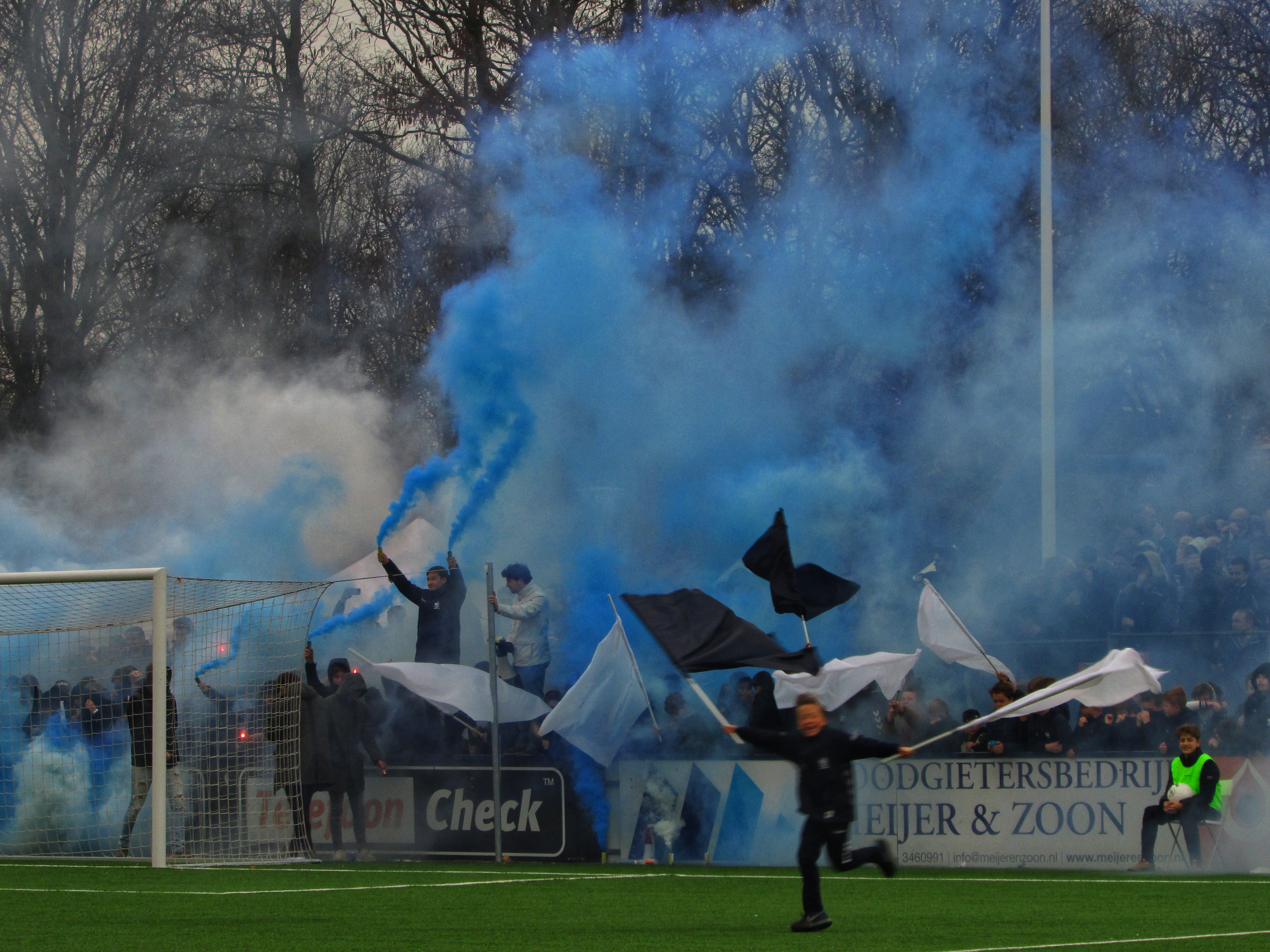Afijn, genoeg geschiedenis. Beide clubs mogen dan wel een gigantische geschiedenis hebben, Quick heeft wel een modern, klinisch sportcomplex. Voor de gemiddelde voetballer natuurlijk ideaal, voor mij persoonlijk toch zonde als de club zo’n grote historie heeft. Maar goed, ik zoek een mooi plaatsje op rondom de middenlijn. Achter mij is een staantribune die de gehele lange zijde van het veld in beslag neemt. Tegenover mij staat een tribune, niet de mooiste die ik ooit heb gezien. Het is druk op het sportpark. Er worden zo’n 3000-4000 fans verwacht. Wanneer de spelers het veld betreden voor de warming-up, wordt het eerste vuurwerk al afgestoken. Het pyro gehalte was, zoals de foto’s mooi weergeven, sowieso heel hoog!