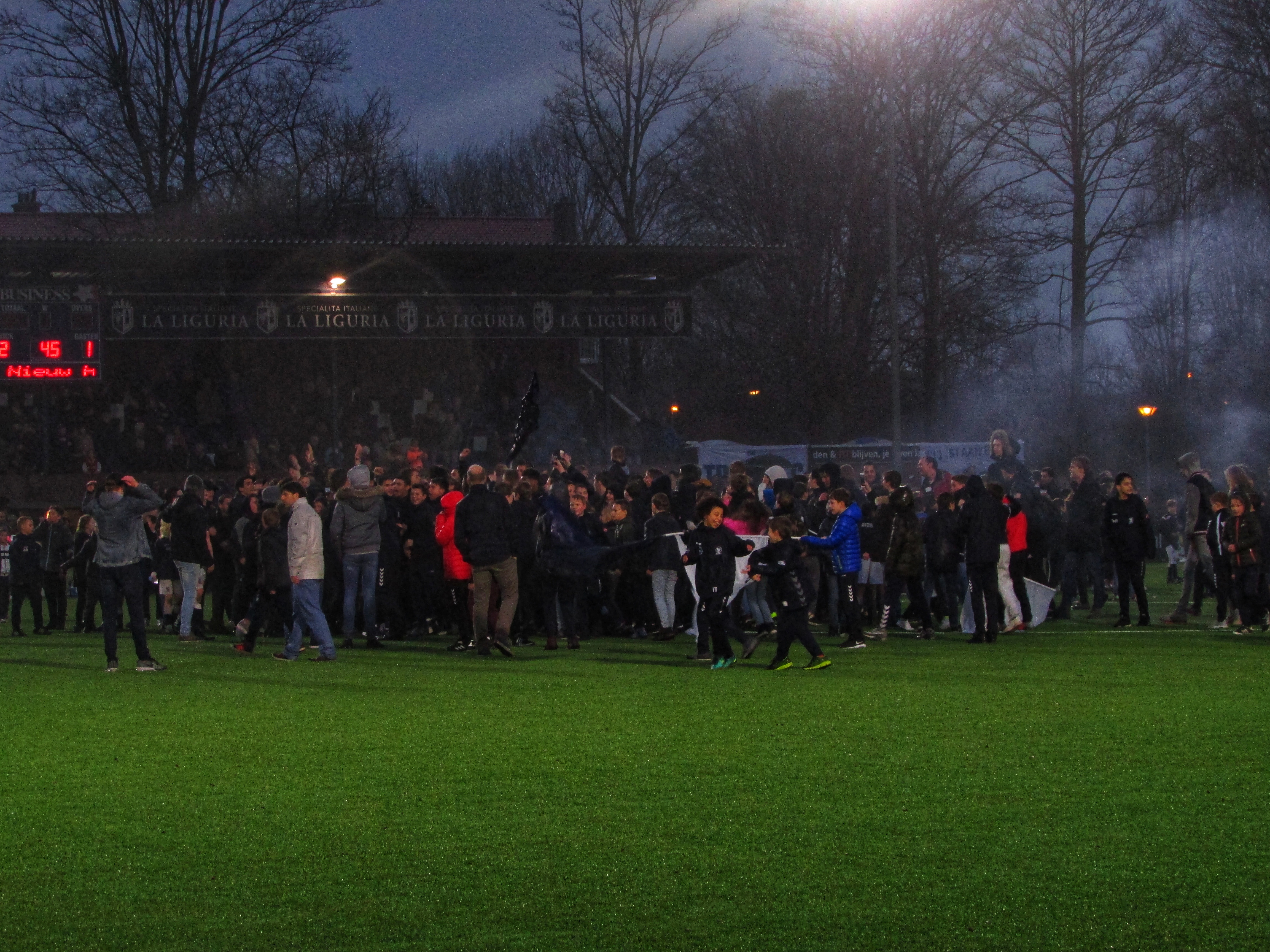 De tweede helft is spannend. Beide teams schieten niets op met een gelijkspel, zeker HBS niet. Zij vechten tegen degradatie. Quick komt na een corner vroeg in de tweede helft op voorsprong. Veel vuurwerk wordt er weer afgestoken, waarna de scheidsrechter plotseling de wedstrijd staakt. Hele rare beslissing, aangezien er al meer dan een uur vuurwerk word afgestoken. Even later pakt een verdediger zijn tweede gele kaart waardoor HBS een achterstand met een minder goed moet gaan zien te maken. HBS gaat een stapje harder lopen en de grote kansen volgen. Wonder boven wonder gaat de bal er niet in, waarna de scheidsrechter affluit. De Haegse derby wordt gewonnen door Quick. Een pitch invasion volgt. Wat een prachtige middag!