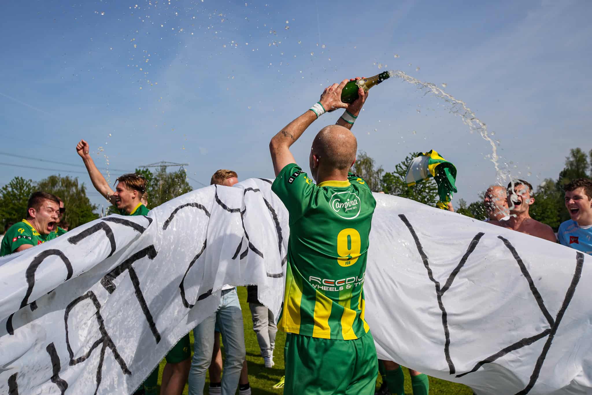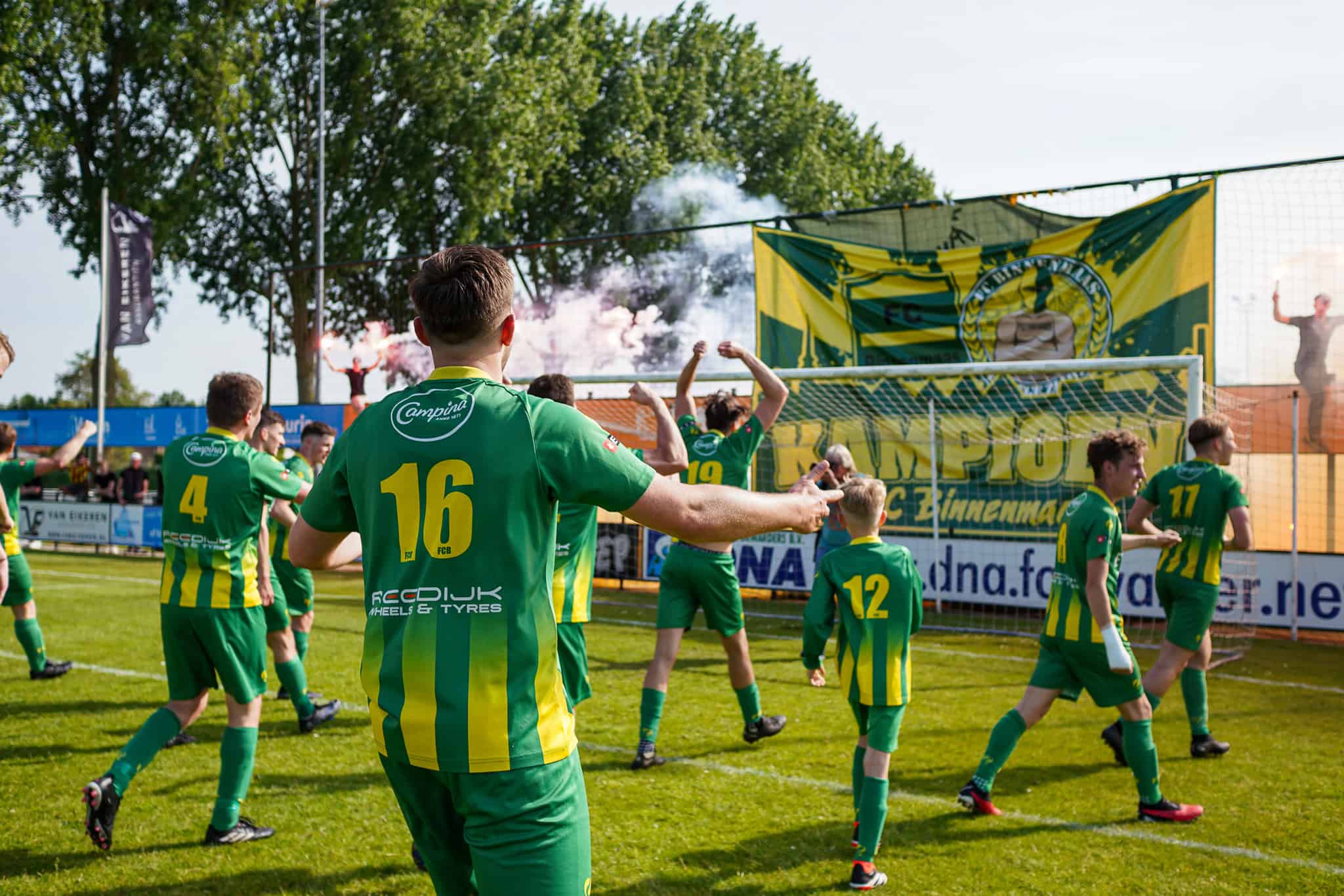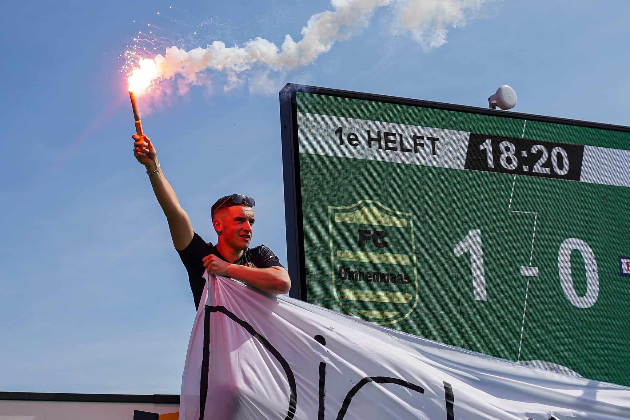 Het – vanwege het moeilijke ontwerp helaas wel gedrukte – kampioensdoek van de Lange Zijde kan worden uitgerold en het feest kan beginnen. FC Binnenmaas keert na 1 jaar afwezigheid terug in de Tweede Klasse. Voor zowel spelers als supporters reden om nog wat vuurwerk af te steken. Terwijl spelers en supporters samen op het veld staan te genieten van het kampioenschap zien we al gelijk dat dit feestje nog lang zal duren vanavond. Wat is het amateurvoetbal toch schitterend!