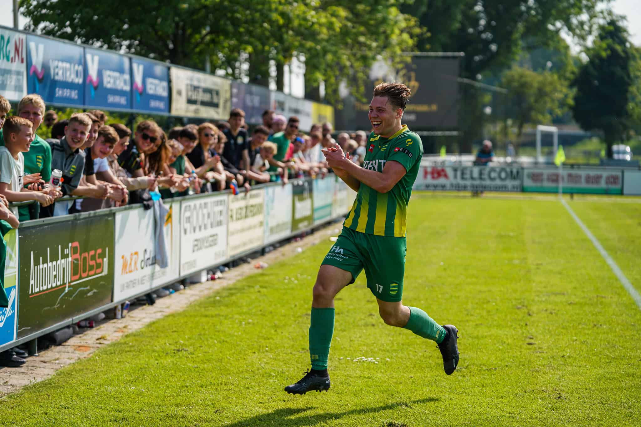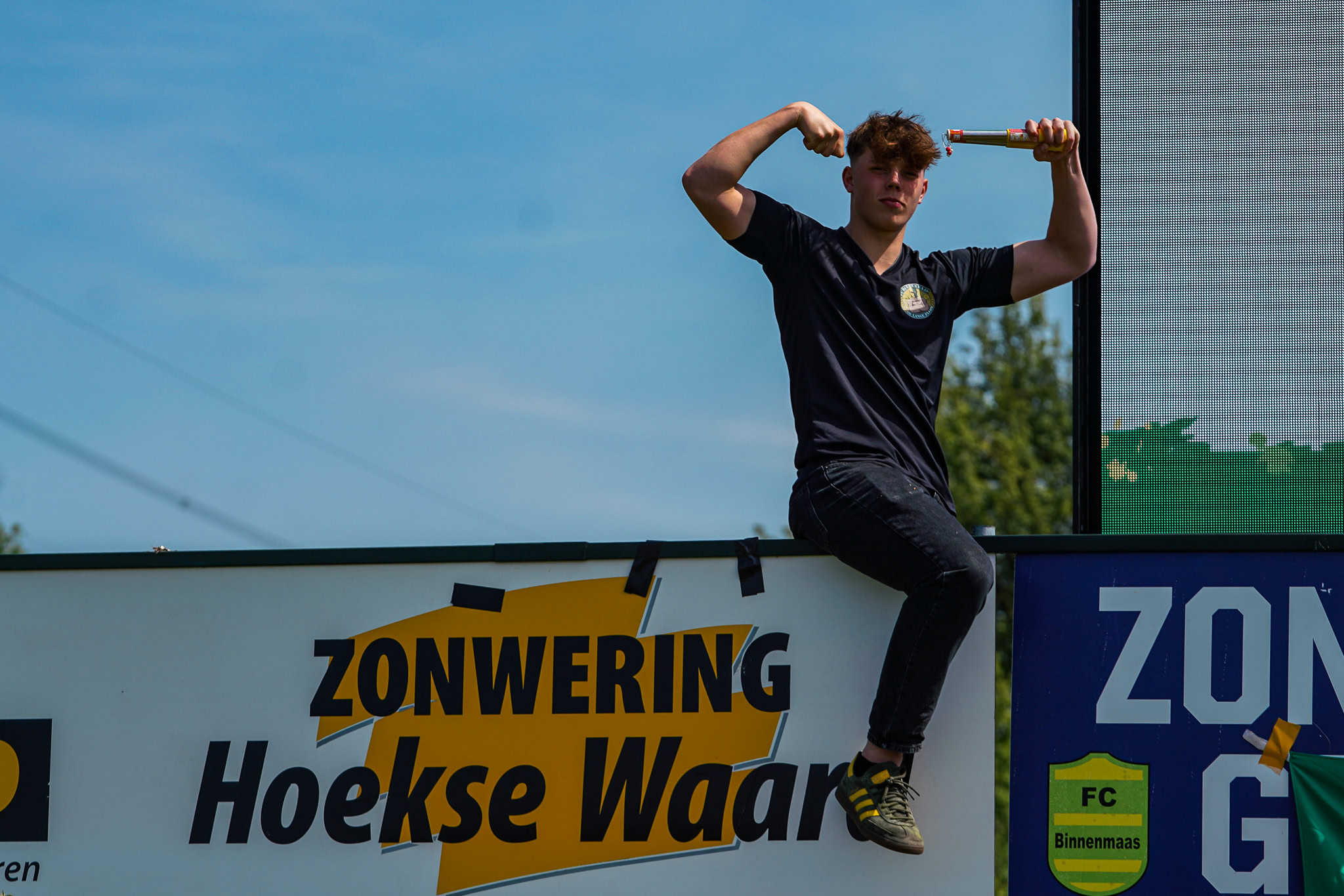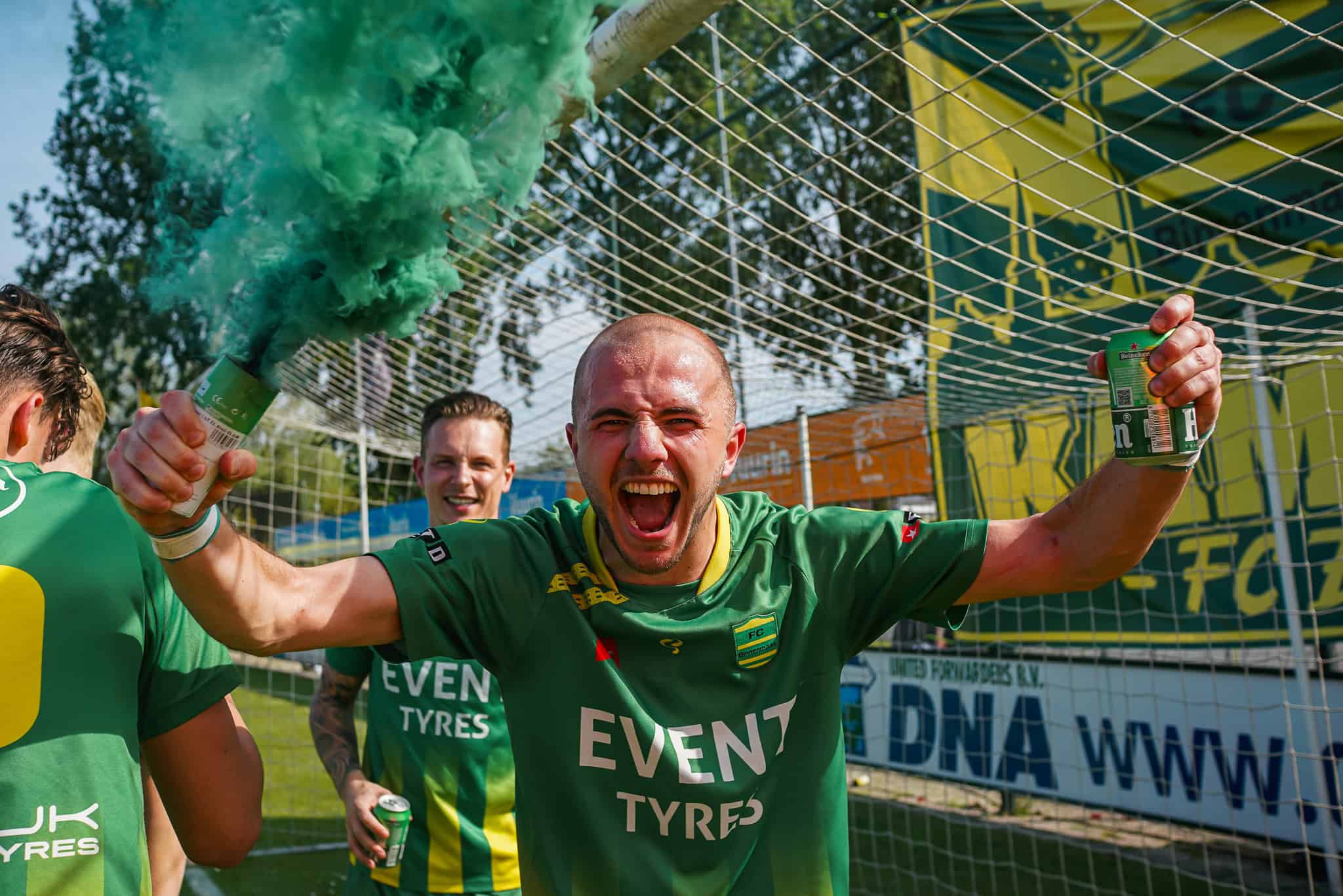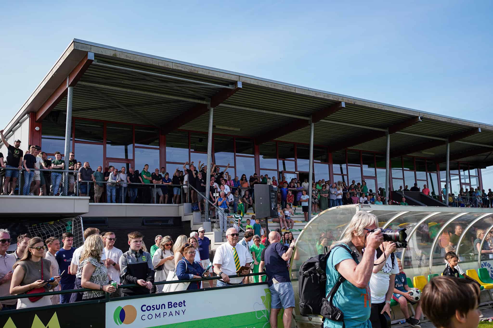 Het – vanwege het moeilijke ontwerp helaas wel gedrukte – kampioensdoek van de Lange Zijde kan worden uitgerold en het feest kan beginnen. FC Binnenmaas keert na 1 jaar afwezigheid terug in de Tweede Klasse. Voor zowel spelers als supporters reden om nog wat vuurwerk af te steken. Terwijl spelers en supporters samen op het veld staan te genieten van het kampioenschap zien we al gelijk dat dit feestje nog lang zal duren vanavond. Wat is het amateurvoetbal toch schitterend!