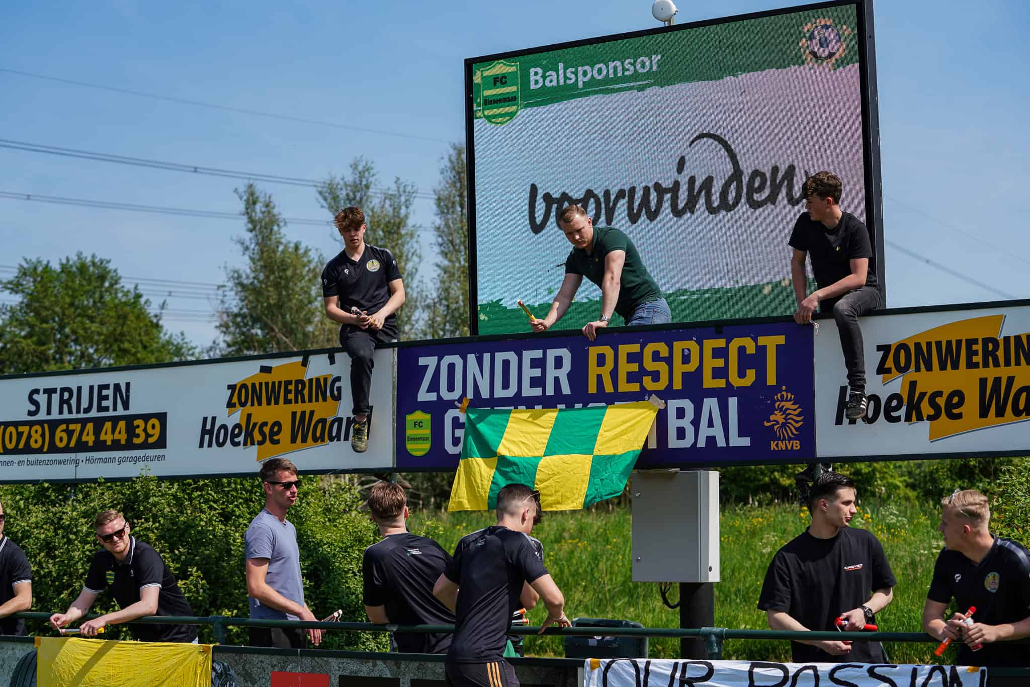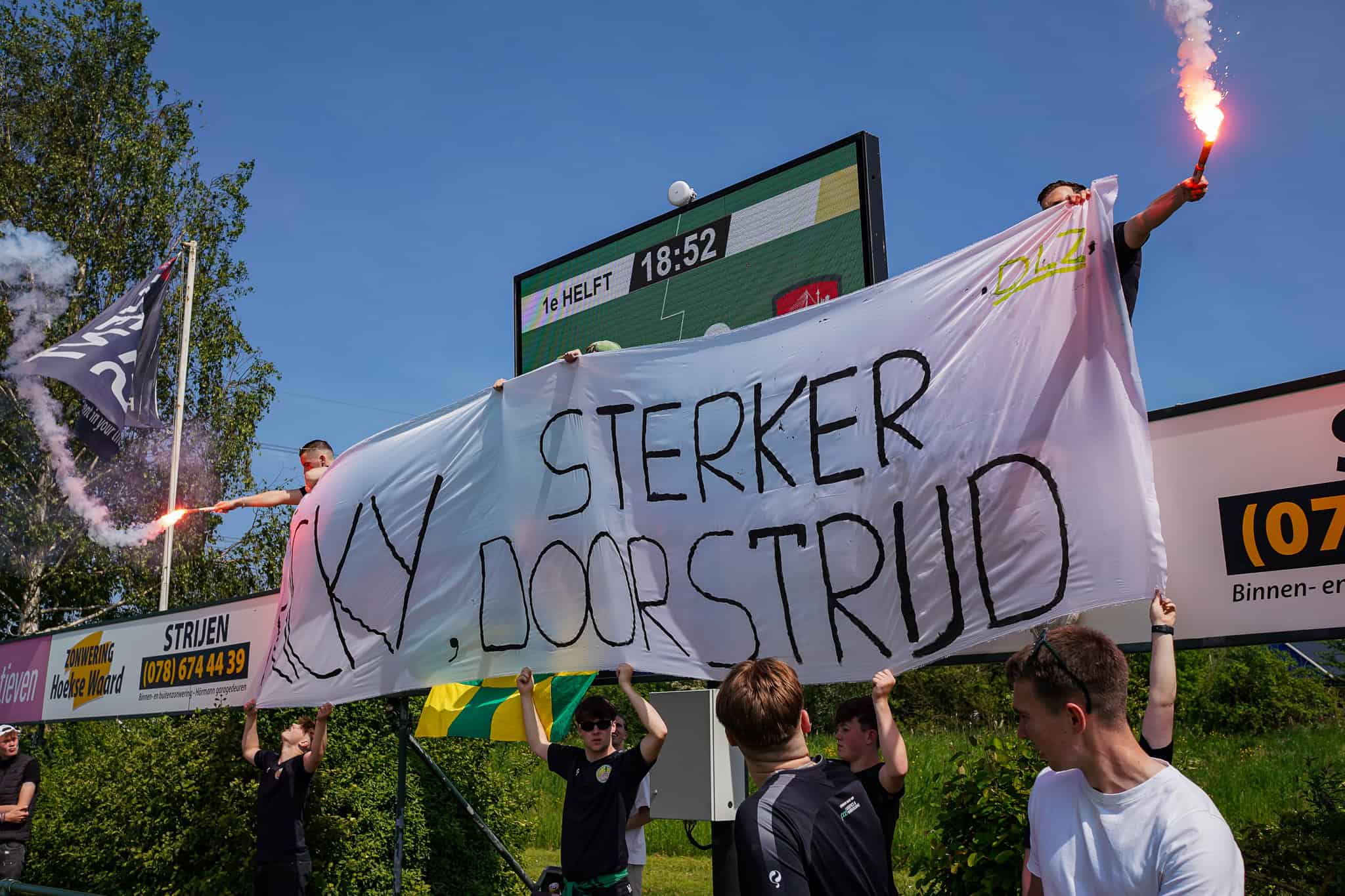 Als de spelers nog niet genoeg op scherp waren gezet, dan nu toch zeker. Vandaag moet gewonnen worden want iedereen heeft zin in een kampioensfeestje. Helaas zijn niet alle spelers van het sterkste elftal aanwezig. Aanvaller Rick Bokhoven, al het hele jaren een belangrijke pion in de kampioensformatie, raakte vorige week zwaar geblesseerd op de training. Niet alleen mist hij hierdoor de kampioenswedstrijd, ook heeft hij nog een lange revalidatie voor zich. Om hem een hart onder de riem te steken tonen de supporters daarom in de 18e minuut een spandoek met “Ricky, sterker door strijd!”.