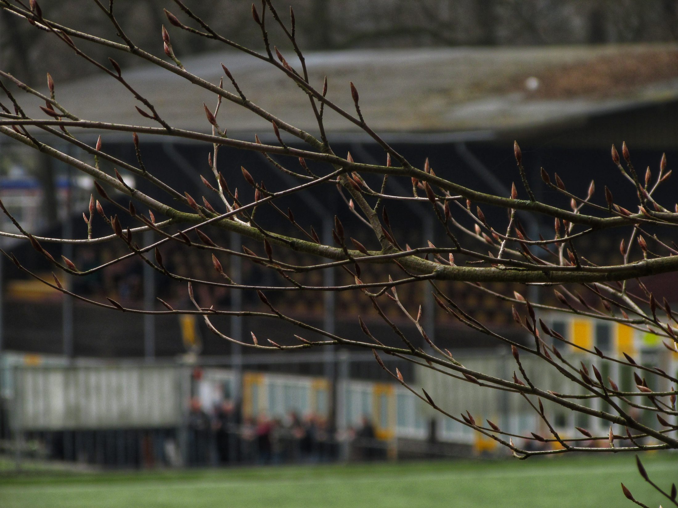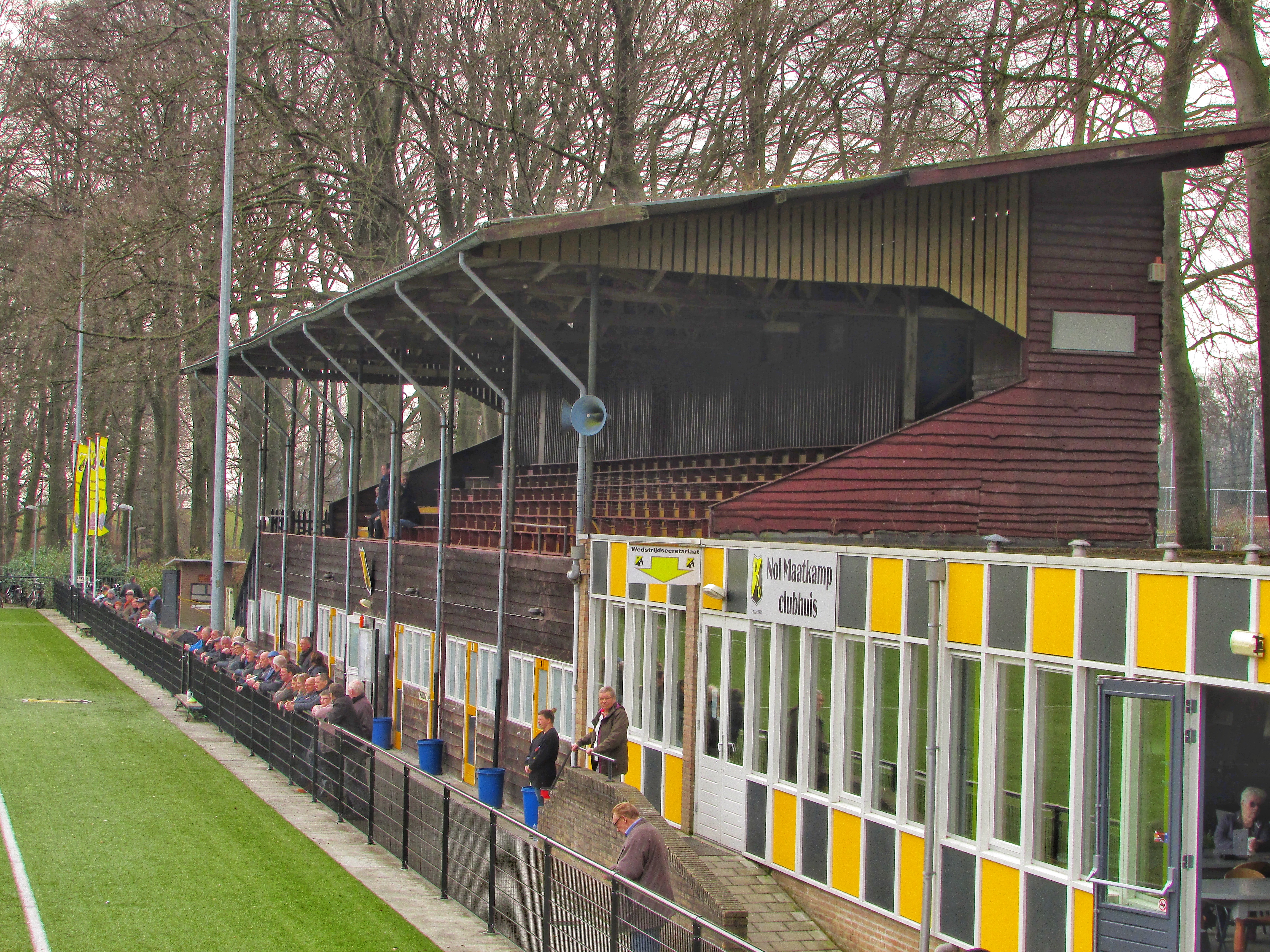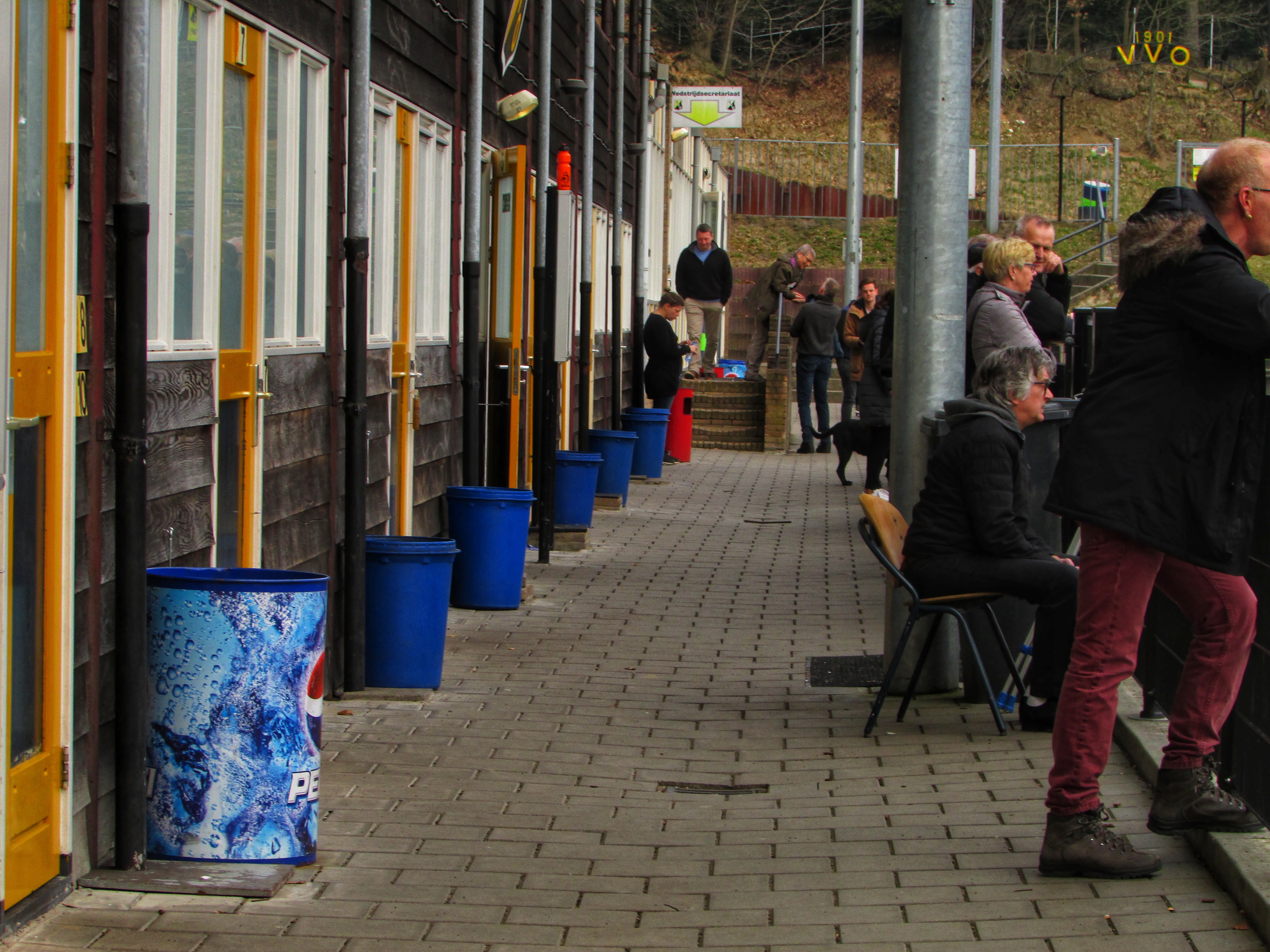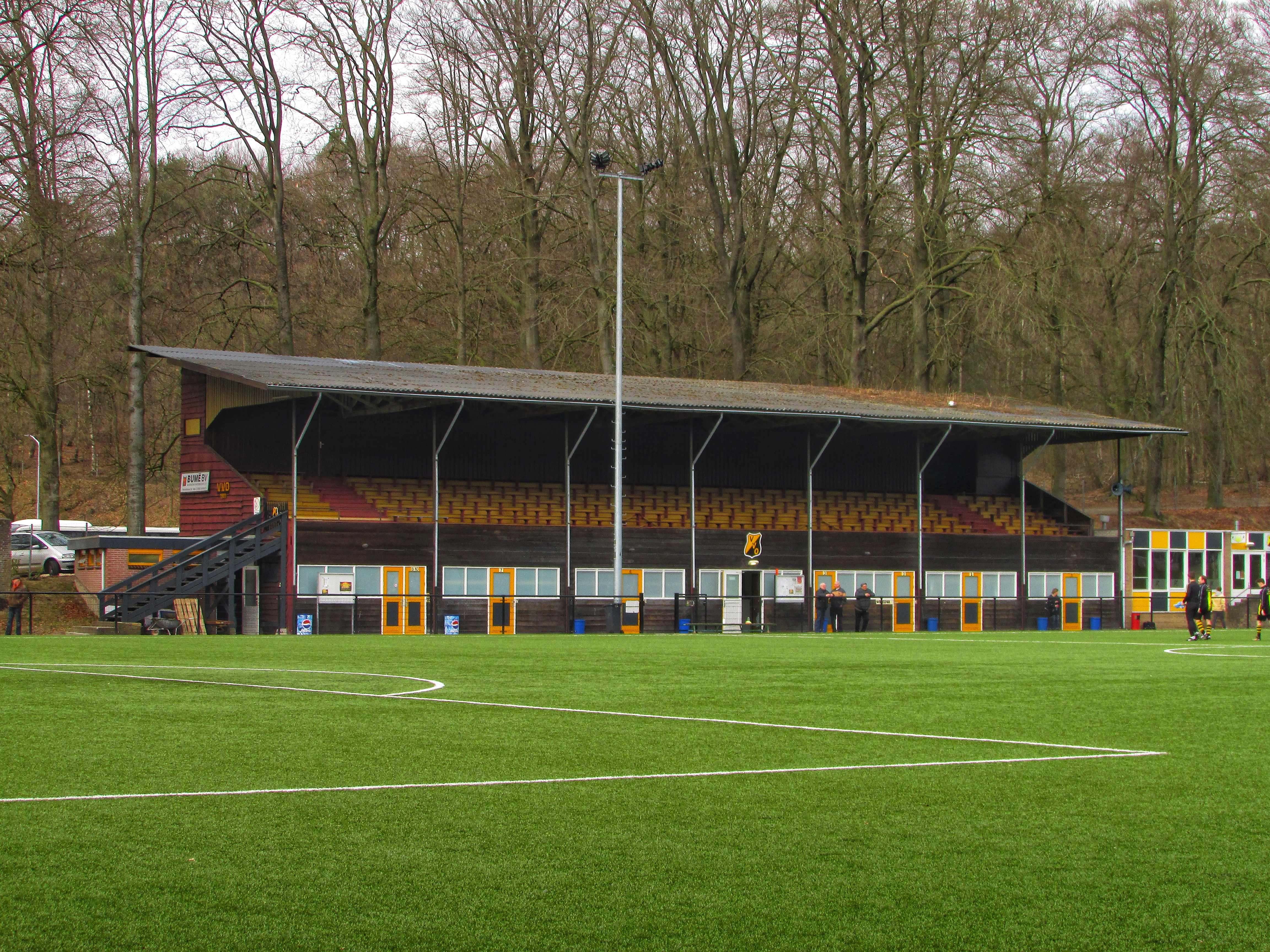 Bij binnenkomst hangt er een bordje op het tickethuisje. Het stamt nog uit het Gulden tijdperk. Direct valt de grote tribune op. De houten tribune is vrij recent gerenoveerd, maar dat hebben ze prachtig gedaan. De Pinkenberg ligt tussen een aantal heuvels in. Eén van de toeschouwers die met de uitploeg is meegereisd, vergelijkt het met de Koel van VVV. Het is niet druk vandaag, toch zonde, op een zondag waarin er geen betaald voetbal is. Pakweg 100 supporters staan er langs de lijn. En een hond, dat dan weer wel. In de moderne kantine staat wielrennen op. Mijn aandacht gaat toch vooral uit naar de prachtige tribune, maar ook naar een zeer merkwaardige wedstrijd. SV Grol, speelt vandaag tegen én met VVO. De bezoekers spelen de geel-zwarten van het kastje naar de muur, maar de bal gaat er niet in. Via een mislukte voorzet komt uiteindelijk de thuisploeg op voorsprong. De voorsprong wordt voor rust door een knappe actie van een aanvaller van VVO zelfs nog verdubbeld.