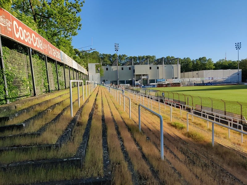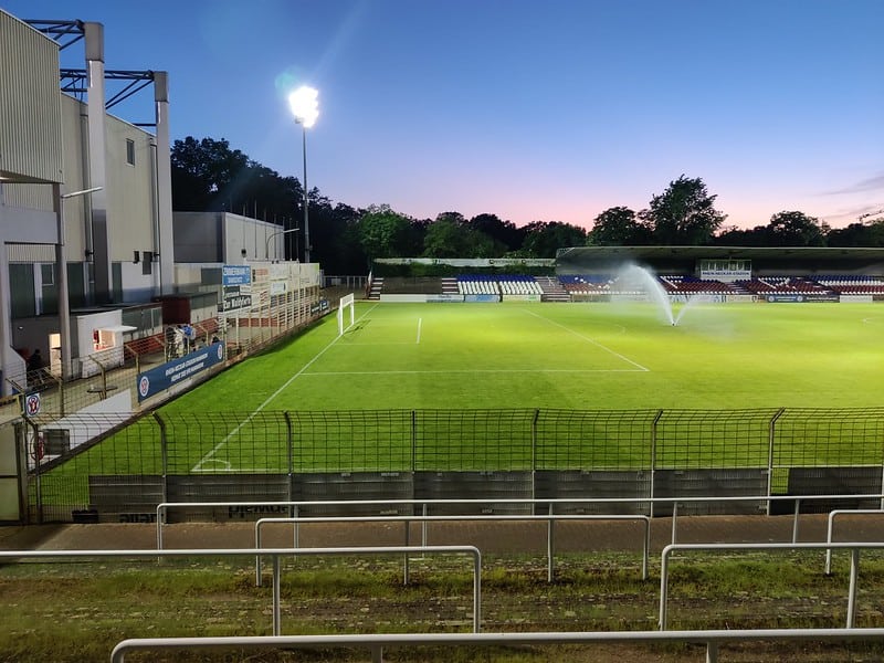 Om ons heen zien we een flink aantal groundhoppers. We halen een biertje en gaan eens rustig een rondje om het veld doen. We zien schitterende overwoekerde staantribunes, een grote overdekte hoofdtribune met 1.000 zitplaatsen en klassieke lichtmasten. Na enkele minuten komen de spelers het veld op en we besluiten plaats te nemen op de staantribune. Heerlijk in het avondzonnetje krijgen we een zeer vermakelijke eerste helft voorgeschoteld.