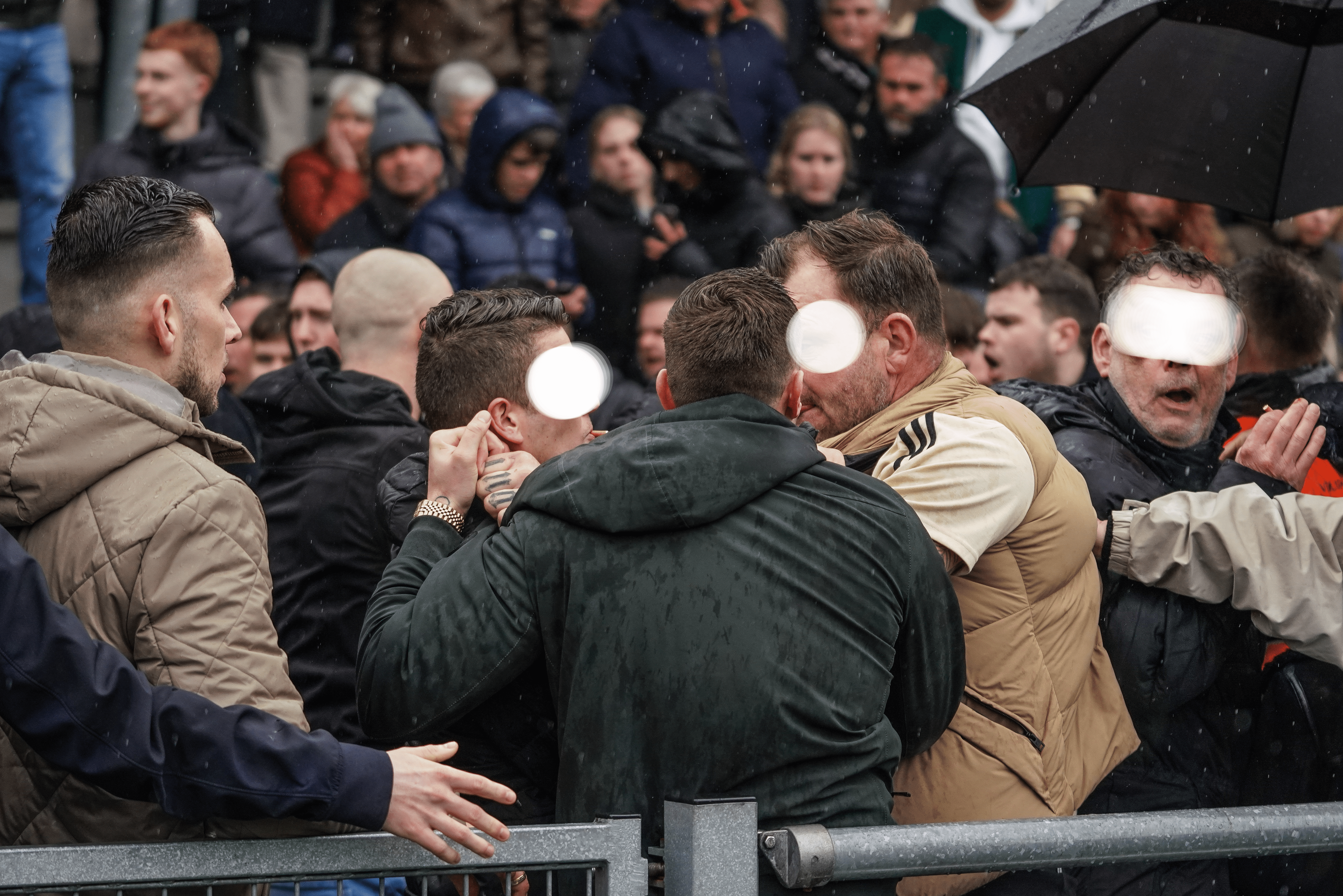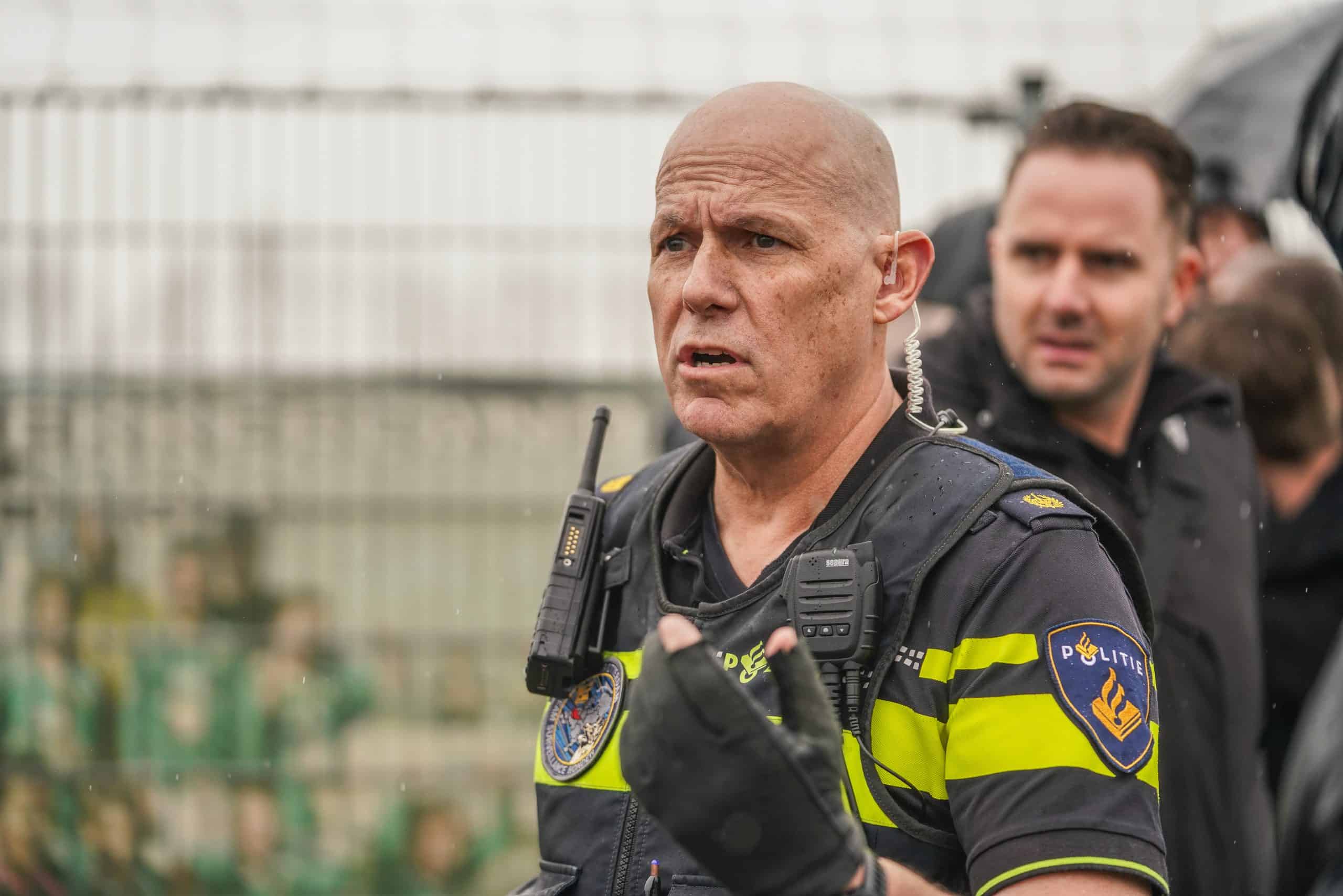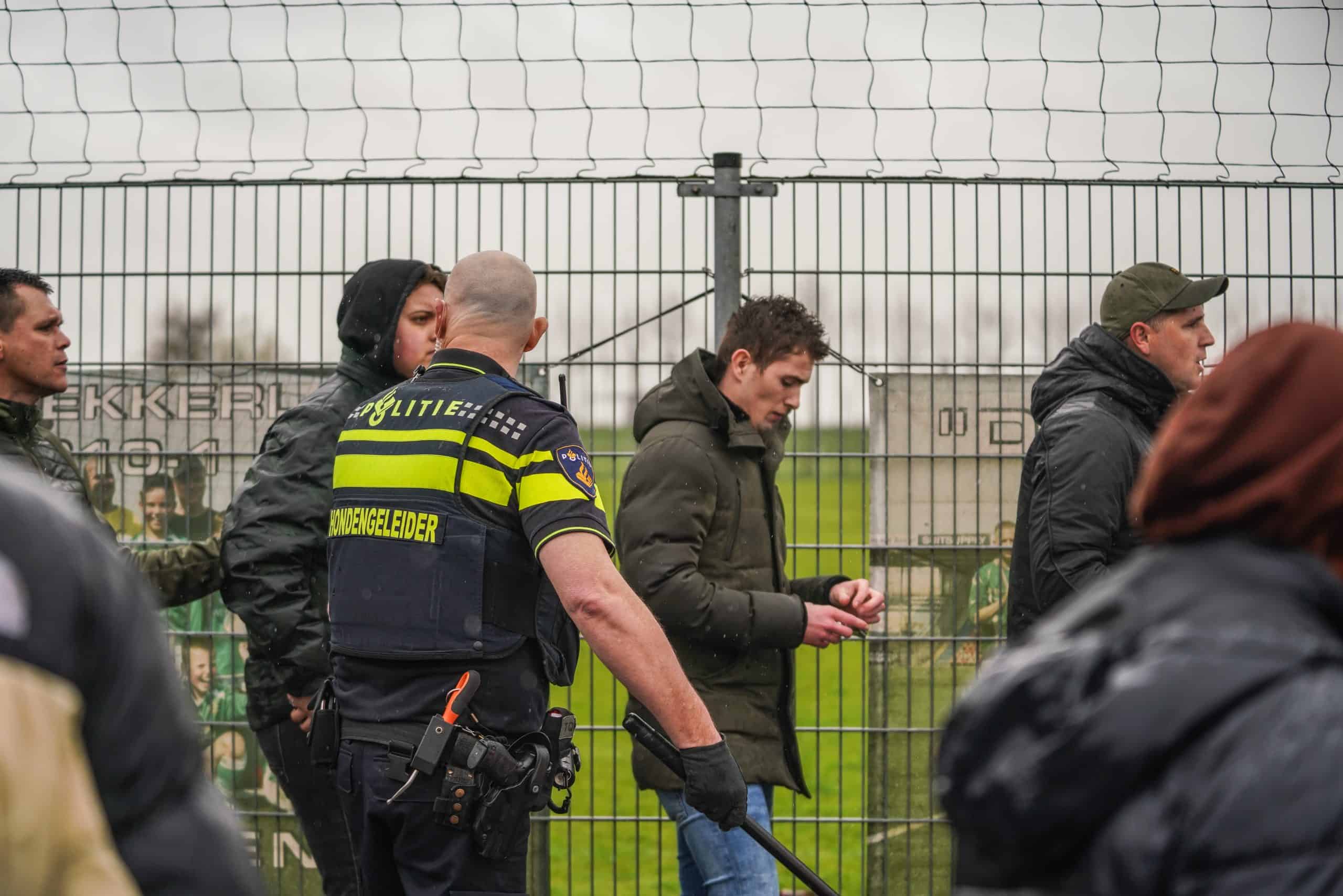 De groepen van Nieuw-Lekkerland en De Zwerver treffen elkaar vervolgens voor de tribune. Ook enkele spelers bemoeien zich met het geheel. Enkele minuten later arriveert de politie op het Sportpark en de wedstrijd ligt al met al 10 minuten stil.