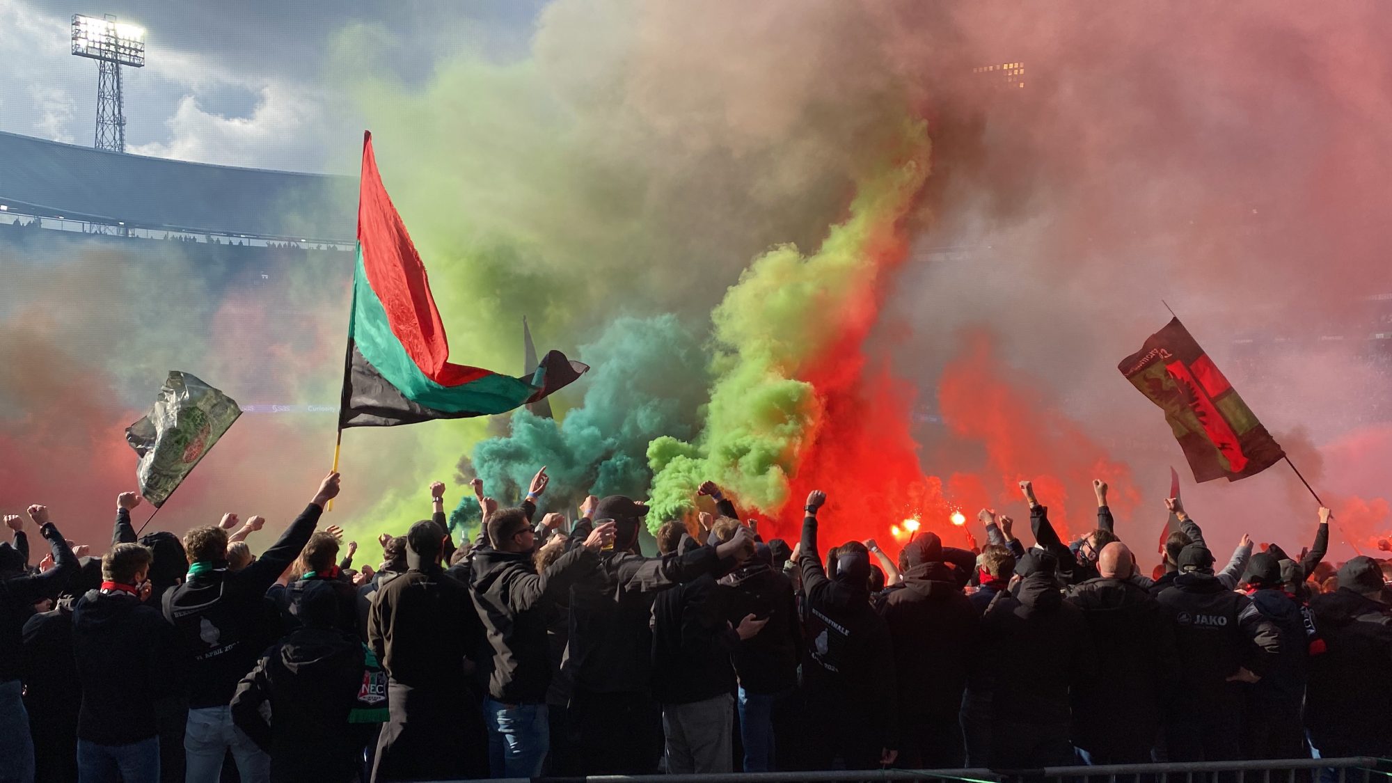 Vervolgens liet het antwoord van de aanhang van NEC niet lang op zich wachten! De wedstrijd werd vanwege de rookontwikkeling even onderbroken.