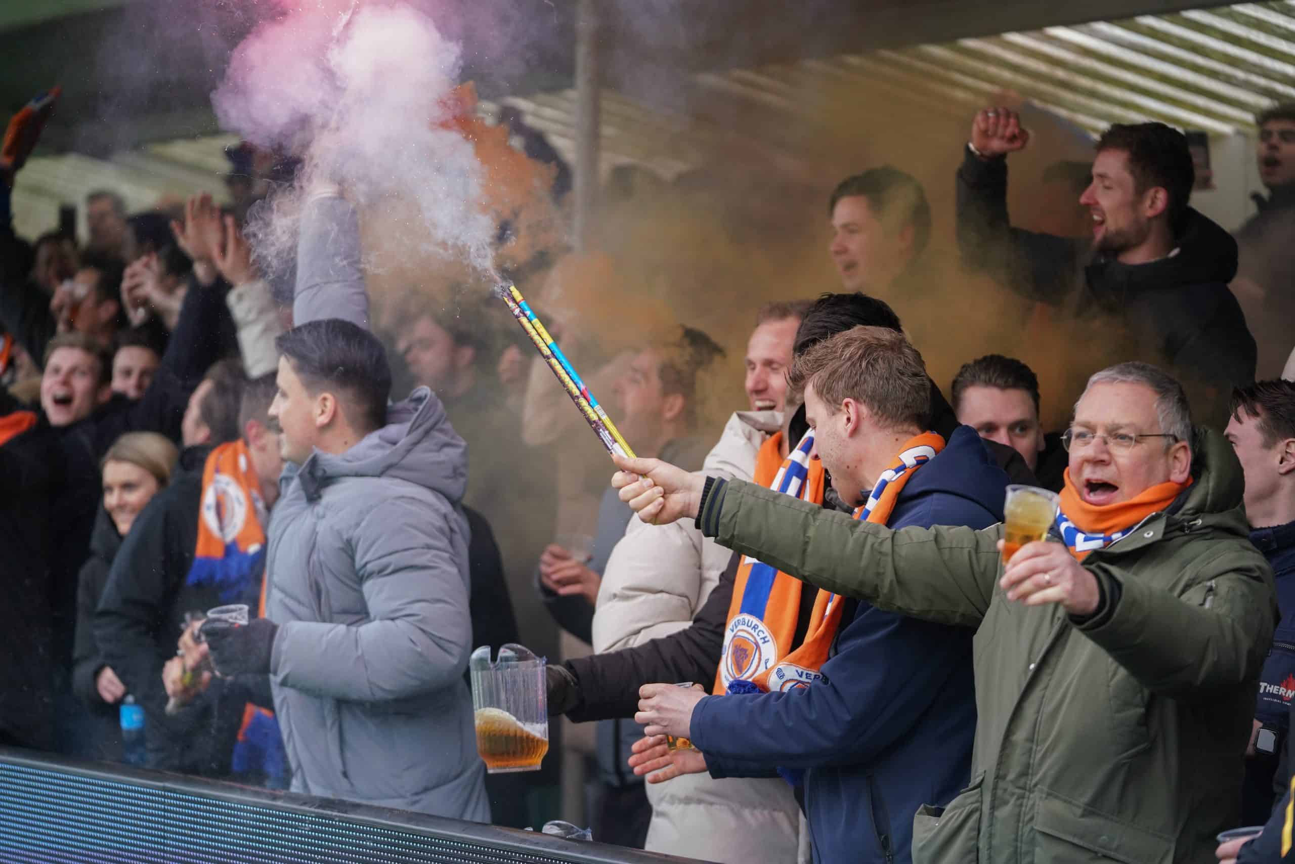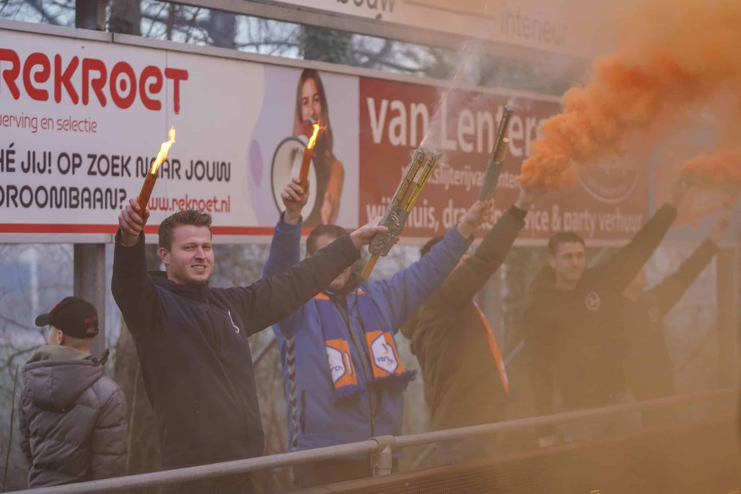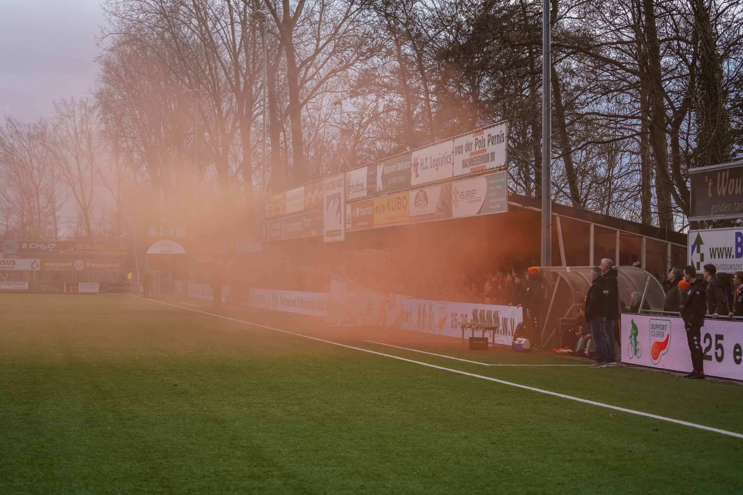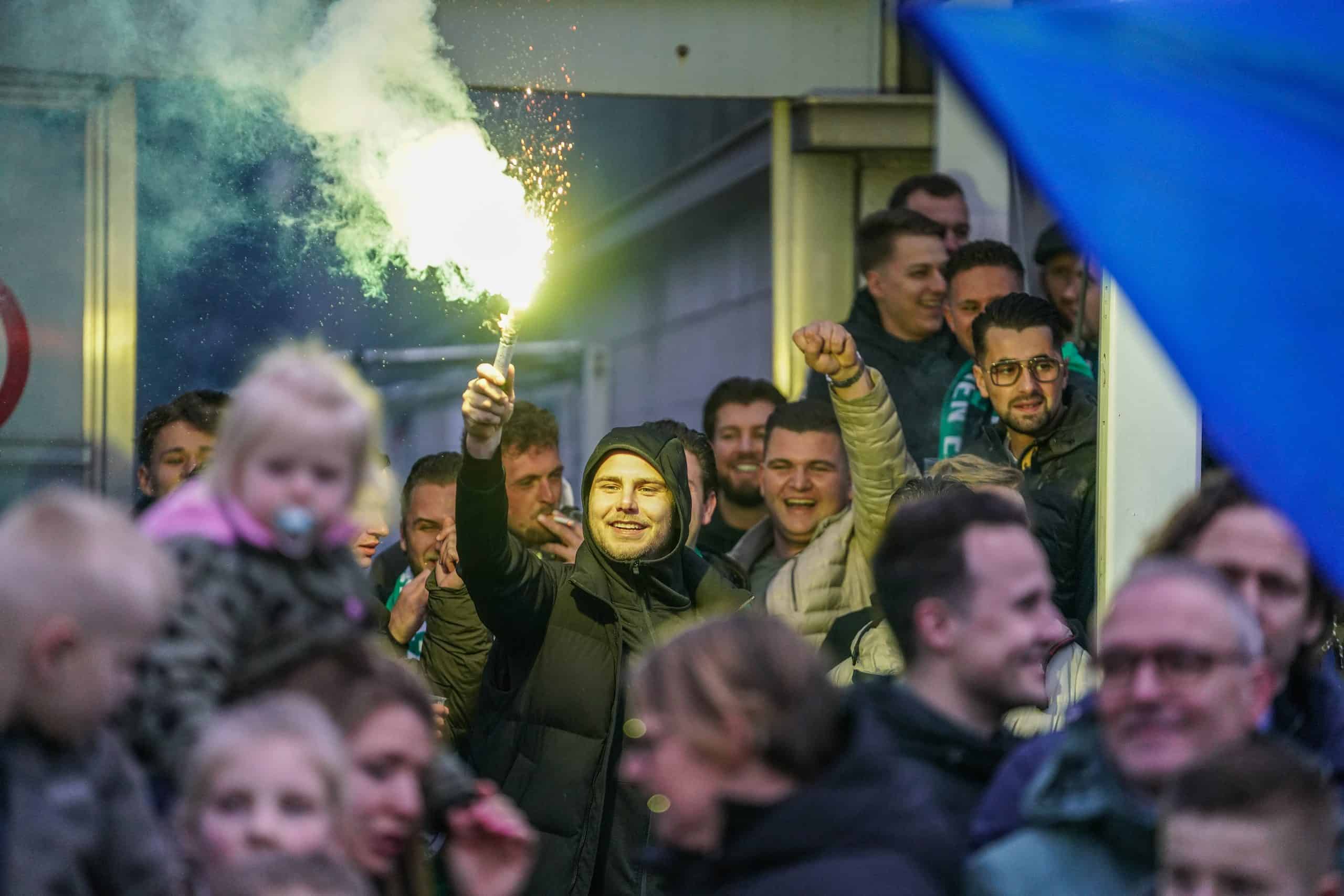 De publieke belangstelling voor de wedstrijd is groot en ondanks het slechte weer zijn bijna 3.000 supporters naar het sportpark gekomen. Bij de opkomst is er flinke pyro van de bezoekers met fakkels en RDG’s. De gekozen plek voor dit spektakel (onder een afdakje) is minder slim, want het plastic rond het dak vliegt even kort in de fik. Allemaal geen groot probleem. De tweede derby van de dag kan beginnen!