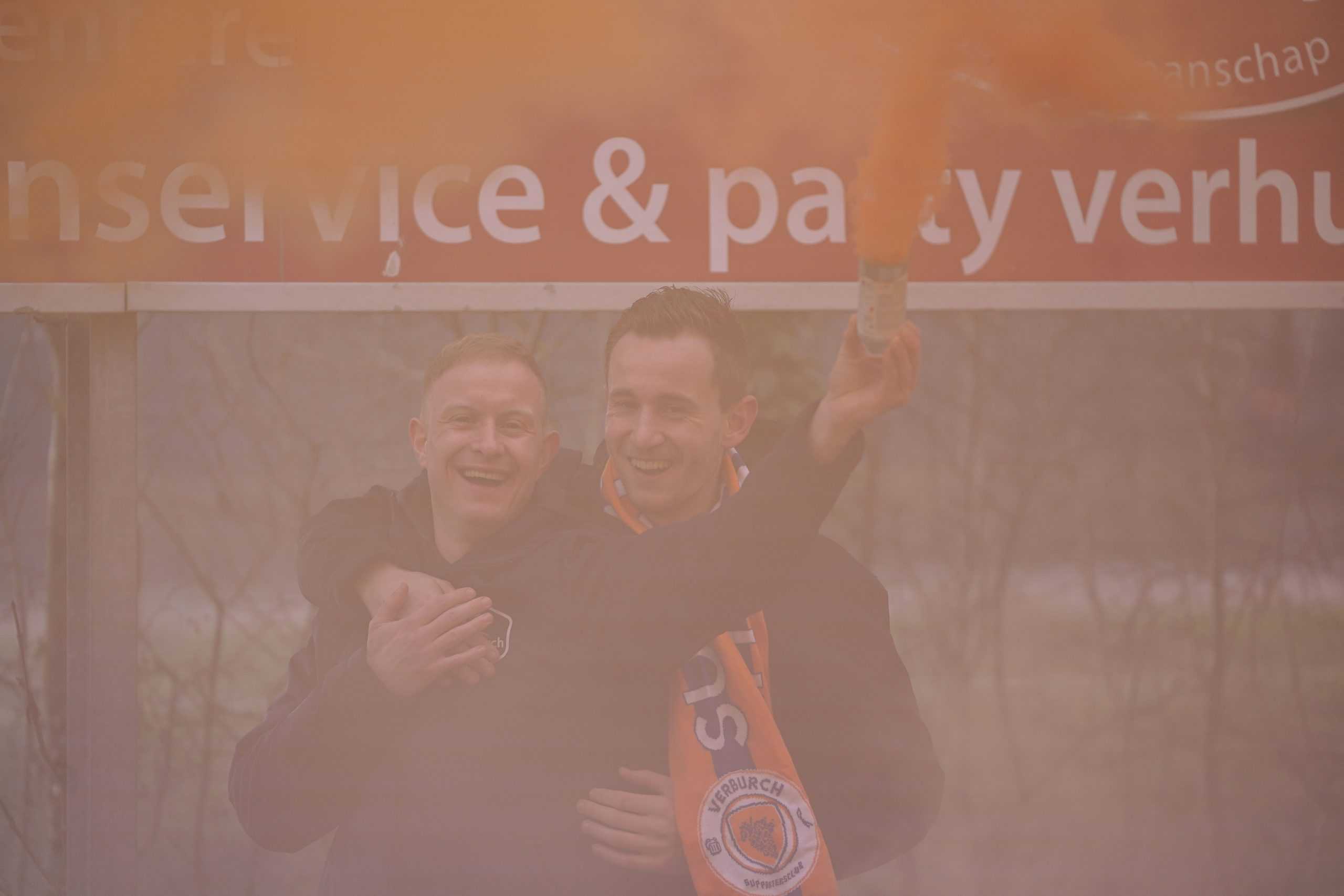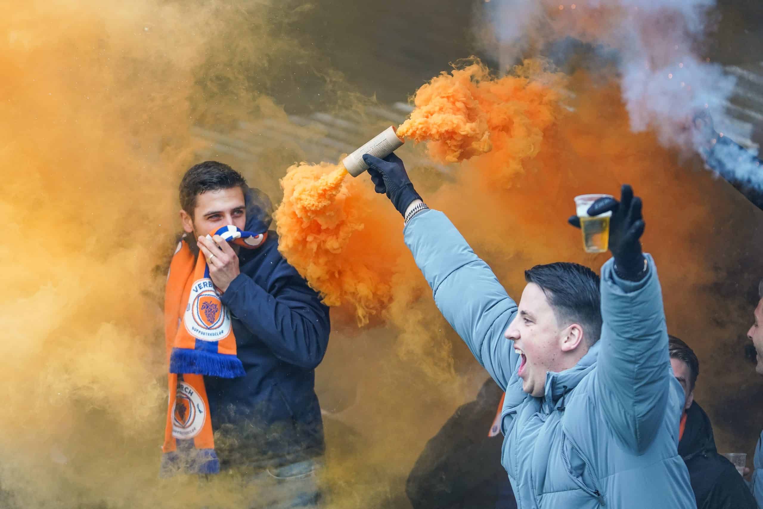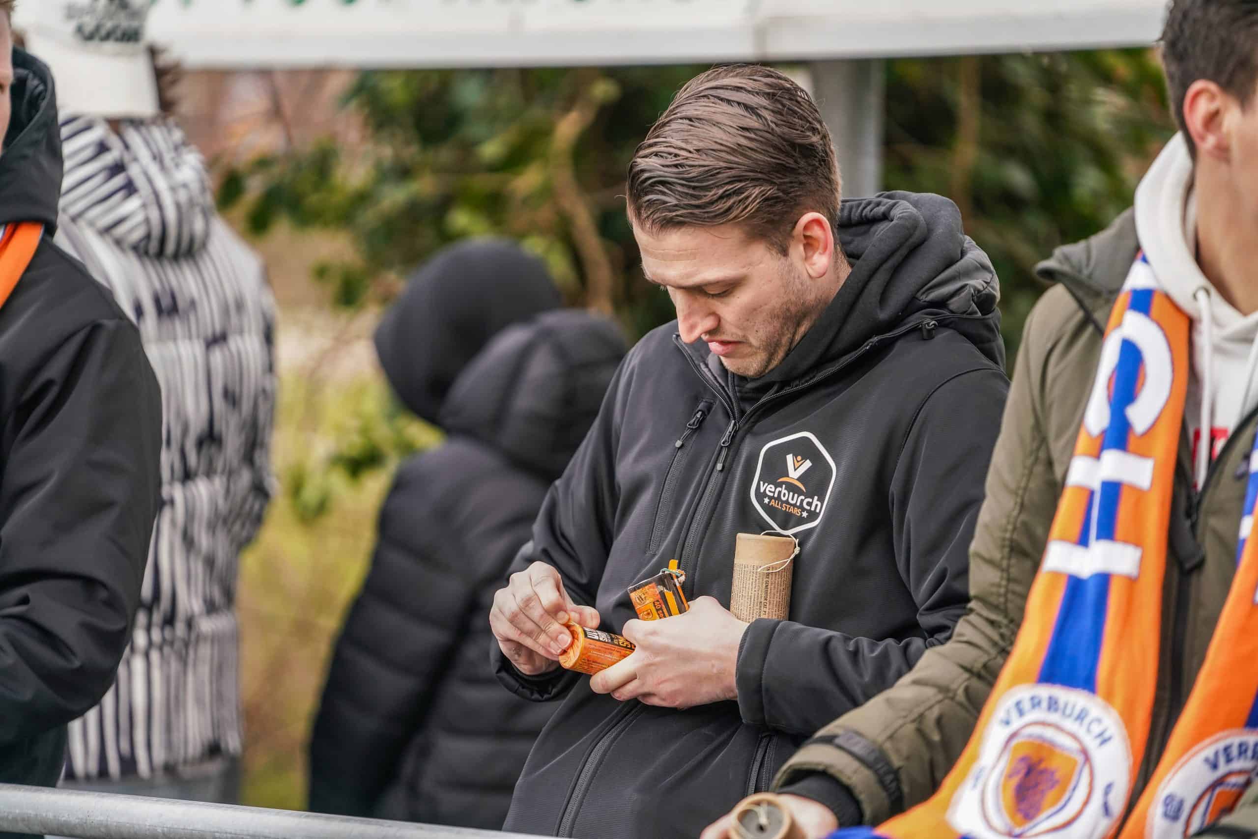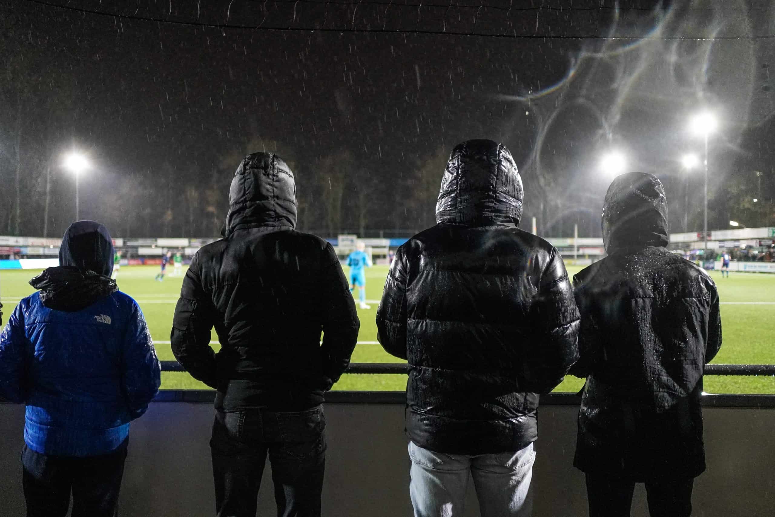 De publieke belangstelling voor de wedstrijd is groot en ondanks het slechte weer zijn bijna 3.000 supporters naar het sportpark gekomen. Bij de opkomst is er flinke pyro van de bezoekers met fakkels en RDG’s. De gekozen plek voor dit spektakel (onder een afdakje) is minder slim, want het plastic rond het dak vliegt even kort in de fik. Allemaal geen groot probleem. De tweede derby van de dag kan beginnen!