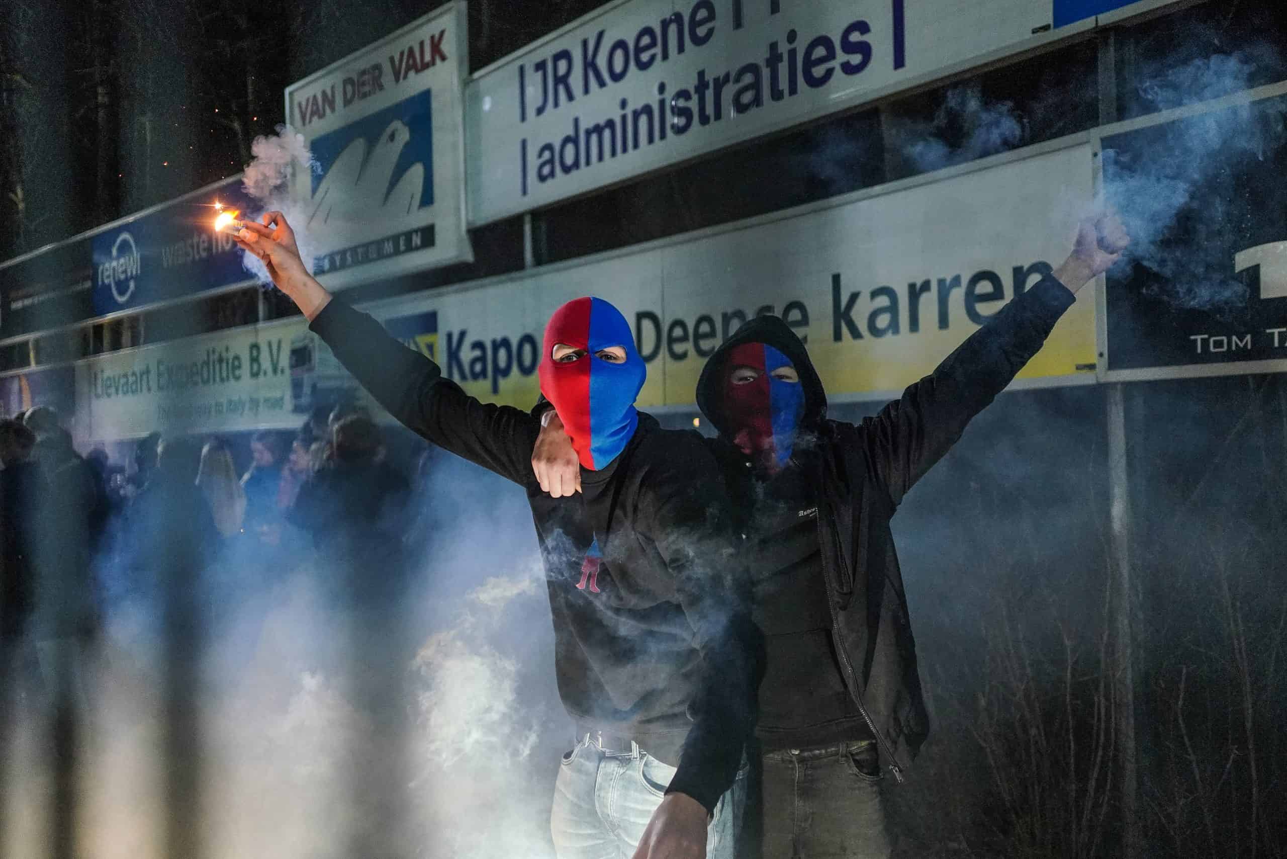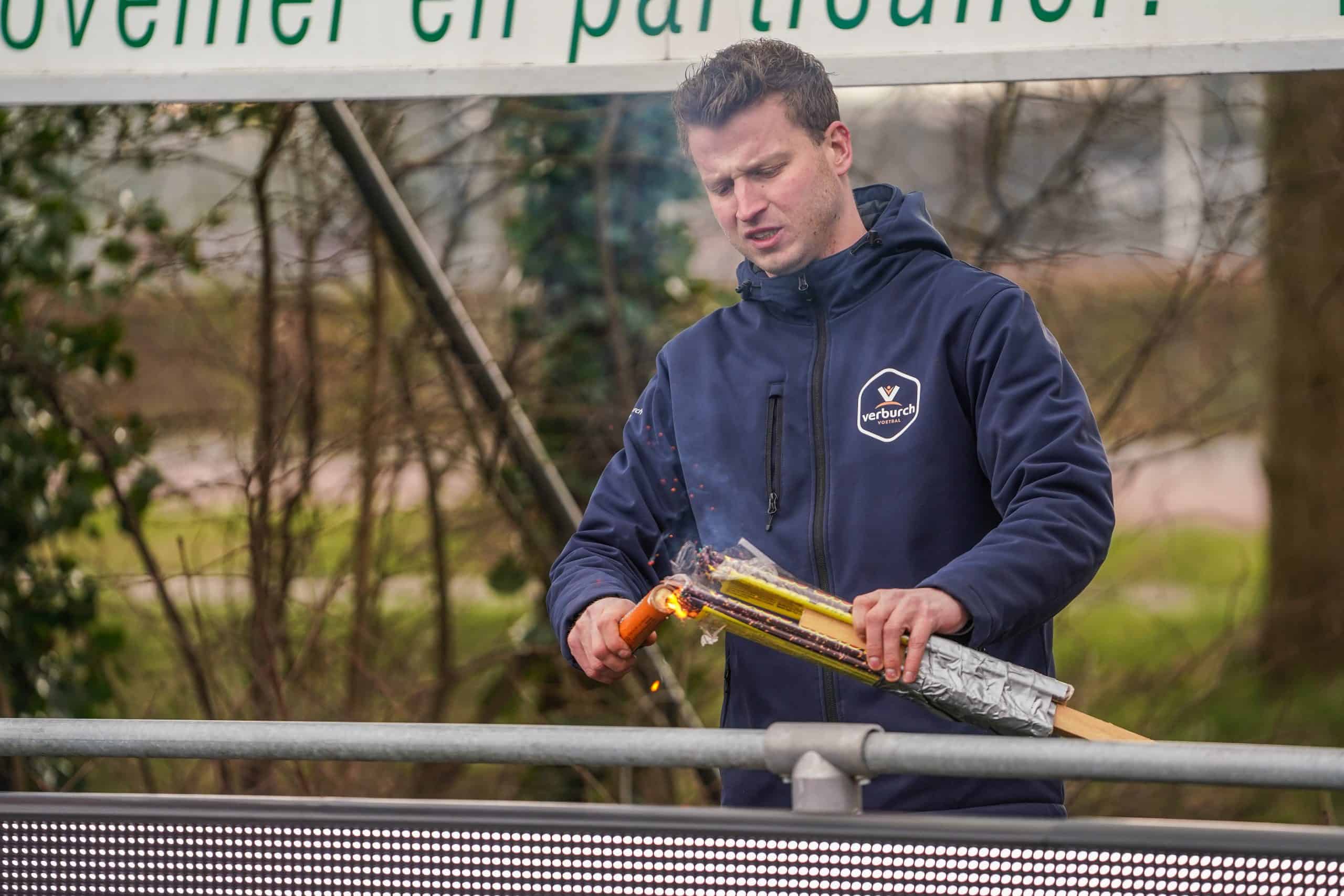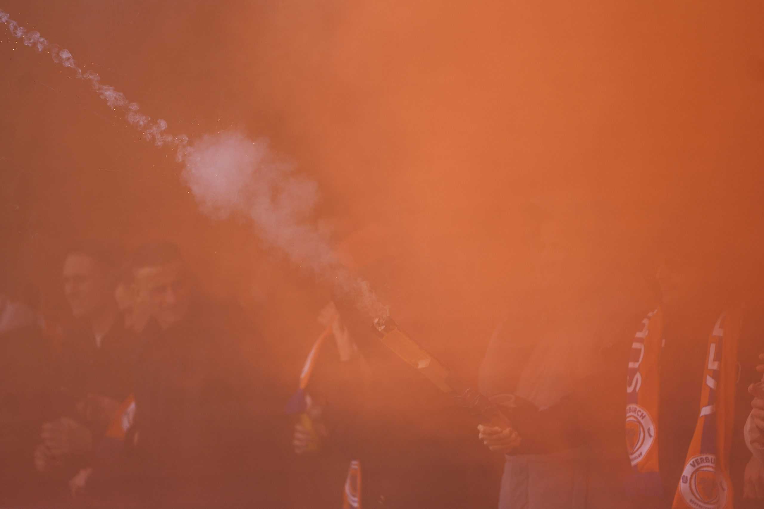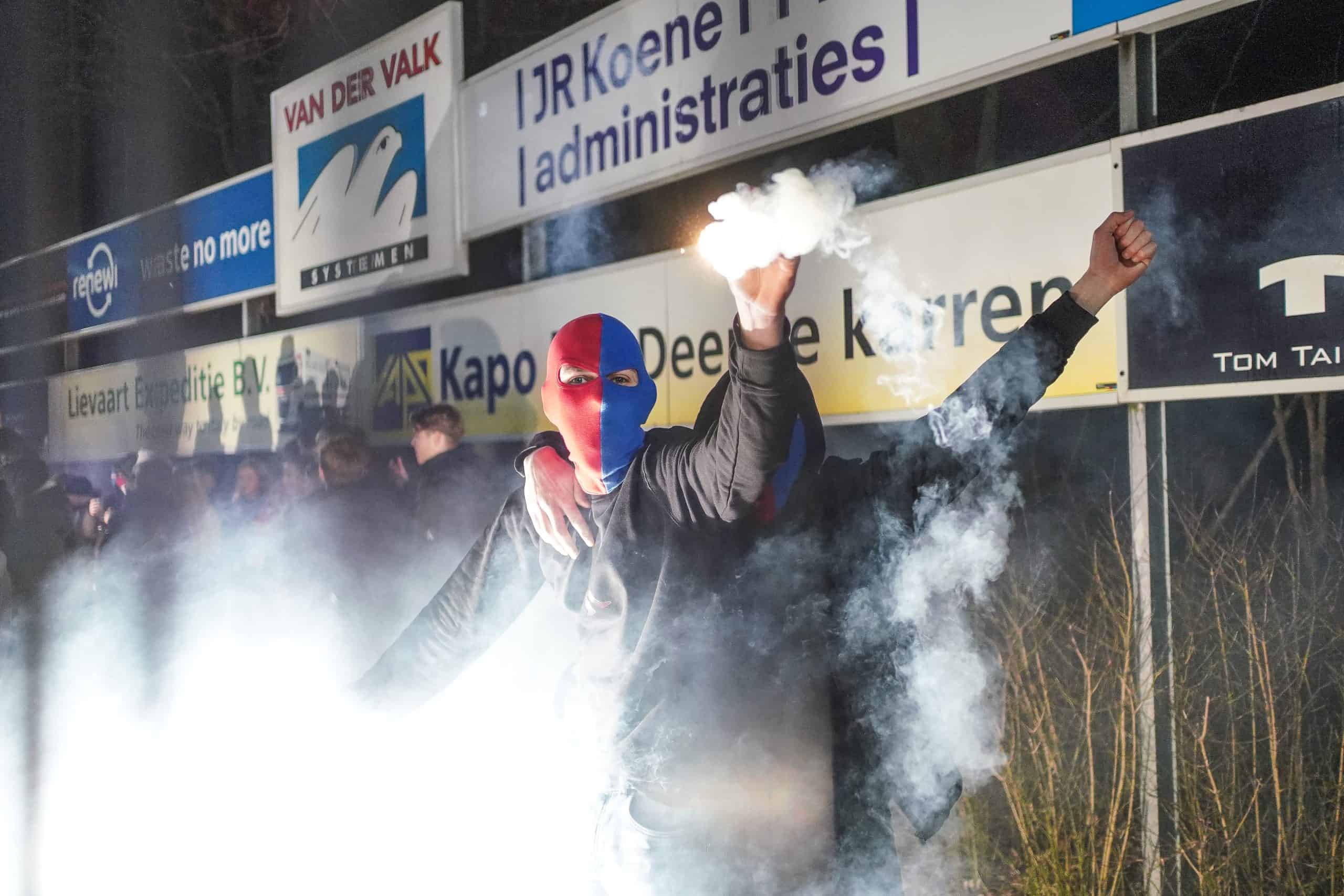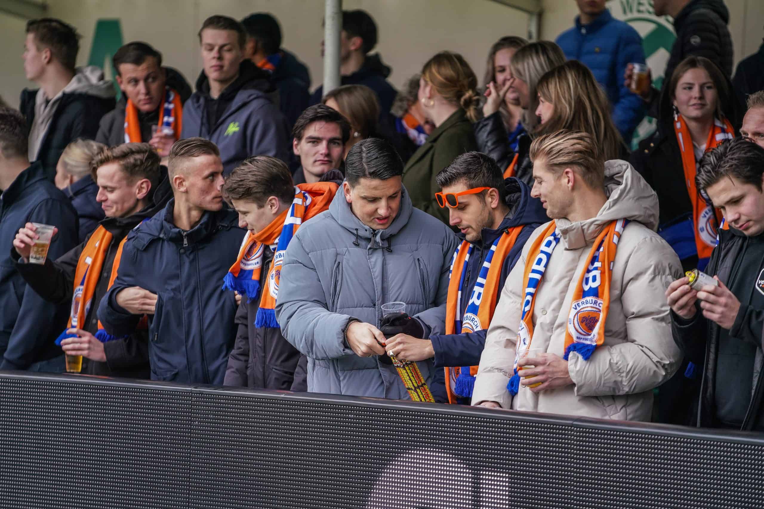 De publieke belangstelling voor de wedstrijd is groot en ondanks het slechte weer zijn bijna 3.000 supporters naar het sportpark gekomen. Bij de opkomst is er flinke pyro van de bezoekers met fakkels en RDG’s. De gekozen plek voor dit spektakel (onder een afdakje) is minder slim, want het plastic rond het dak vliegt even kort in de fik. Allemaal geen groot probleem. De tweede derby van de dag kan beginnen!