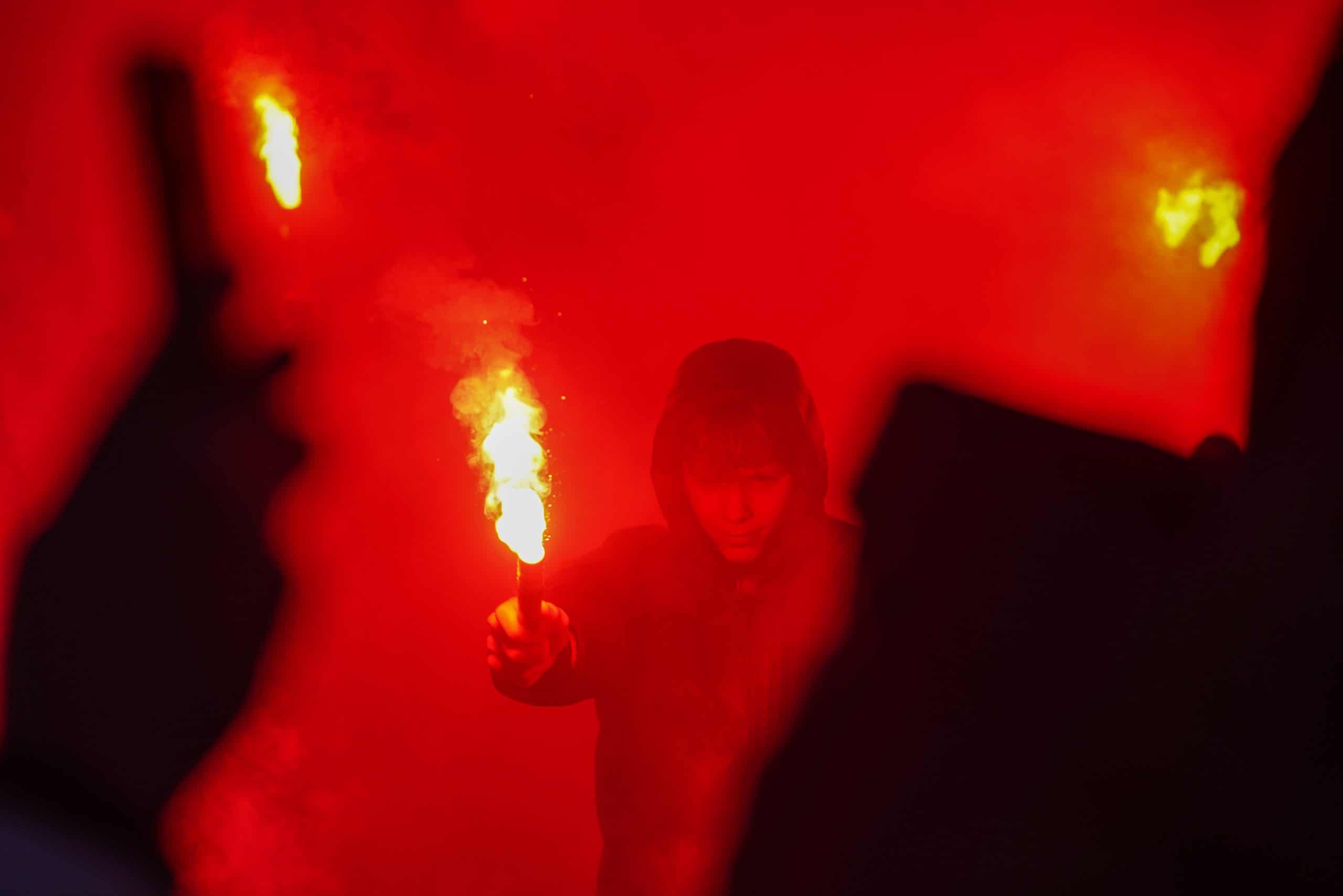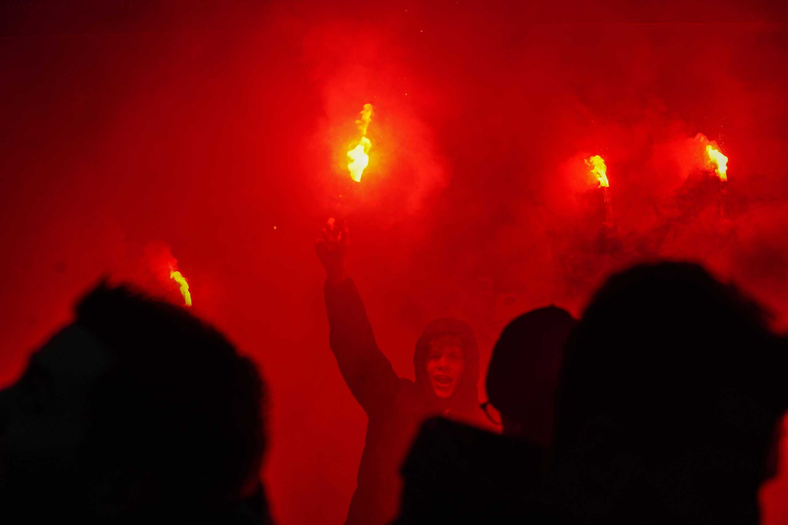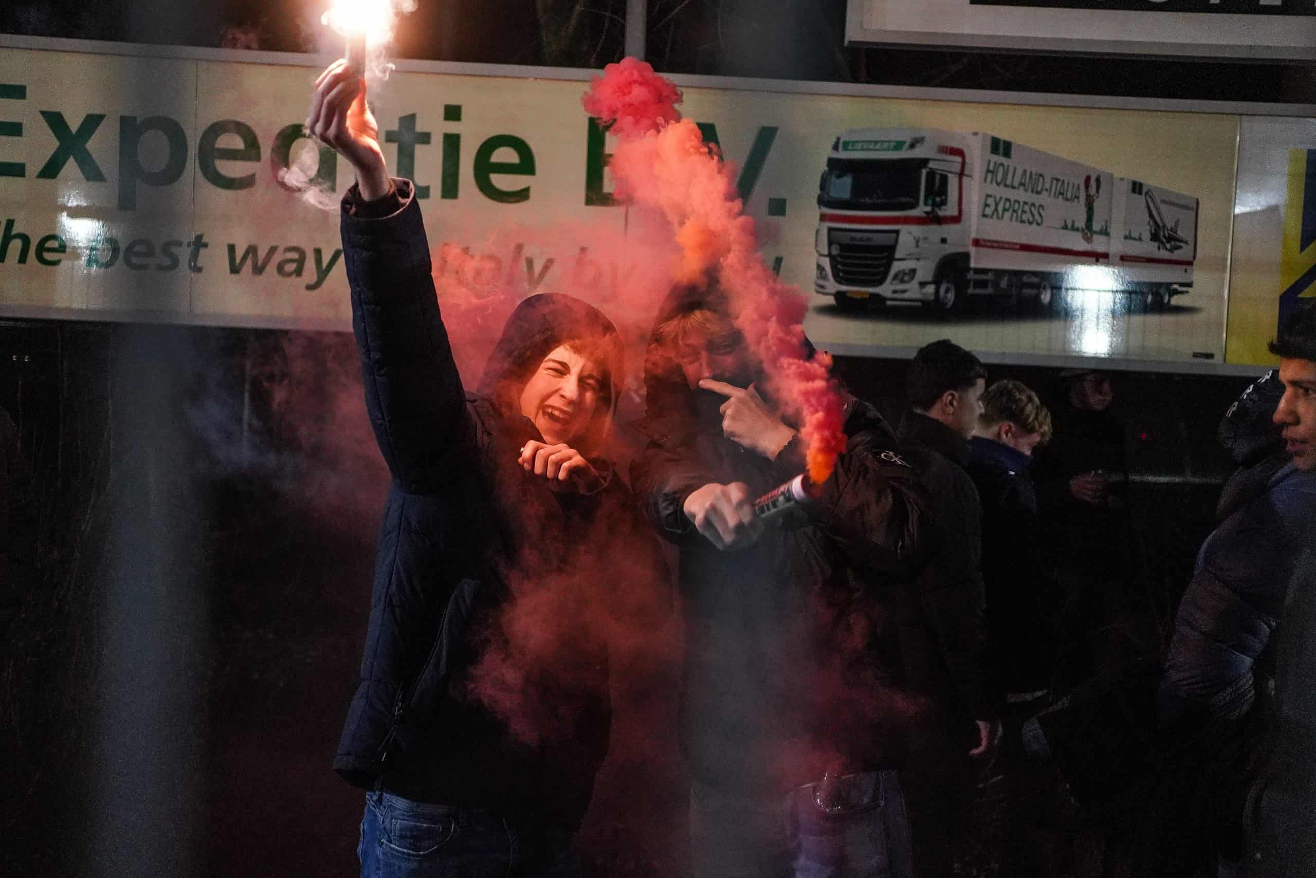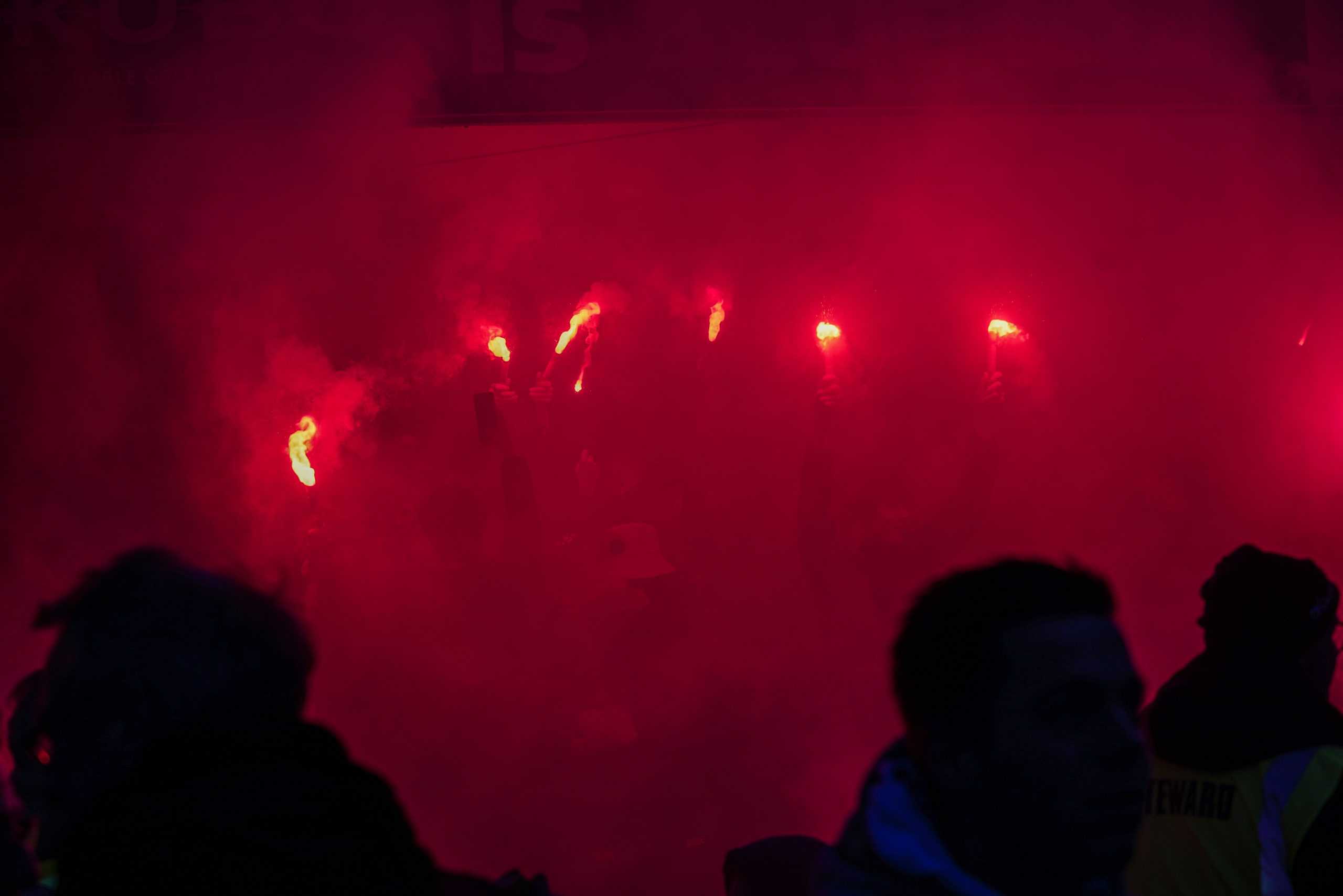 De publieke belangstelling voor de wedstrijd is groot en ondanks het slechte weer zijn bijna 3.000 supporters naar het sportpark gekomen. Bij de opkomst is er flinke pyro van de bezoekers met fakkels en RDG’s. De gekozen plek voor dit spektakel (onder een afdakje) is minder slim, want het plastic rond het dak vliegt even kort in de fik. Allemaal geen groot probleem. De tweede derby van de dag kan beginnen!