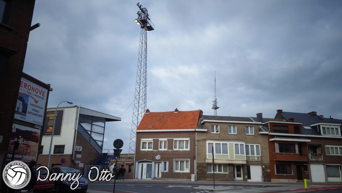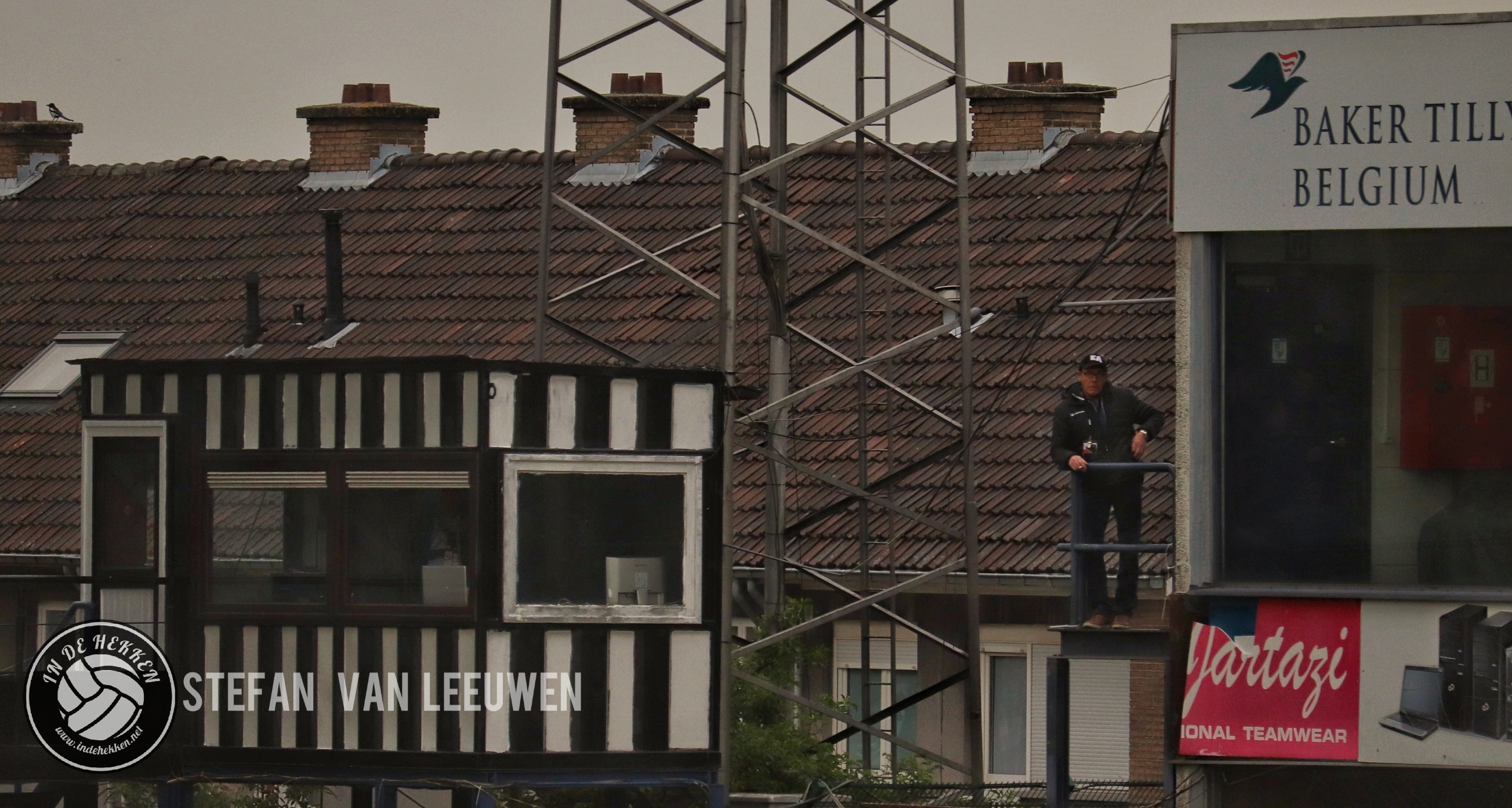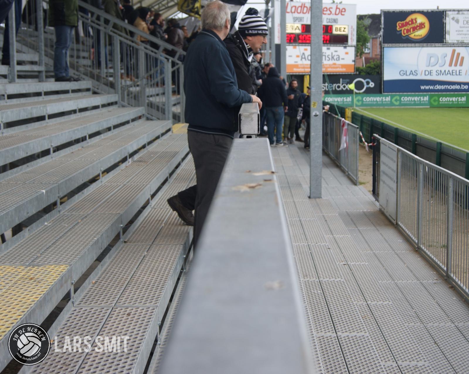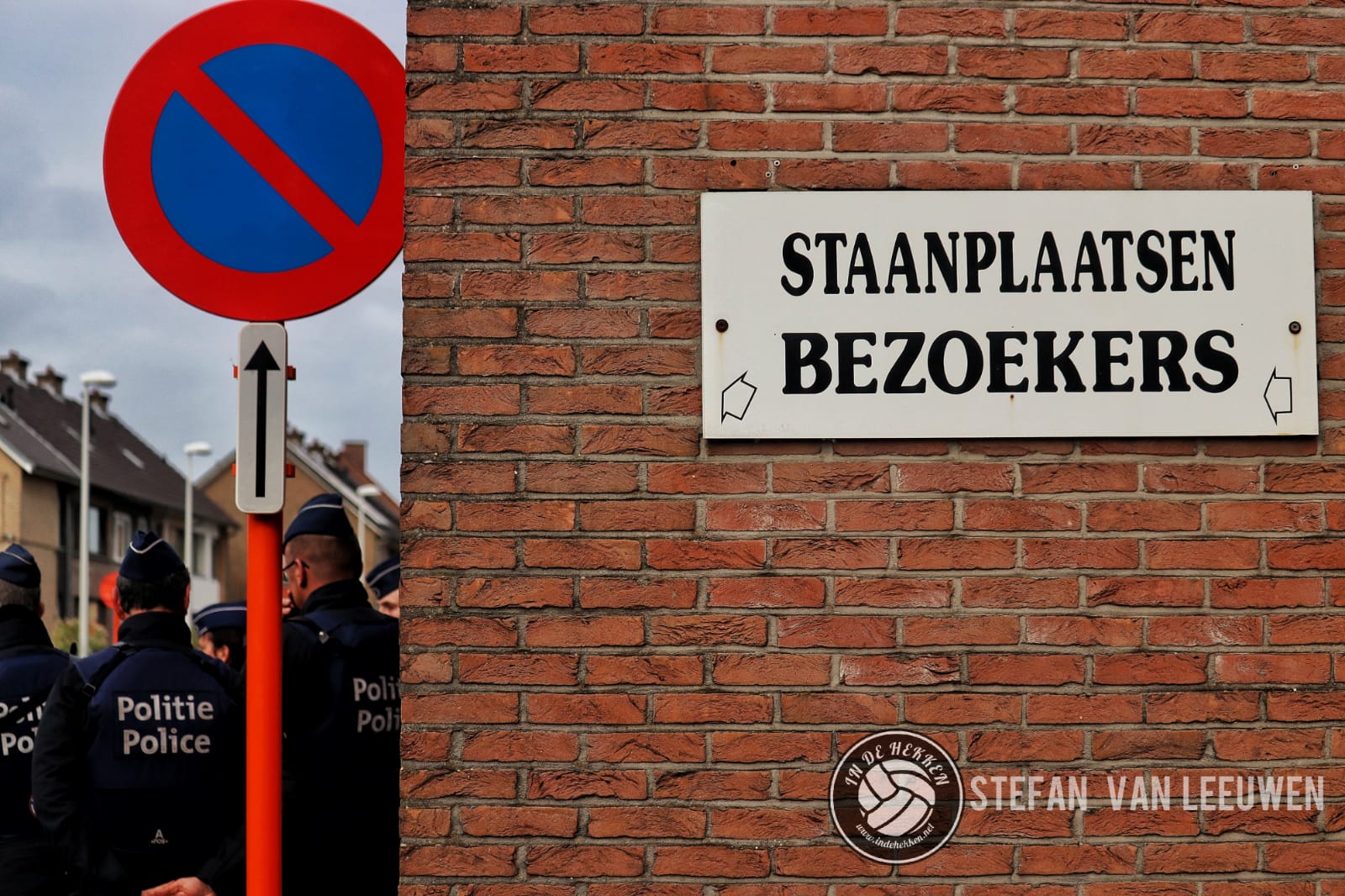 Wanneer we een biertje hebben gescoord in de verpauperde, typische Vlaamse kantine, zoeken we onze plekjes op. De gehele staantribune staat vol met zo´n 1200 supporters. Deze staantribune is een noodtribune. De overzijde is de originele hoofdtribune, maar vol zit het niet. Ik schat dat er zo´n drieduizend supporters aanwezig zijn. Ook een honderdtal supporters zijn vanuit Dessel overgekomen. Er zijn vele scenario´s mogelijk voor beide teams. Echter is er een ding zeker: wie wint, degradeert niet rechtstreeks.