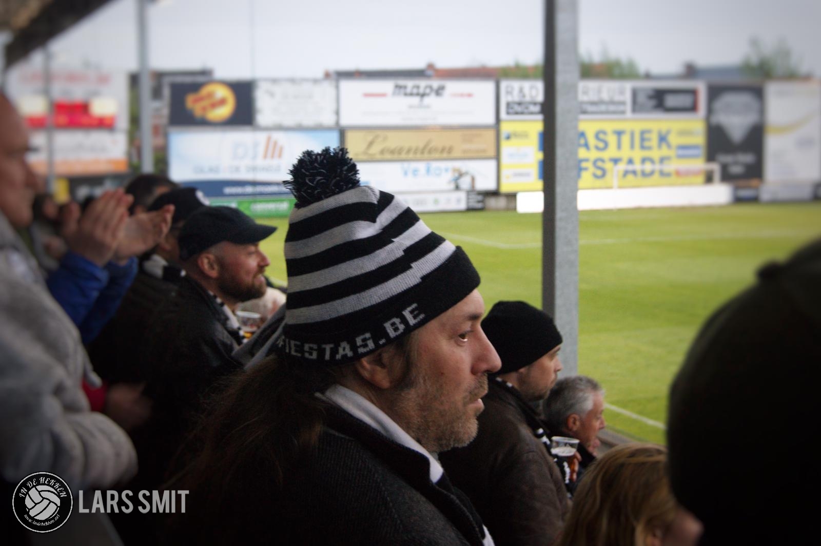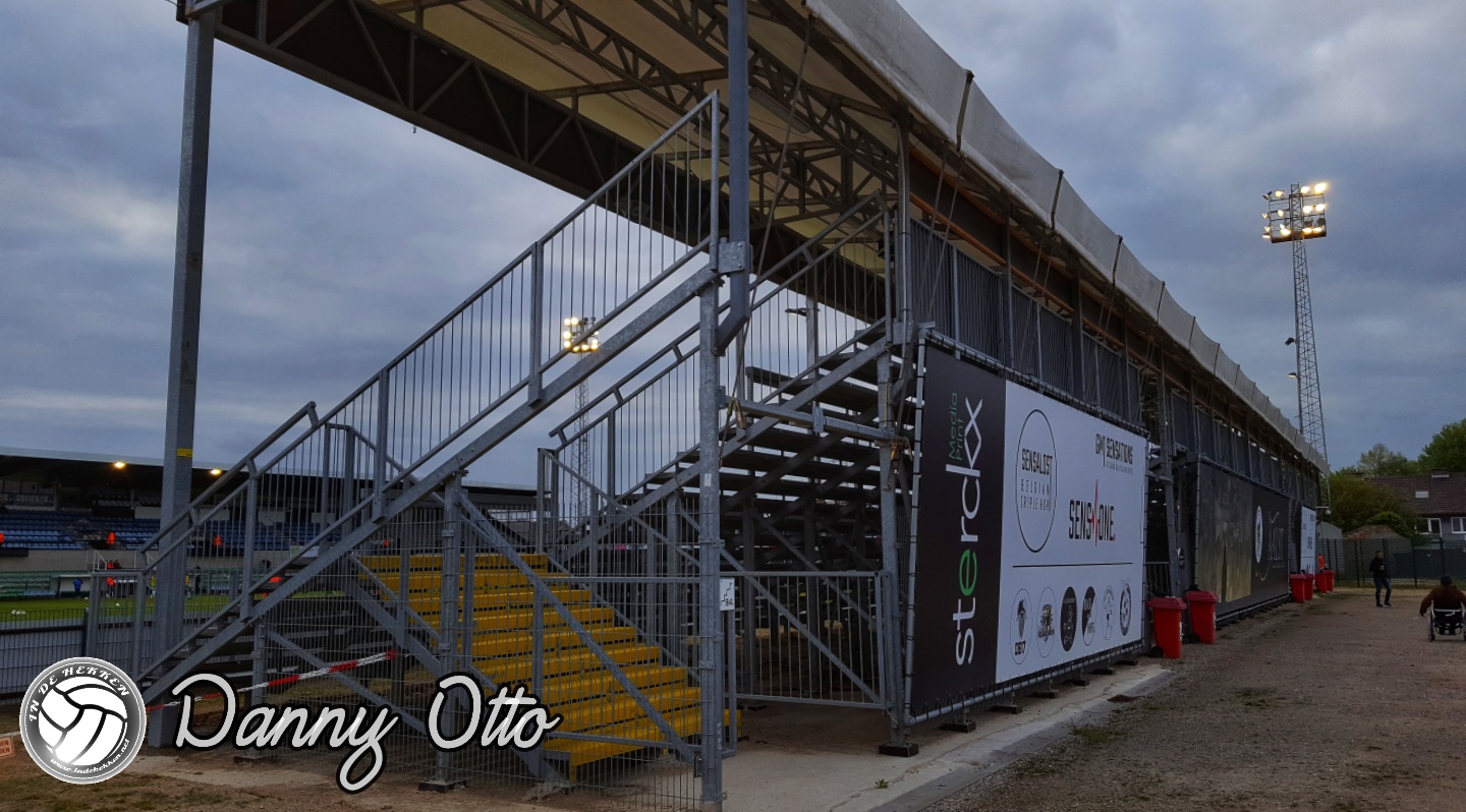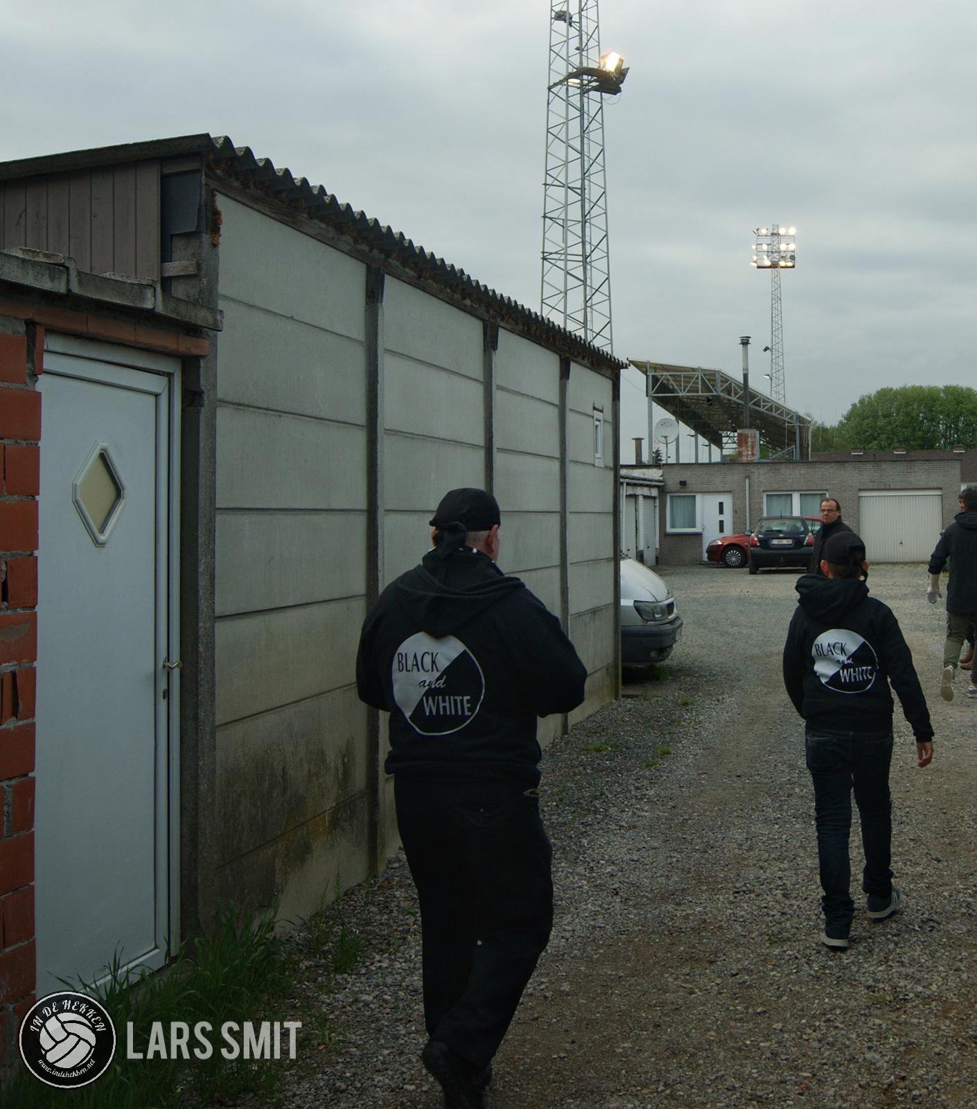 Wanneer we een biertje hebben gescoord in de verpauperde, typische Vlaamse kantine, zoeken we onze plekjes op. De gehele staantribune staat vol met zo´n 1200 supporters. Deze staantribune is een noodtribune. De overzijde is de originele hoofdtribune, maar vol zit het niet. Ik schat dat er zo´n drieduizend supporters aanwezig zijn. Ook een honderdtal supporters zijn vanuit Dessel overgekomen. Er zijn vele scenario´s mogelijk voor beide teams. Echter is er een ding zeker: wie wint, degradeert niet rechtstreeks.