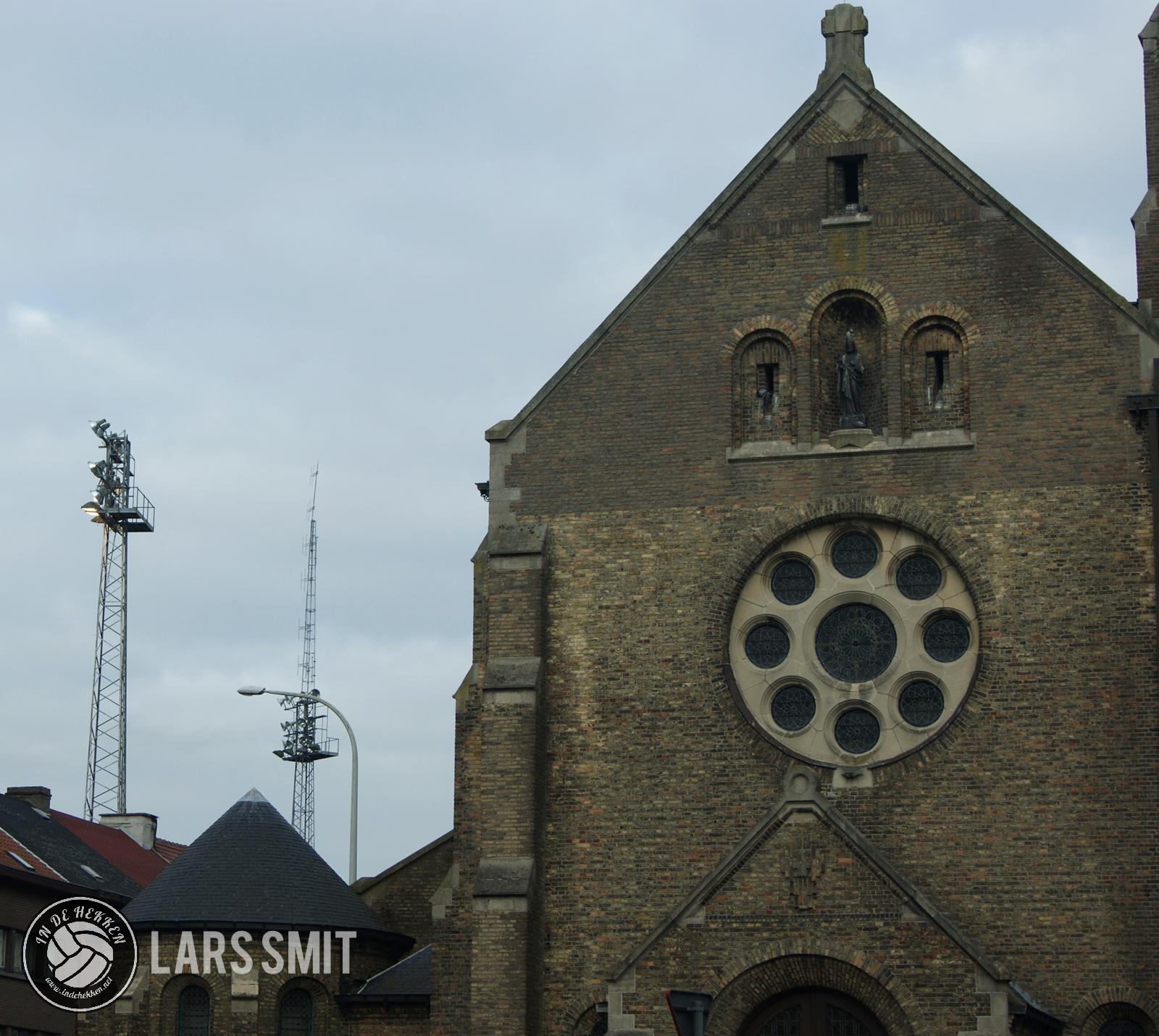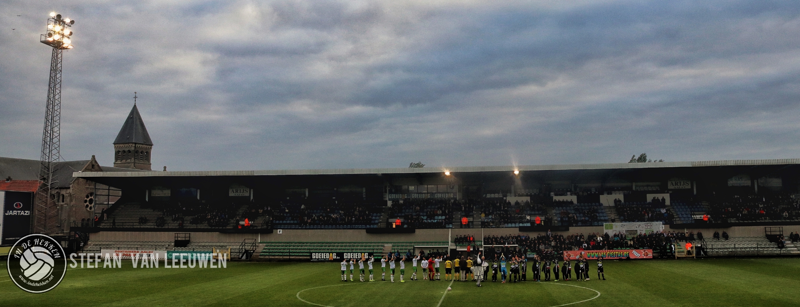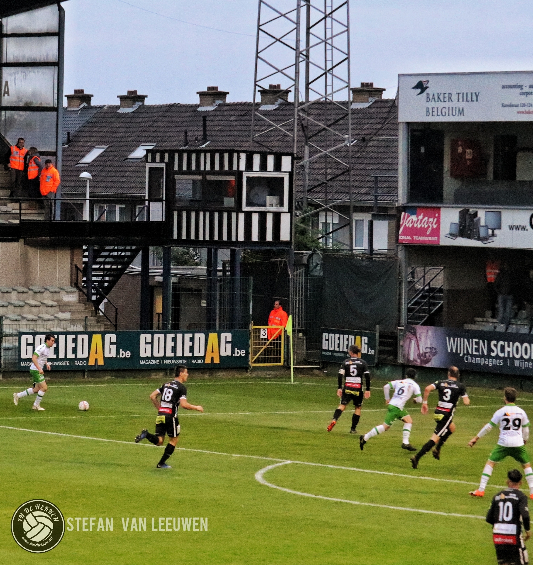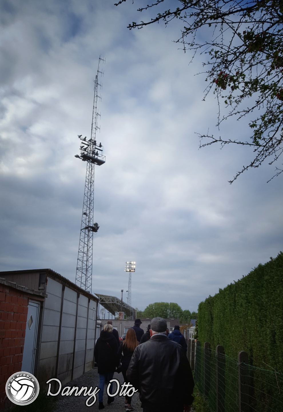 Wanneer we een biertje hebben gescoord in de verpauperde, typische Vlaamse kantine, zoeken we onze plekjes op. De gehele staantribune staat vol met zo´n 1200 supporters. Deze staantribune is een noodtribune. De overzijde is de originele hoofdtribune, maar vol zit het niet. Ik schat dat er zo´n drieduizend supporters aanwezig zijn. Ook een honderdtal supporters zijn vanuit Dessel overgekomen. Er zijn vele scenario´s mogelijk voor beide teams. Echter is er een ding zeker: wie wint, degradeert niet rechtstreeks.