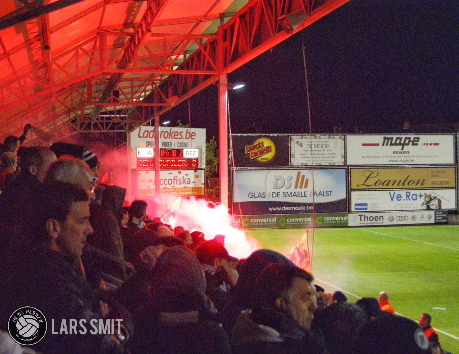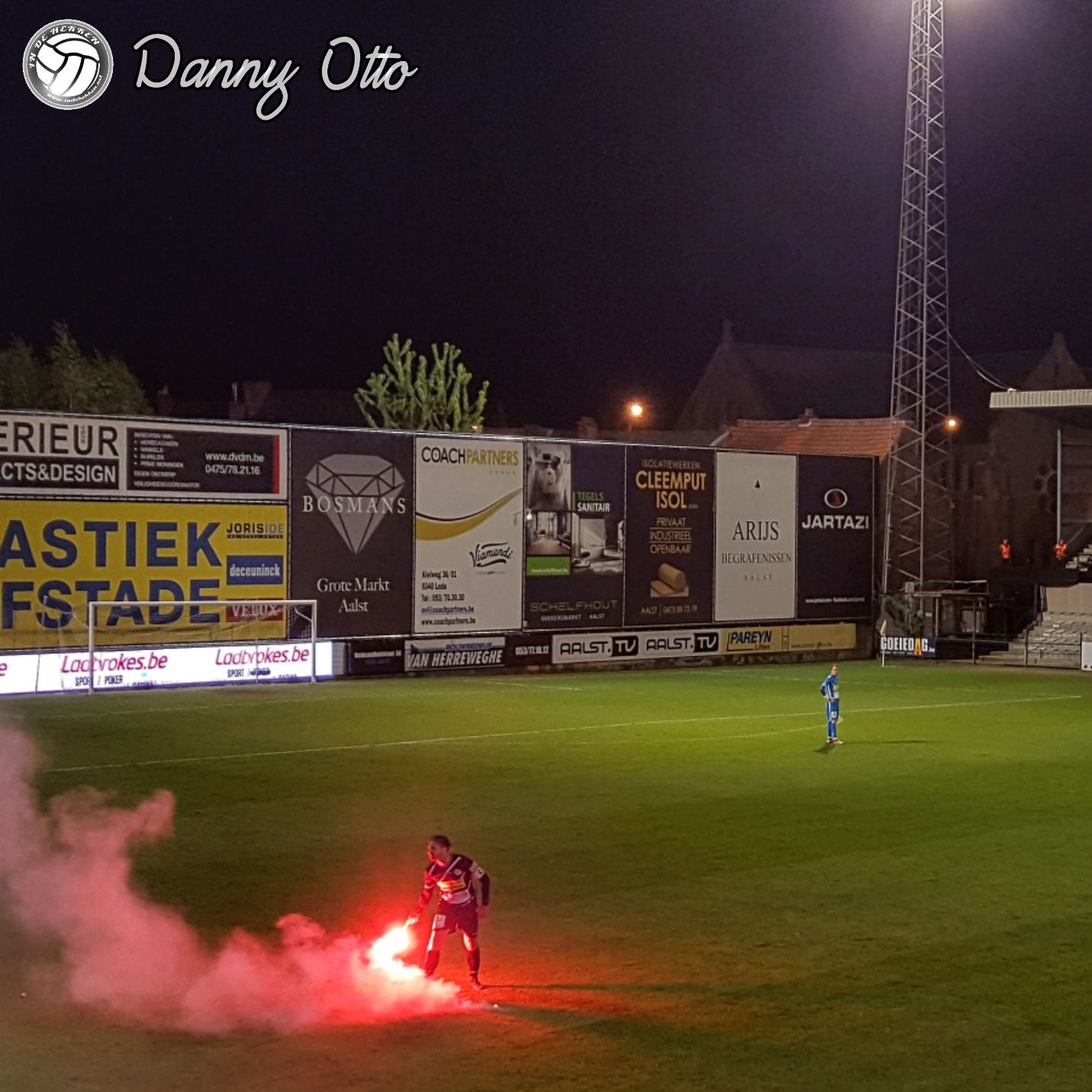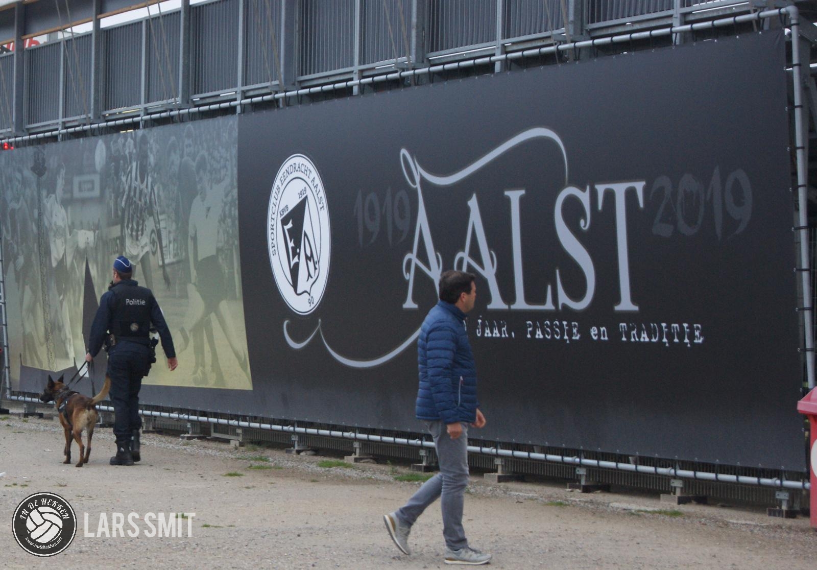 Als we het stadion naderen valt onze mond open van verbazing. Het stadion ligt midden in een woonwijk. Direct naast het stadion staan vele hamburgertenten. De fanatieke jongens van Aalst drinken massaal in een van de kroegen rondom het stadion. Het voelt Engels aan. We kopen een kaartje voor de staantribune aan de lange zijde van het veld. Als we naar het vak lopen, komen we een gigantische hoeveelheid politie tegen. Het is duidelijk: De Eendracht Aalst mag vandaag niet degraderen.