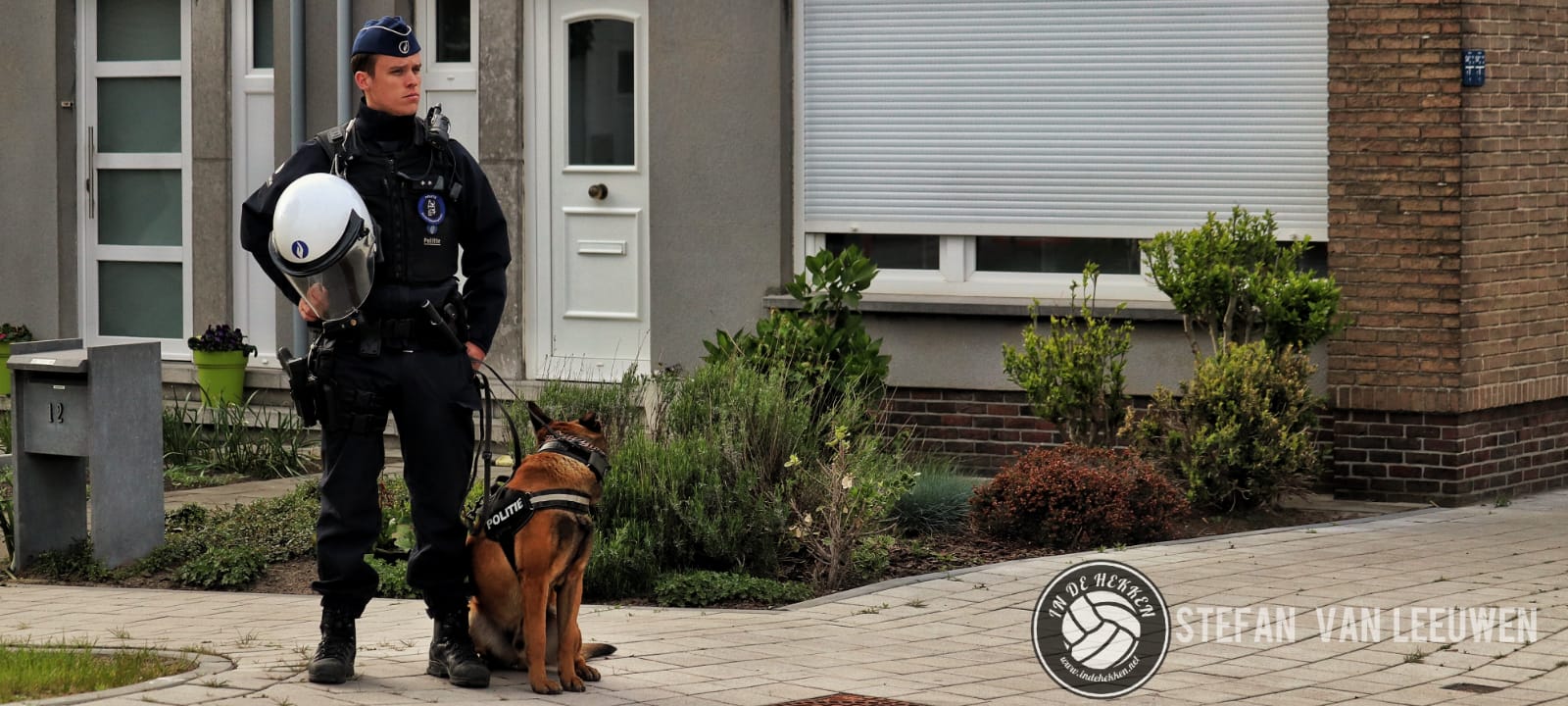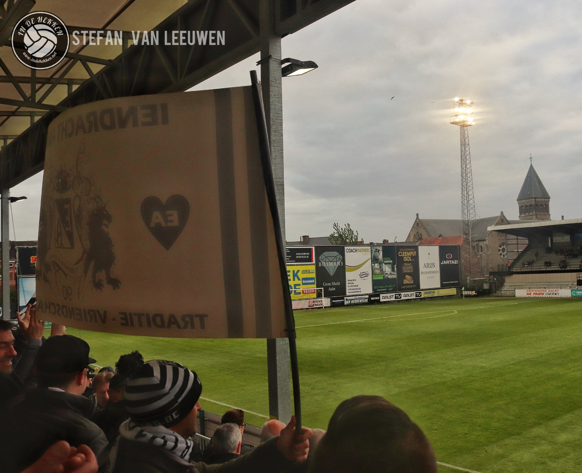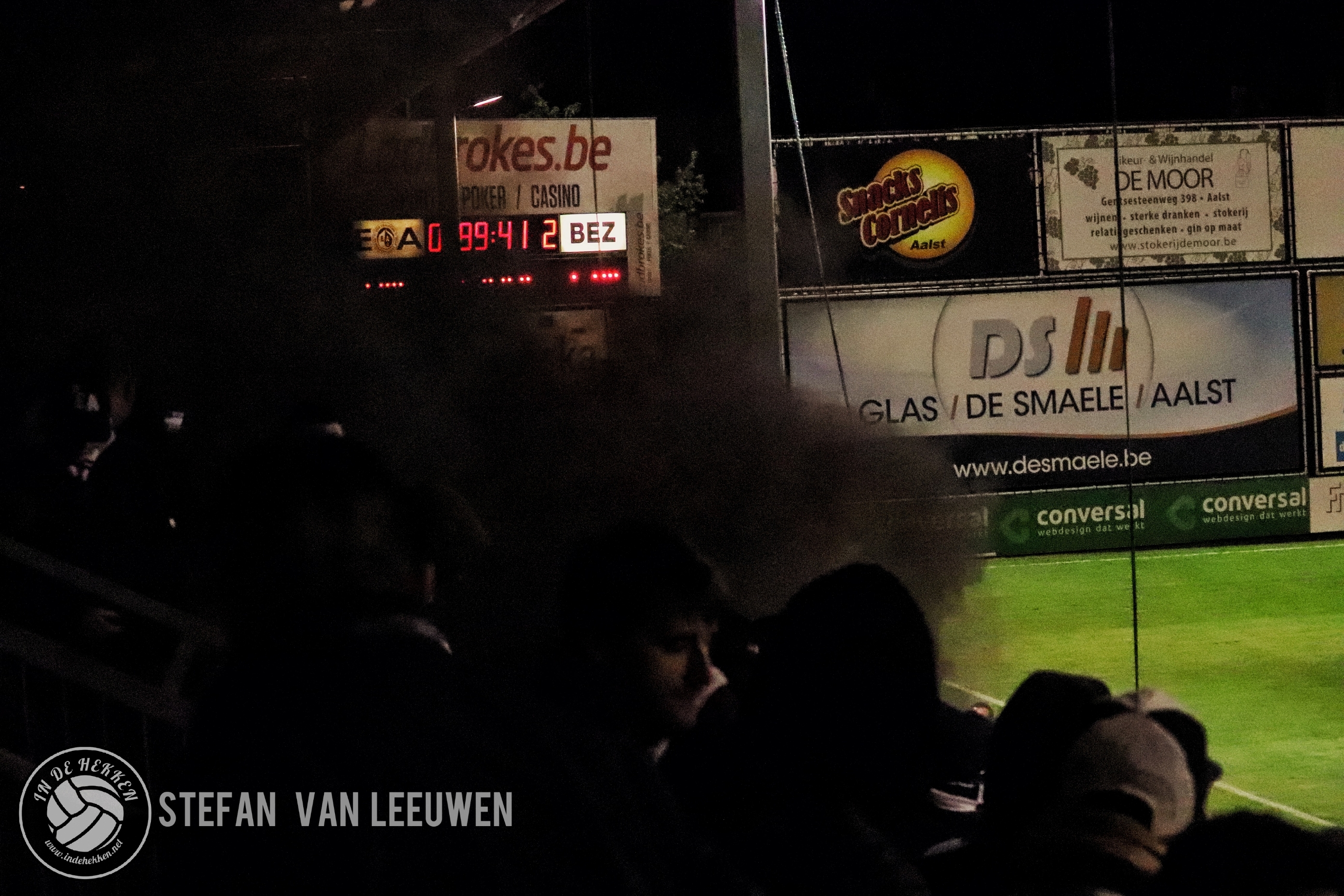 Als we het stadion naderen valt onze mond open van verbazing. Het stadion ligt midden in een woonwijk. Direct naast het stadion staan vele hamburgertenten. De fanatieke jongens van Aalst drinken massaal in een van de kroegen rondom het stadion. Het voelt Engels aan. We kopen een kaartje voor de staantribune aan de lange zijde van het veld. Als we naar het vak lopen, komen we een gigantische hoeveelheid politie tegen. Het is duidelijk: De Eendracht Aalst mag vandaag niet degraderen.