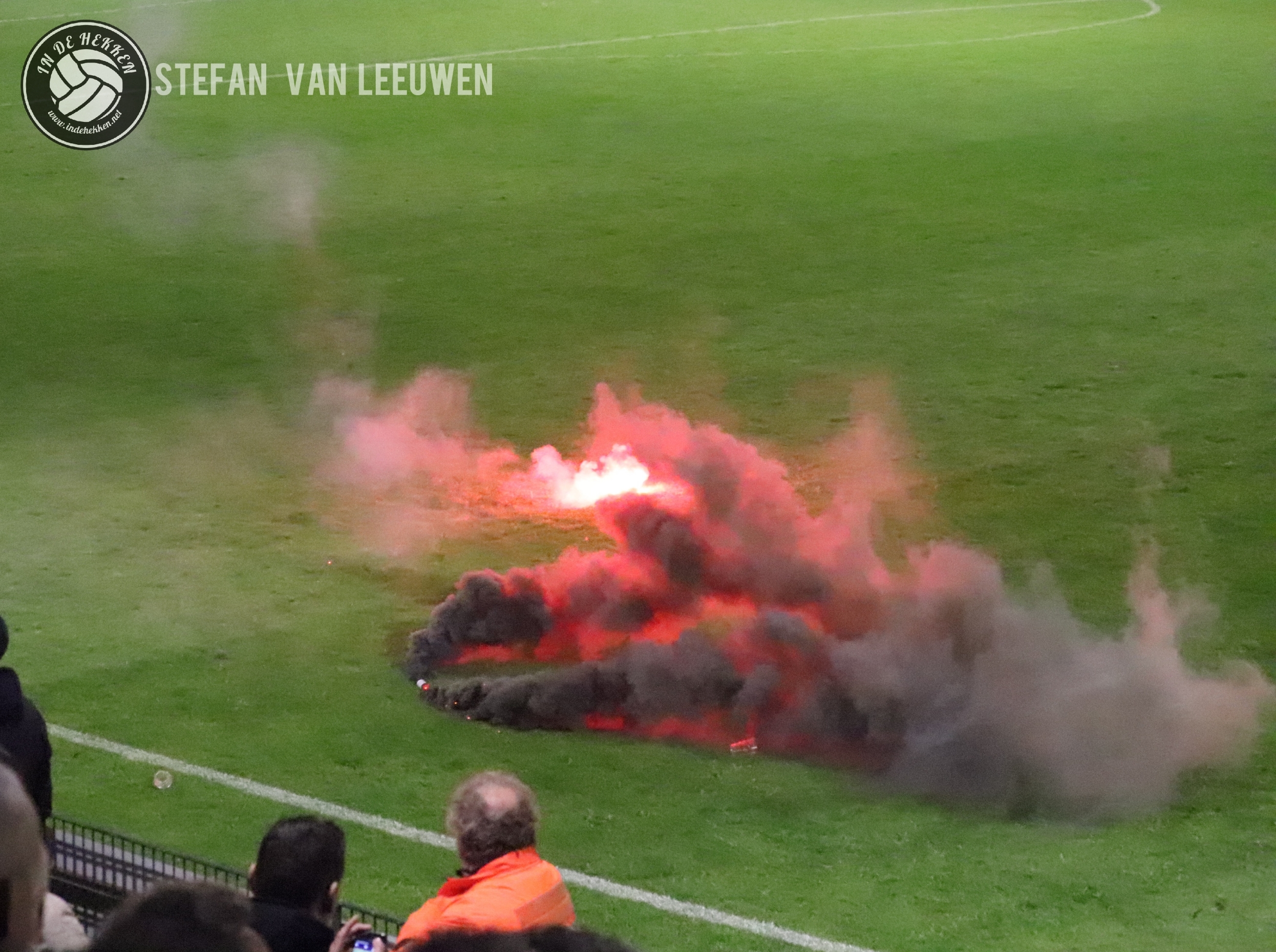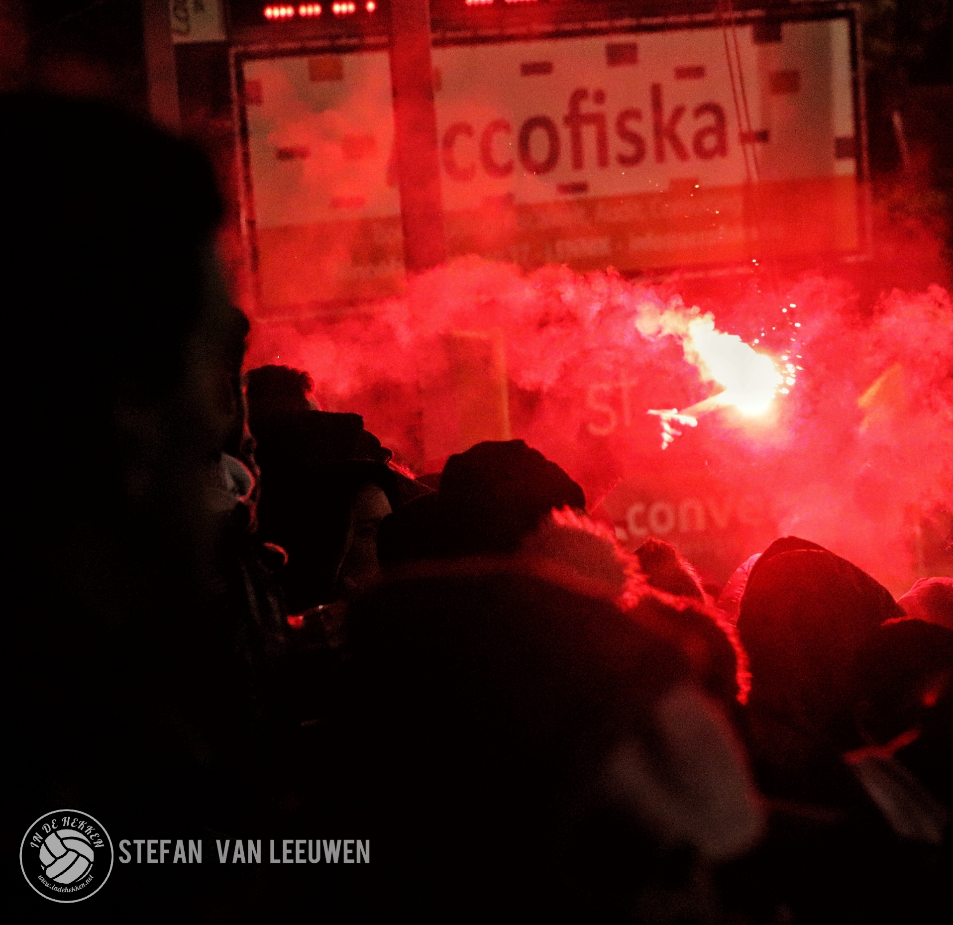 Stamnummer 90 gaat het vandaag niet redden. In de 80e minuut valt de 0-2 uit een penalty en vanaf dat moment is het chaos. Vuurwerk vliegt het veld op. Supporters staan op de boarding. Al die tijd hebben ze hun club gesteund, maar nu komt de emotie eruit. Opvallend is dat niemand het vuurwerk op het veld afkeurt, behalve de stadionspeaker. Hij schoffeert keihard de fanatieke, hondstrouwe aanhang: ´´Je club steunen doe je in goede en slechte tijden.´´