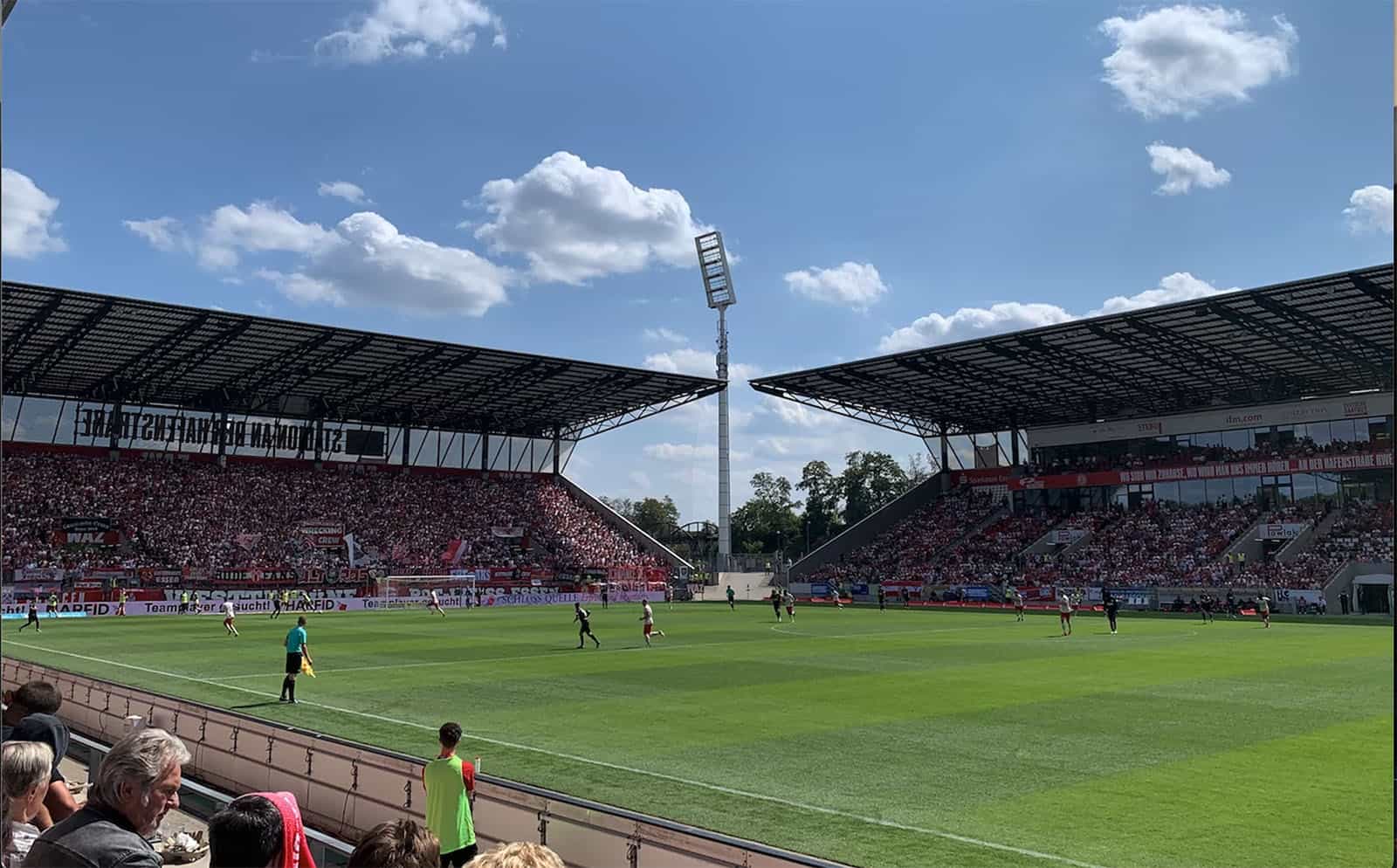 Een kwartier voor de aftrap lopen we het stadion binnen. De harde kern laat weten dat ze er zijn, de honderd meegereisde fans van Elversberg doen het nog wat rustiger aan. Zonnig weer, twee clubs die terug zijn op profniveau en het publiek dat er zin in heeft: alle ingrediënten zijn daar voor een mooie voetbalmiddag.