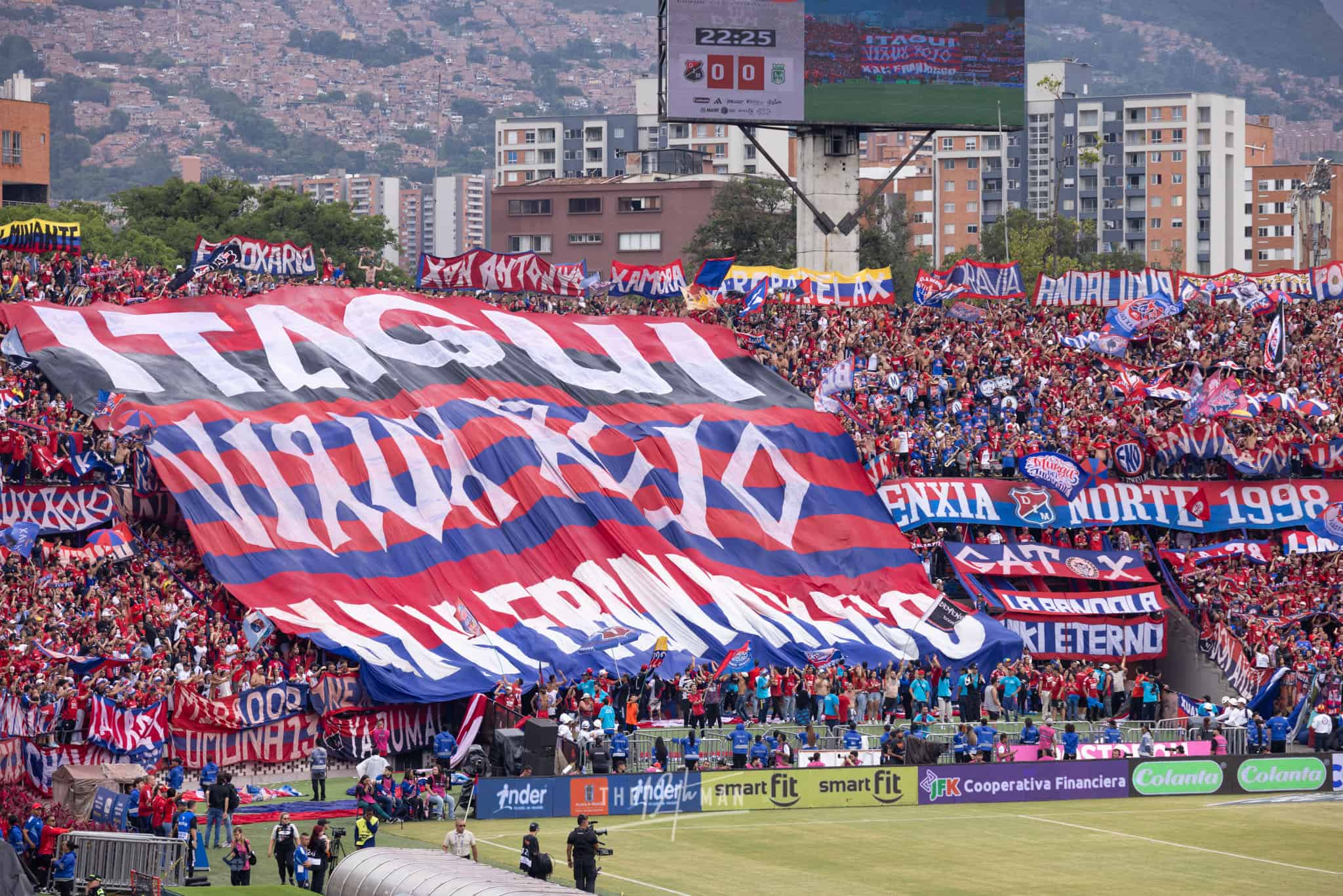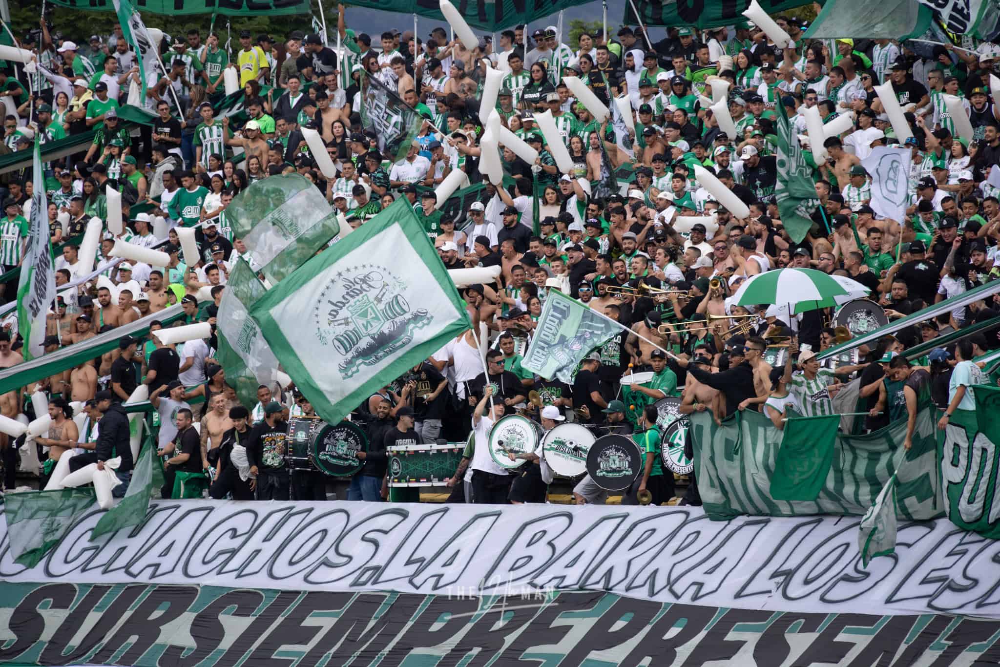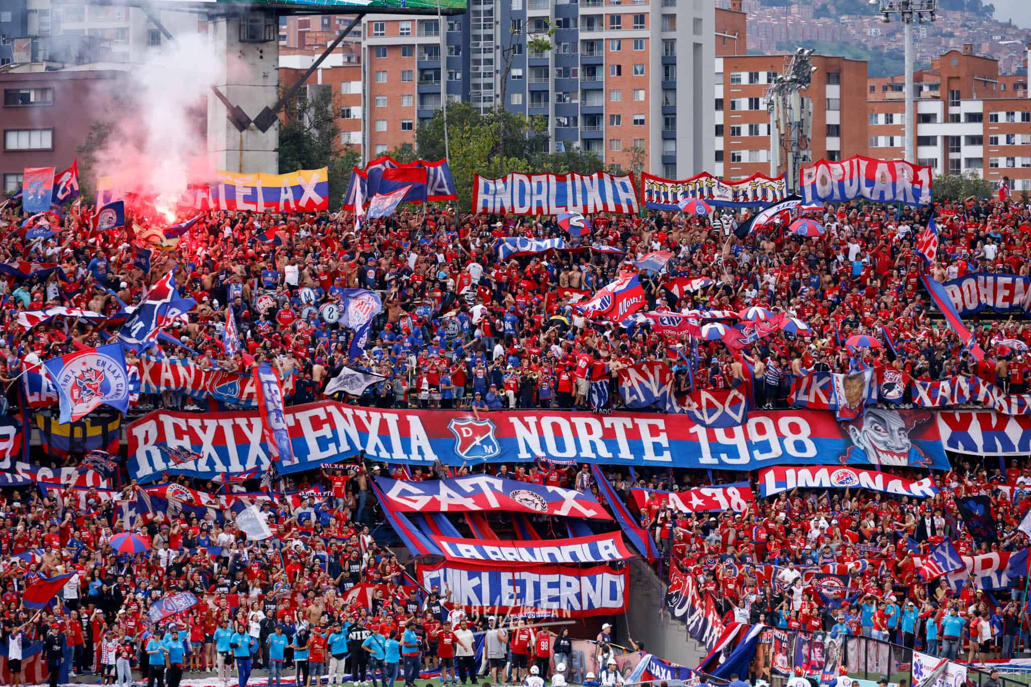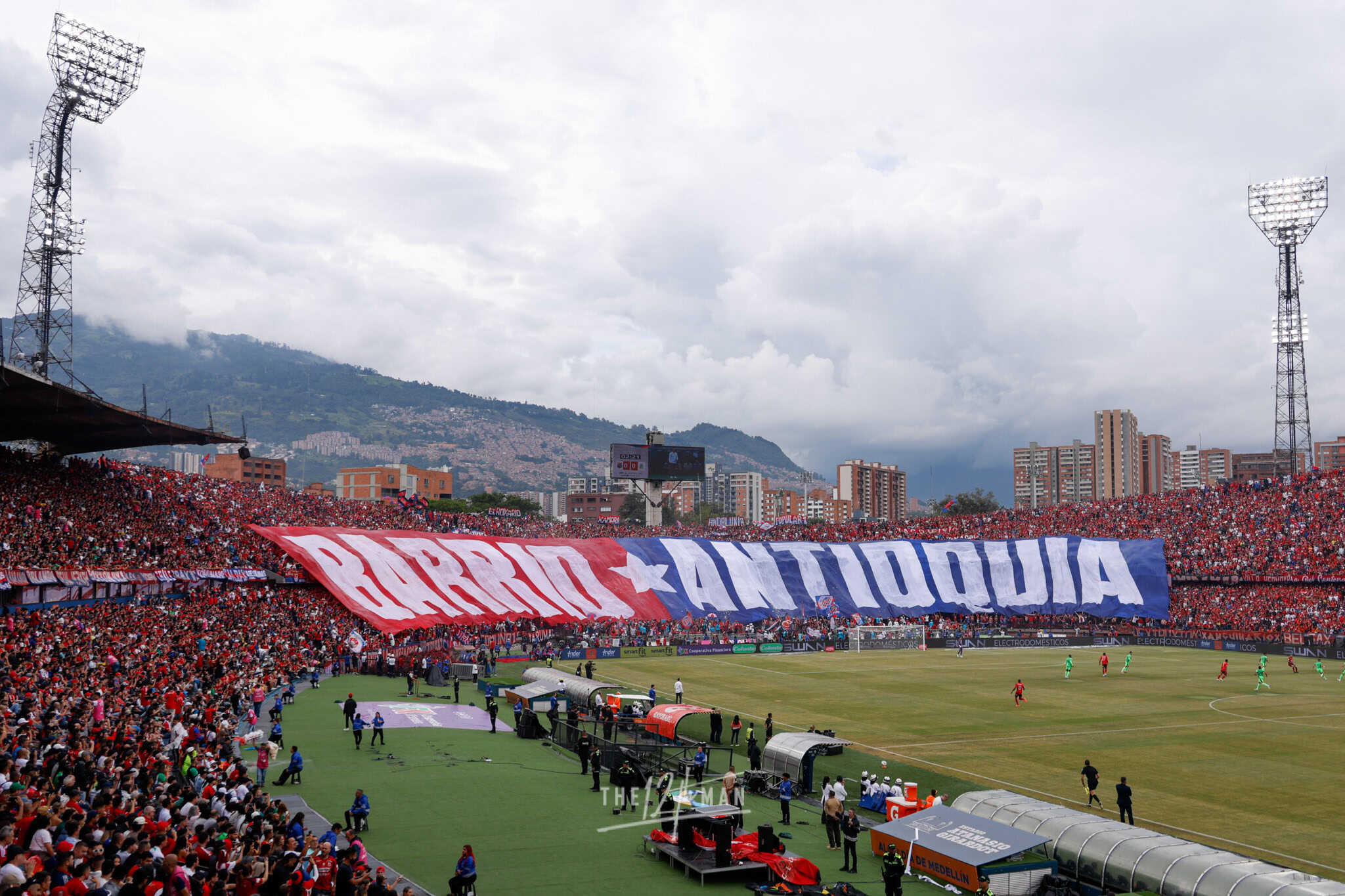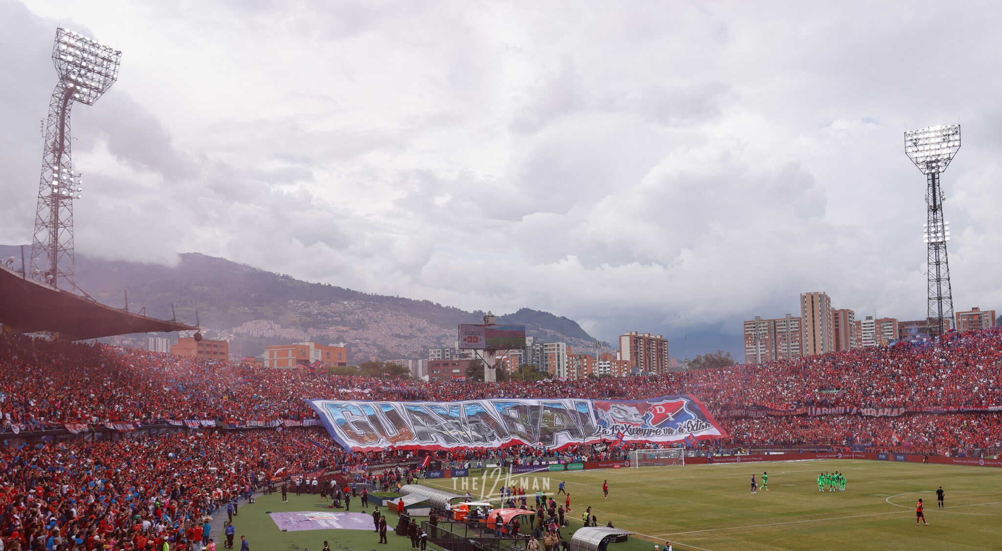 Een uitgebreide sfeeractie is nog zachtjes uitgedrukt. Als de spelers het veld betreden een grote choreo over de twee lange zijden en de harde kern op de noordtribune. Ze vormen het logo van de club en “DIM mi vida” oftewel DIM mijn leven. DIM is de afkorting van Deportivo Independiente Medellín. Vlak daarna volgt rode en blauwe rook.