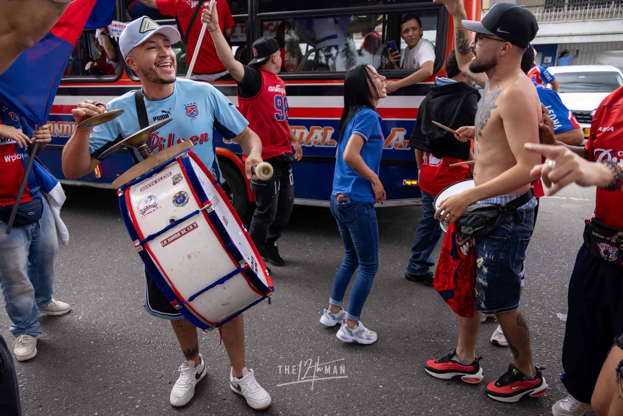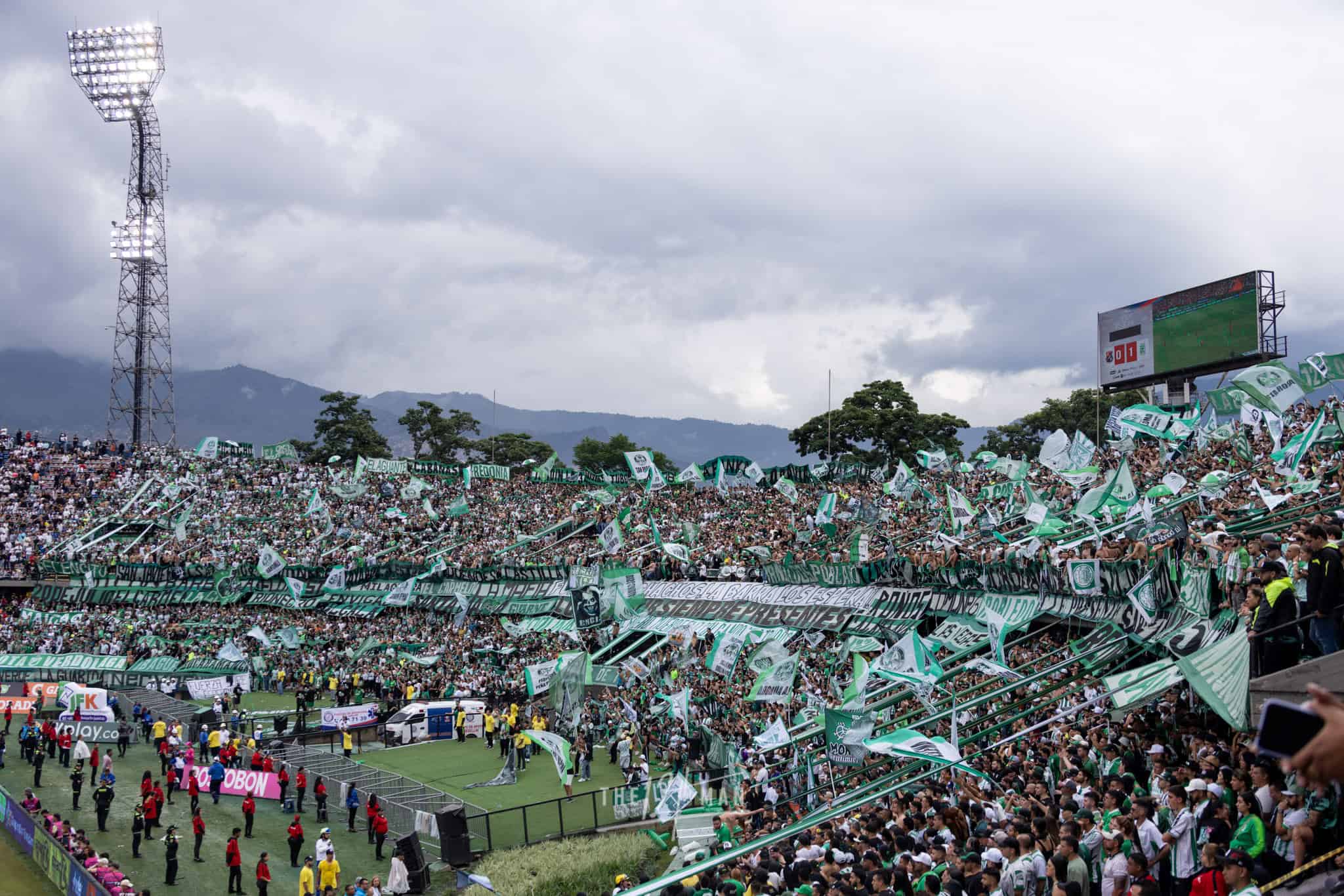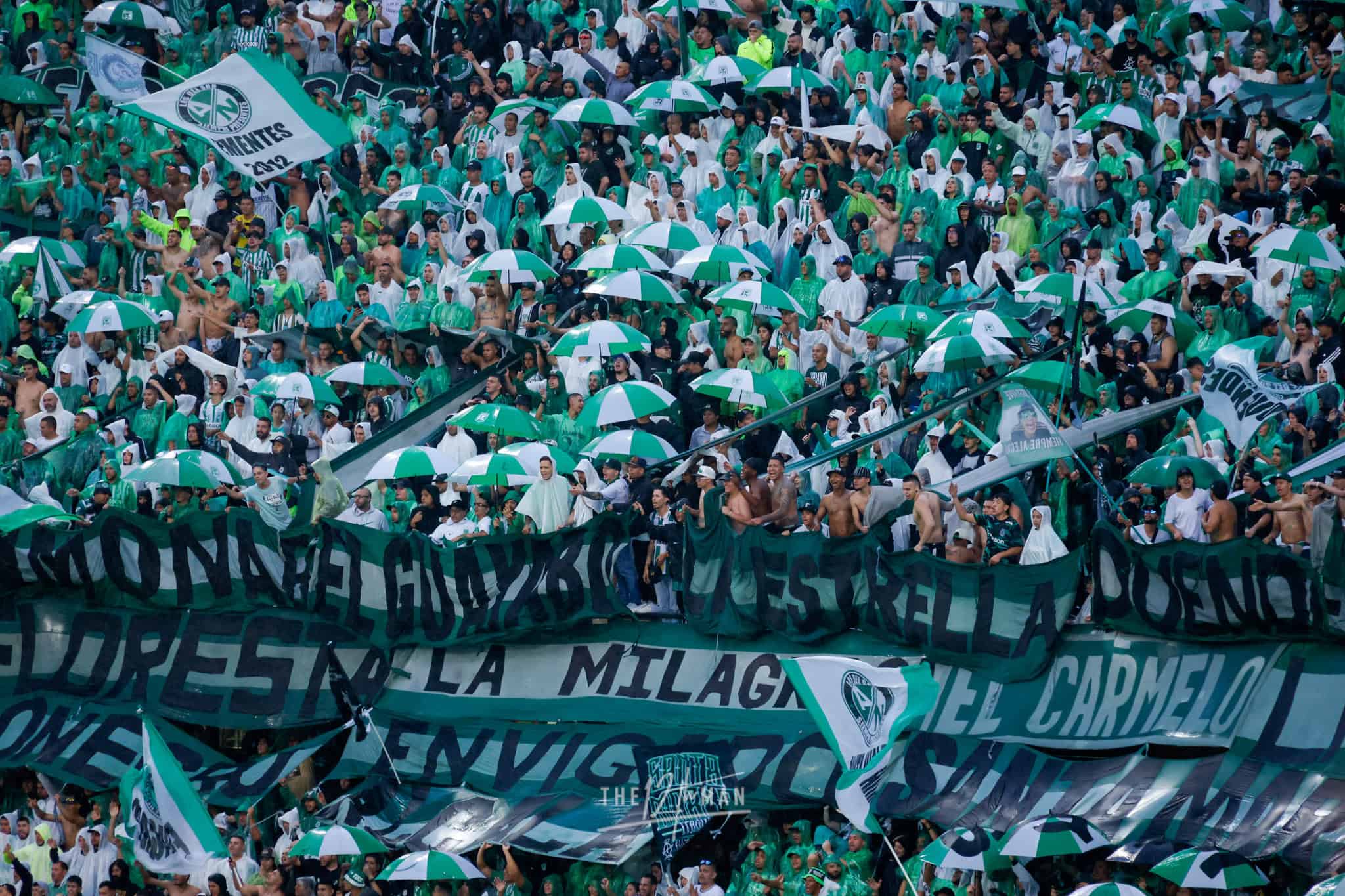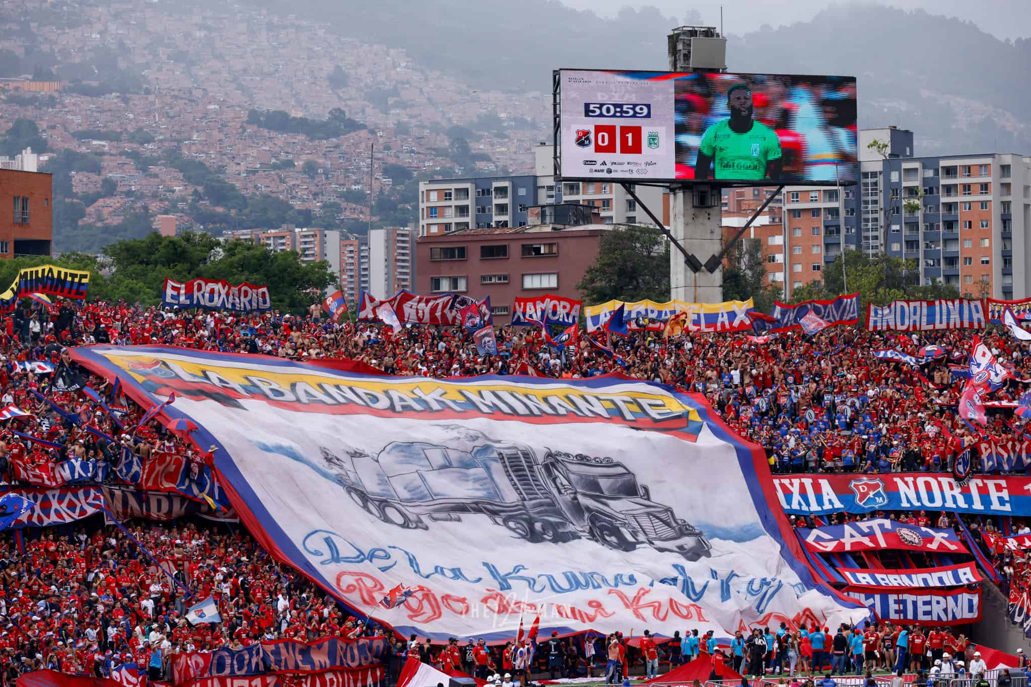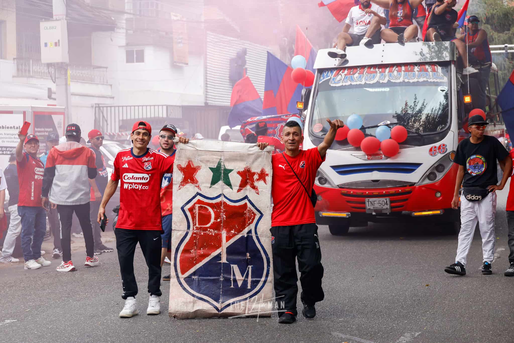 Een uitgebreide sfeeractie is nog zachtjes uitgedrukt. Als de spelers het veld betreden een grote choreo over de twee lange zijden en de harde kern op de noordtribune. Ze vormen het logo van de club en “DIM mi vida” oftewel DIM mijn leven. DIM is de afkorting van Deportivo Independiente Medellín. Vlak daarna volgt rode en blauwe rook.