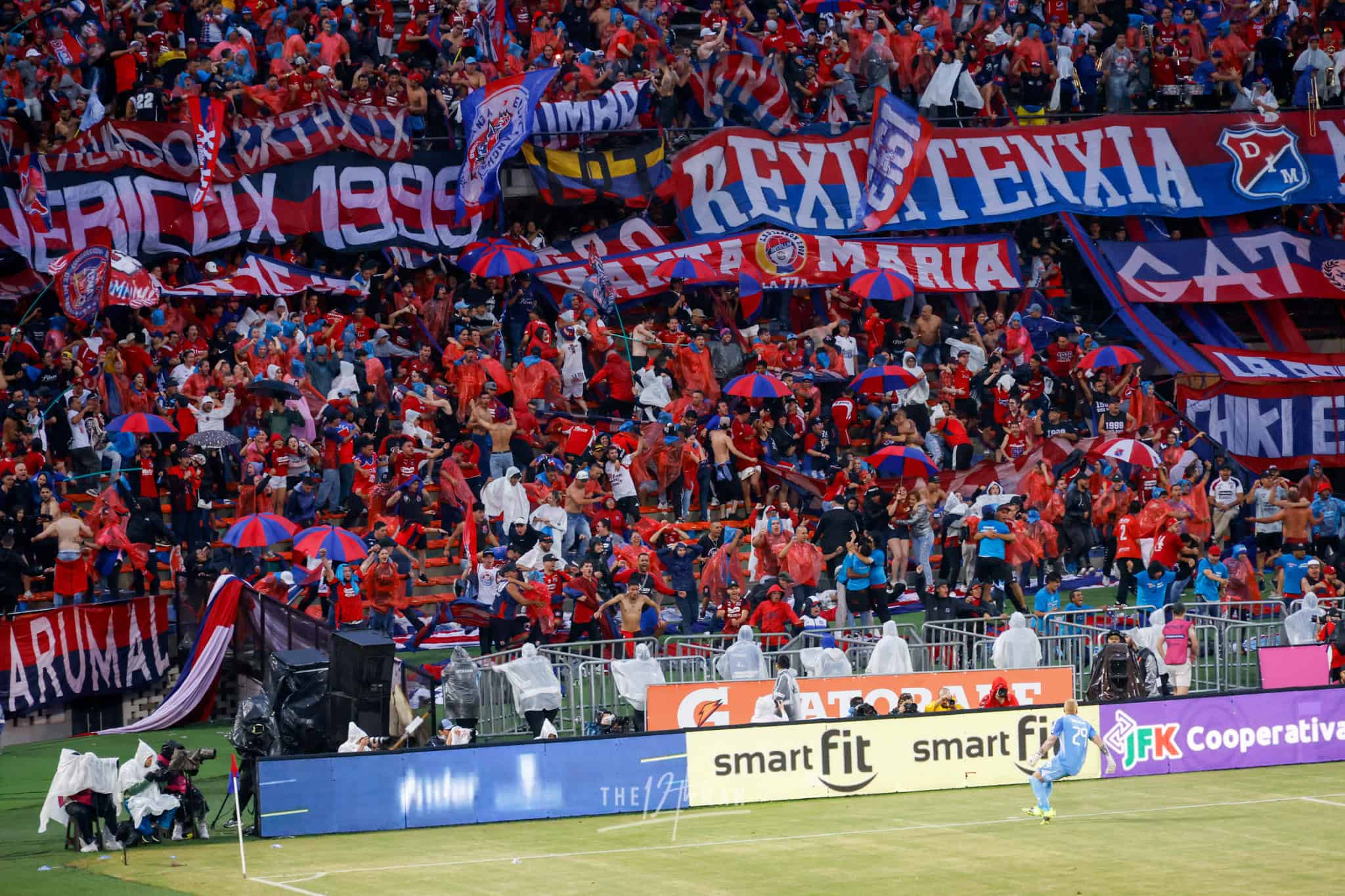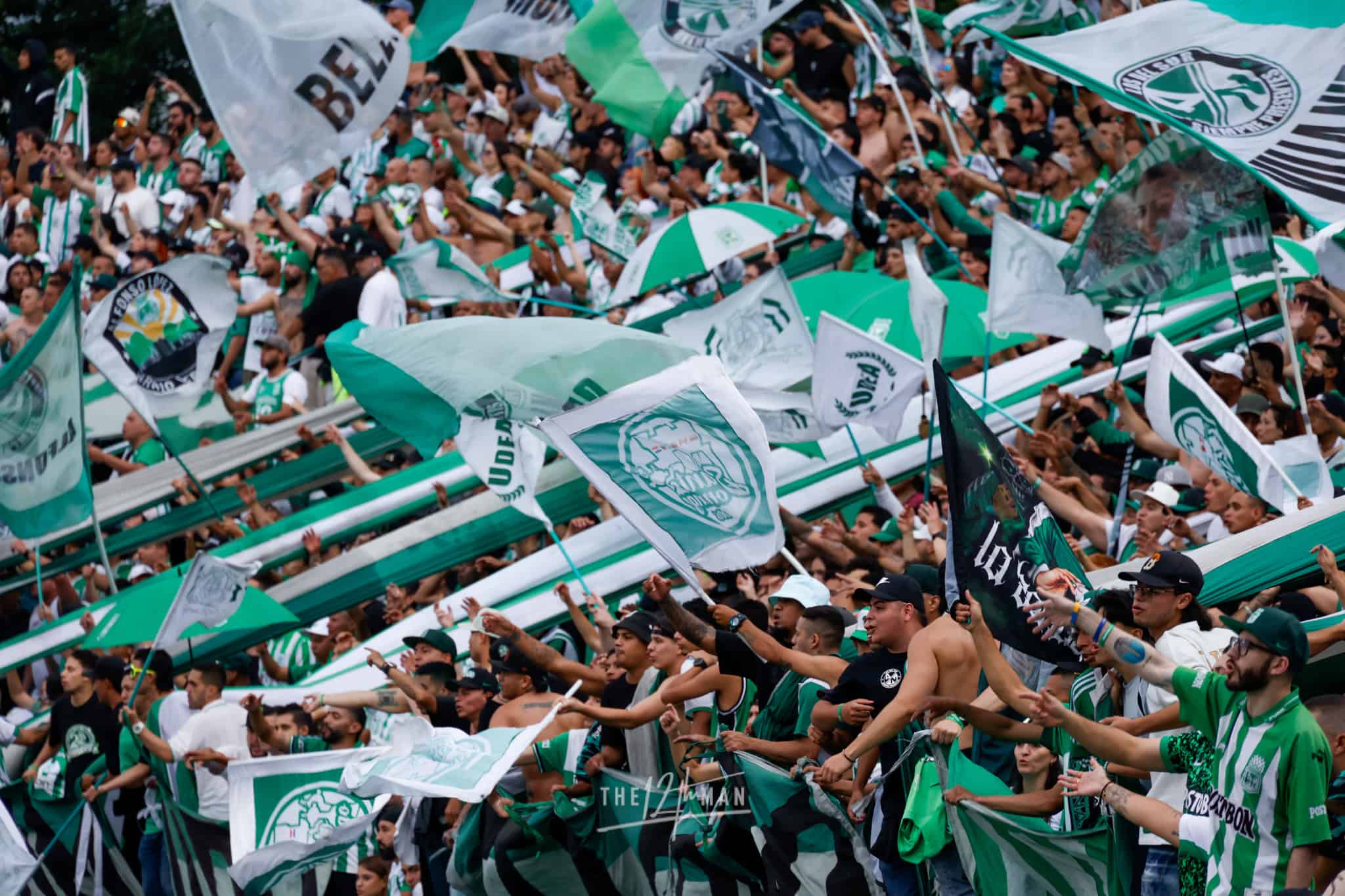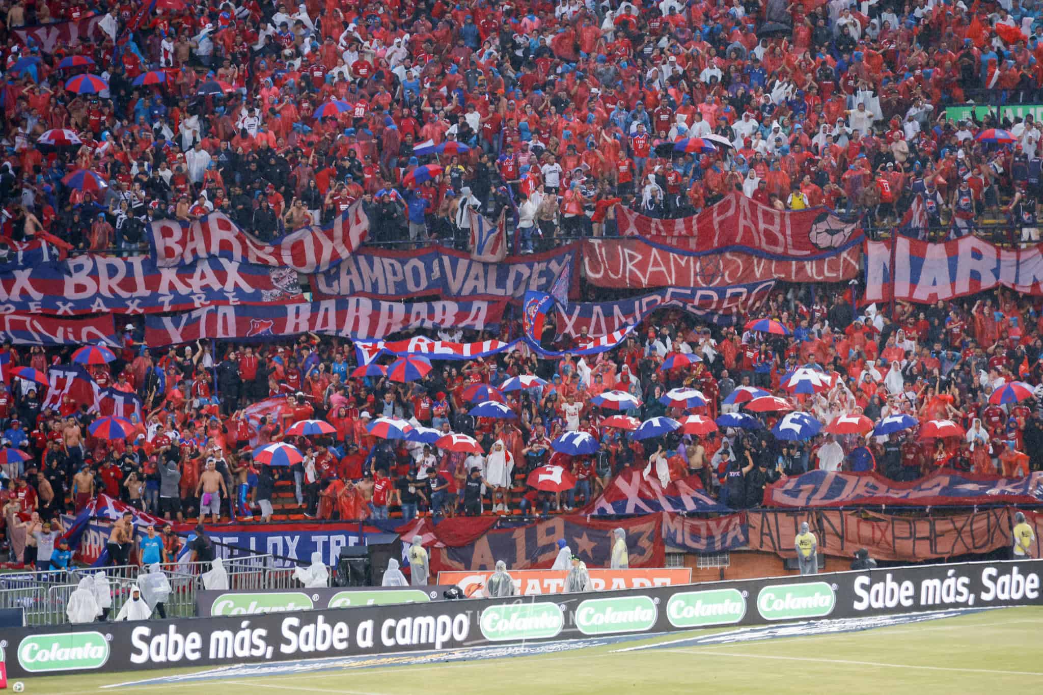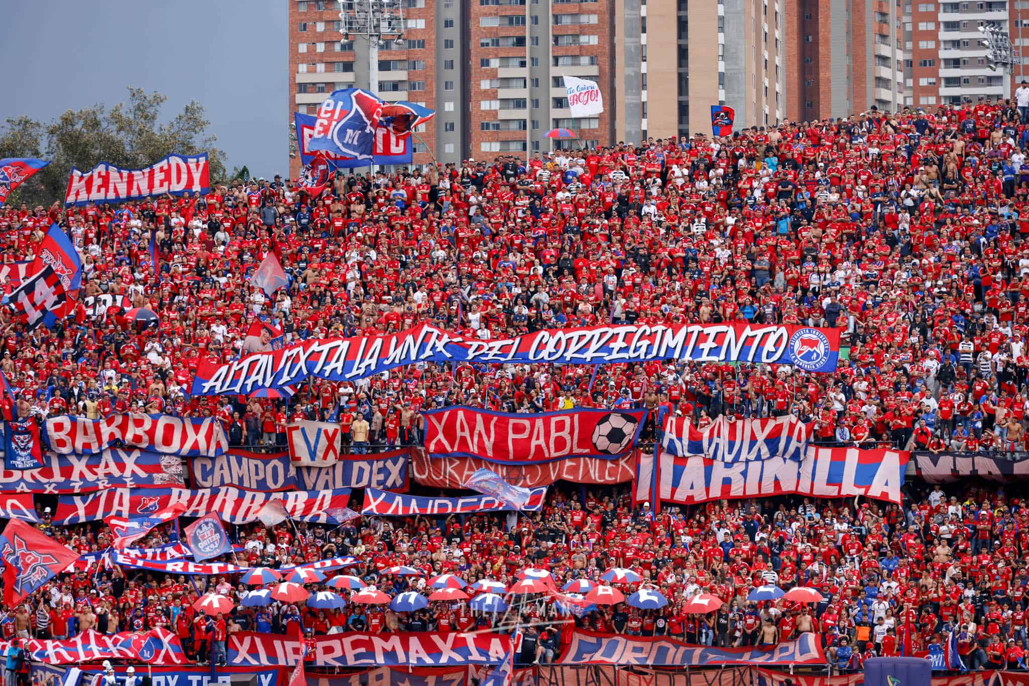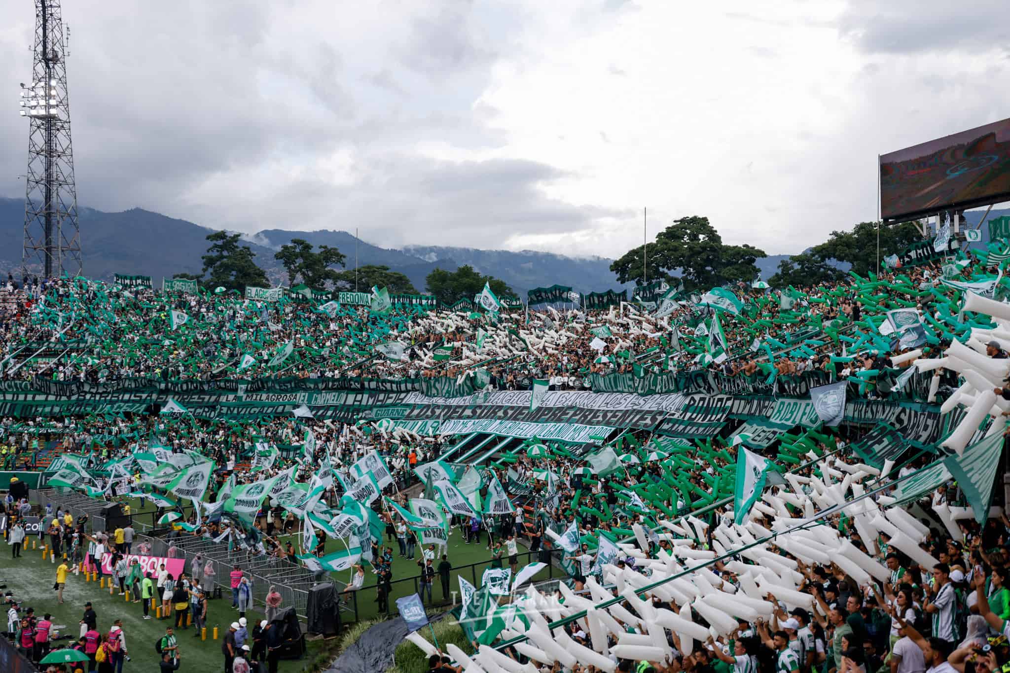 Een uitgebreide sfeeractie is nog zachtjes uitgedrukt. Als de spelers het veld betreden een grote choreo over de twee lange zijden en de harde kern op de noordtribune. Ze vormen het logo van de club en “DIM mi vida” oftewel DIM mijn leven. DIM is de afkorting van Deportivo Independiente Medellín. Vlak daarna volgt rode en blauwe rook.