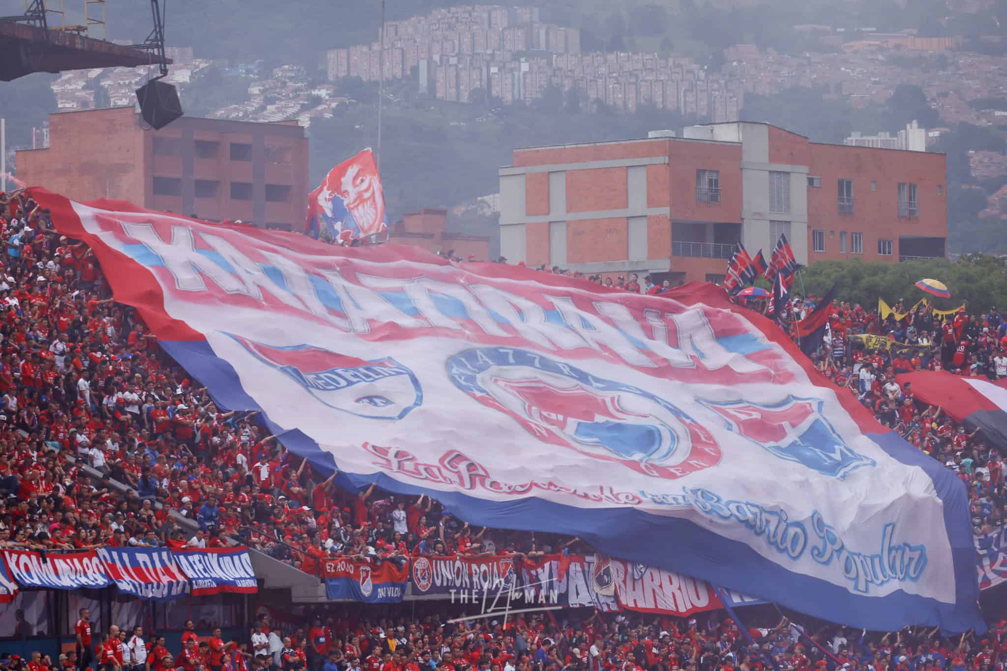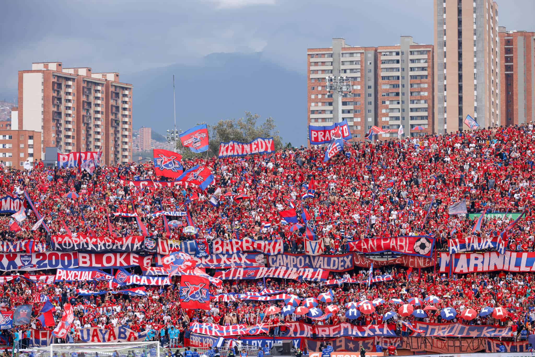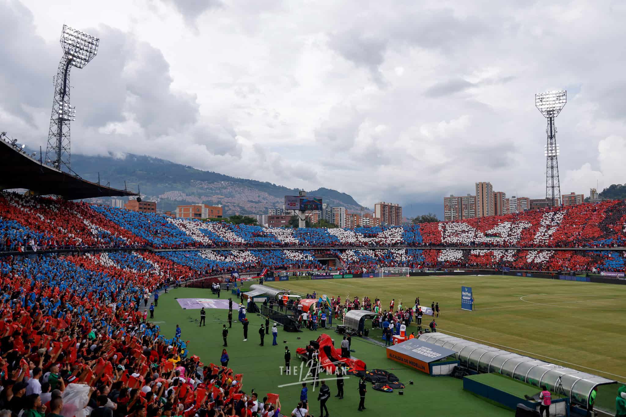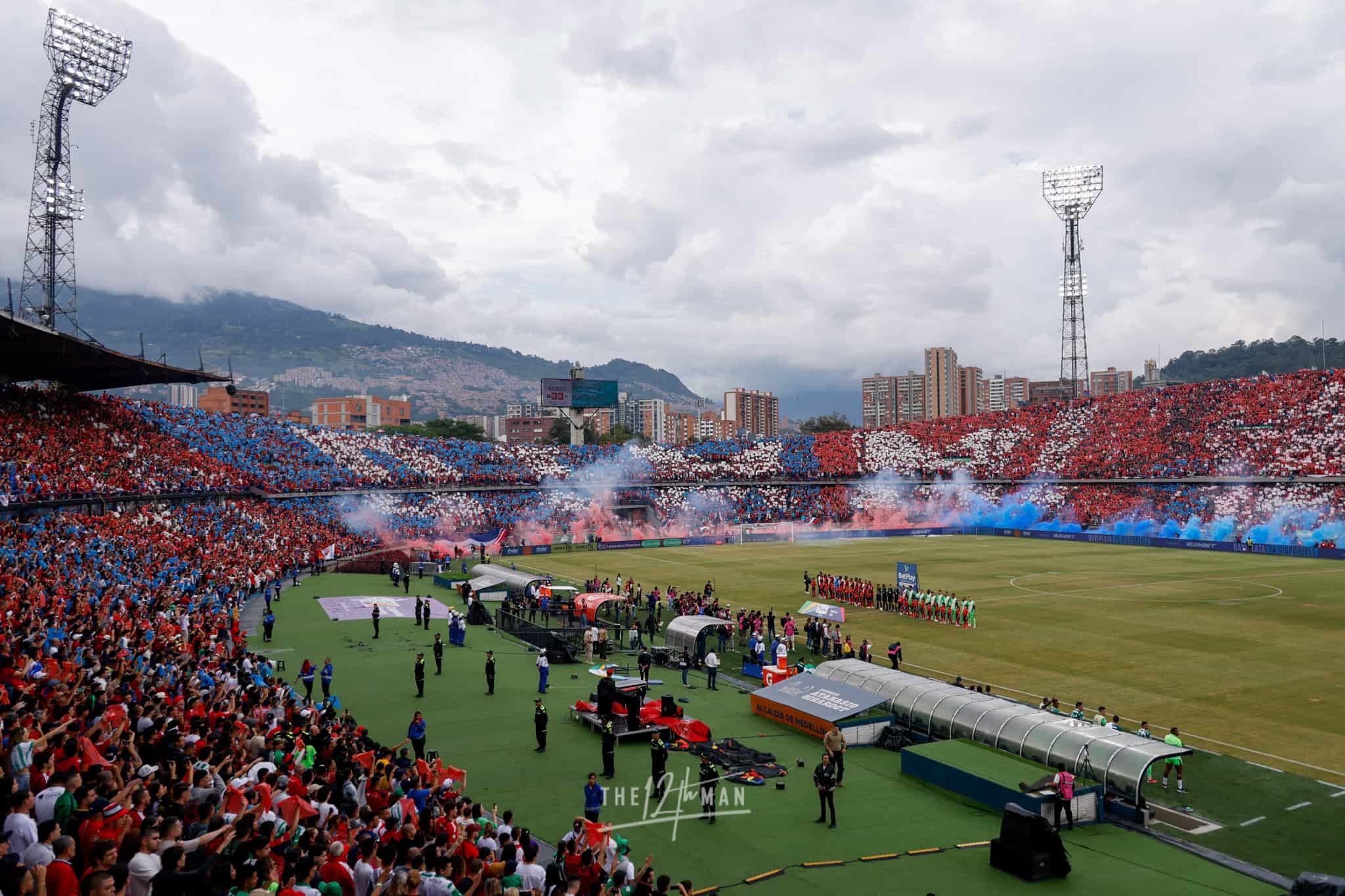 Het is al compleet volle bak. Duizenden supporters op straat, dampende barbecues, gezang en vuurwerk dat overal afgaat. Het is een zee van rood en blauw, de kleuren van Independiente Medellin, de thuisploeg vandaag. Her en der zie je wat groen-wit er tussendoor lopen. De kleuren van aartsrivaal Atletico Nacional, de meest succesvolle club van Colombia.