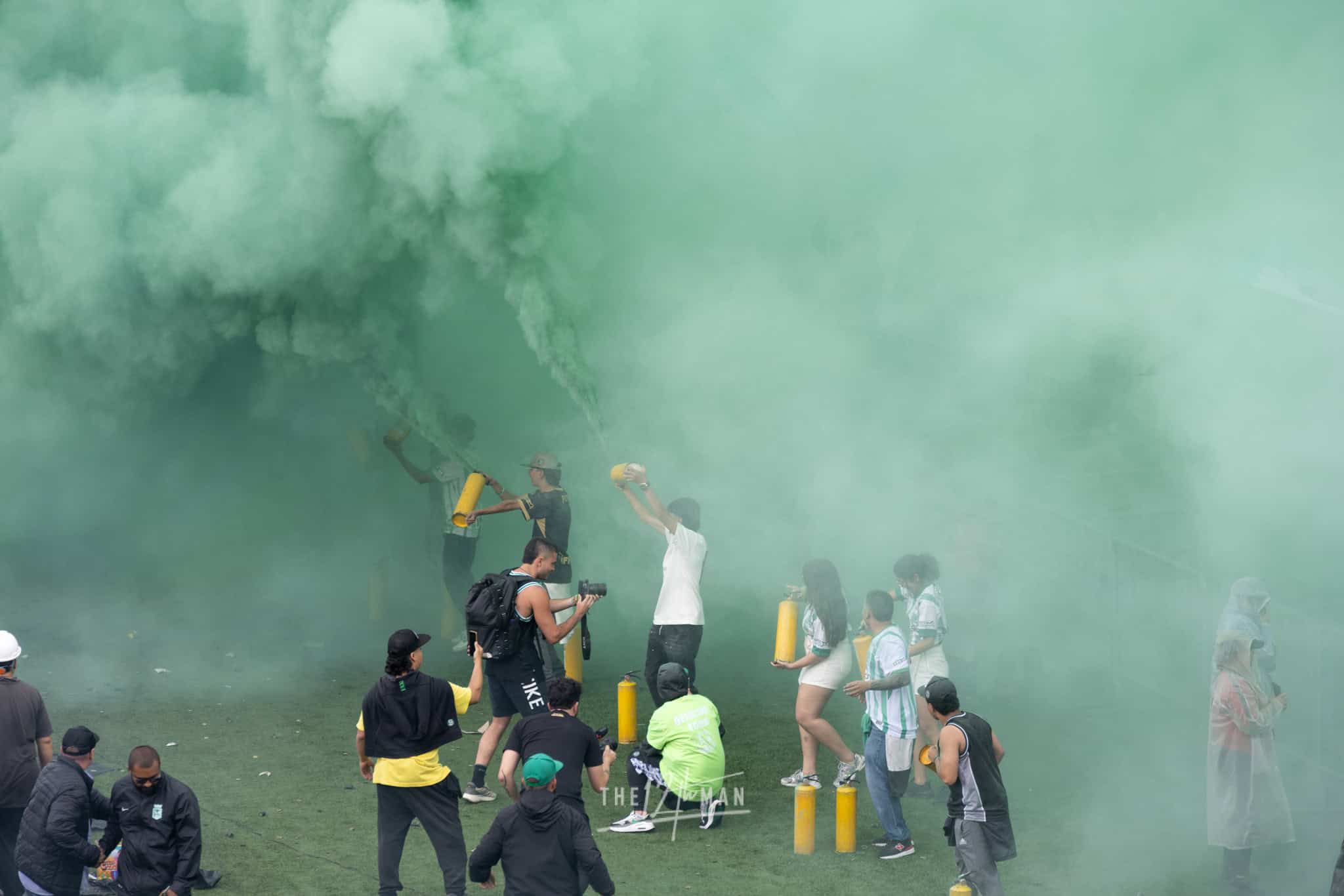 Ondertussen is het uitvak gevuld met groene en witte opblaastubes. Voor het vak worden groene rookpluimen de lucht in geschoten. Ook staan er tientallen supporters groene rook de lucht in te blazen met brandblussers. Dat is in Colombia een dingetje en ik vind het wel een kicken effect.
