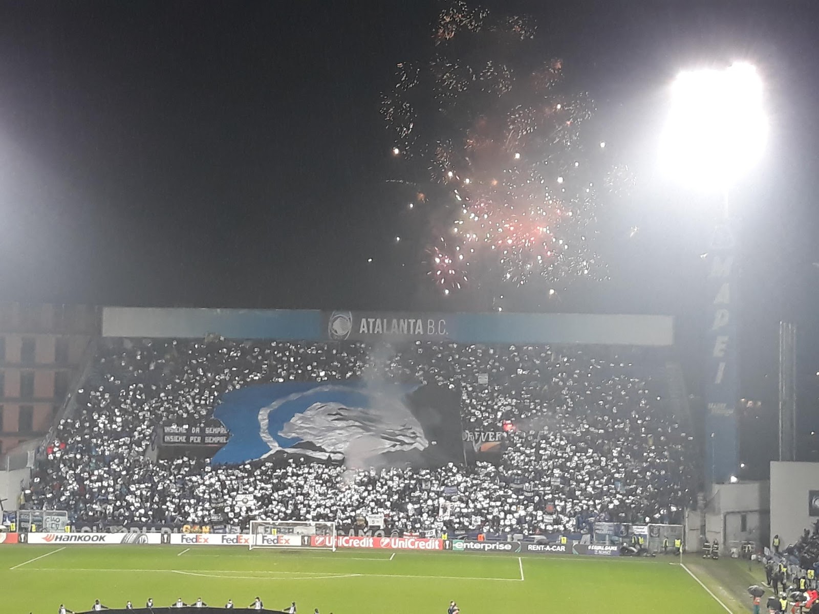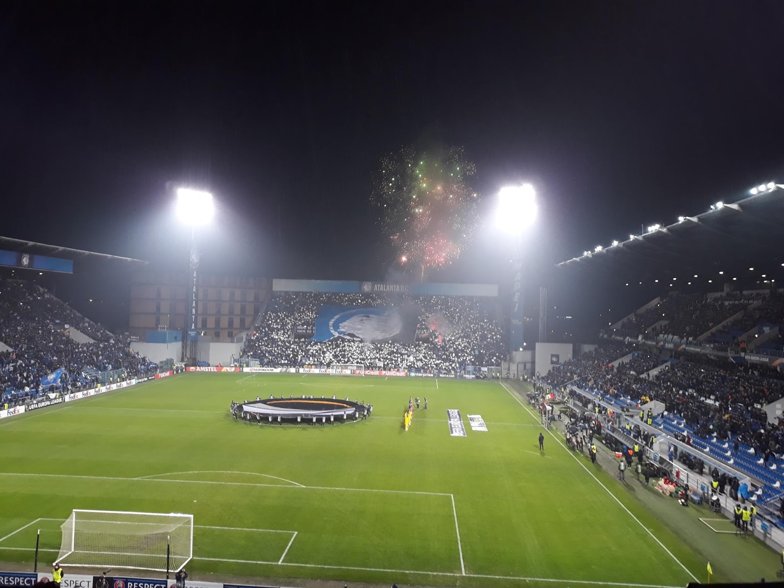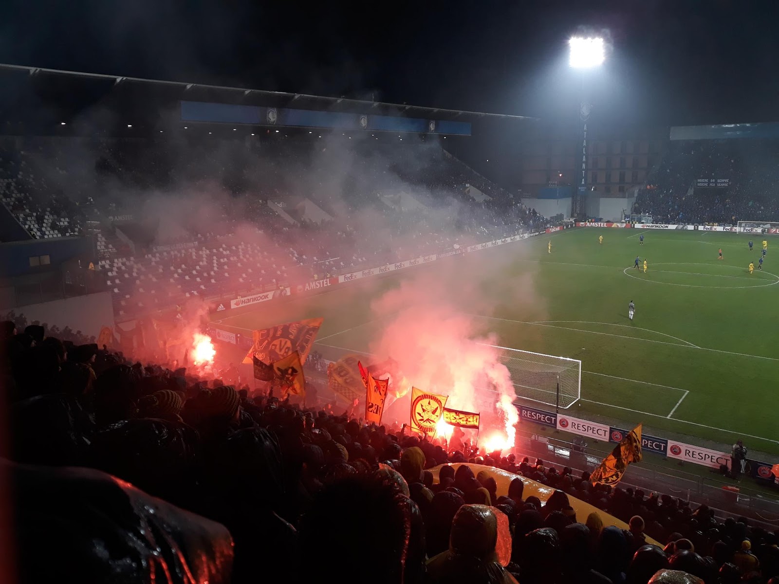 Het aanschuiven gaat zeer traag en er is heel strenge controle. In Italië moeten alle tickets op naam zijn en zelfs aanstekers worden afgepakt. Atalanta is bevriend met Eintracht Frankfurt in Duitsland en daarom is dit een high risk wedstrijd. Het blijkt ook al snel bij binnenkomst dat er langs beide kanten een goede sfeer zal hangen. Het uitvak is onoverdekt en het blijft maar regenen, de kou overvalt iedereen maar dat houdt niemand tegen om te zingen en te springen. De opkomst is zoals het bij elke wedstrijd zou moeten zijn. Vuurwerk, pyro en veel sfeer, de Italianen maken er een lekker hels sfeertje van en ook langs onze zijde is de sfeer enorm goed naar de normen van een uitvak zonder dak. Ook wordt er bijna de gehele wedstrijd pyro afgestoken langs Dortmund zijde.