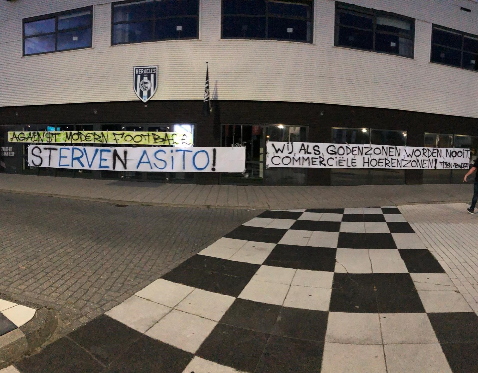 Ook bij een aantal supportersverenigingen van Heracles Almelo schoot dit nieuws in het verkeerde keelgat. De supporters gingen direct aan de slag om de club en de hoofdsponsor te laten weten dat zij het niet eens zijn met de nieuwe naam van het stadion. Daarom waren er maandagavond meerdere spandoeken te bewonderen op de voorgevel van het stadion met de teksten ‘stERVEn ASITO’, ‘Wij als godenzonen worden nooit commerciële hoerenzonen’ en ‘Again$t Mod€rn Footba££’. Hele duidelijke statements dus. De supporters voelen zich met deze naam voor lul gezet.