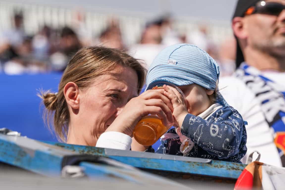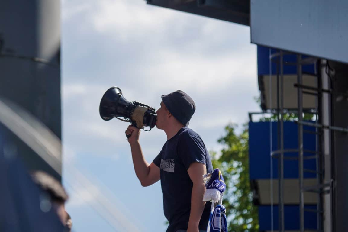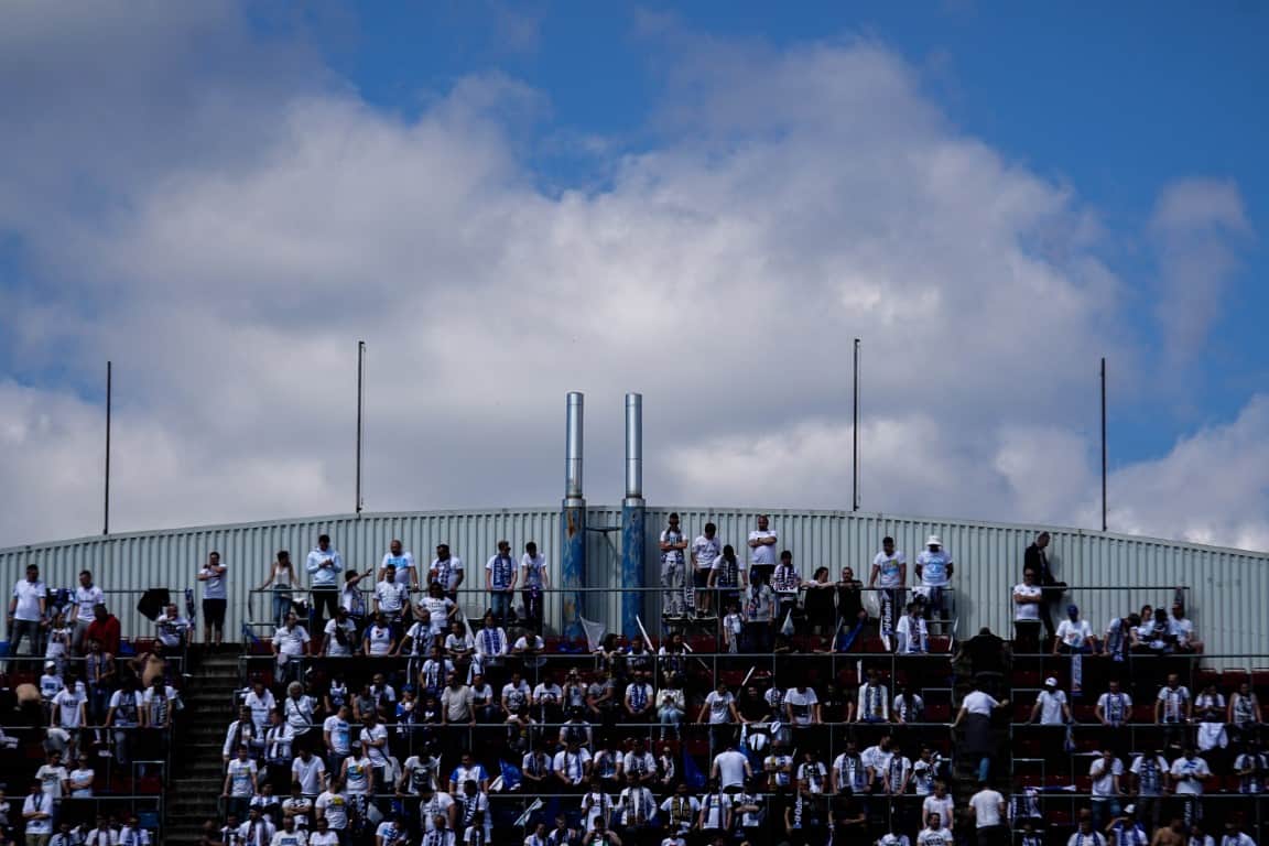 Het uitvak is sowieso al vanaf minuut 1 fantastisch bezig. Dankzij een oproep van de ultras is vrijwel het gehele vak met duizenden uitsupporters in het wit gekleed. Alhoewel deze kleding vanwege de zon door veel supporters al snel wordt ingeruild voor de blote bast. Verder valt op dat een van de groepen dit jaar een 15-jarig bestaan heeft gezien een vlag voor de capostand en zijn er weer veel vrienden van het Poolse GKS Katowice aanwezig. Het geluid wat deze supporters gezamenlijk weten te produceren is keihard. Het is zonder twijfel een van de beste uitvakken die ik ooit heb gezien. Alhoewel met zoveel en op deze tribune nauwelijks nog te spreken is van een echt uitvak.